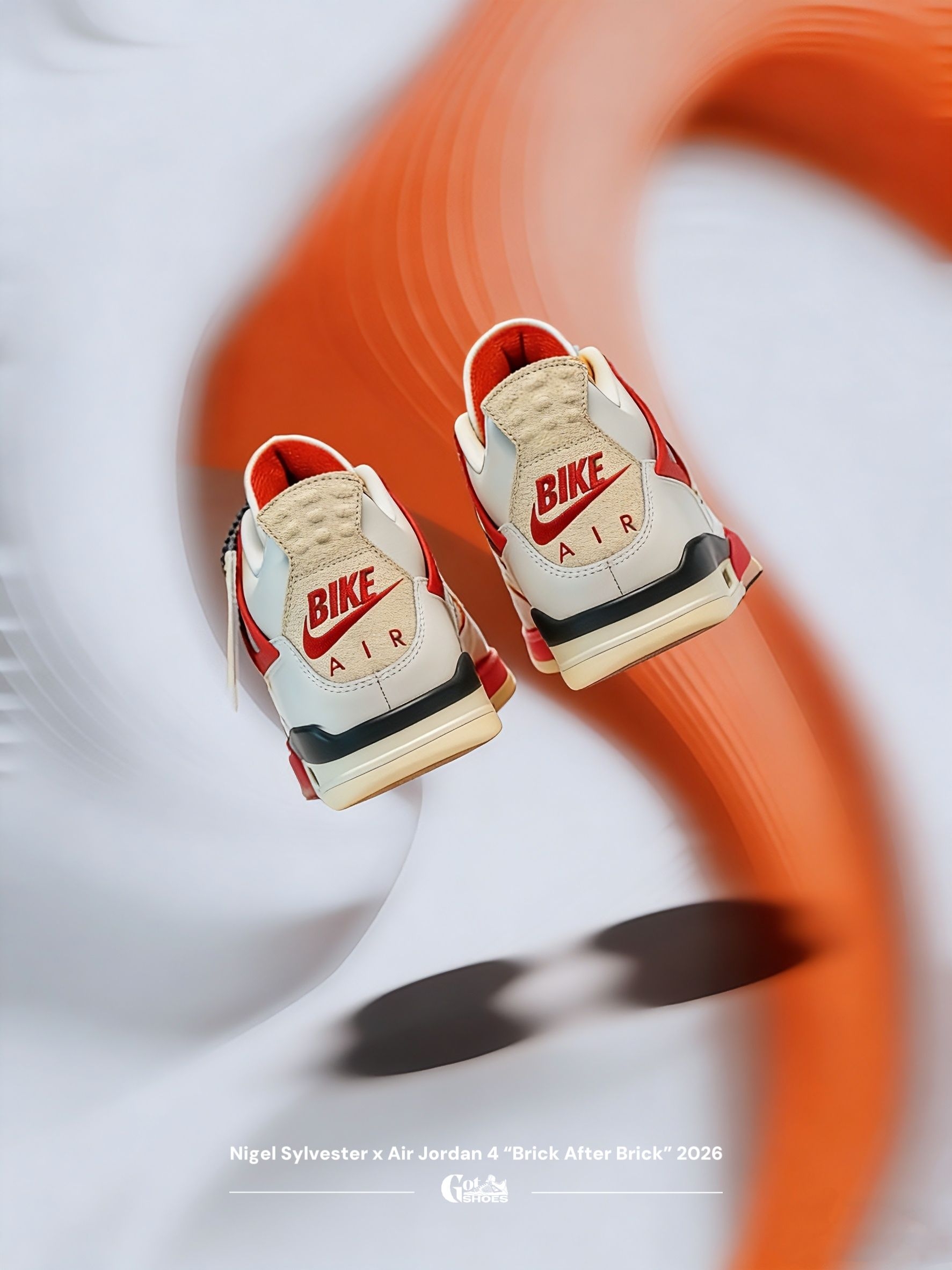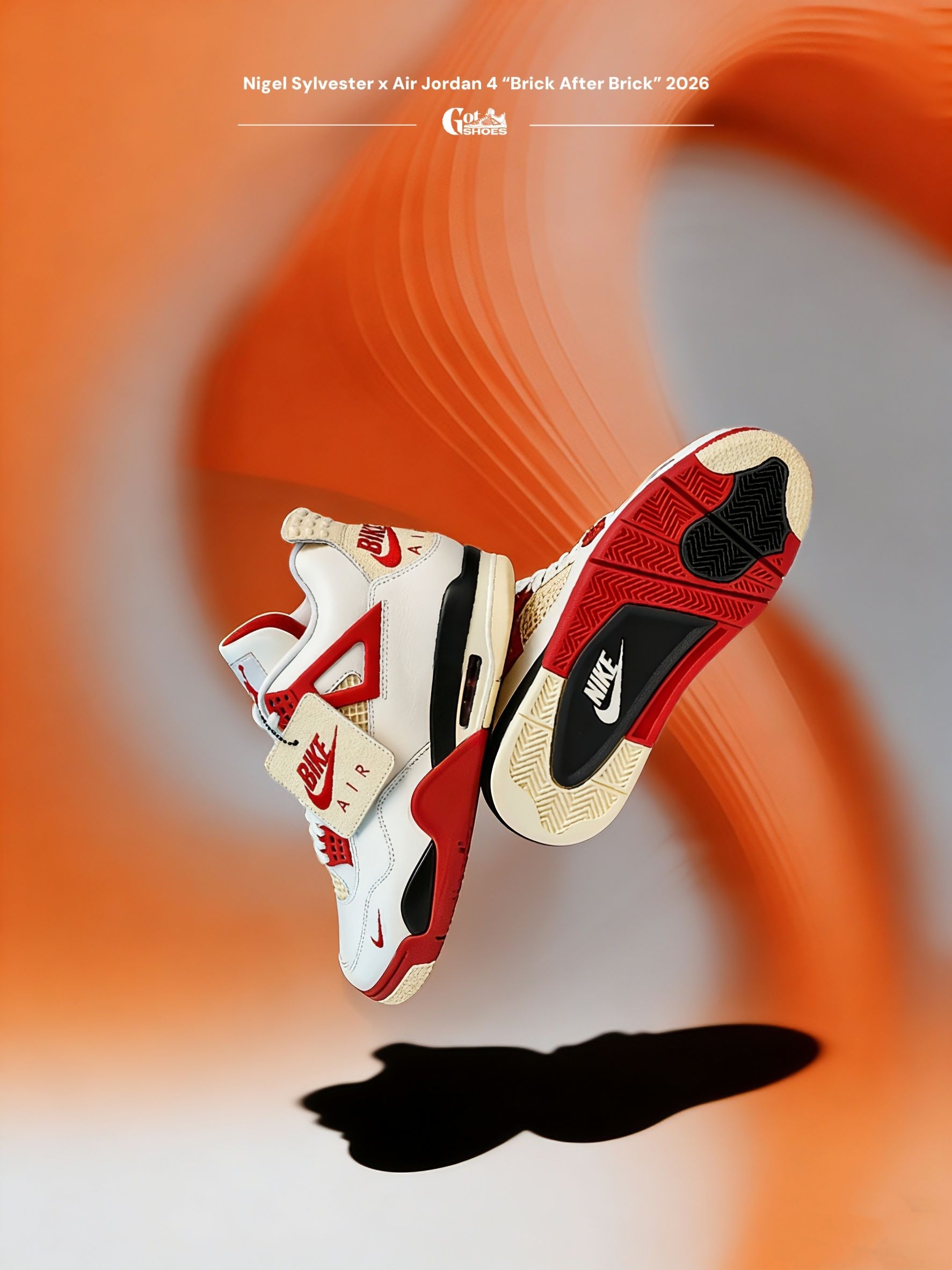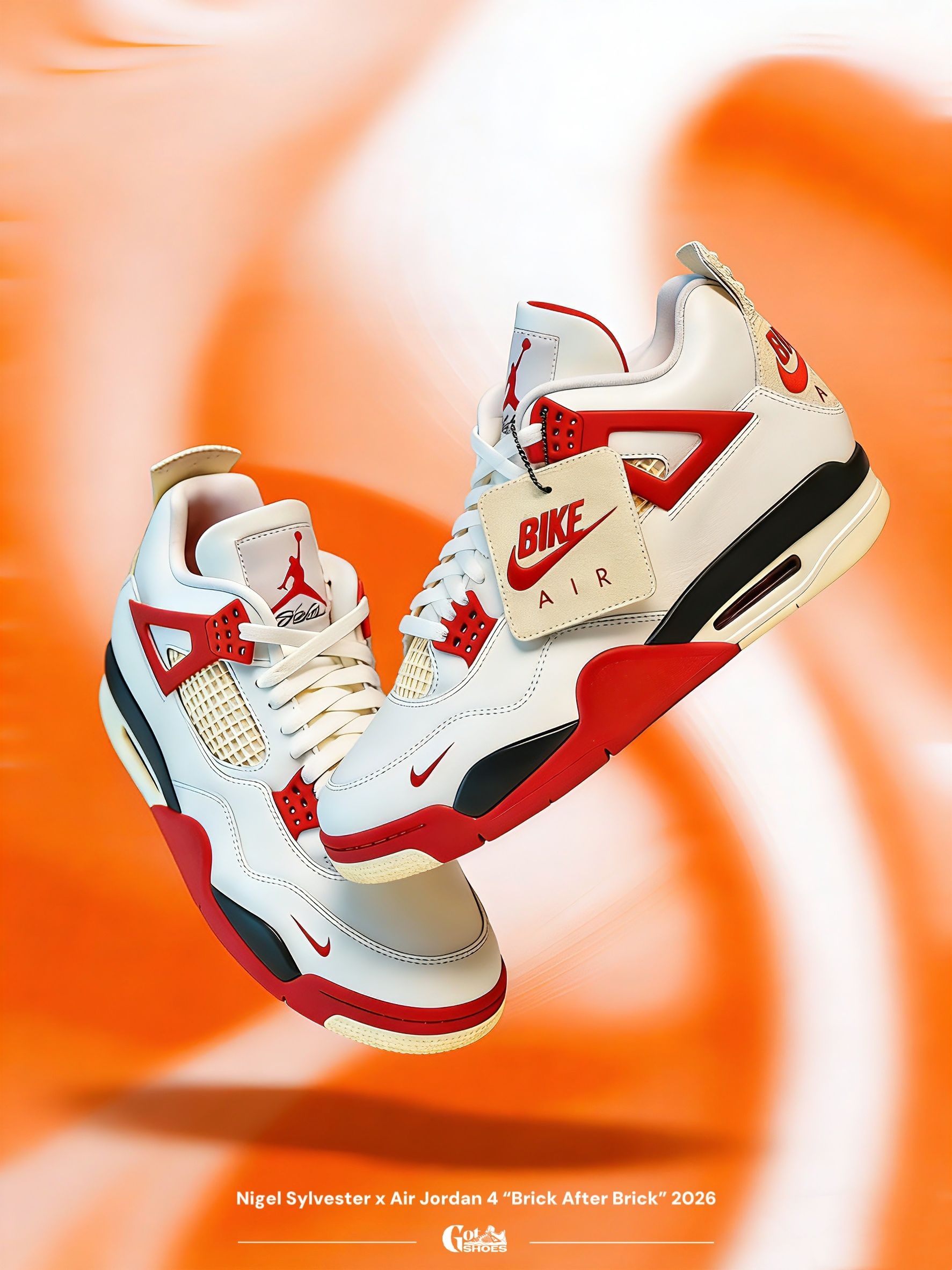 Nigel Sylvester x Air Jordan 4 “Brick After Brick” 在主题上延续了这位 BMX 大神对个人成长经历的讲述,依旧采用相同的设计思路,只是将底色换成了近似 Fire Red OG 的白色。 相较于“红砖”配色,这款“白红砖”整体更显清爽与经典,但独特的联名气质依然一目了然。 鞋面采用白色皮革,搭配红黑中底和红色细节点缀,营造出浓厚的 F...