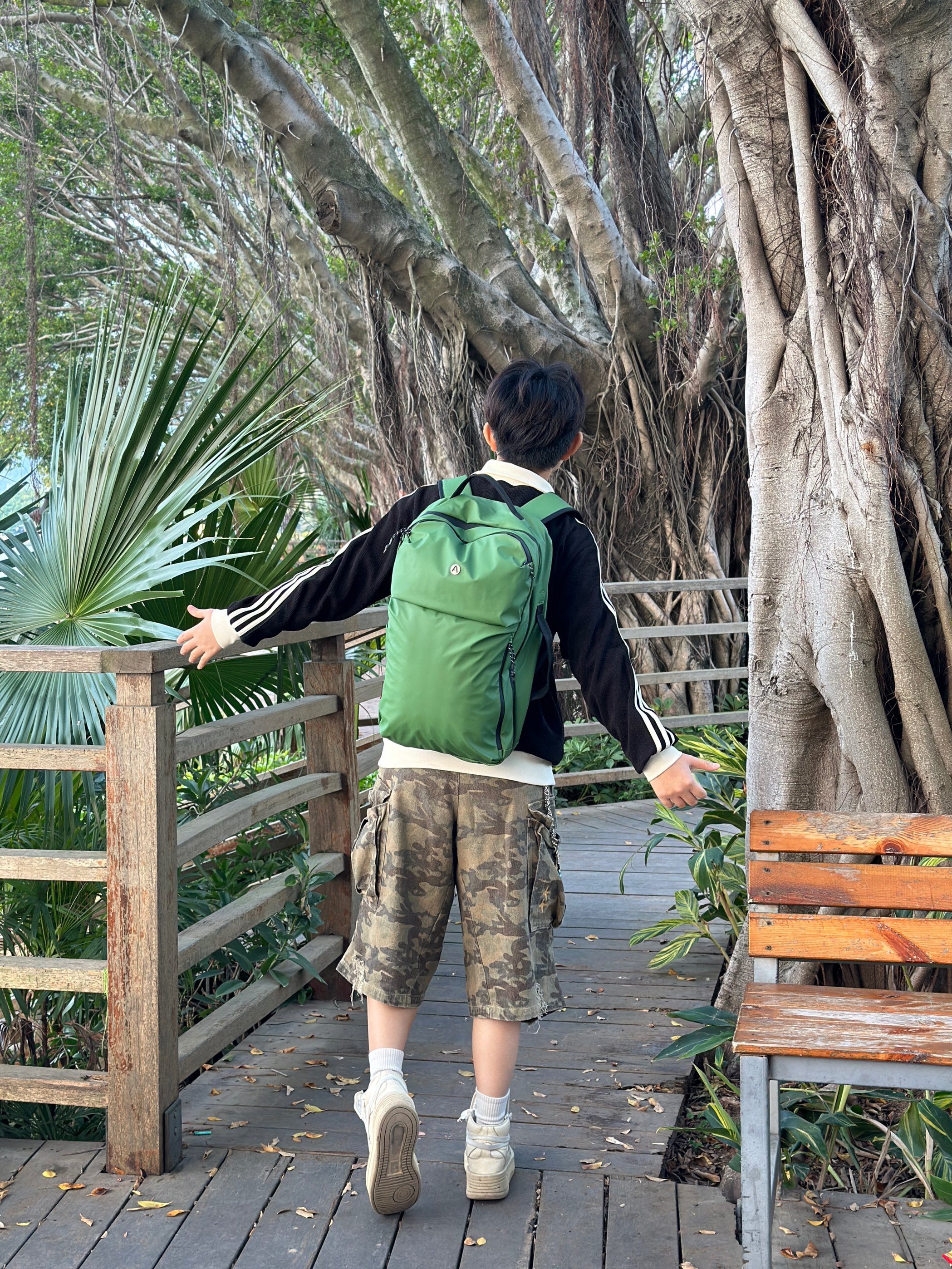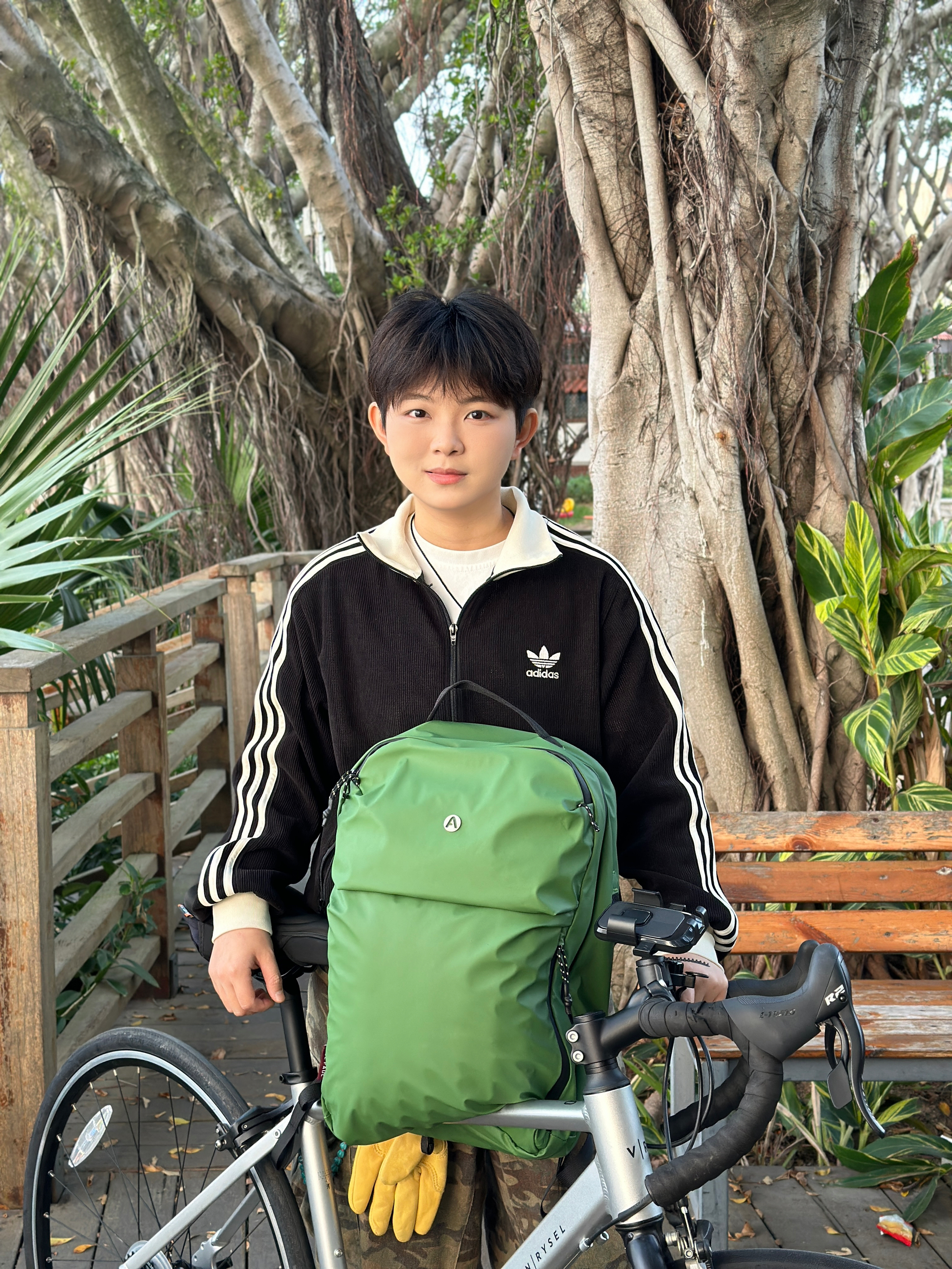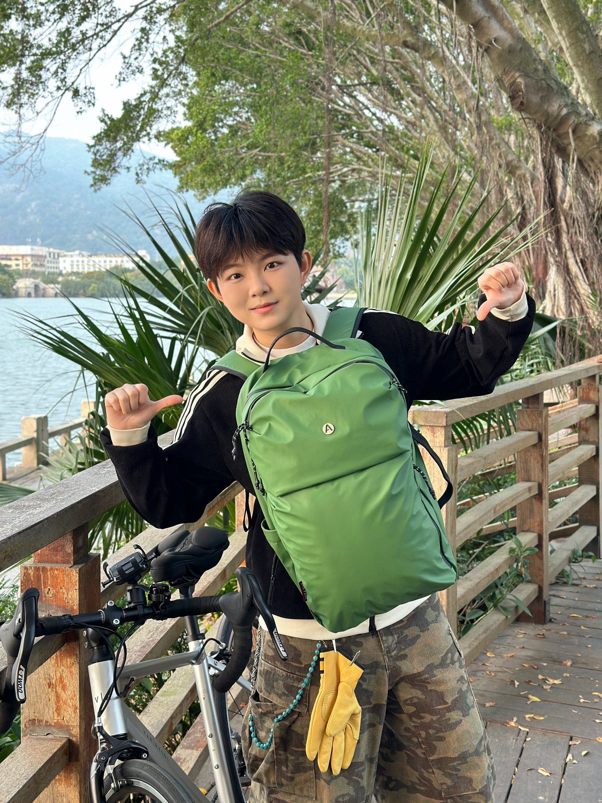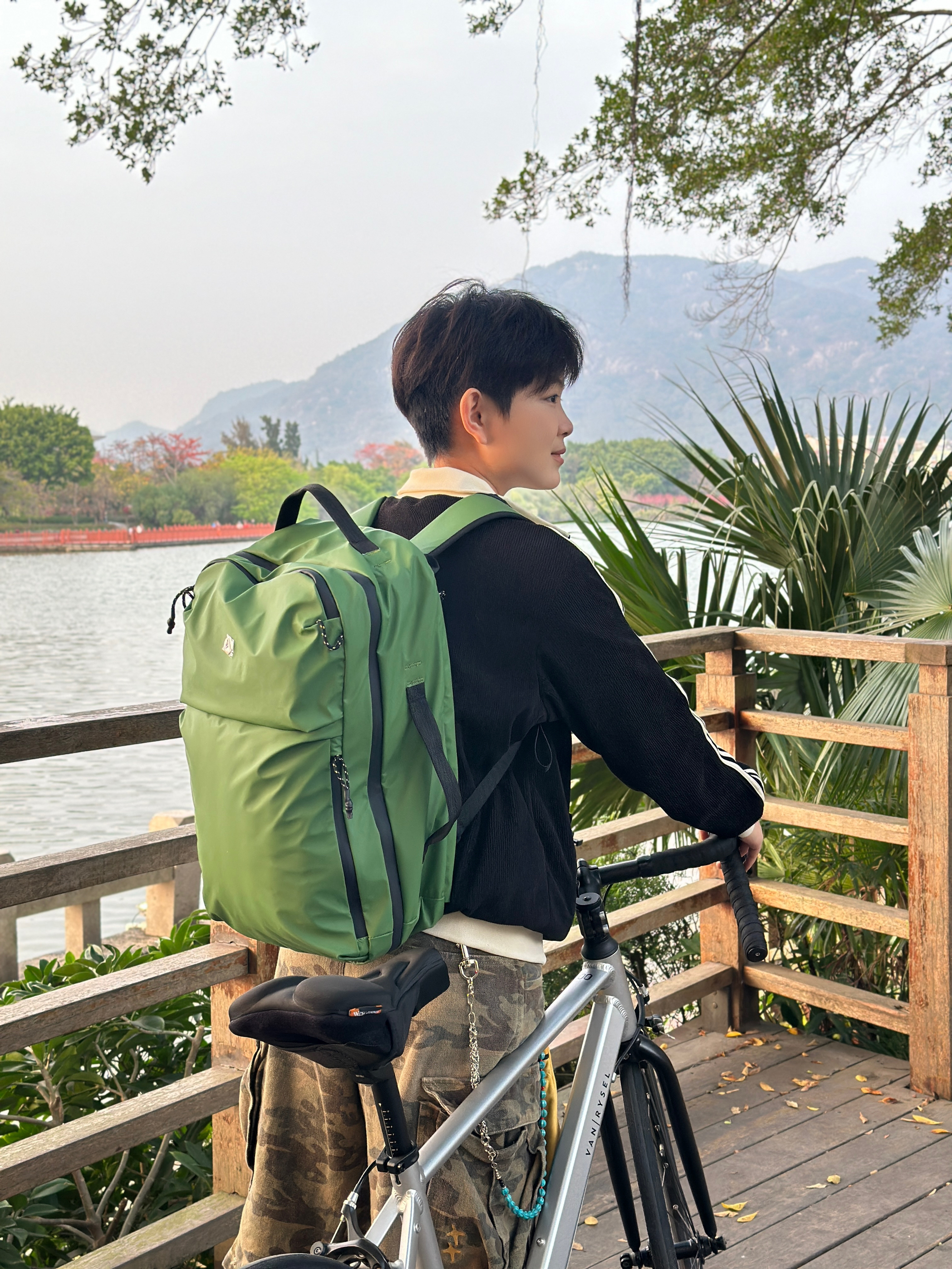 推着车去湖边晃悠,风里已经有春天的味道了。 • 🎒 核心单品:清新绿运动双肩包 亮绿色在户外太吸睛,大容量装得下骑行装备和随身物,肩带减负设计,背久也不累。 • 🌿 休闲运动风穿搭公式 黑白条纹运动外套 + 迷彩工装裤,简约又利落,和绿书包撞色刚好,活力感拉满。 • 🚲 氛围小tip 选湖边、林间栈道这类自然场景,和自行车同框拍,松弛感直接拉满。