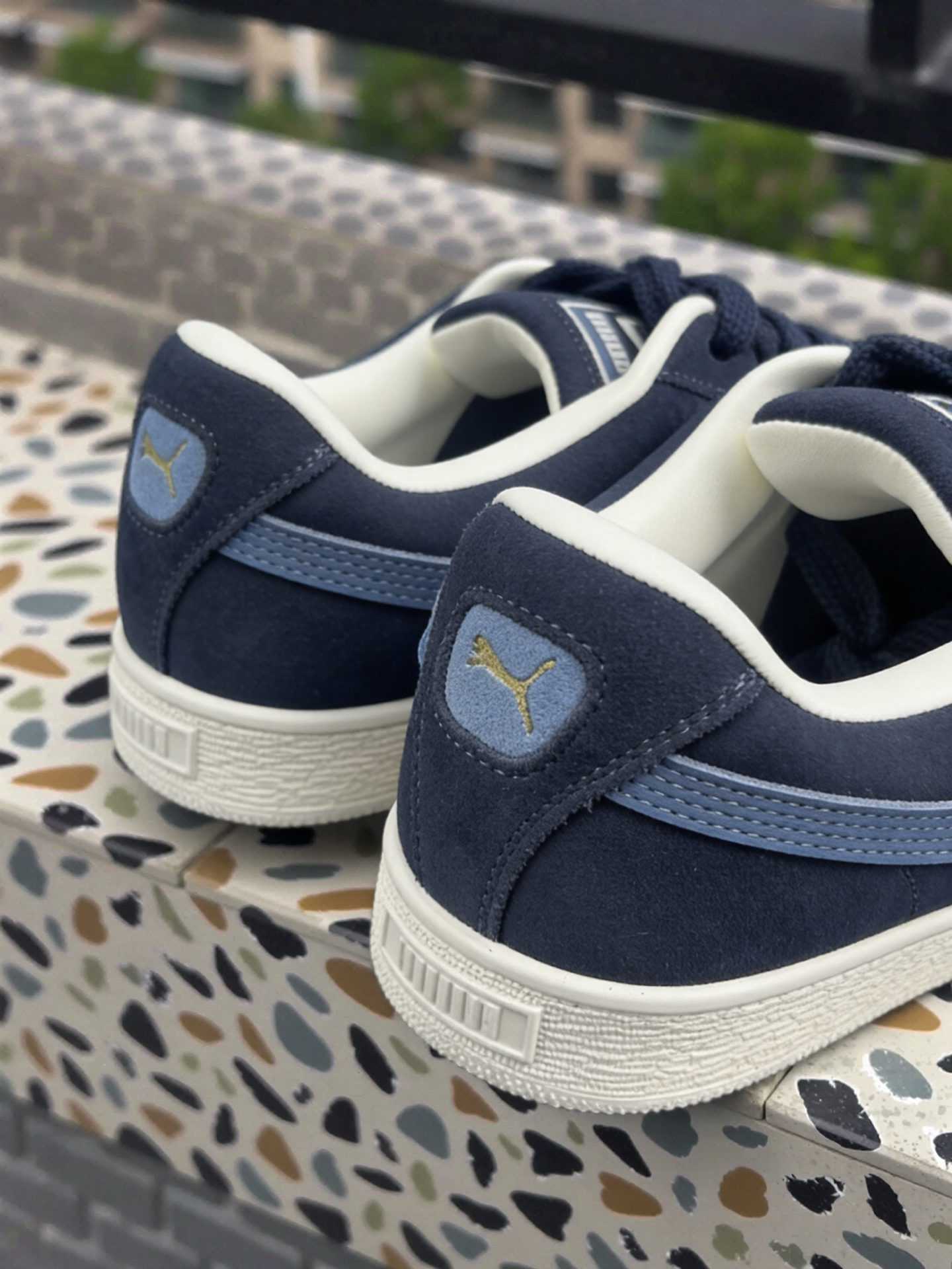 谁懂啊!这双PUMA Suede XL藏青麂皮款真的长在我审美点上✨ 经典麂皮材质摸起来软fufu的,藏青+浅蓝撞色Formstrip,低调又有层次,像把秋日的雾蓝穿在脚上,温柔又高级! 加厚鞋舌和加宽鞋型,复古感直接拉满,上脚包裹感超舒服,软弹鞋底走路久了也不累脚。 配牛仔裤、工装裤、运动裤都巨和谐,韩系、美式复古风随便搭都好看,日常通勤、校园上课、周末出街都能穿,百搭到离谱! 细节控狂喜!鞋侧...