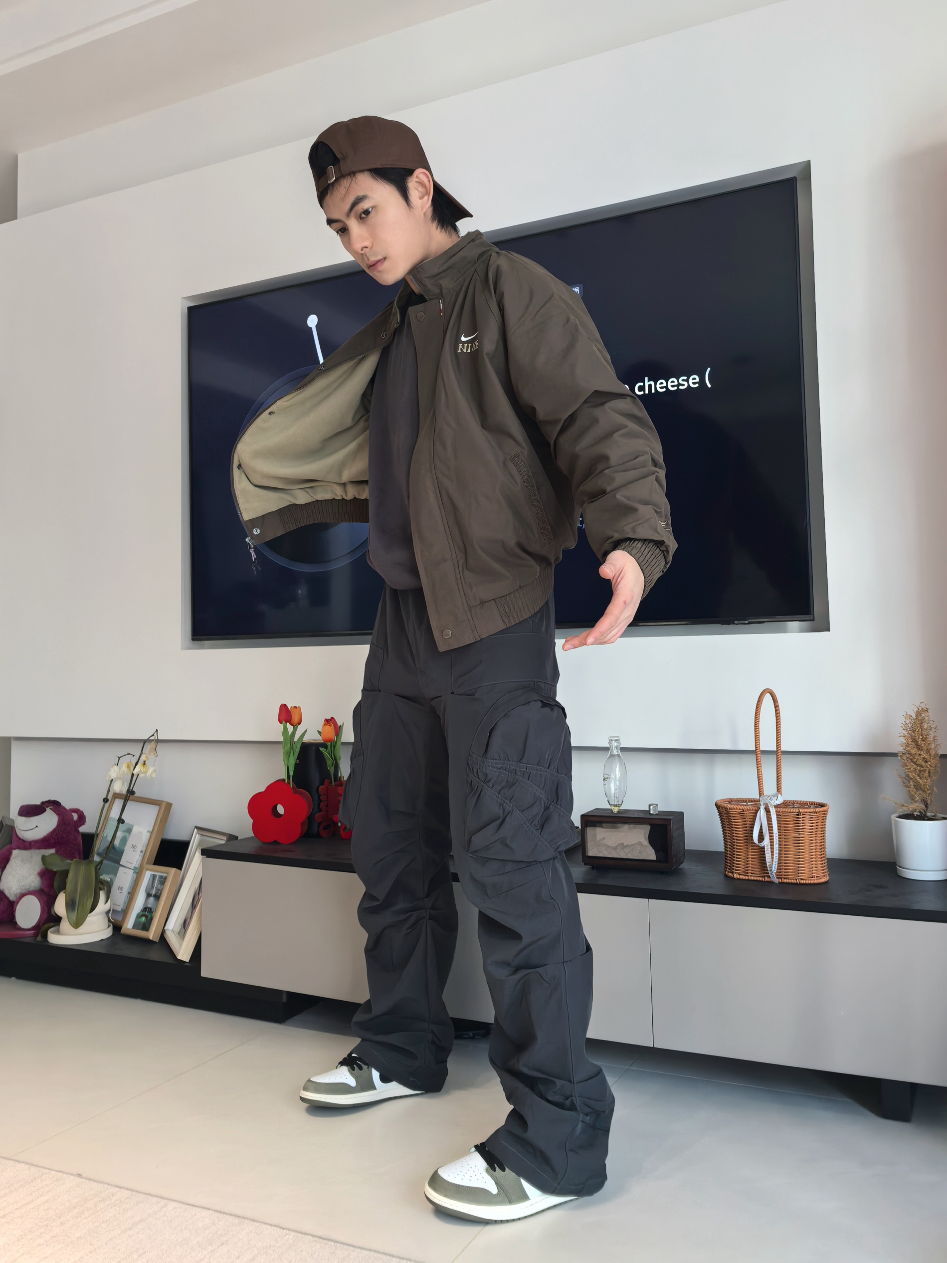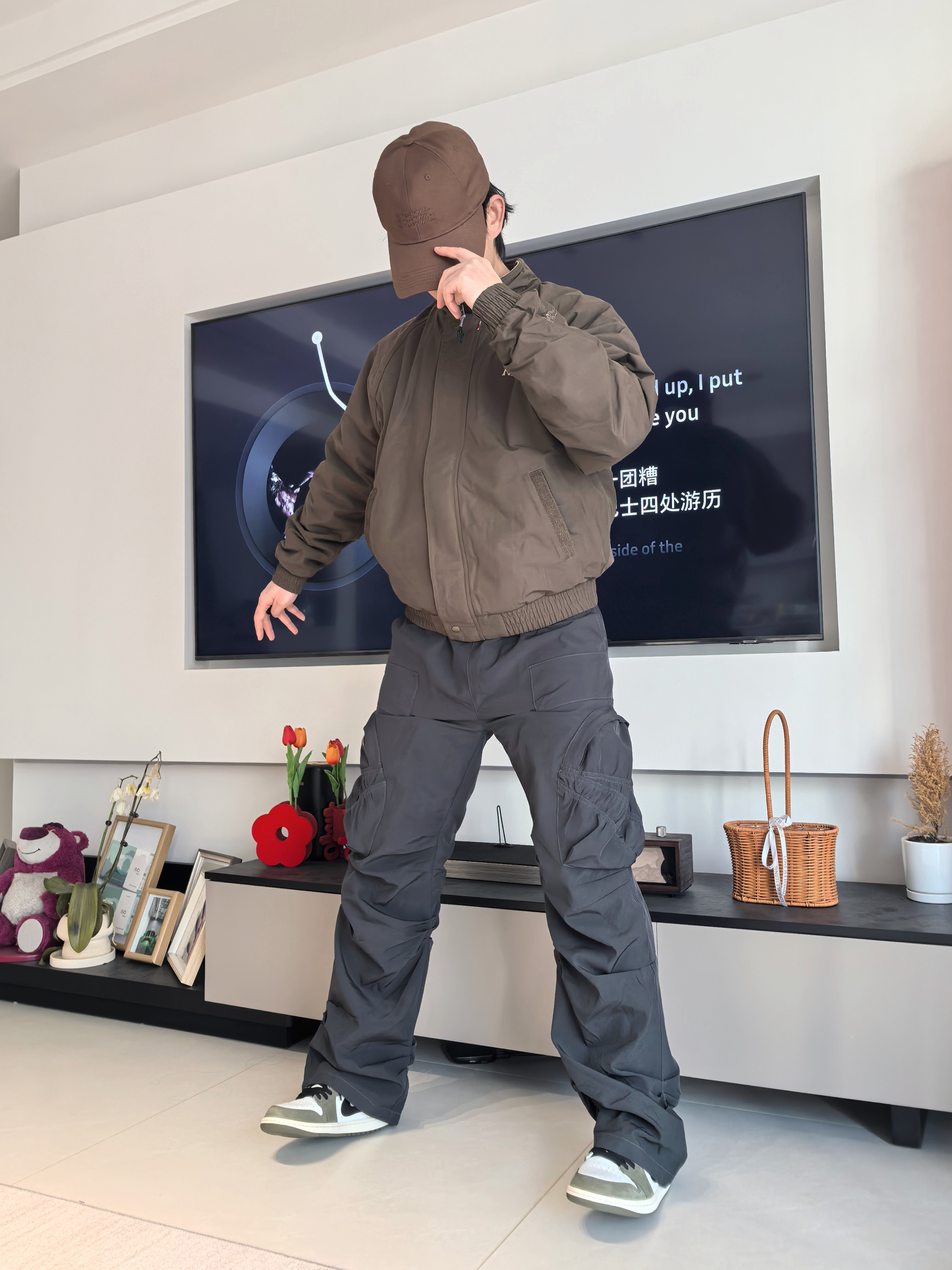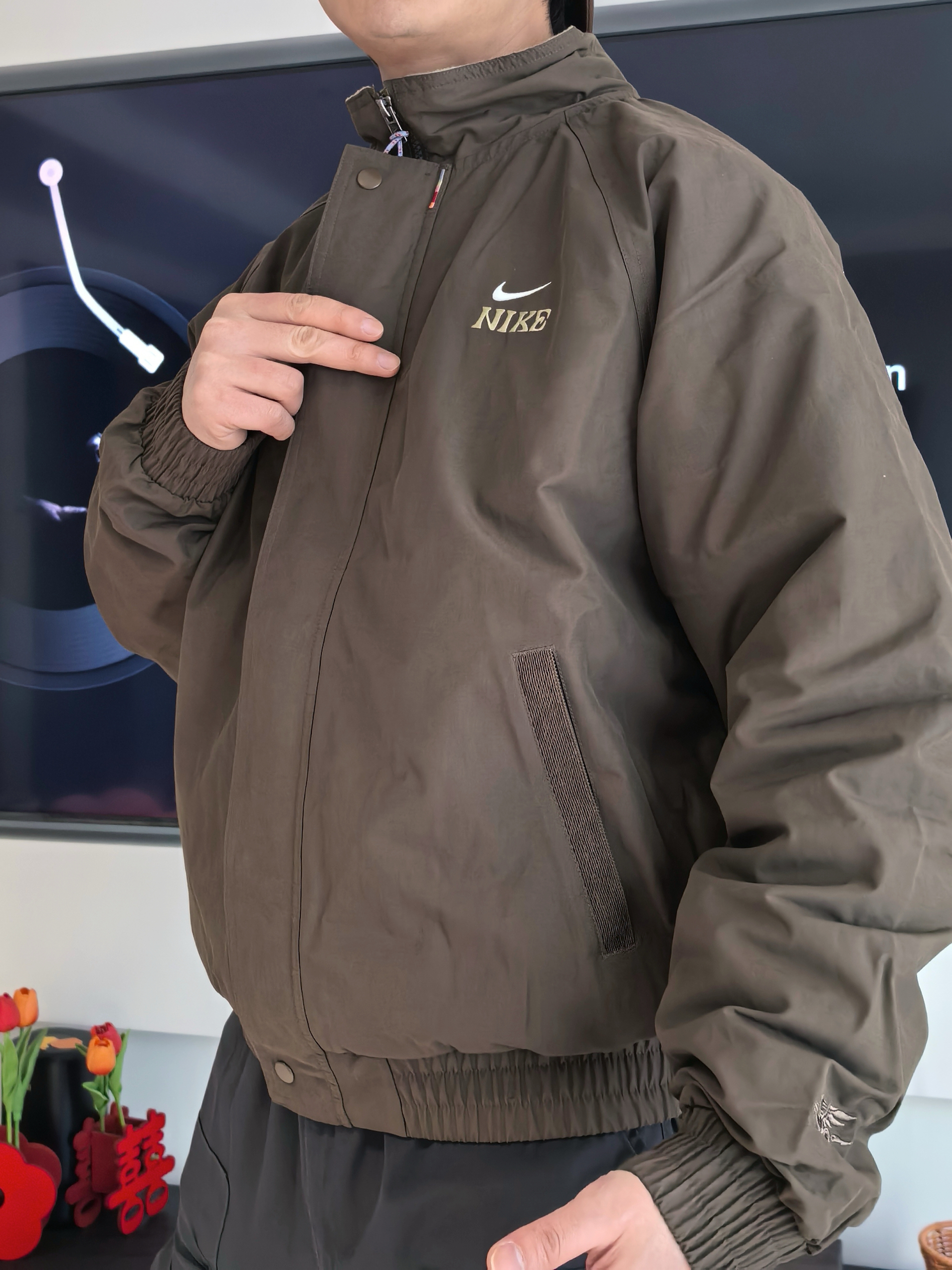 🏃上次我尝试了这件的深红色款,但我会觉得这件深色款会更适合大部分人去搭配 🔖衣服的细节还是这次的飞马标志,在袖口会有点若隐若现的感觉,这点我觉得还不错呢! 整体的效果其实不会太偏向于过年氛围感反而更像一件日常百搭经典款 我选择搭配到的是一条灰色阔腿裤,鞋子是我认为今年的开年王炸球鞋AJ1橄榄绿低帮,日常搭配还是比较简单的