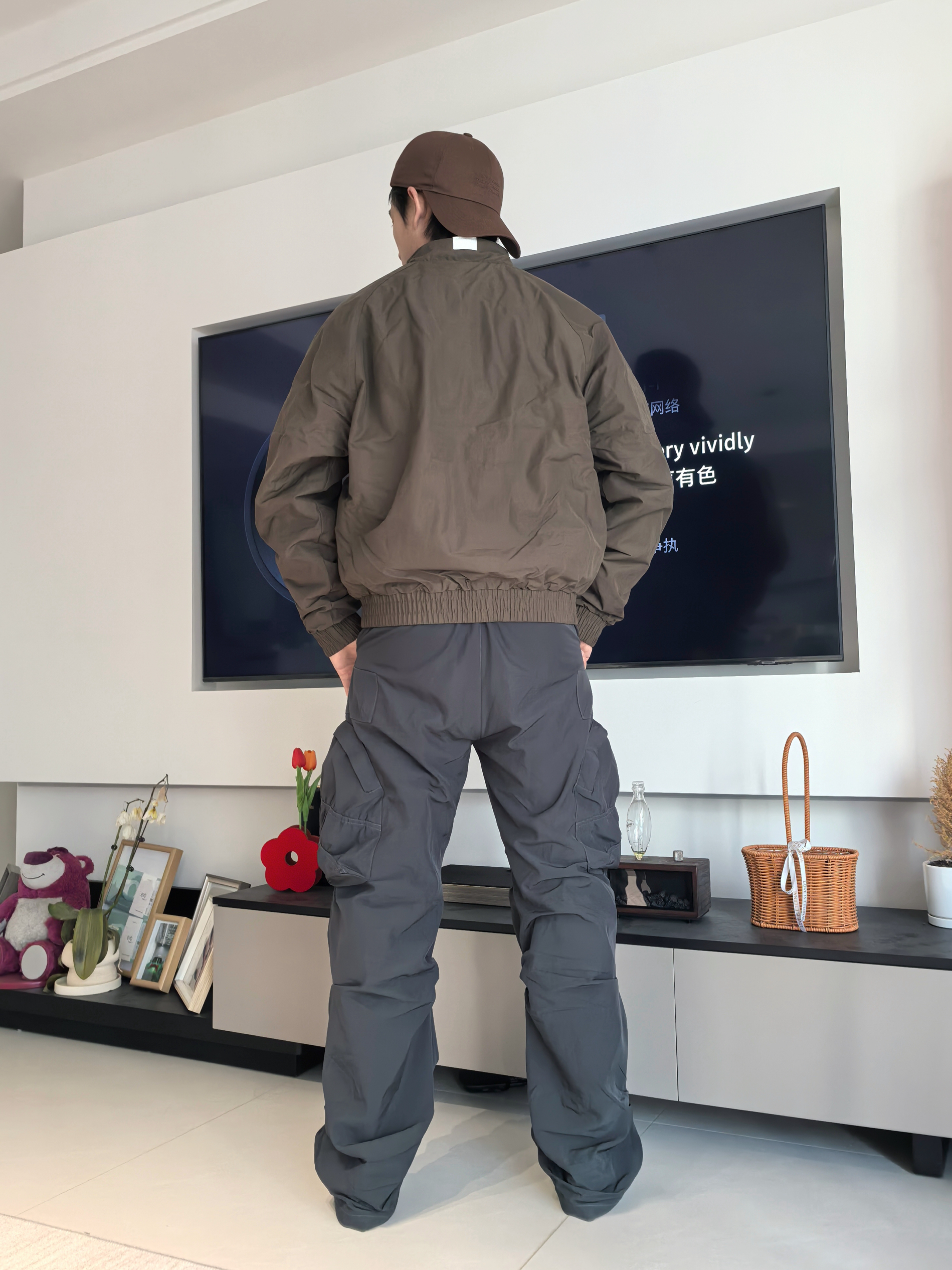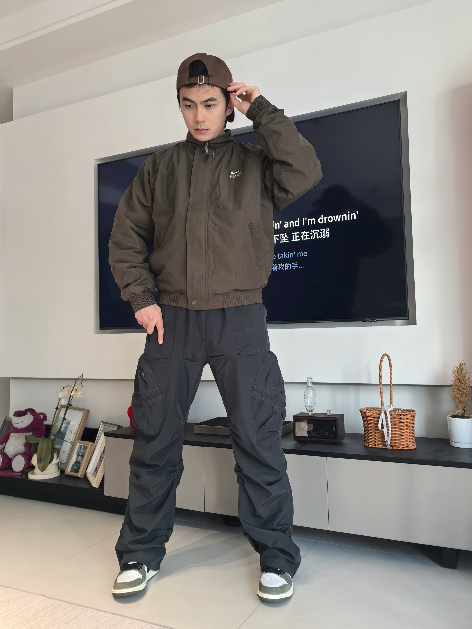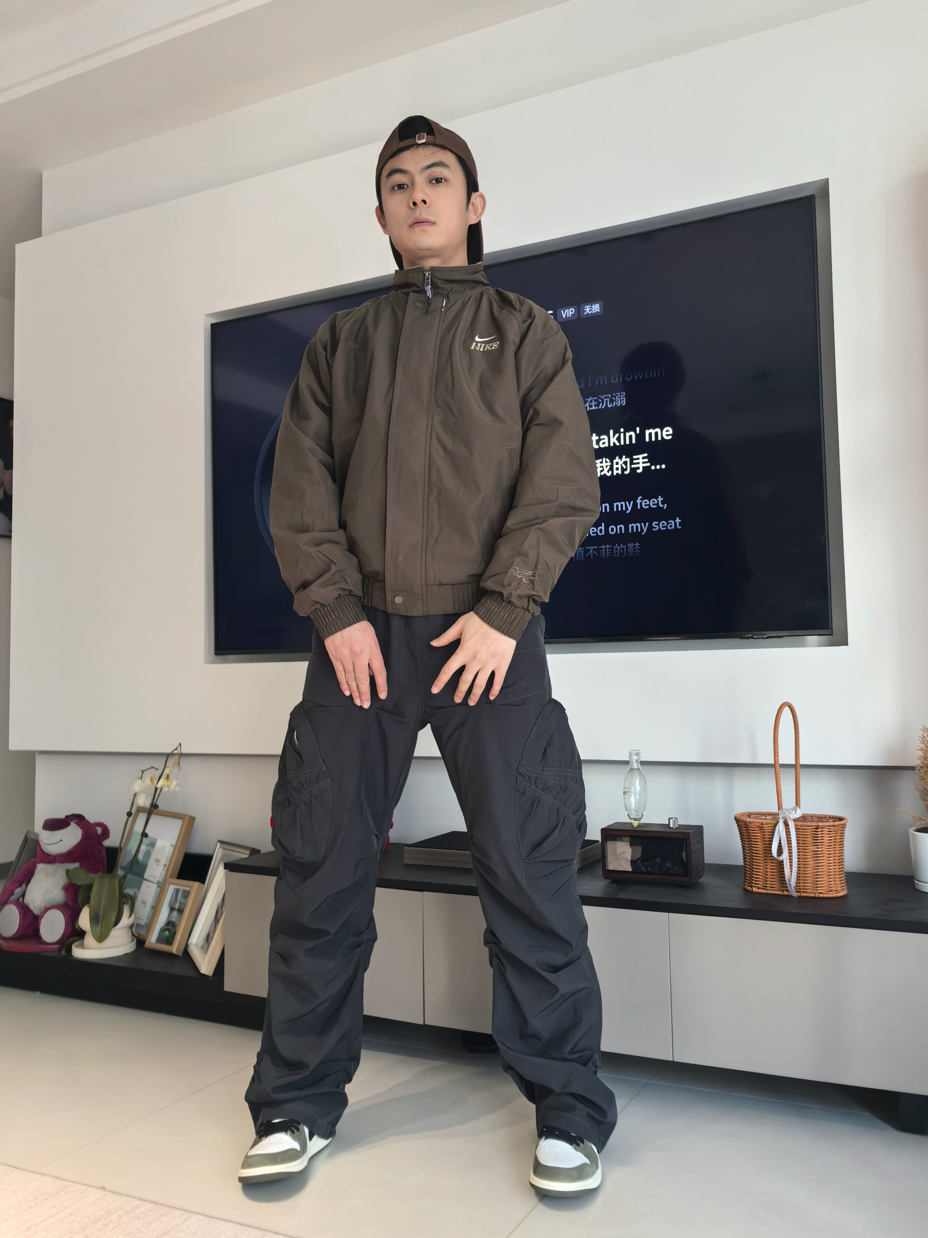 🏃上次我尝试了这件的深红色款,但我会觉得这件深色款会更适合大部分人去搭配 🔖衣服的细节还是这次的飞马标志,在袖口会有点若隐若现的感觉,这点我觉得还不错呢! 整体的效果其实不会太偏向于过年氛围感反而更像一件日常百搭经典款 我选择搭配到的是一条灰色阔腿裤,鞋子是我认为今年的开年王炸球鞋AJ1橄榄绿低帮,日常搭配还是比较简单的
