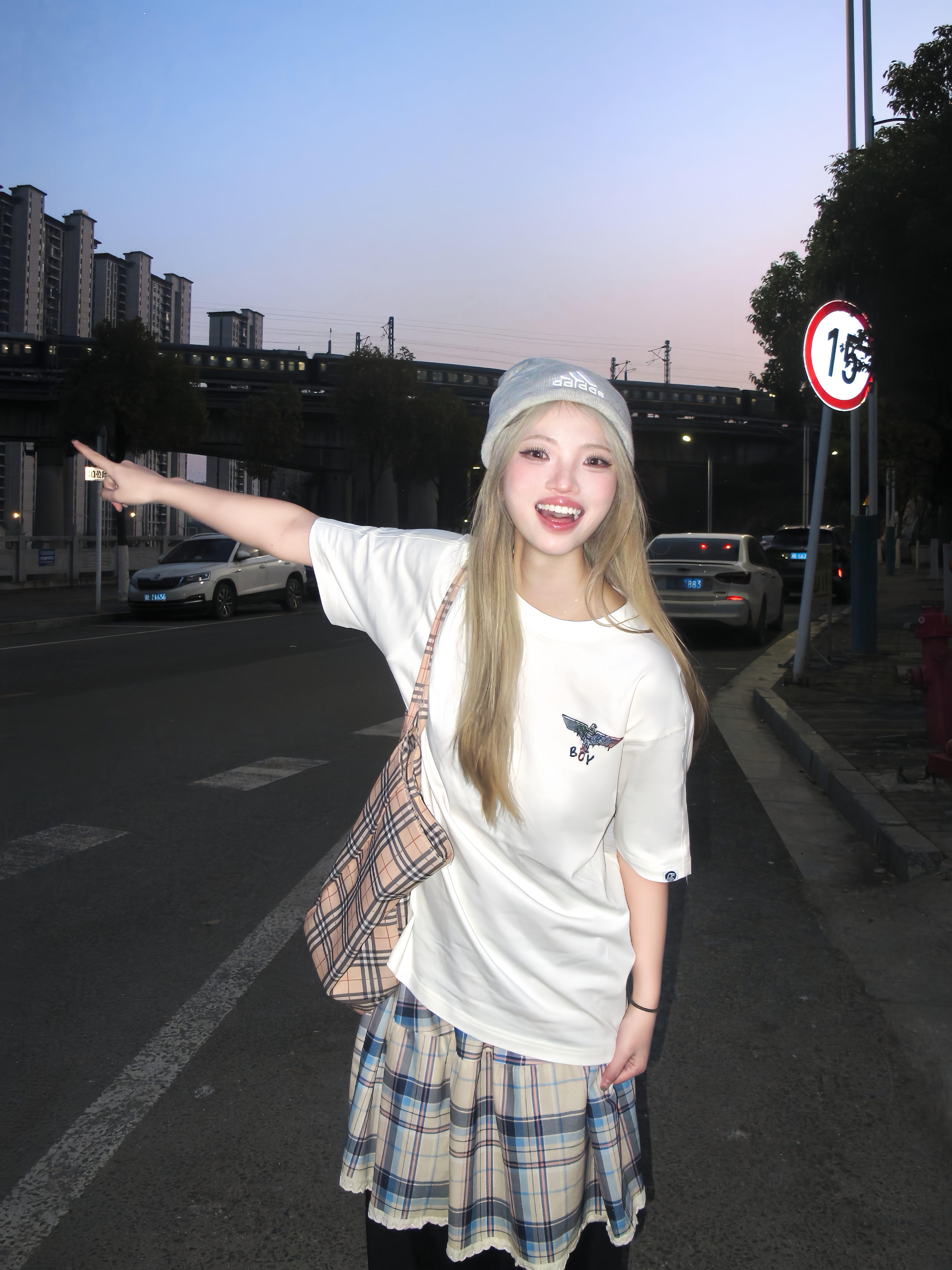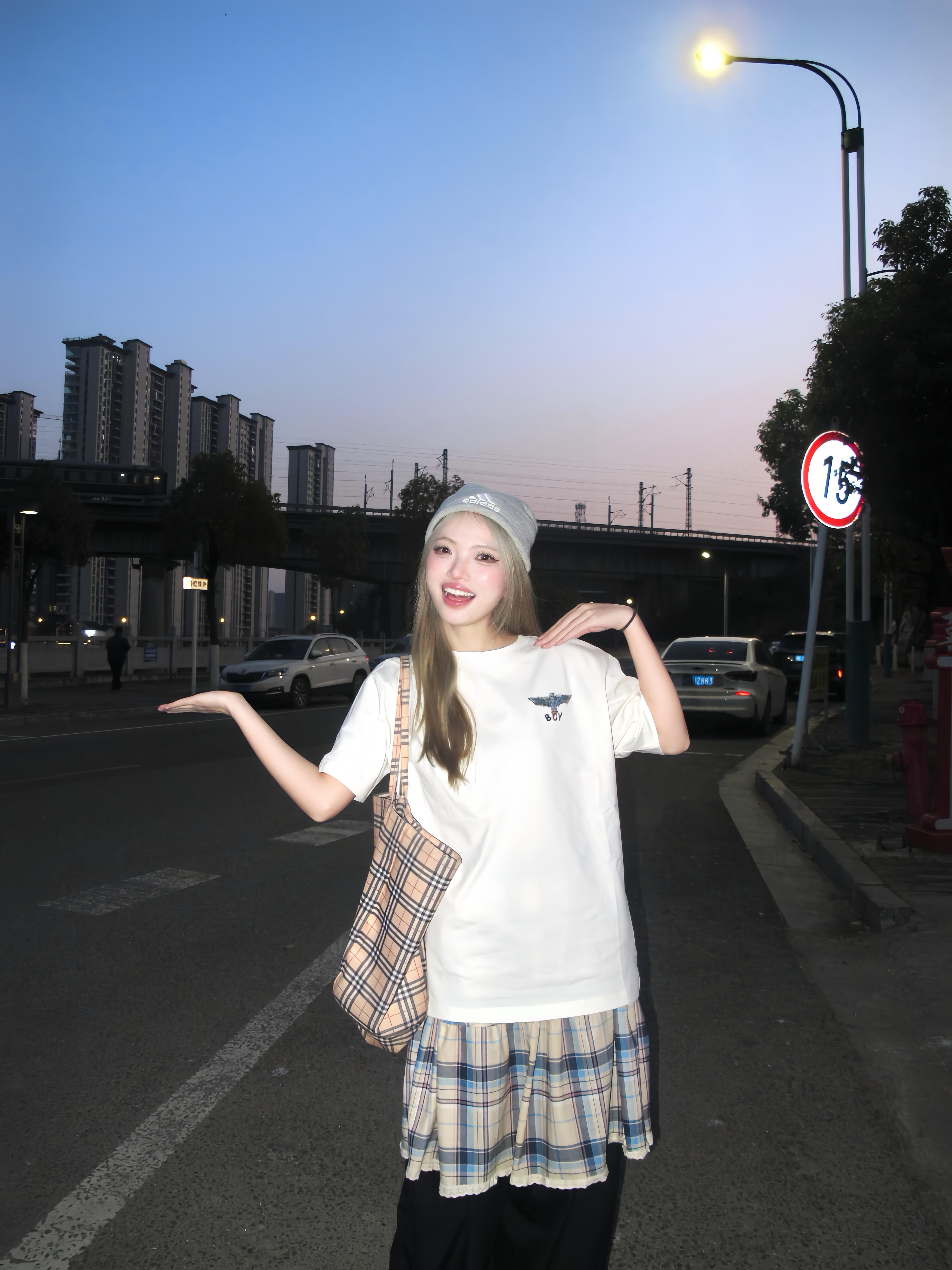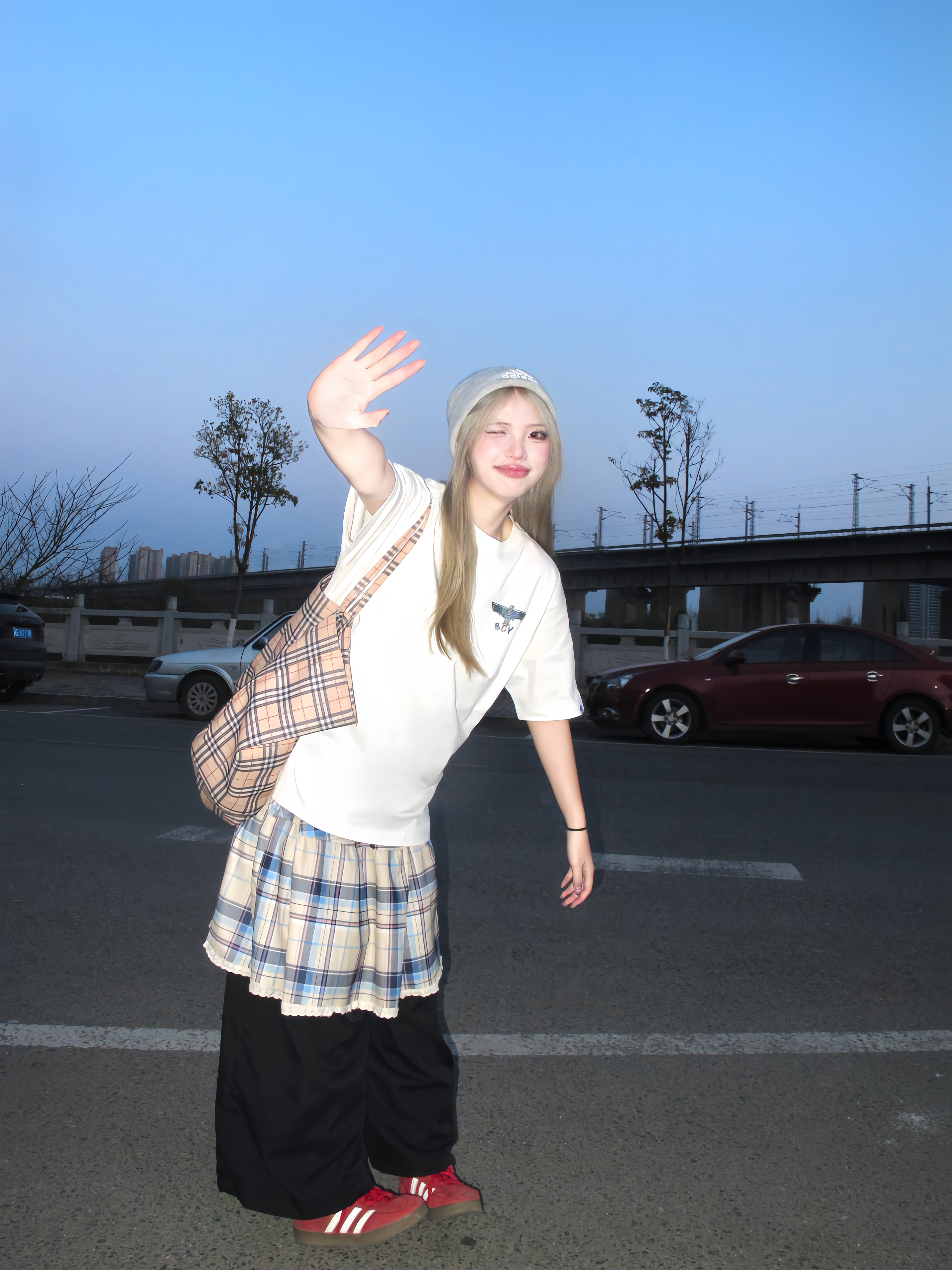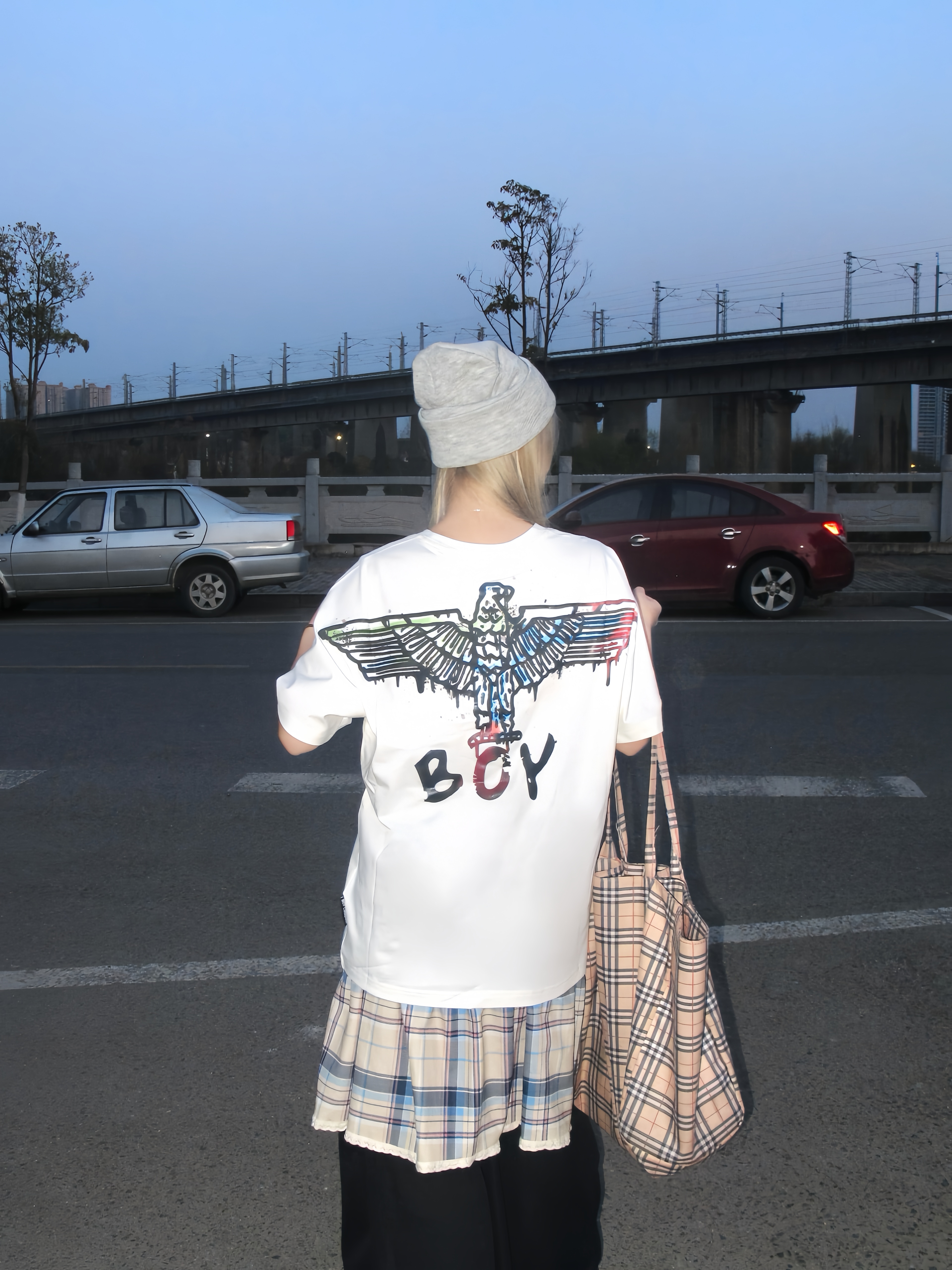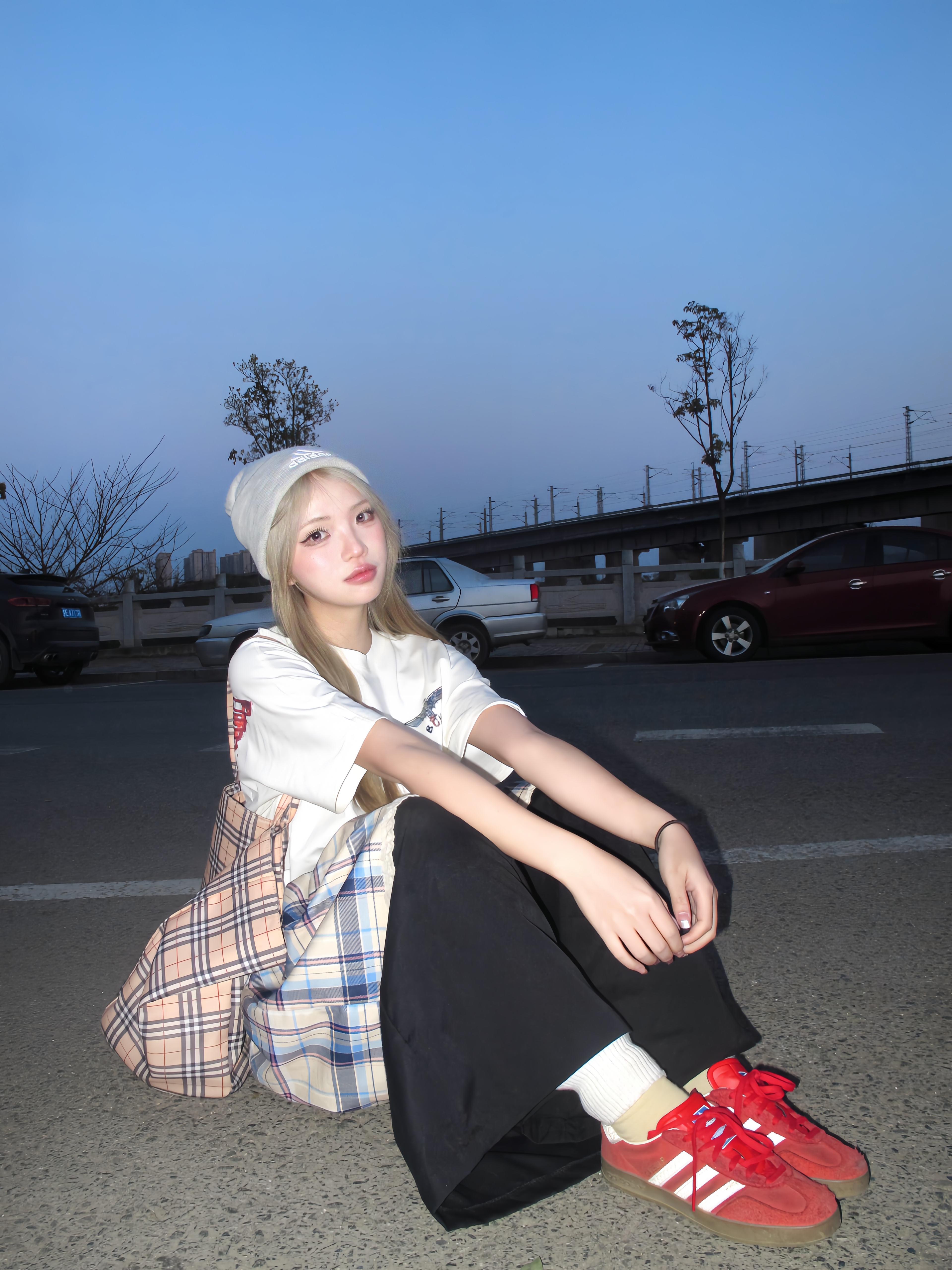 在太阳落山之后的蓝调时刻 这样拍好有故事感✌️ 穿白色印花t恤搭配黑色裙裤 经典印花logo好有feel 红色德训穿脚上为一套增添一丝亮色 衣服背后有一个鹰logo 好炫酷🦷 在晚霞来临时咔咔几张 敲有感觉的💭
