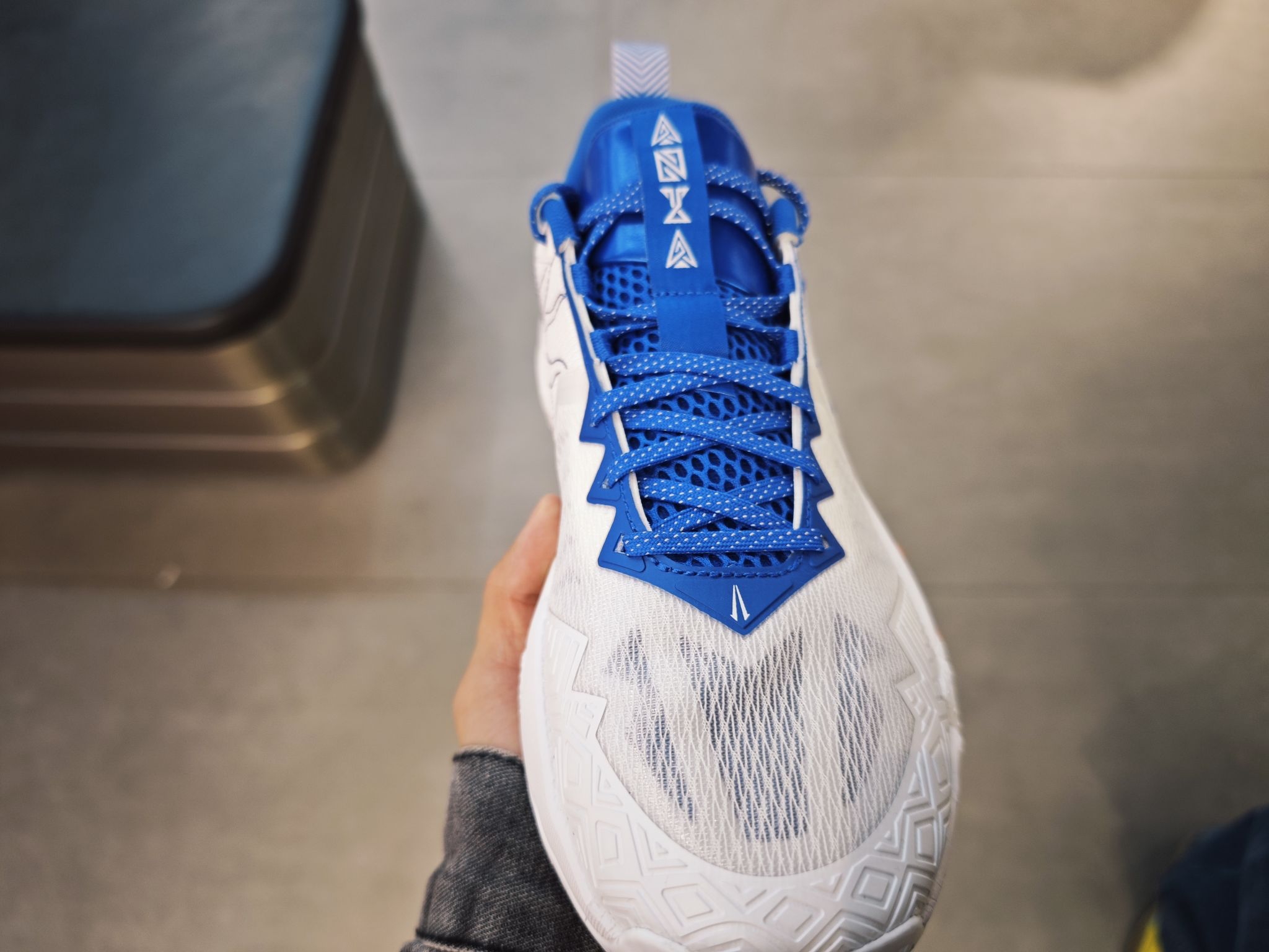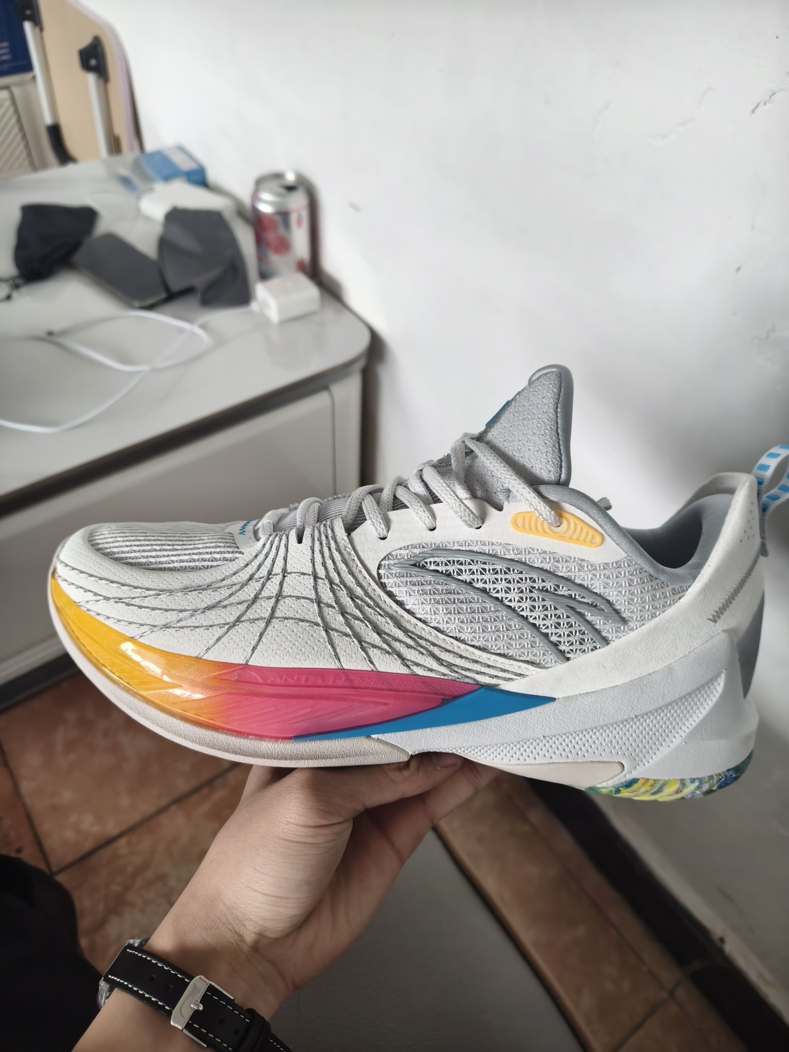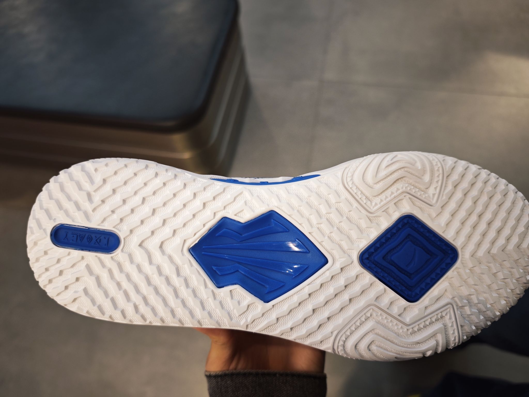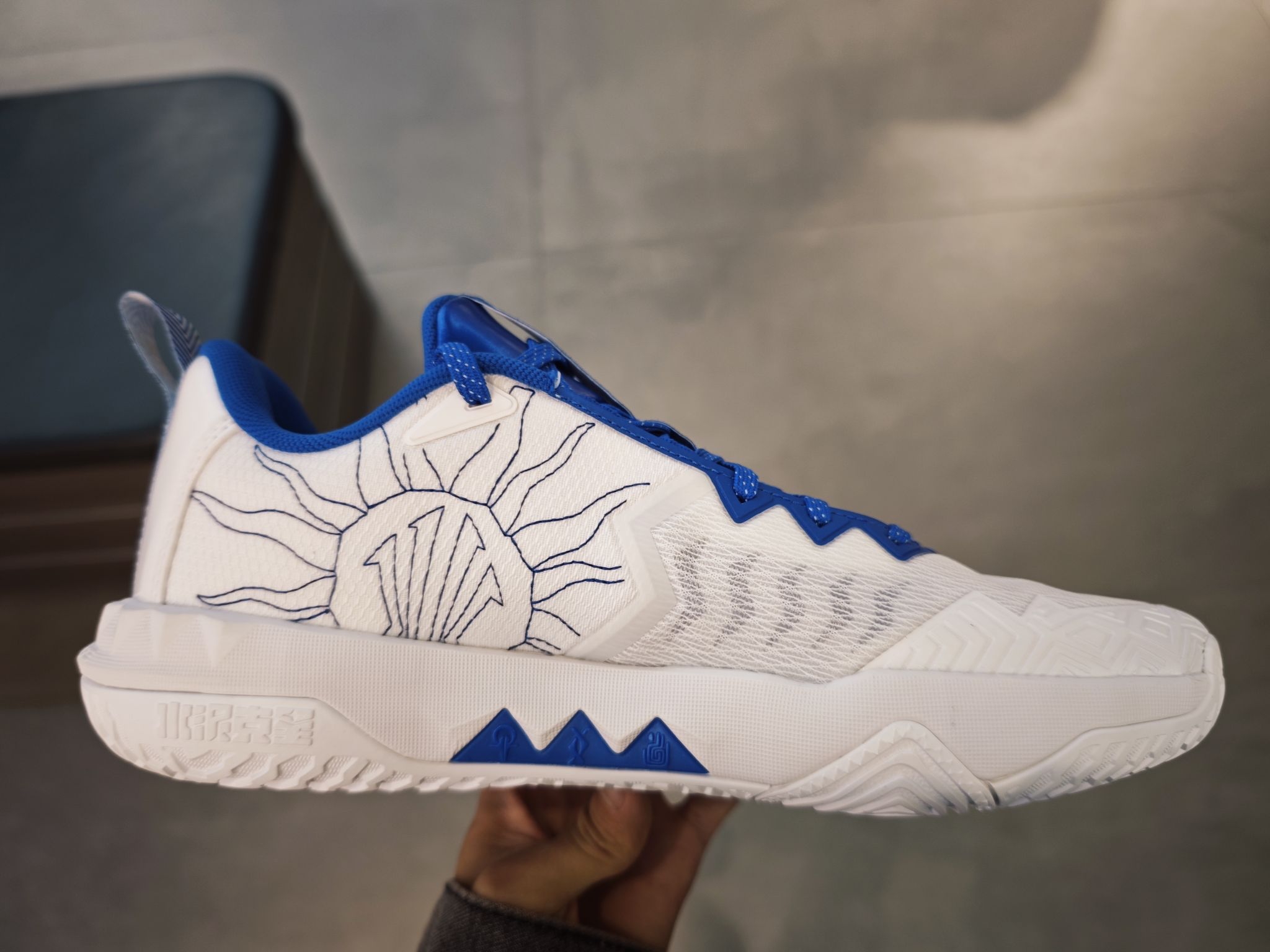 白蓝撞色干净清爽,鞋侧太阳刺绣+后跟民族风织带,细节感直接拉满,出街打球都好看,阳光下巨显干净,欧文粉丝DNA直接动了! 实战够用 轻量化网面透气不闷脚,夏天打球也舒服;全掌氮科技中底回弹够劲,起跳、变向都稳;外底深纹路抓地力强,急停急转不打滑,外场耐磨也在线,水泥地造也不心疼。包裹偏宽 瘦脚兄弟可能会觉得前掌偏宽,需要系紧鞋带或者换厚袜子,不然变向时会有点晃脚。