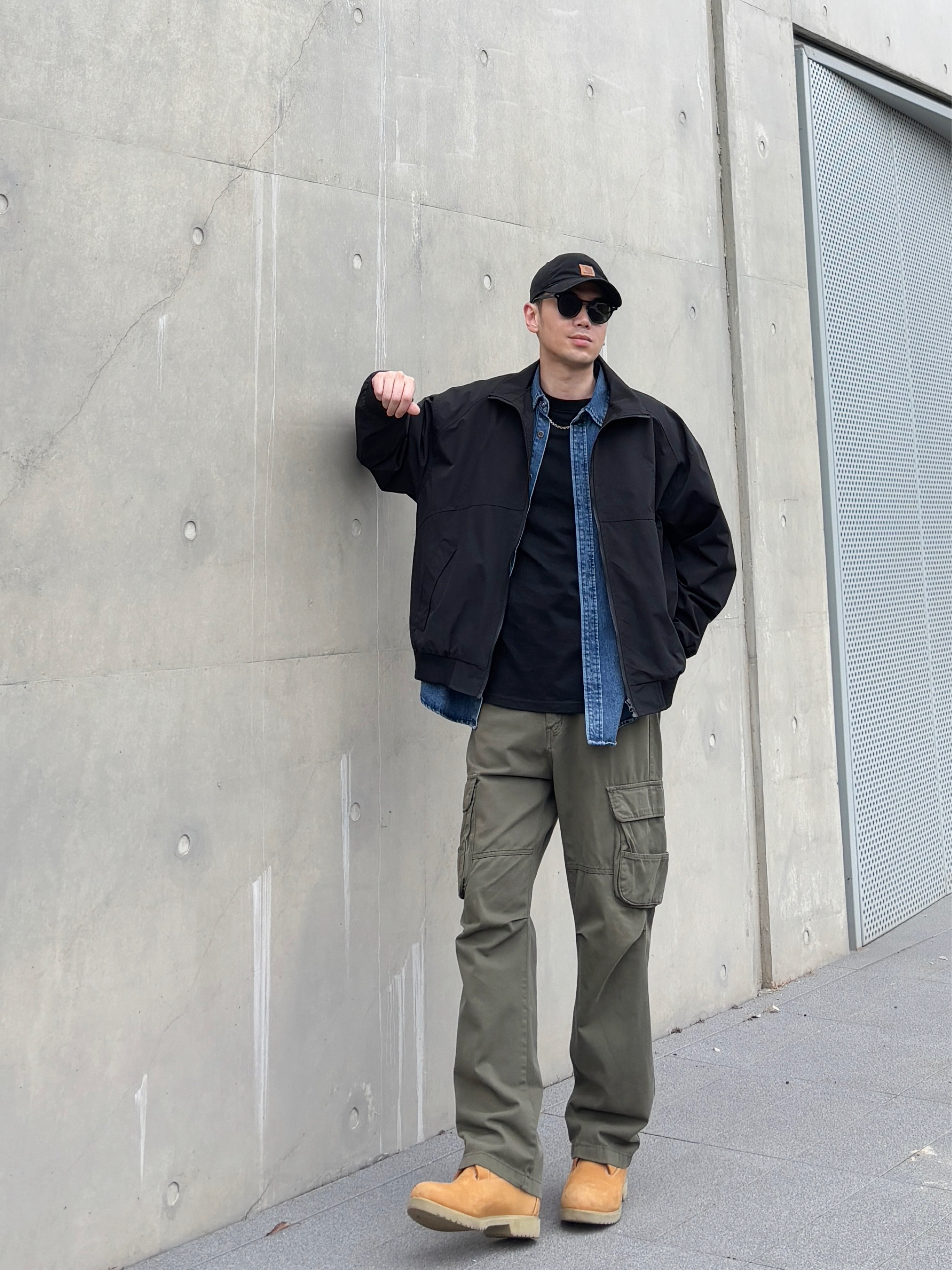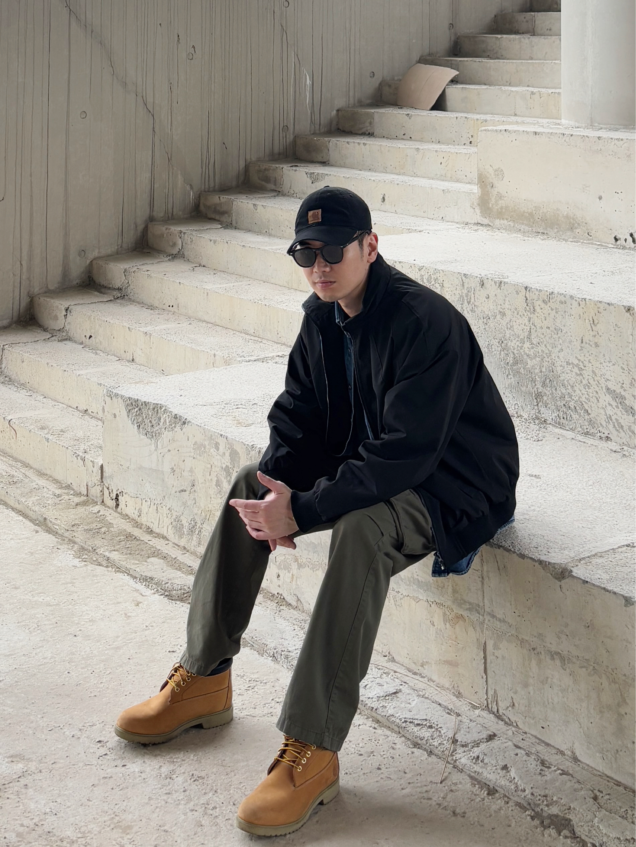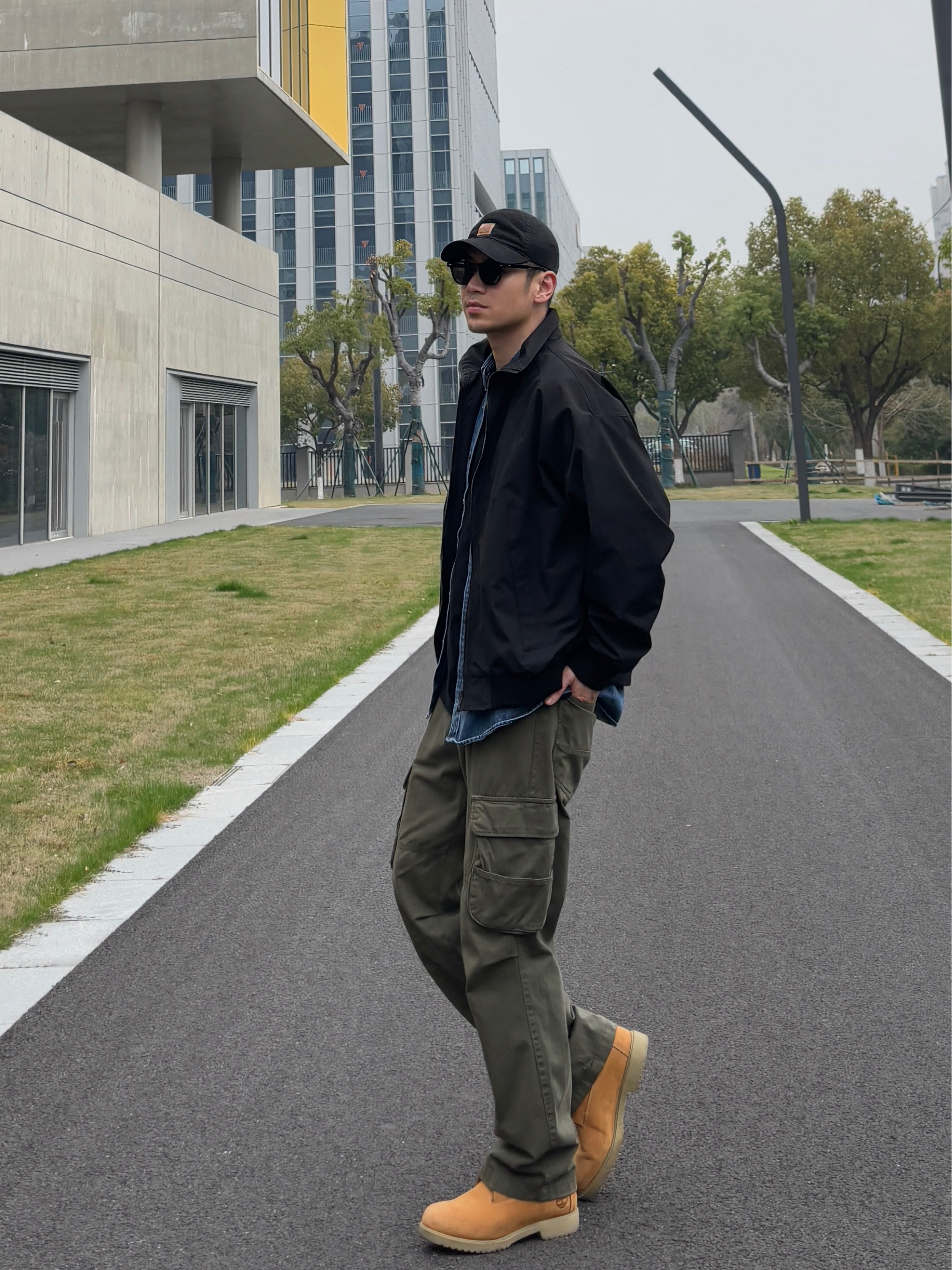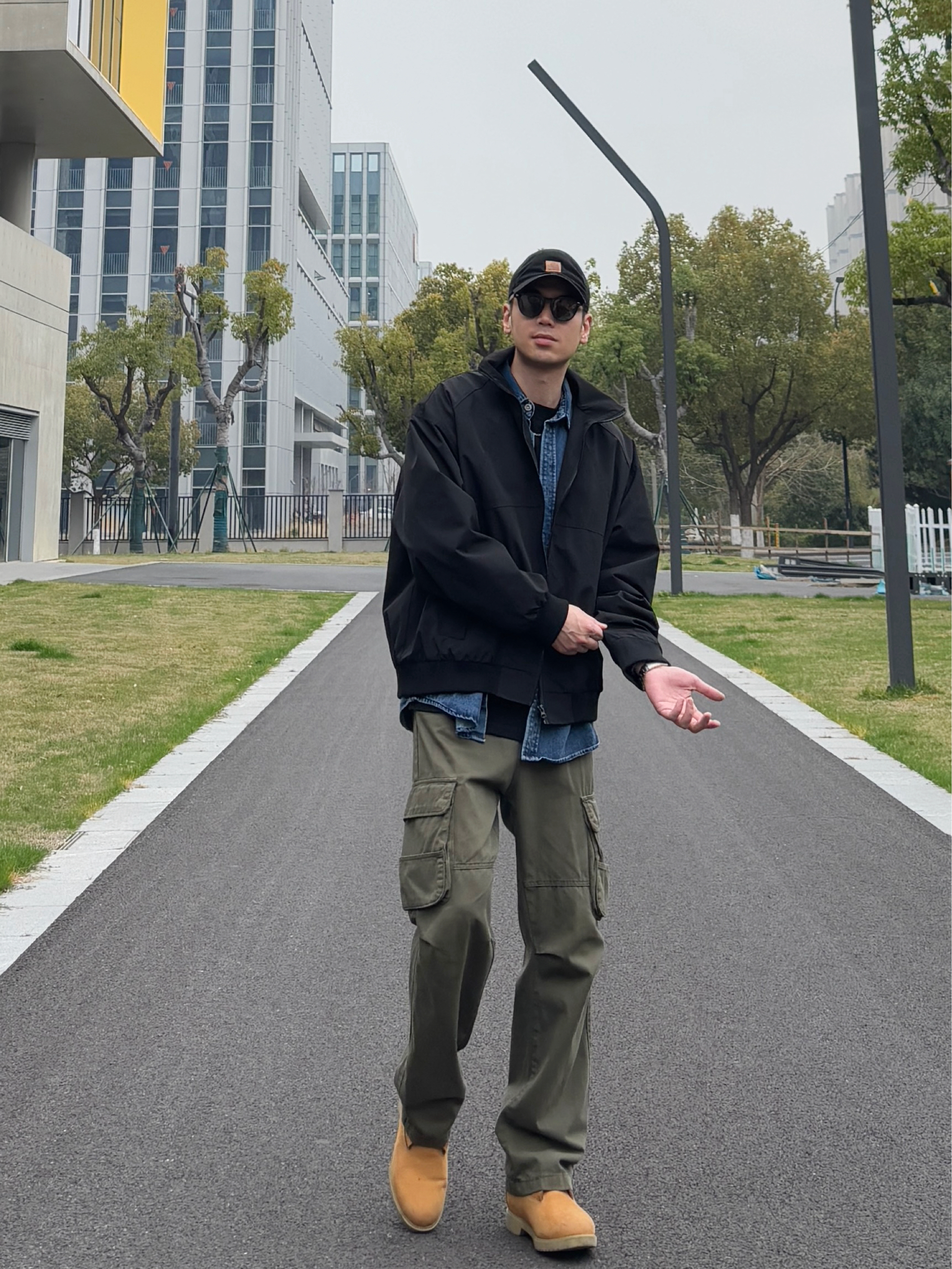 今天这套穿搭主打工装硬朗感💪 上衣黑色廓形立领夹克简约利落,挺括面料上身很有型。内搭蓝色水洗牛仔衬衫,叠穿打造丰富视觉效果,复古质感满满👍 下装军绿色直筒水洗多口袋工装裤,版型宽松不紧绷,做旧纹理很有味道。沙漠黄中帮工装靴加持,硬朗格调一步到位🙋♂️ 一套搭配风格鲜明,配色协调,随性又有力量感,轻松穿出男生该有的利落帅气🤩 - 今日穿搭 衣服裤子:NICE LILI 鞋子:timberland