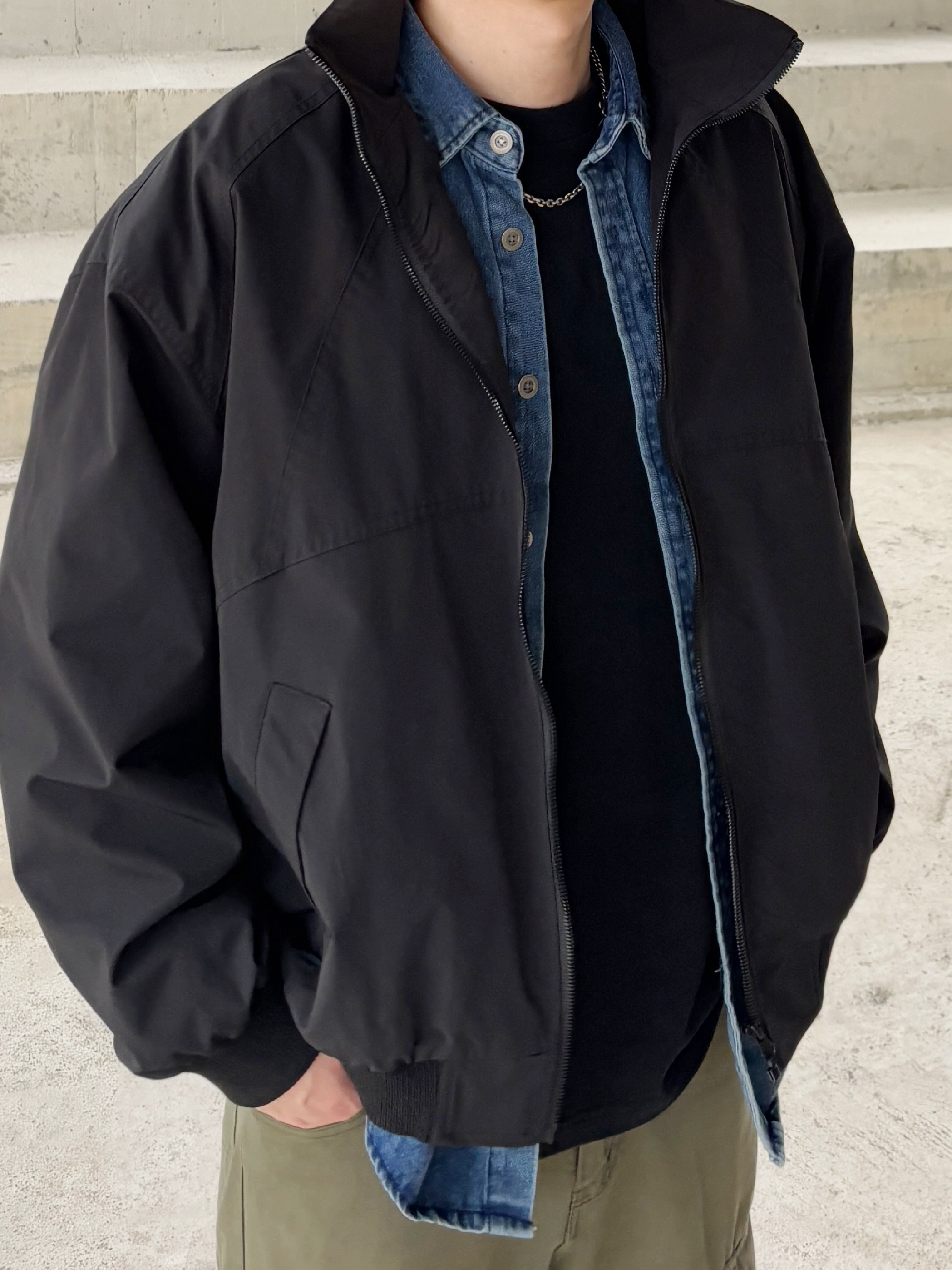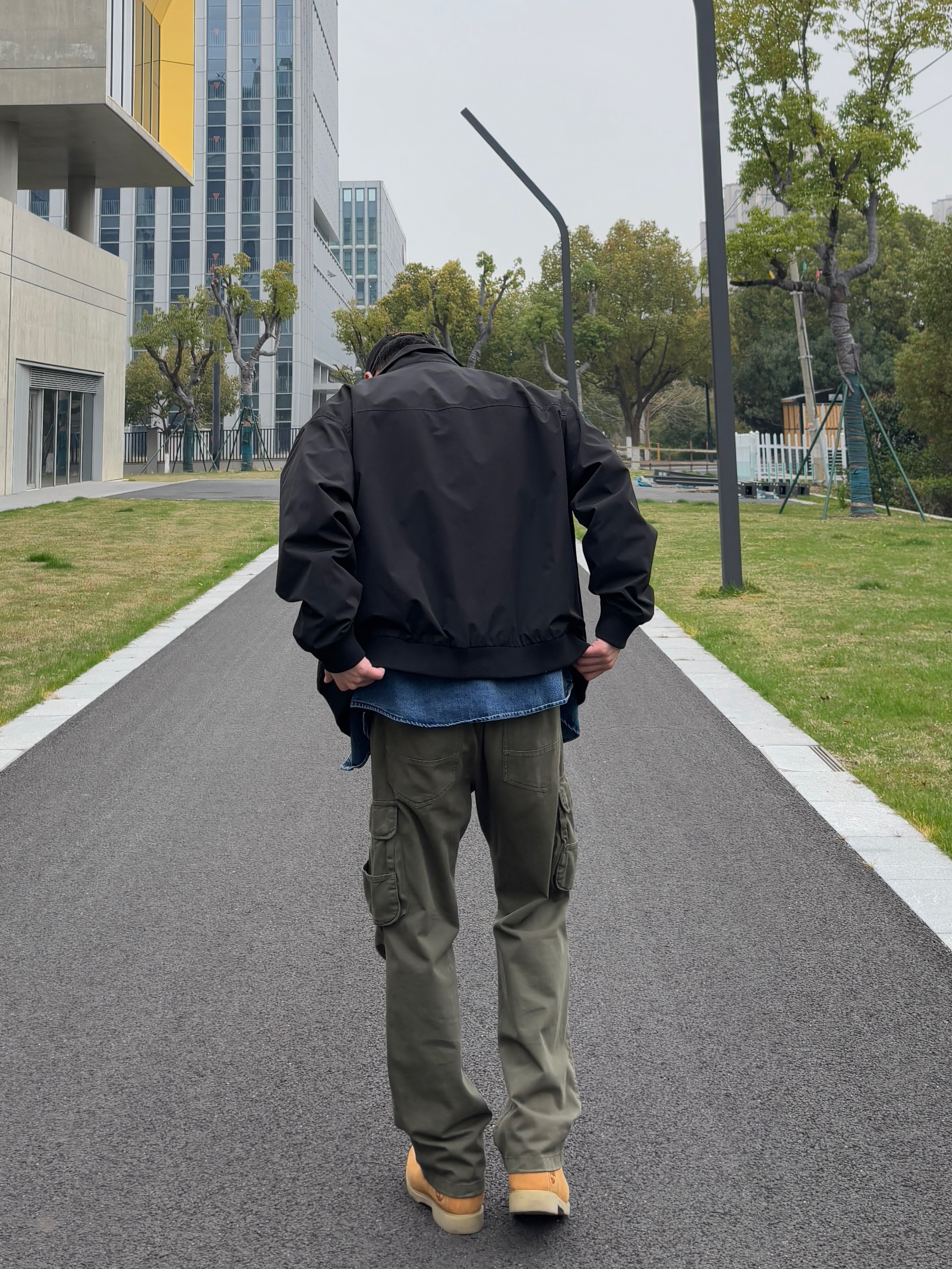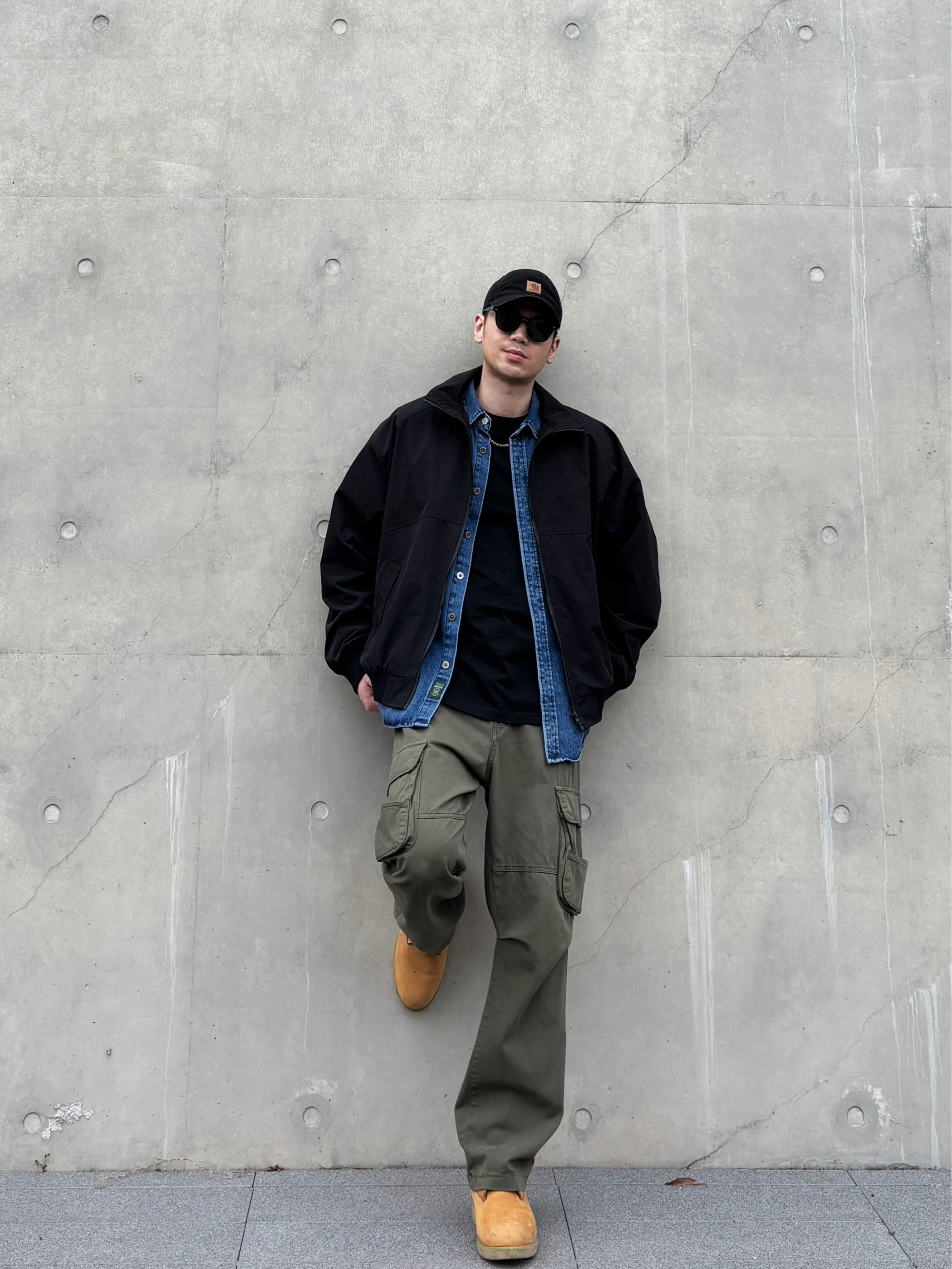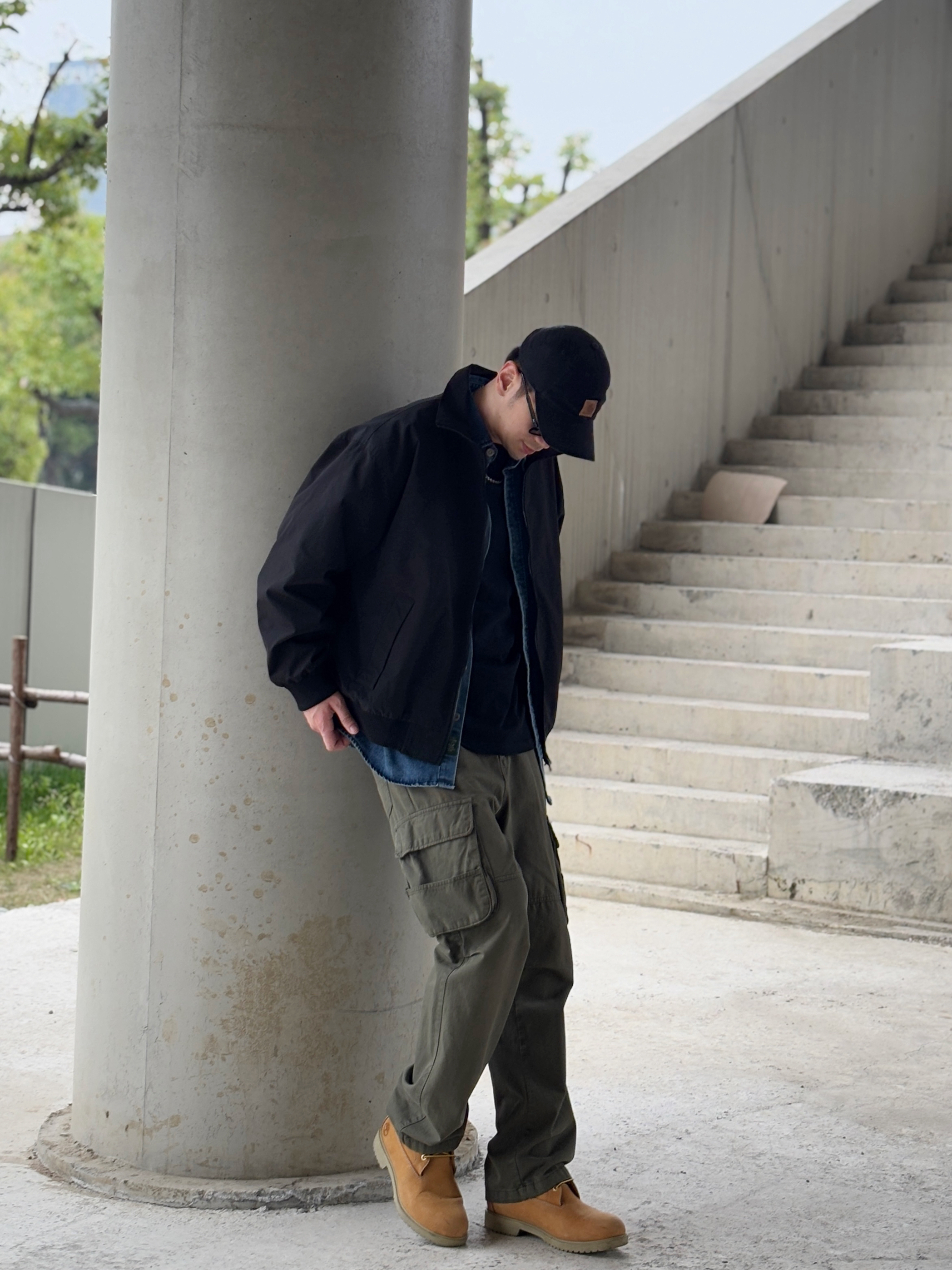 今天这套穿搭主打工装硬朗感💪 上衣黑色廓形立领夹克简约利落,挺括面料上身很有型。内搭蓝色水洗牛仔衬衫,叠穿打造丰富视觉效果,复古质感满满👍 下装军绿色直筒水洗多口袋工装裤,版型宽松不紧绷,做旧纹理很有味道。沙漠黄中帮工装靴加持,硬朗格调一步到位🙋♂️ 一套搭配风格鲜明,配色协调,随性又有力量感,轻松穿出男生该有的利落帅气🤩 - 今日穿搭 衣服裤子:NICE LILI 鞋子:timberland