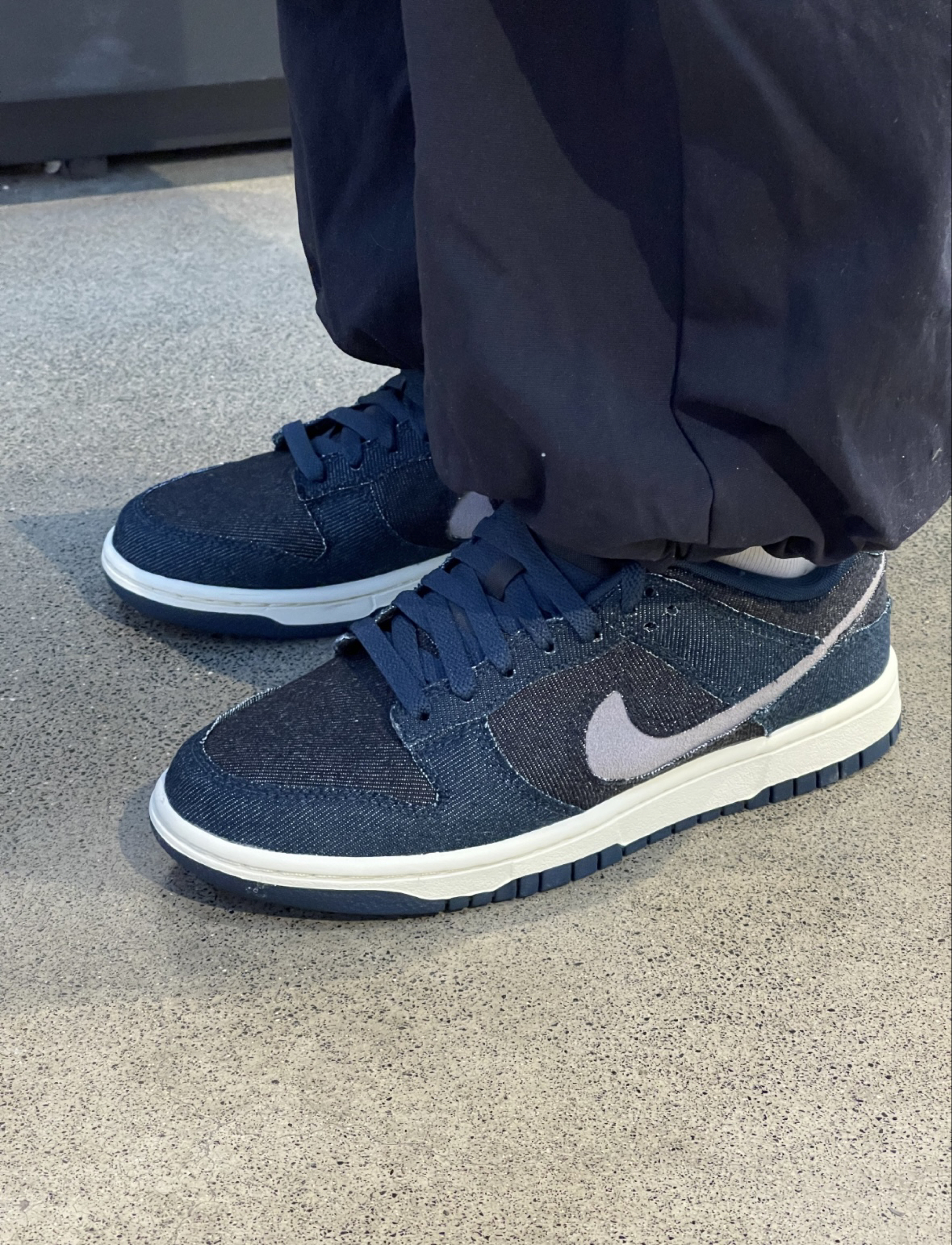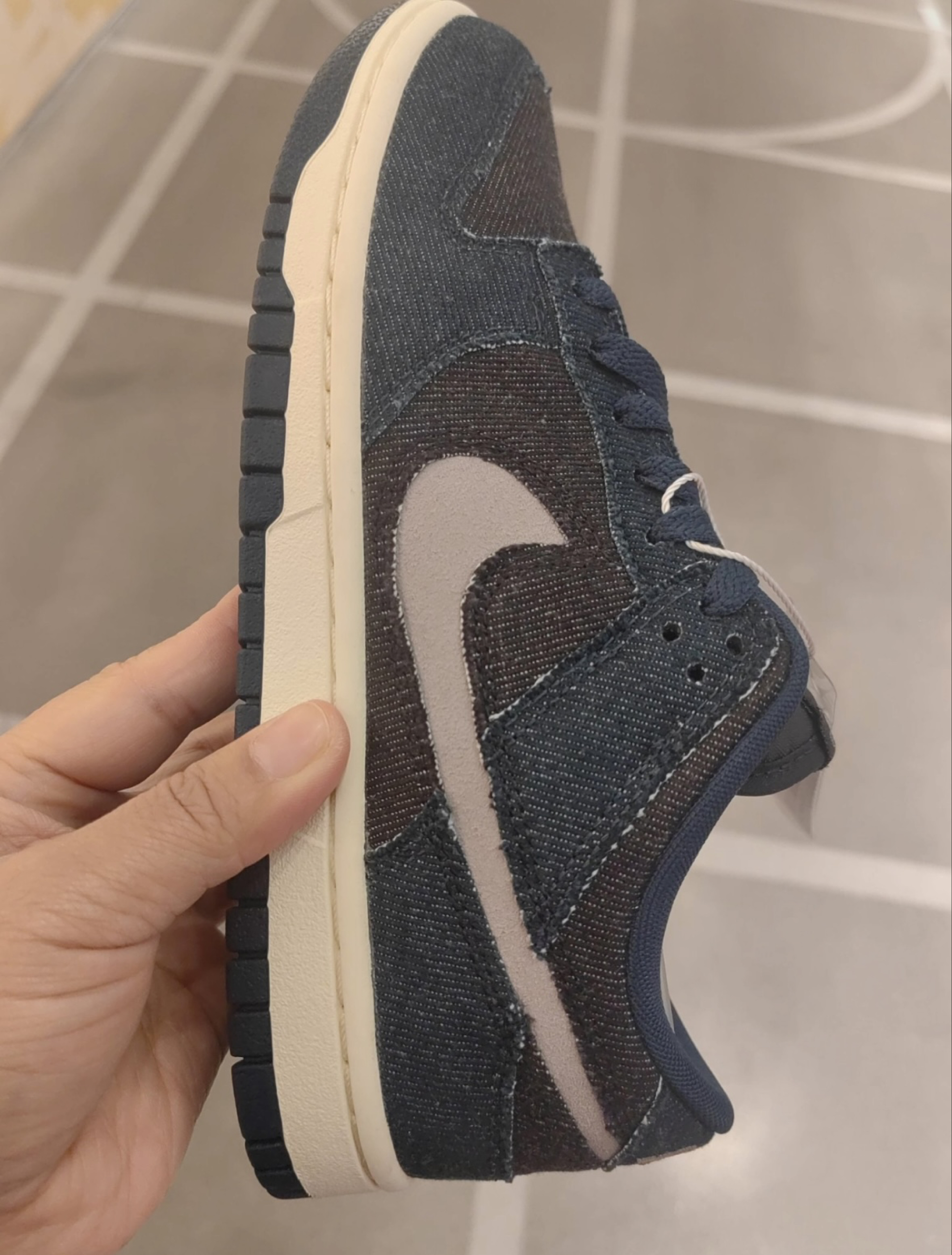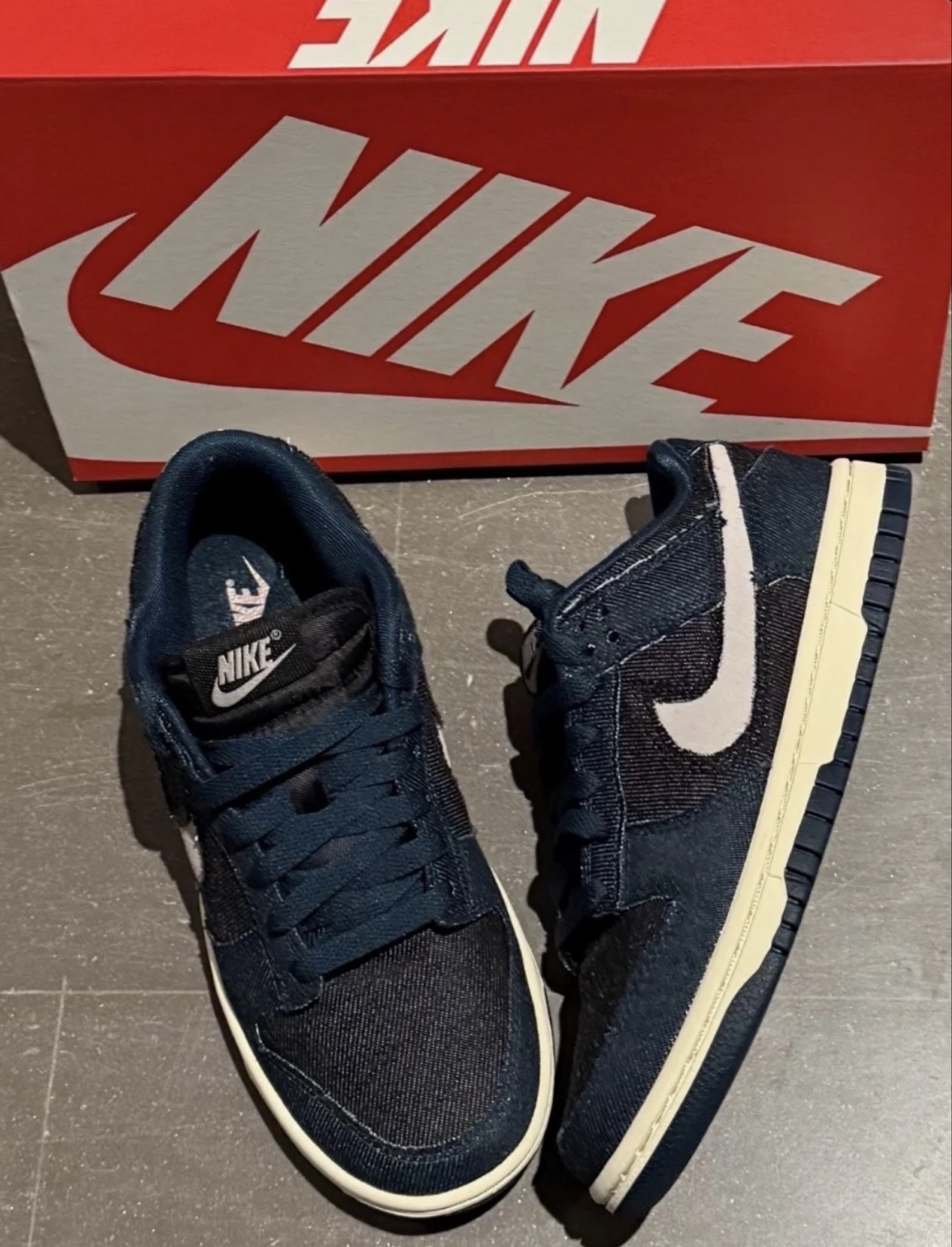 👟 这双鞋的完整介绍 这是 Nike Dunk Low "Armory Navy Denim ✨ 核心设计亮点 • 材质与配色:鞋面采用深浅拼接的牛仔丹宁面料,自带复古做旧质感;Swoosh Logo 用浅灰色麂皮材质点缀,提升了层次感和高级感。 • 复古氛围:米白色做旧中底 + 藏青色外底,完美呼应了90年代的复古球鞋风格,搭配牛仔裤、工装裤都很和谐。 • 细节质感:丹宁面料会随着穿着逐渐变软...