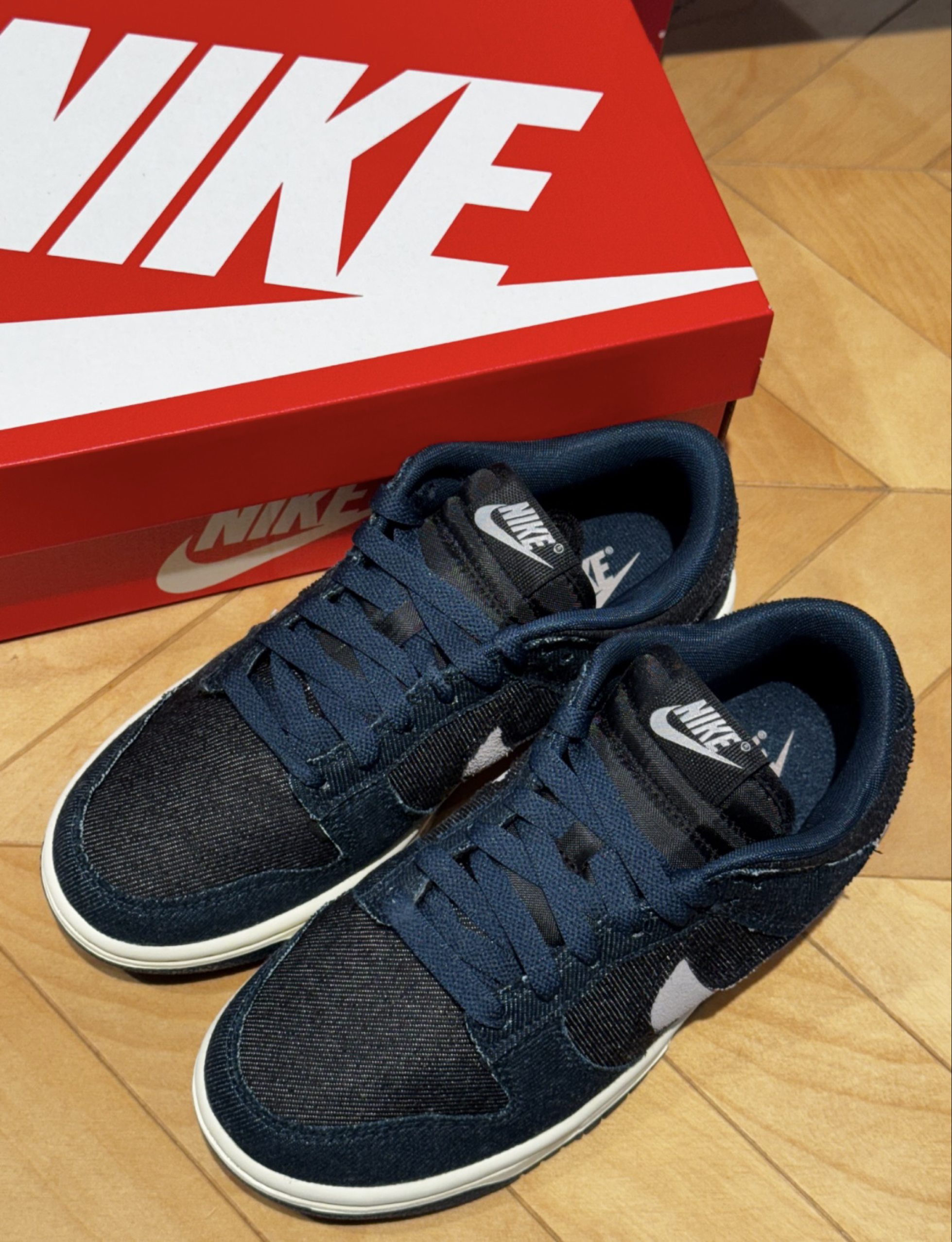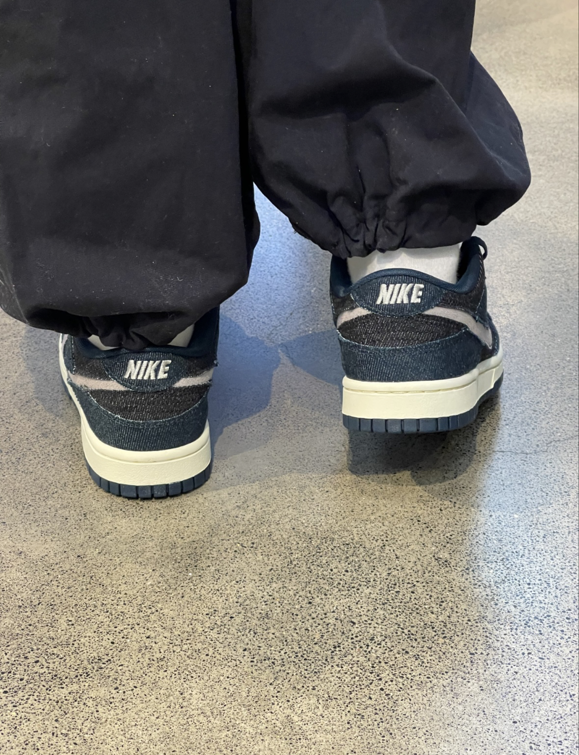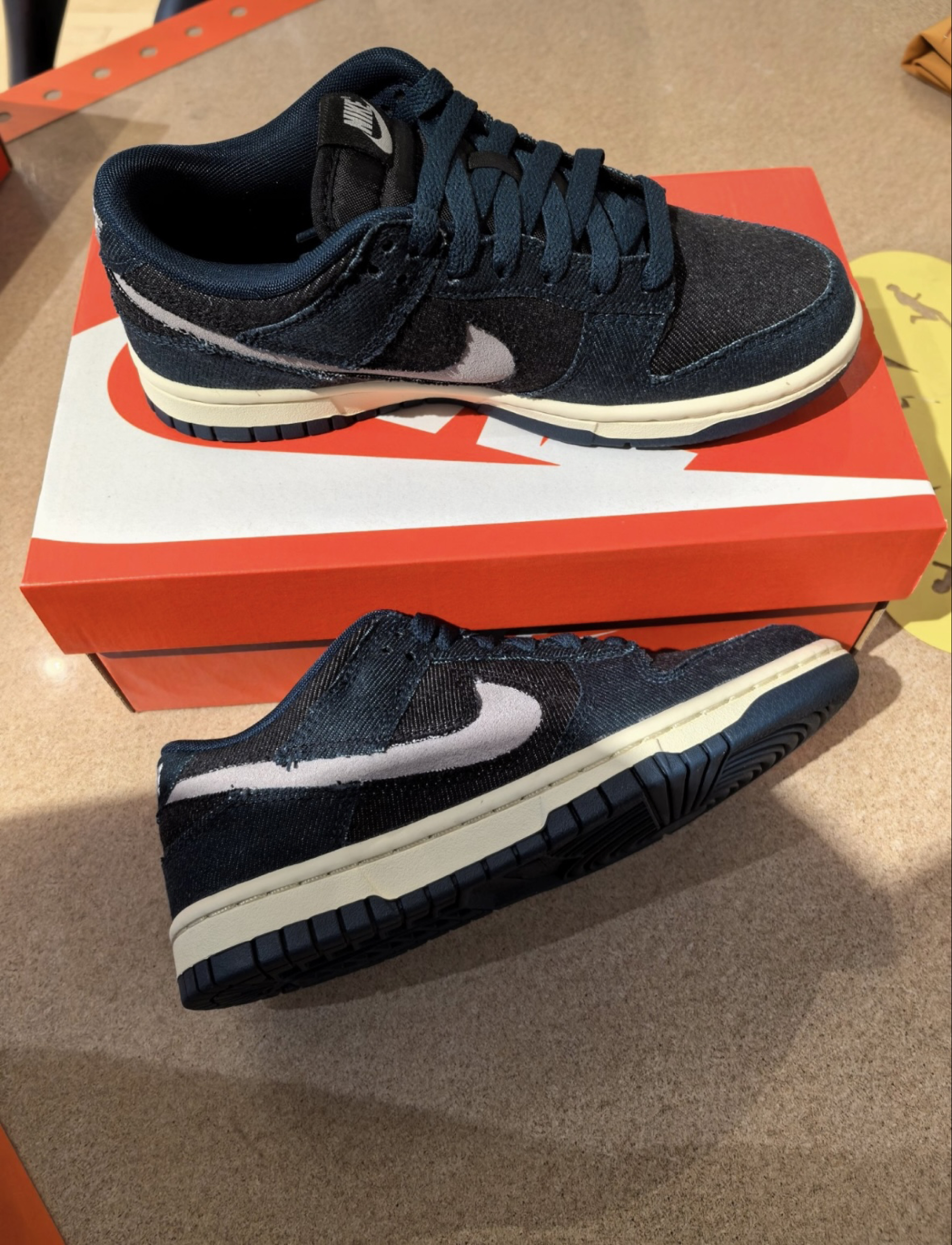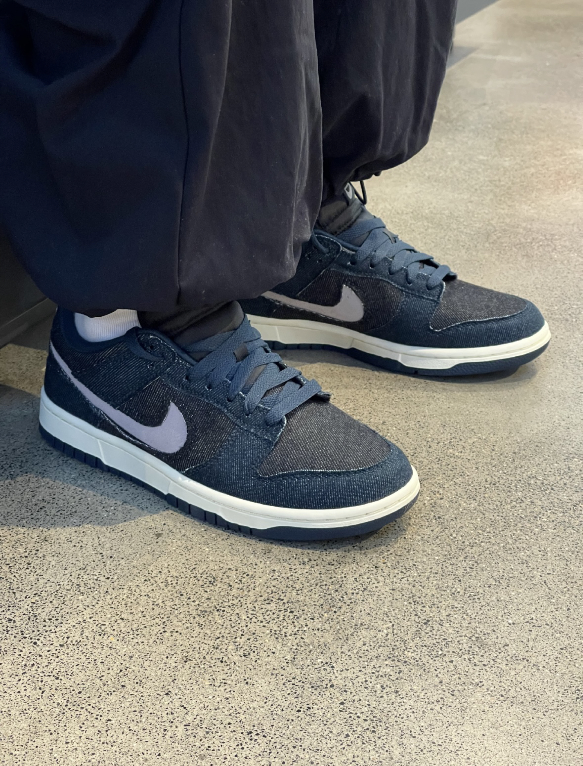 👟 这双鞋的完整介绍 这是 Nike Dunk Low "Armory Navy Denim ✨ 核心设计亮点 • 材质与配色:鞋面采用深浅拼接的牛仔丹宁面料,自带复古做旧质感;Swoosh Logo 用浅灰色麂皮材质点缀,提升了层次感和高级感。 • 复古氛围:米白色做旧中底 + 藏青色外底,完美呼应了90年代的复古球鞋风格,搭配牛仔裤、工装裤都很和谐。 • 细节质感:丹宁面料会随着穿着逐渐变软...