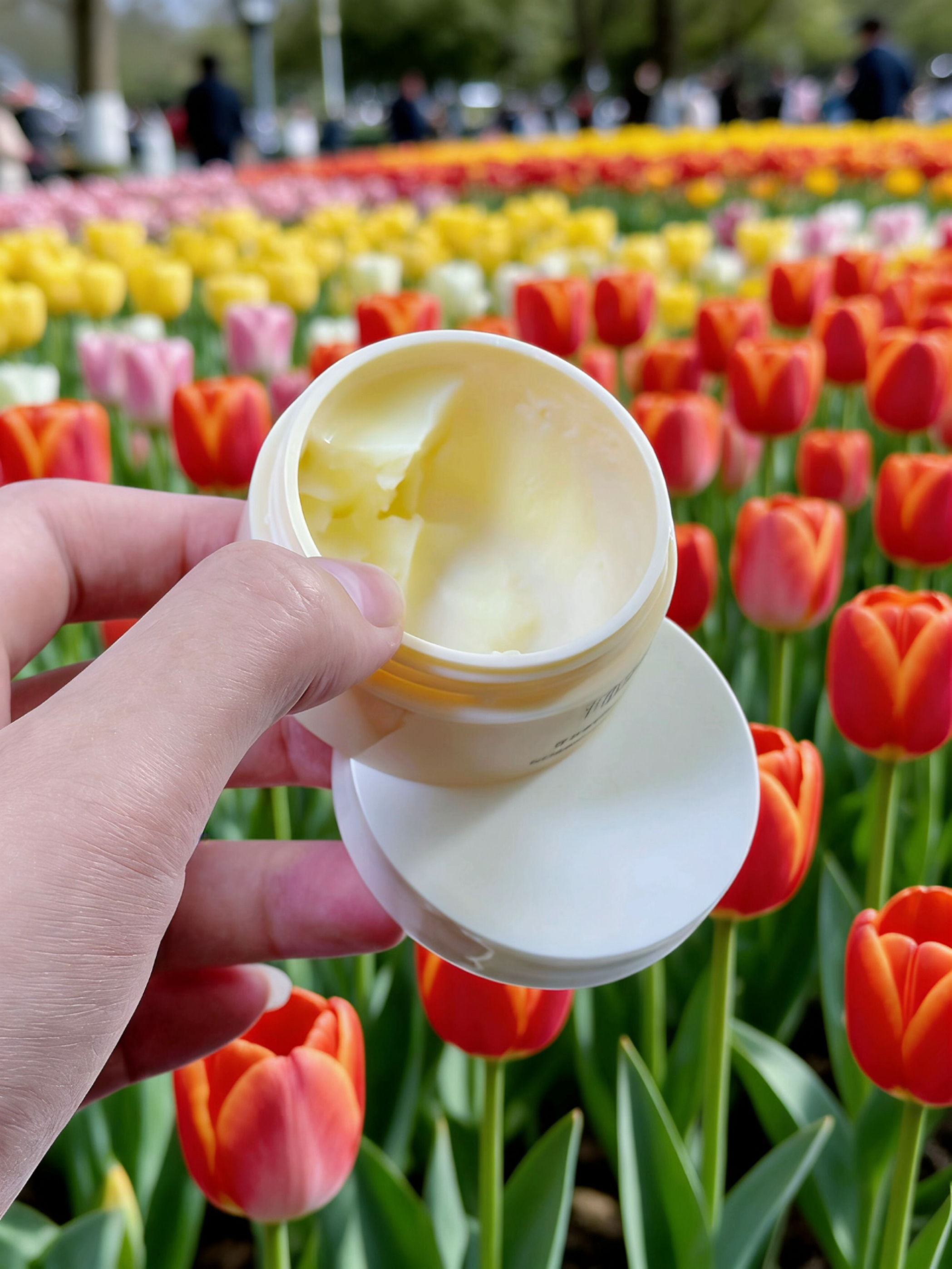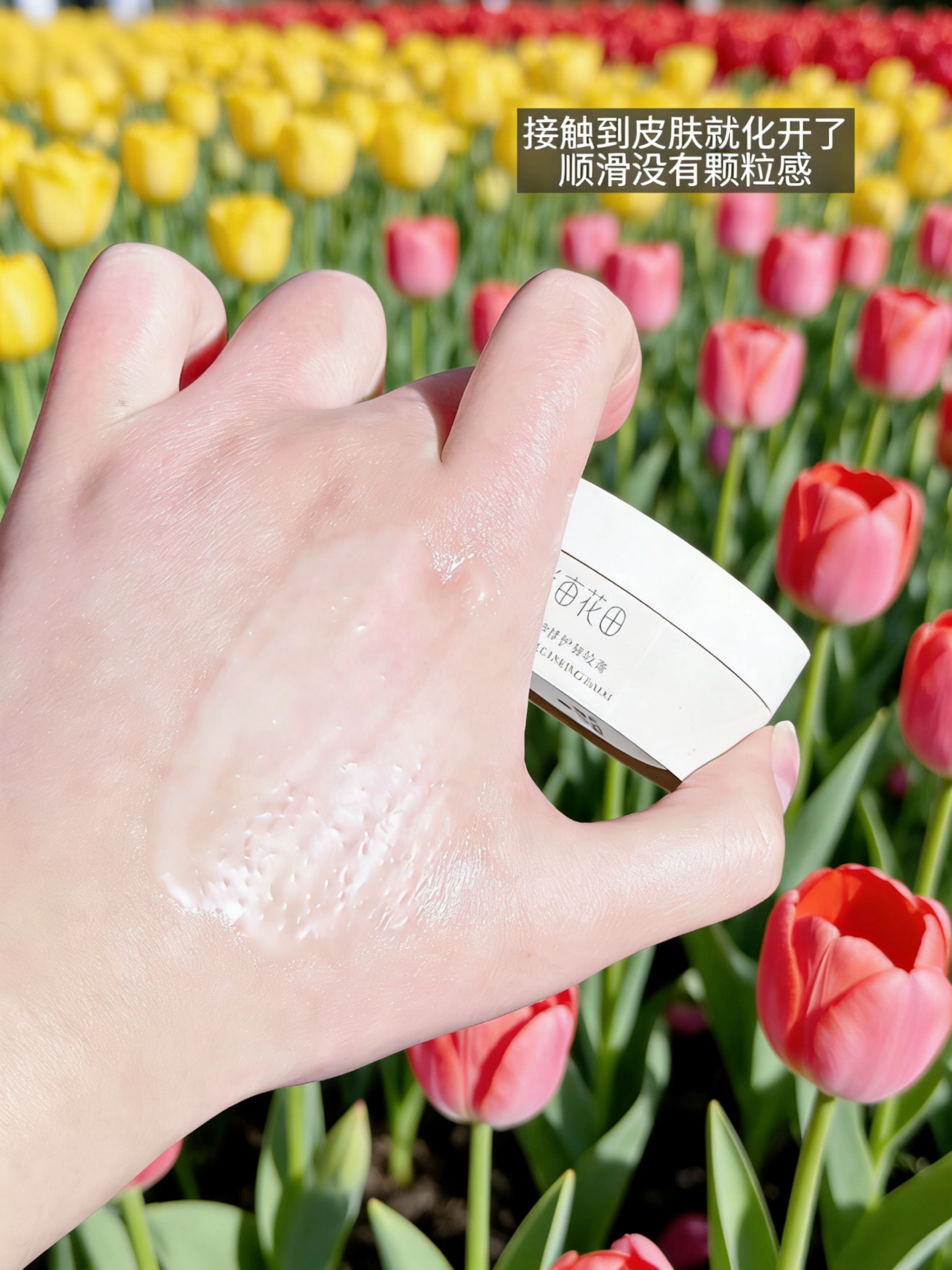 和闺蜜一起去看杭州的郁金香花海 一直玩到晚上才回家,累得连脸都不想抬 挖一块糯叽叽的膏体在掌心轻轻揉搓,瞬间化作丝滑米乳,上脸的刹那就被软乎乎的天然米糯香紧紧包裹,像春日里刚抽芽的嫩禾带着晨露的清甜,又像暖融融的春风裹着刚出锅的白米饭香,瞬间扫掉一整天的疲惫。 平时我都是干手干脸按摩20秒左右,再加水乳化,就像给春日的脸蛋做了个软乎乎的SPA,基本一冲就干净,连带着春日里涂的防晒、清透妆感都被温...