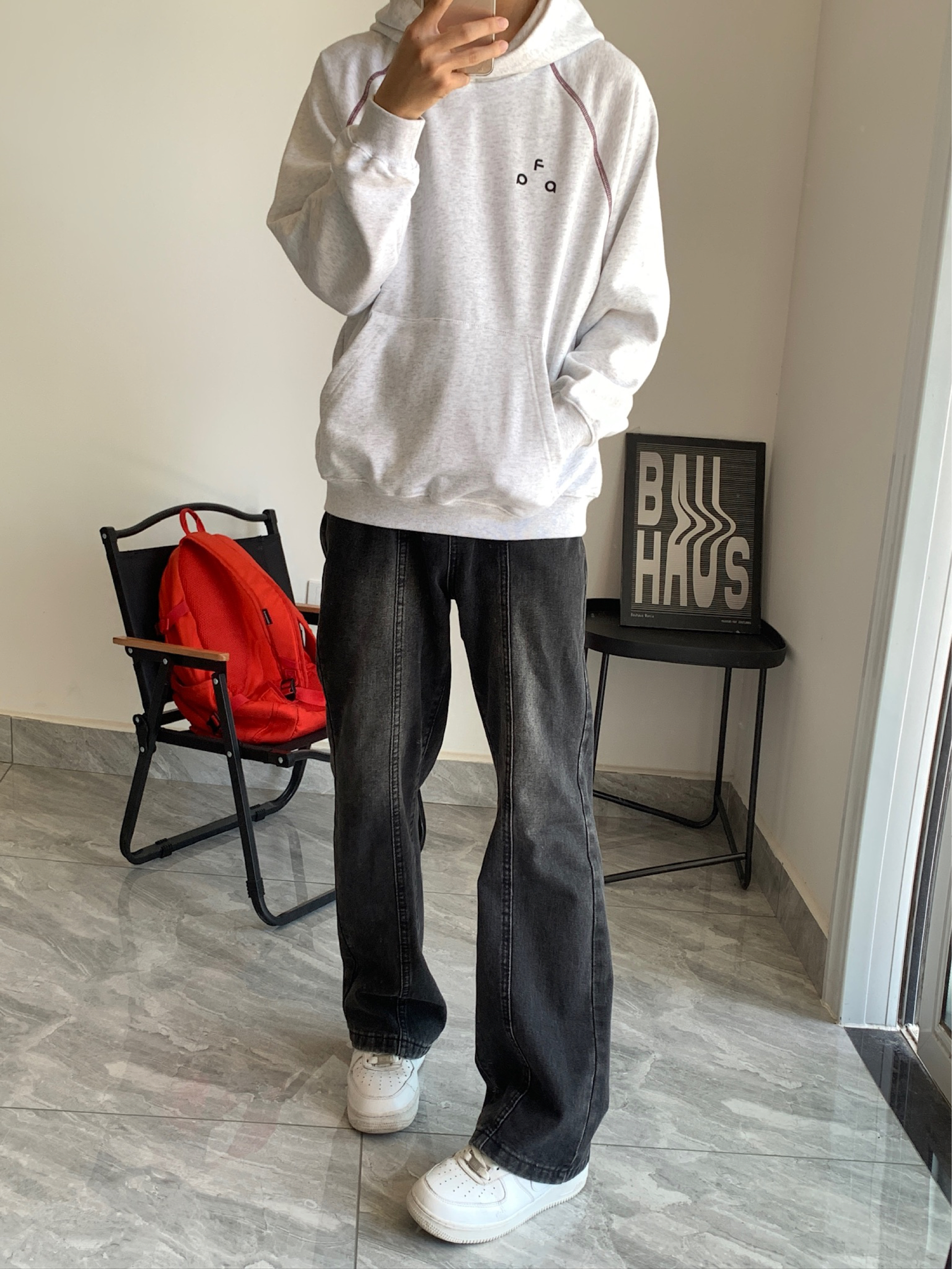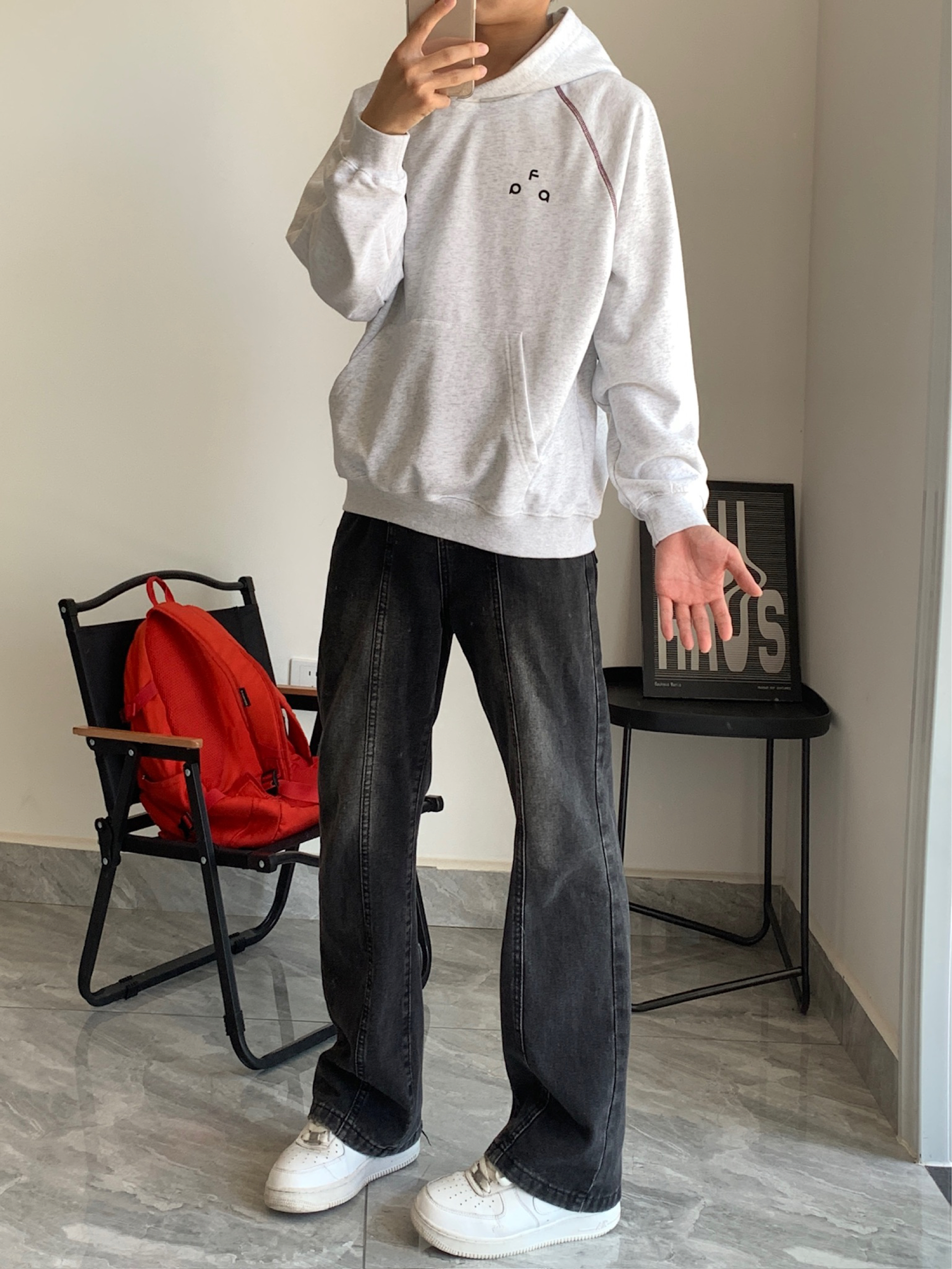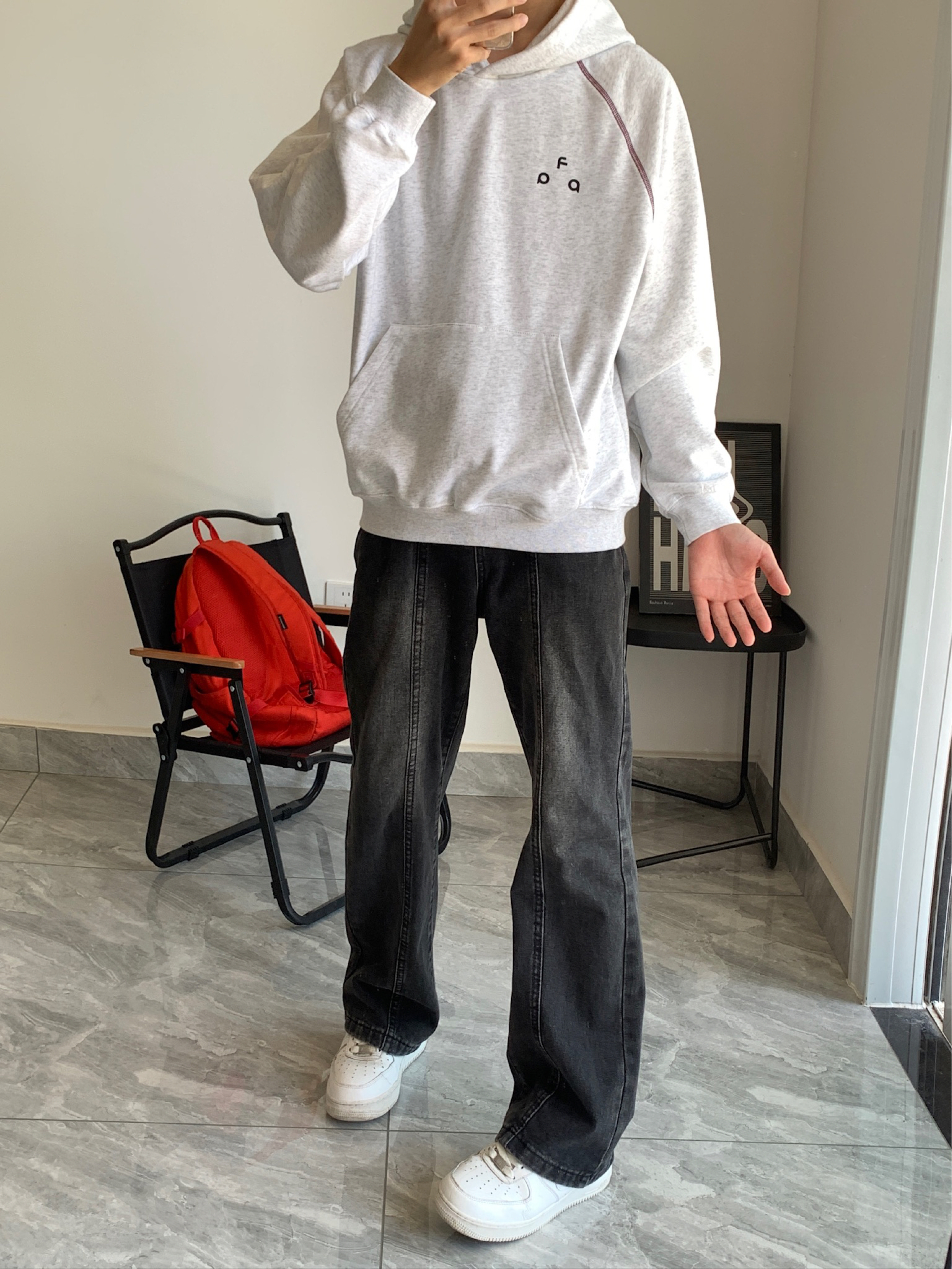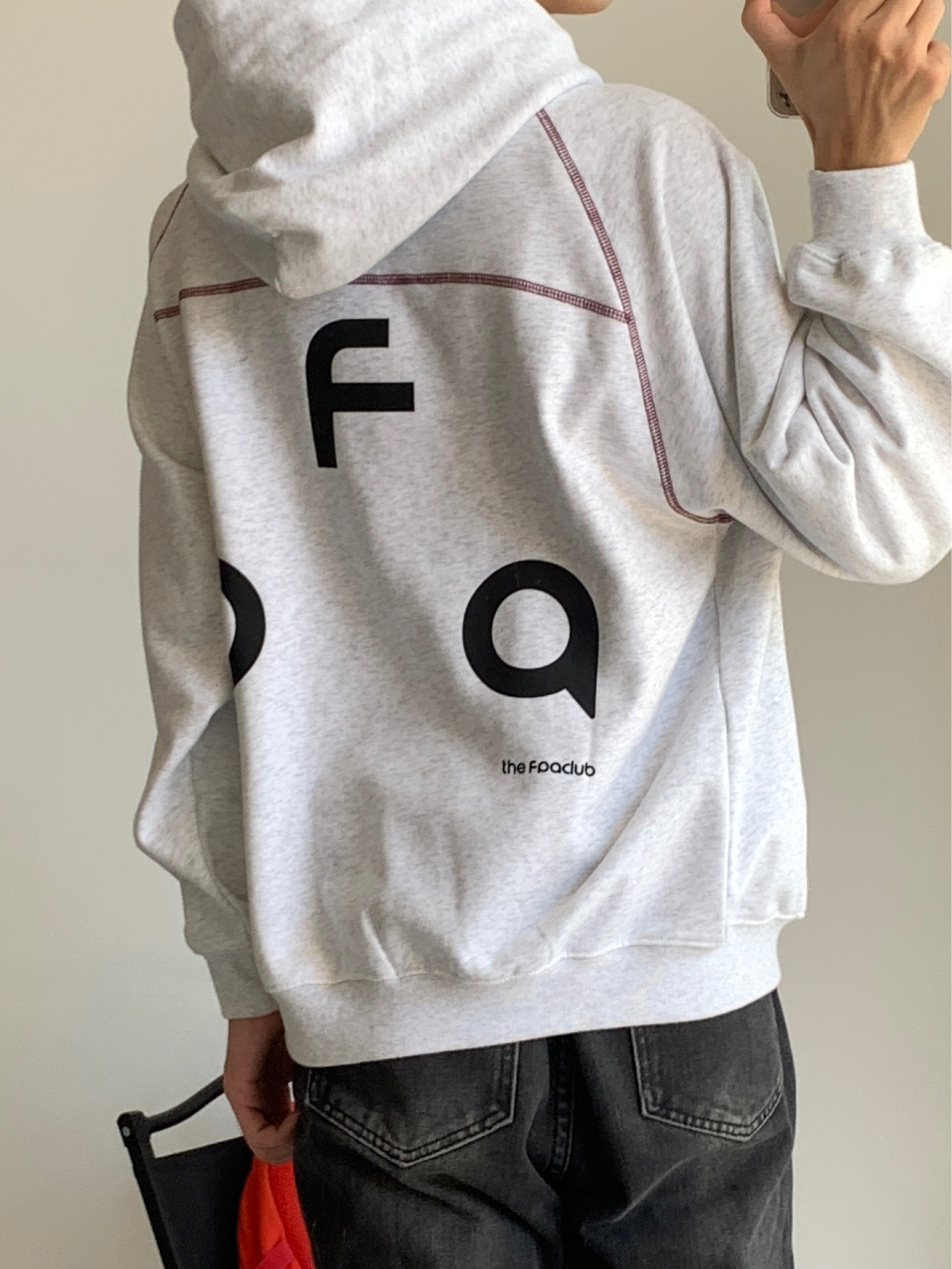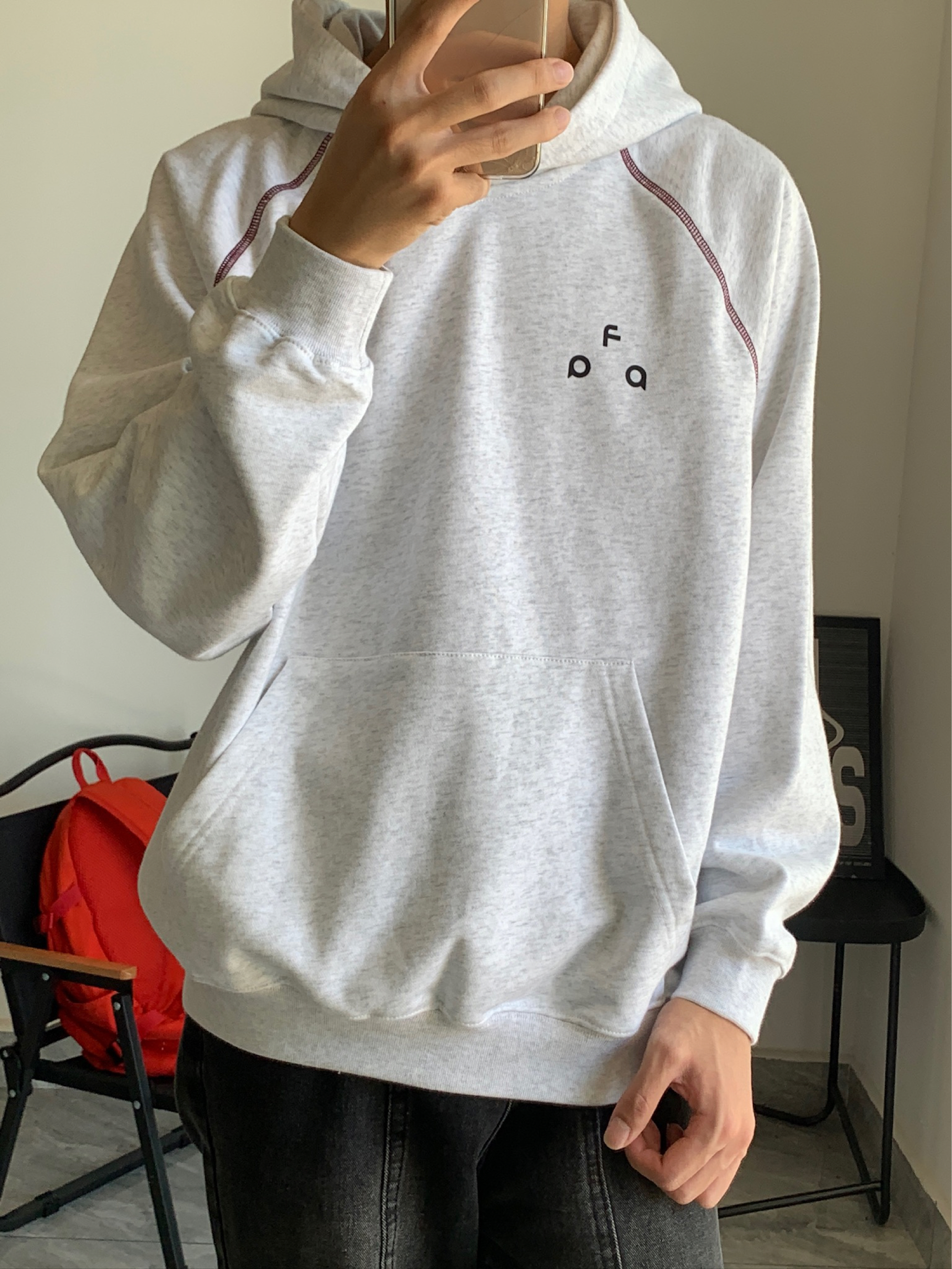 谁懂啊家人们!这件连帽卫衣我已经焊在身上了😎 花灰的颜色巨显白,不挑肤色,黄皮也能冲。正反字母印花很有设计感,正面小标低调,背面大字母吸睛,酒红明线点缀得刚刚好,不会太花哨。下装搭黑牛仔裤,清爽又干净,男生春天这么穿真的很加分!