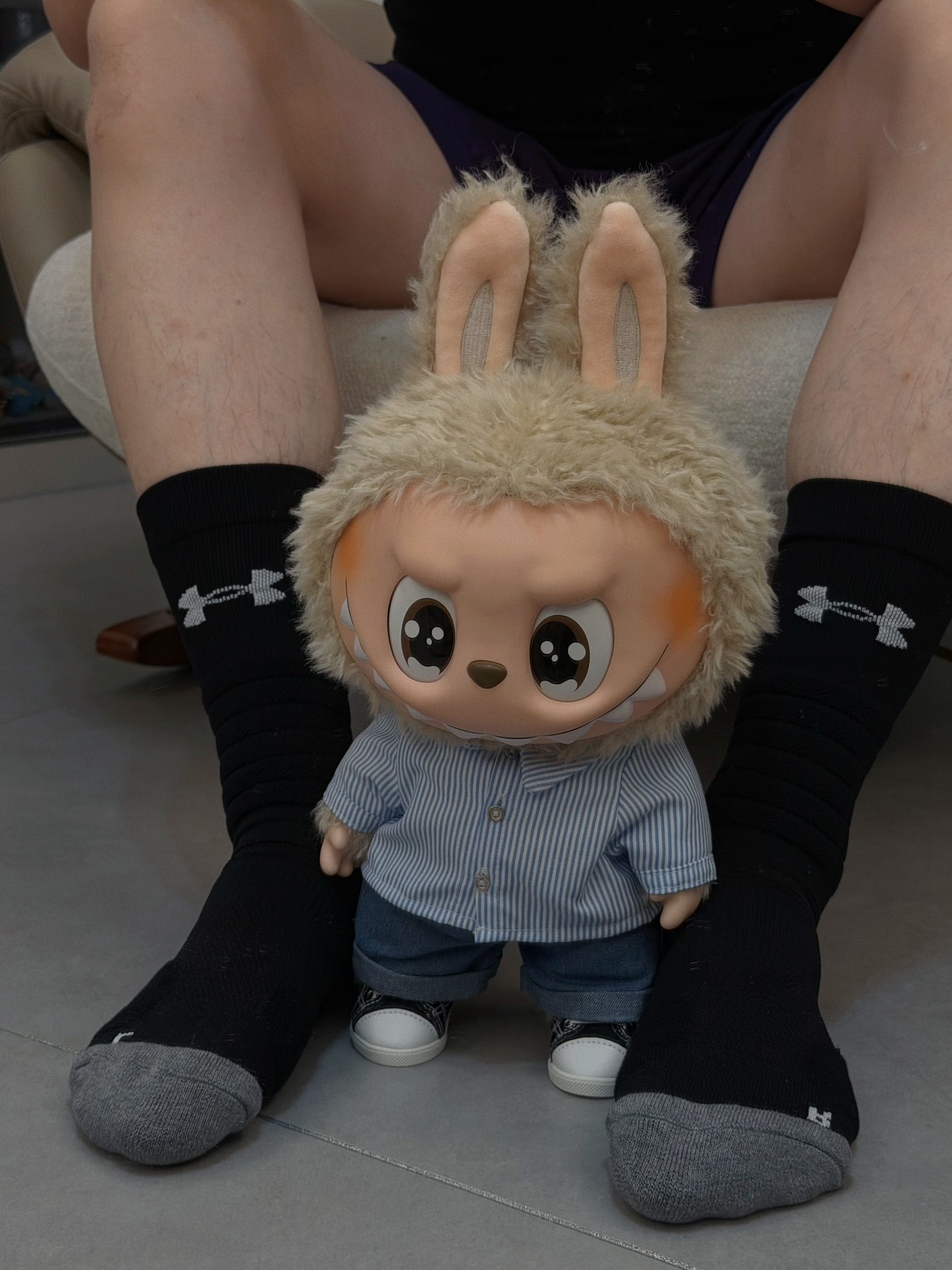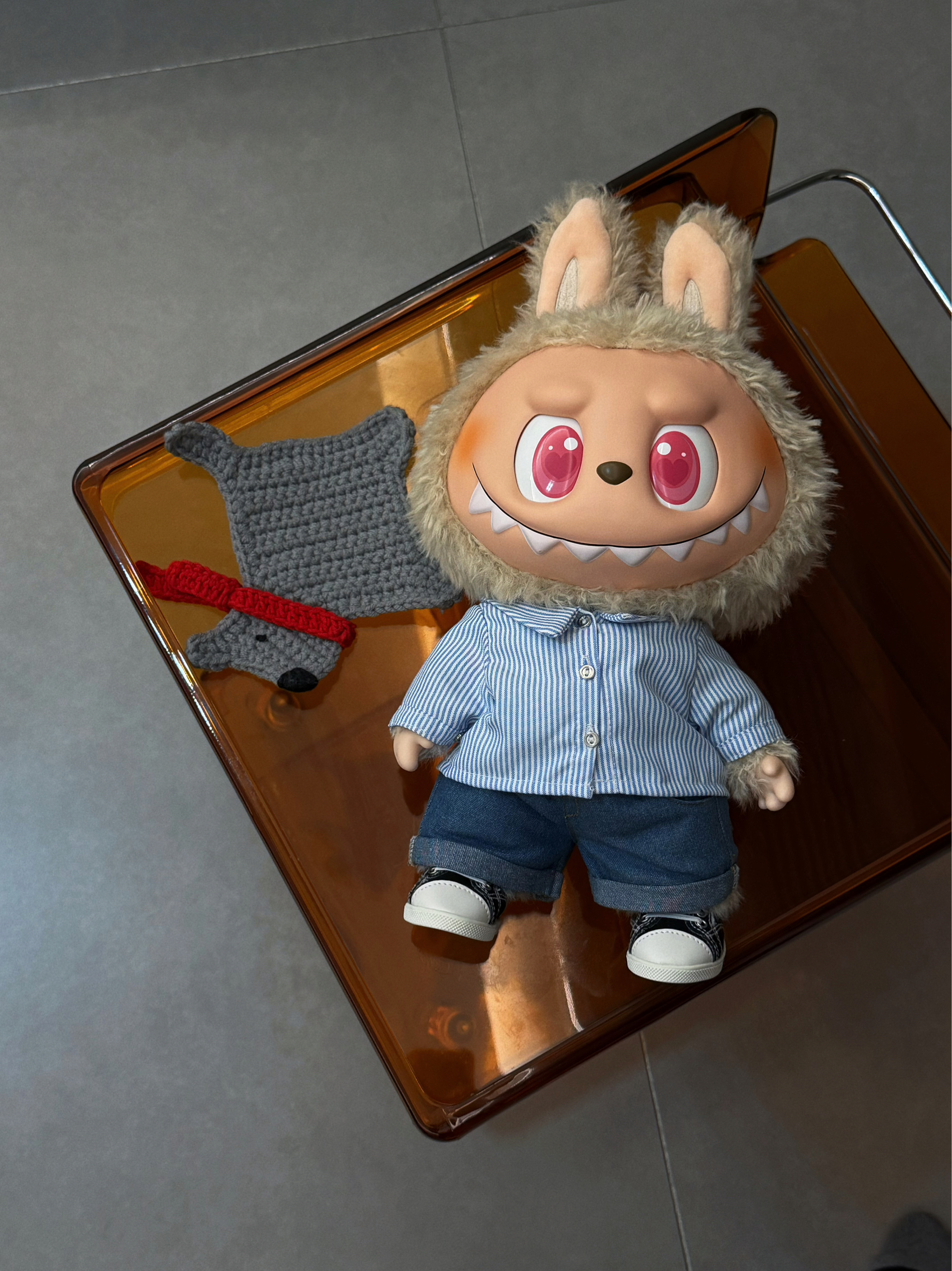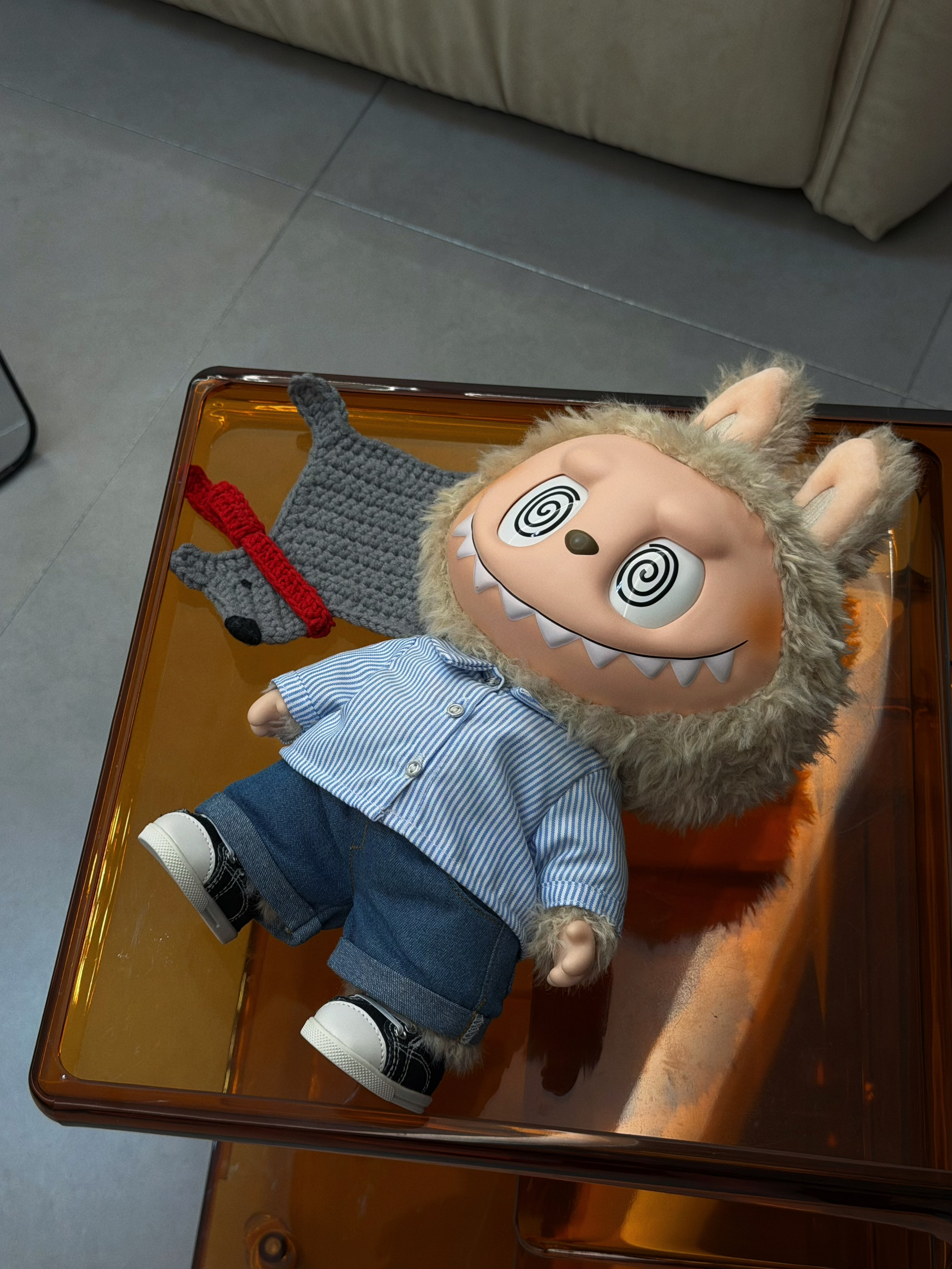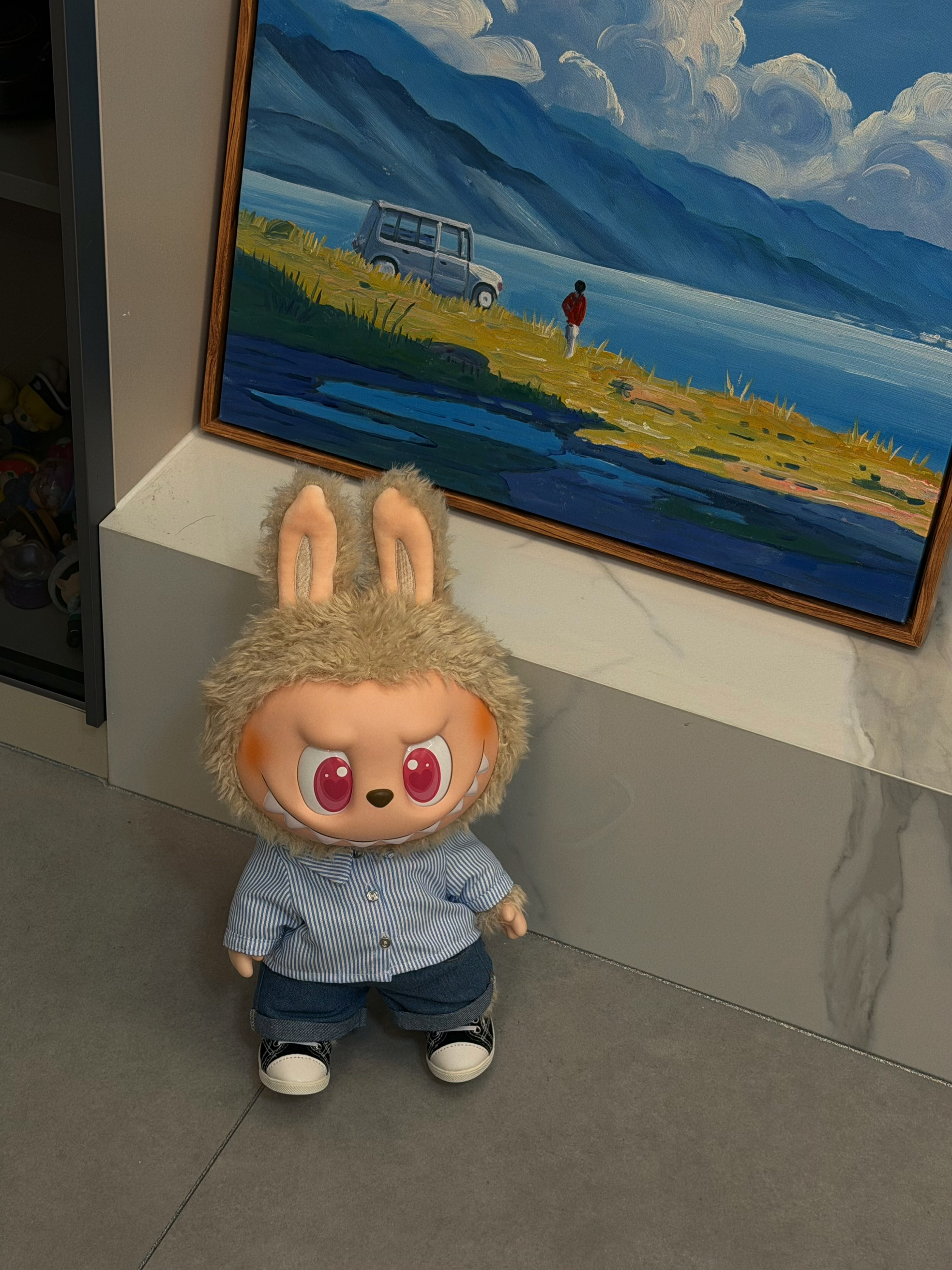 谁能拒绝一只会过夏天的调皮Labubu啊! 搭配夏日衬衫+卷边牛仔裤,随性又潮酷。 可换眼设计藏着小惊喜,星星眼、爱心眼、鹰眼、经典棕眼一键切换,每一种眼神都有不一样的氛围感。🩵