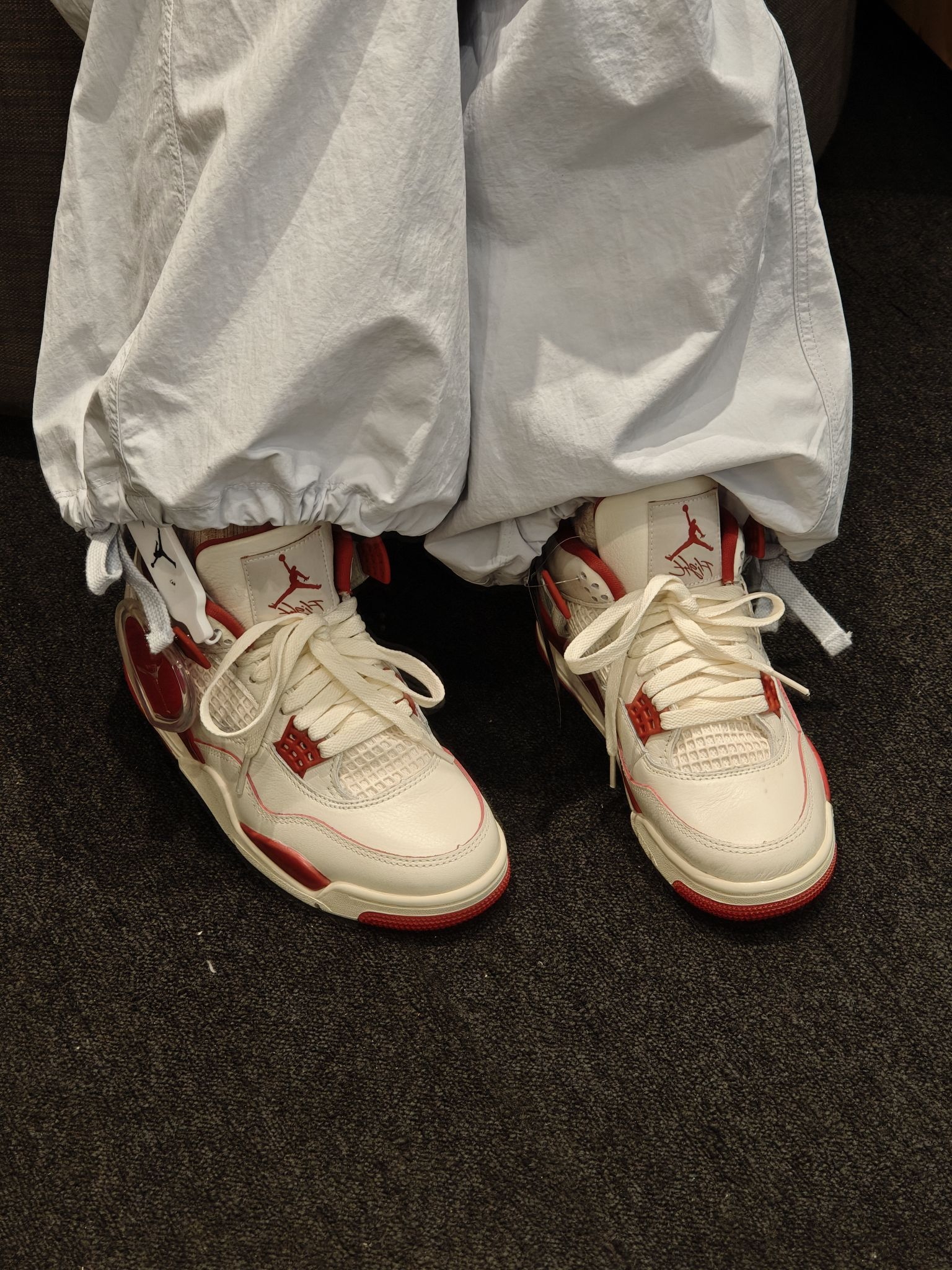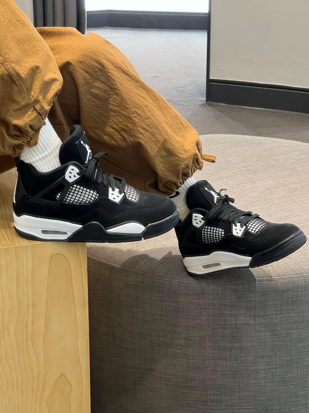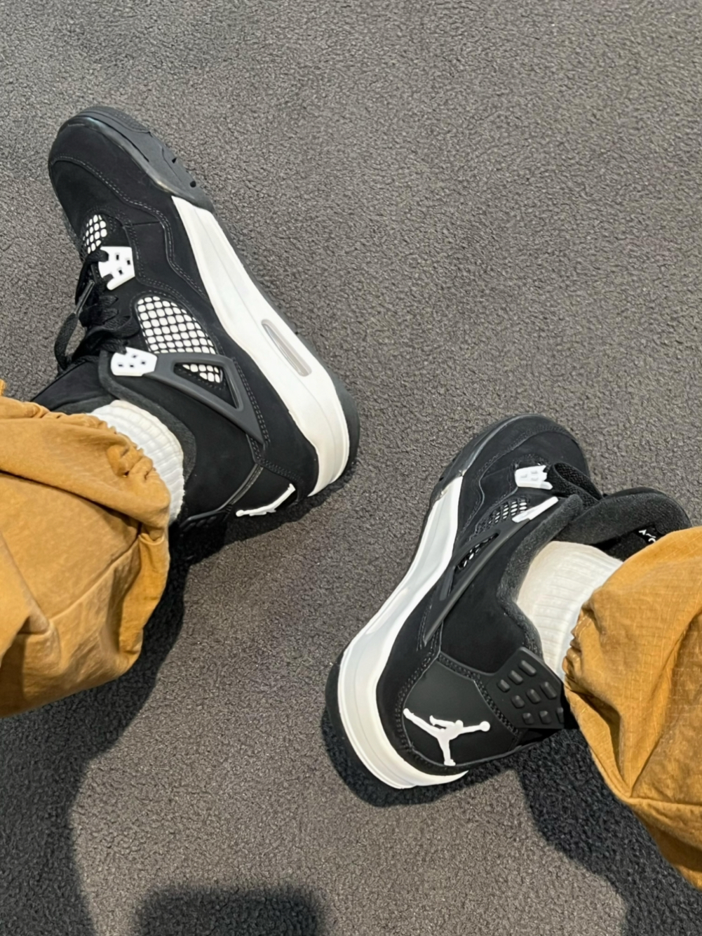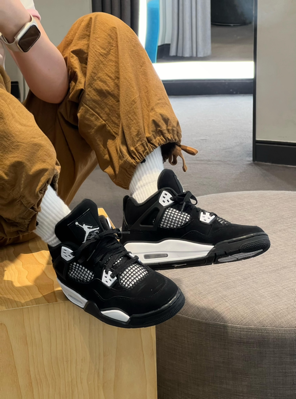 谁懂啊!AJ4黑白恐惧真的是永不过时的复古神鞋🖤🤍 经典黑白撞色+网眼透气设计,质感直接拉满 标志性的塑料扣+后跟飞人logo,辨识度拉满 上脚秒变街头潮人,配工装裤、牛仔裤都超绝 不管是日常出街还是街头耍帅,这双都能打 经典配色永远看不腻,潮人闭眼冲!