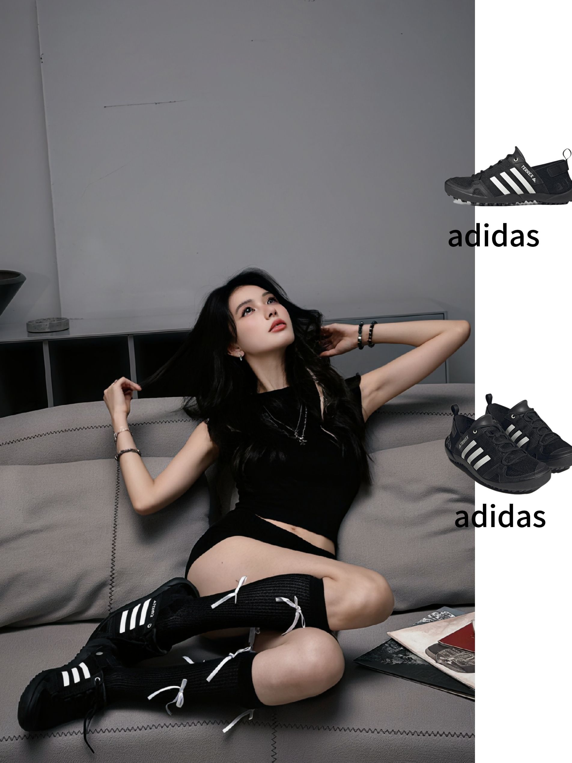 谁懂啊!一身黑真的又酷又显身材!无袖短上衣+紧身短裤,露腰又显腿长,氛围感拉满。 搭配带白蝴蝶结的中筒袜和这双黑德训,甜酷感直接拉满,走路带风还显脚小。 日常出街或拍照都超上镜,完全不挑人,爱惨这种又A又甜的风格! cr:方圆