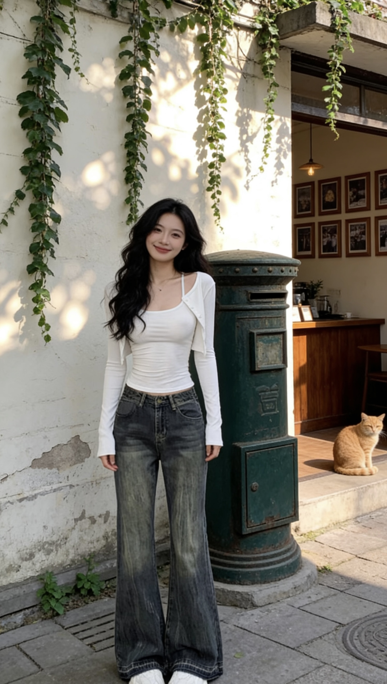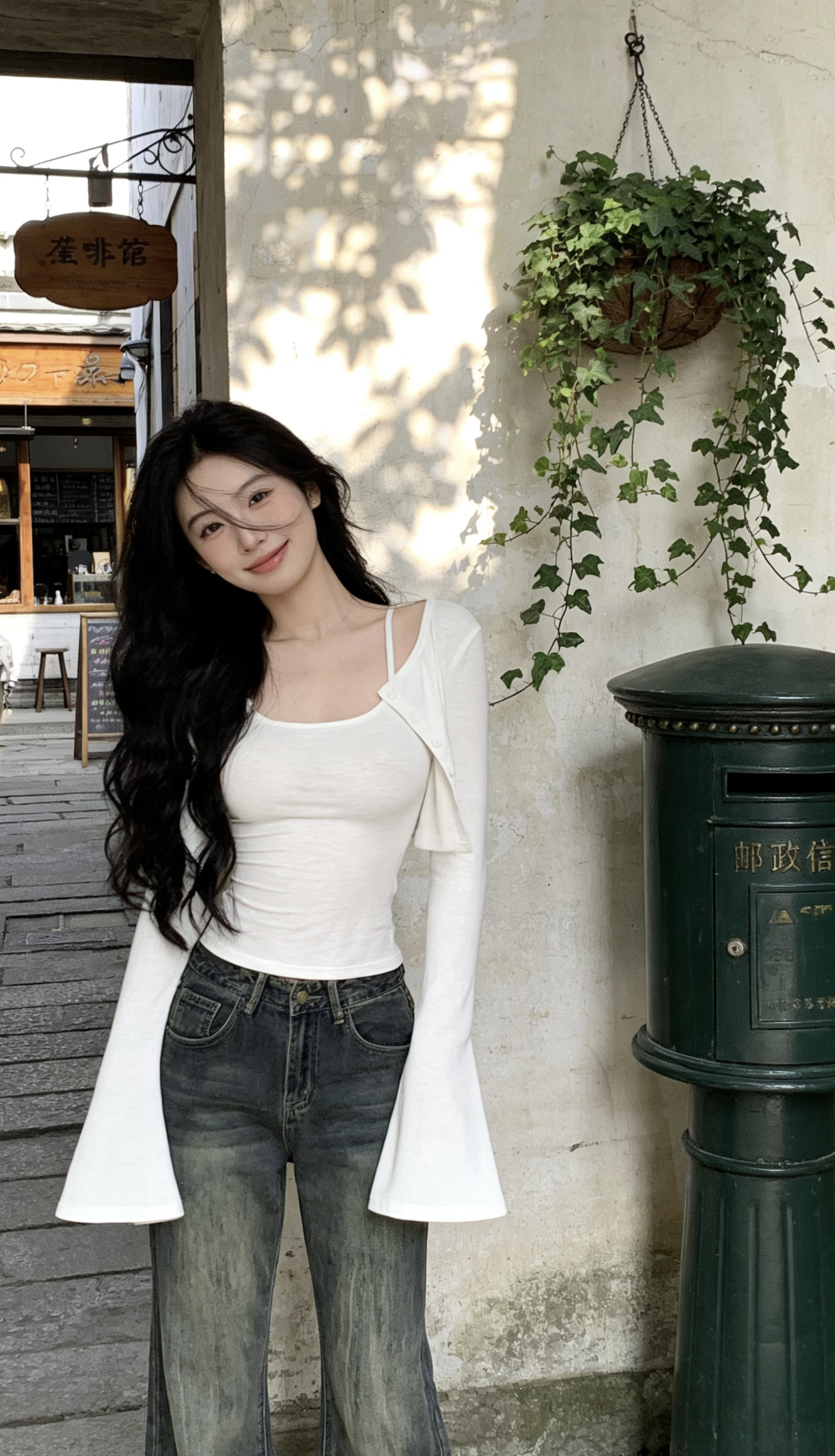 谁懂啊!这套早春穿搭真的把青春活力和慵懒感拿捏得死死的😭 白色针织两件套太绝了!修身吊带+开衫的设计,纯欲感直接拉满,修身剪裁把身材曲线完美展现,开衫还能防晒,早春穿刚刚好✨ 下半身搭配做旧水洗微喇牛仔裤,复古感拉满,垂坠感超强,梨形身材直接闭眼冲,秒变三七分大长腿! 再配上一双奶白老爹鞋,整套穿搭清爽又活力,青春感直接爆棚~ 老城区巷弄里阳光斜照,随便一拍都是氛围感大片,不管是约会还是和闺蜜...