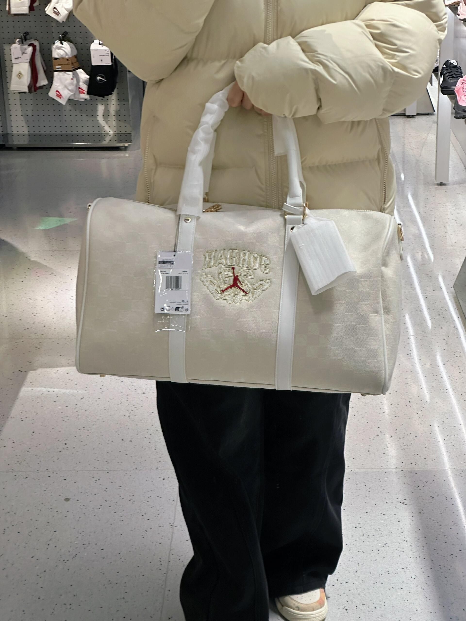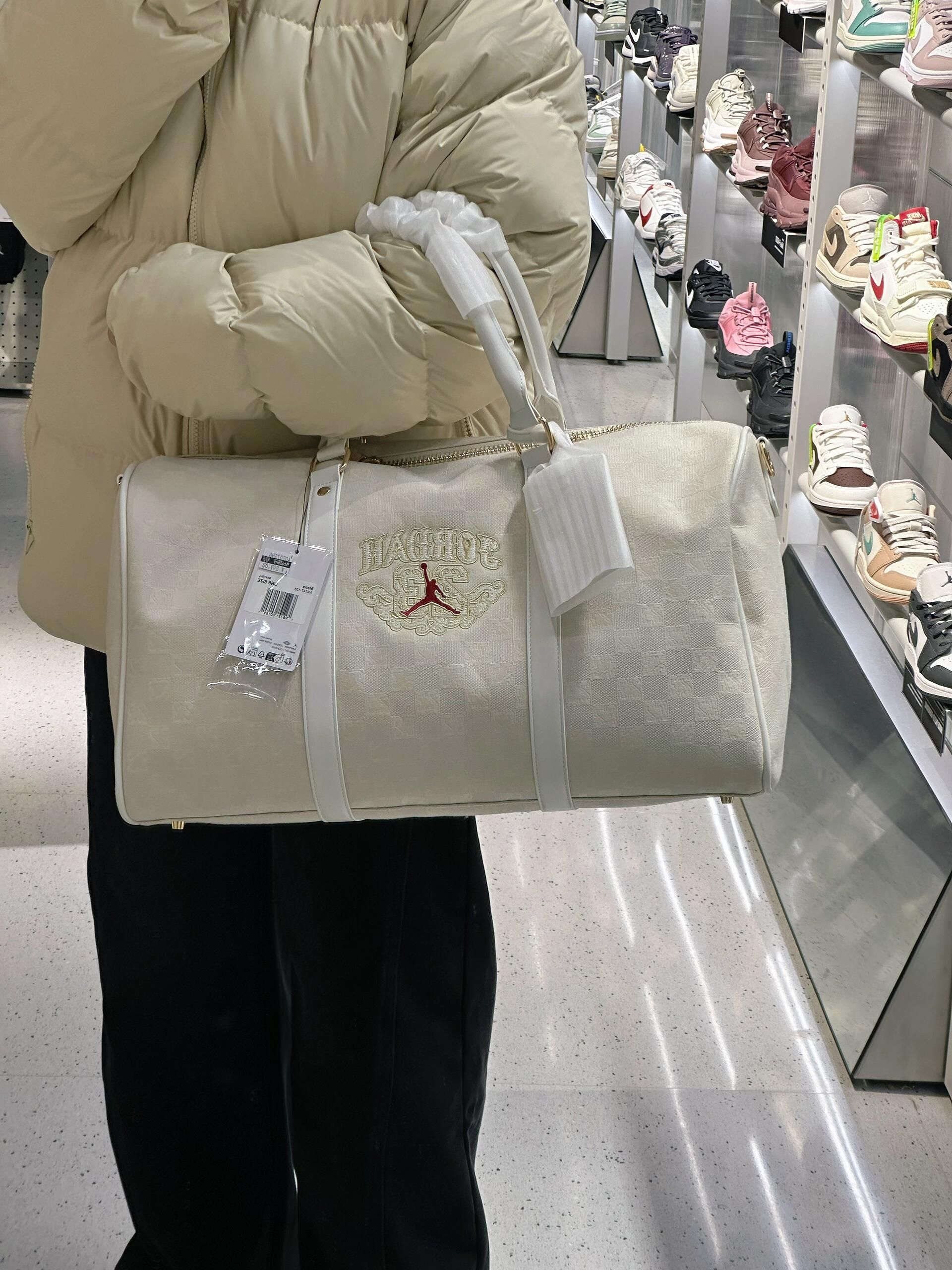 🐎Jordan马年限定波士顿包,奶白色帆布+红色飞人刺绣,祥云暗纹超有新年氛围感✨。金色五金拉链,细节满分!包型经典,手提斜挎都OK,肩带可调节,通勤、出街、旅行都能用。容量大,手机、化妆品轻松装下,实用又时髦,是新年必入的高辨识度单品🎉。