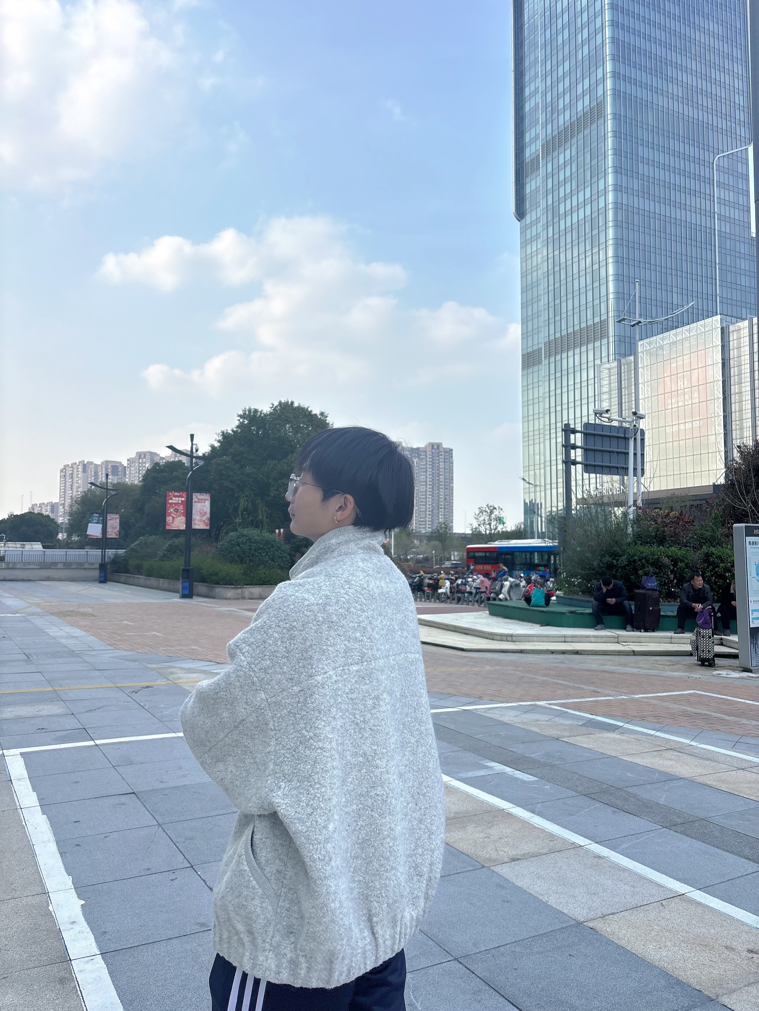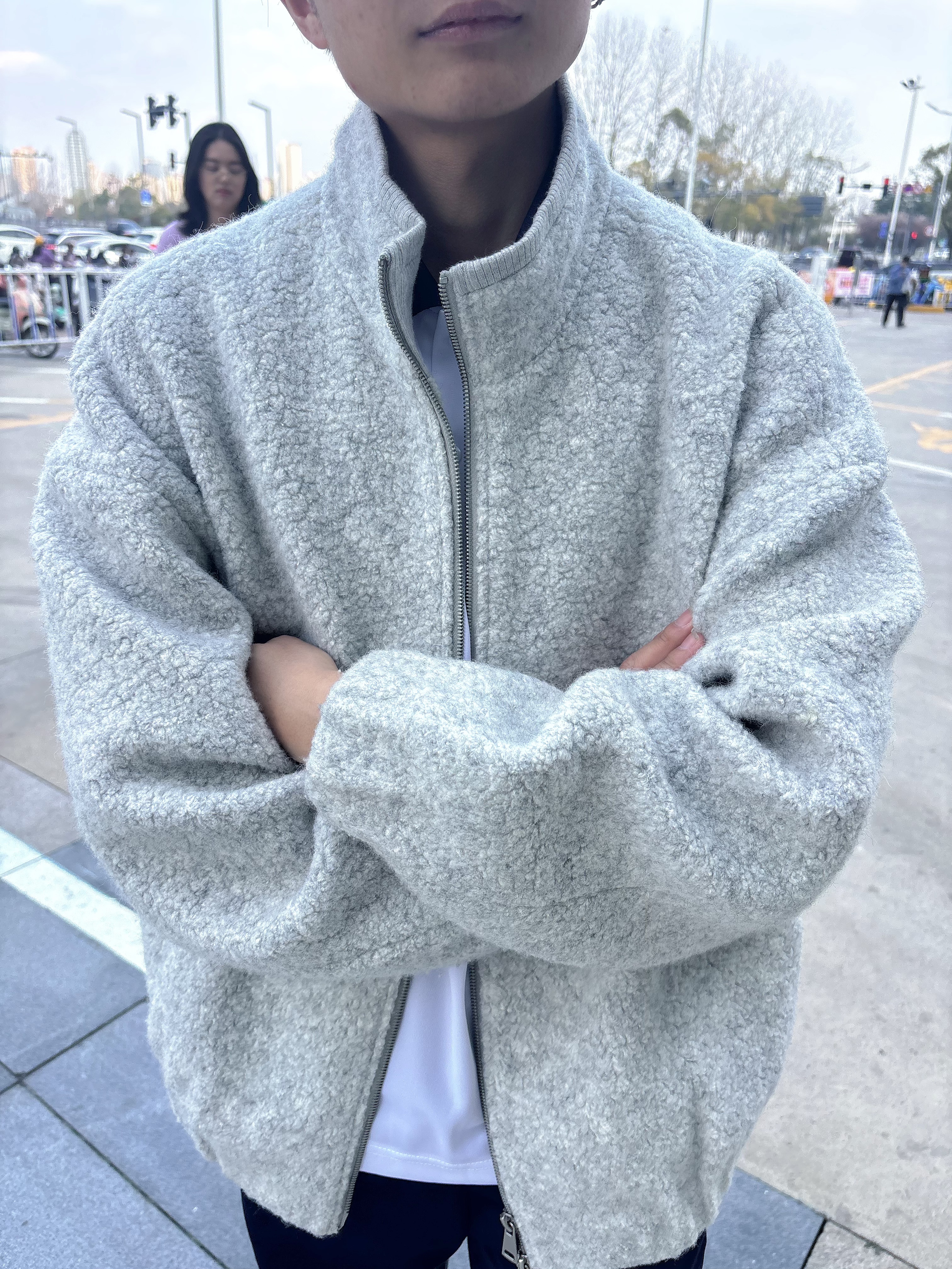 我站在商场楼下,穿着这件浅灰毛绒外套站在风里,会觉得整个人都变得温柔起来。 我总觉得,这种带点颗粒感的面料太适合春天了,不厚重却足够挡风,宽松的剪裁也不会压个子,反而让身形看起来更利落。里面搭一件干净的白T,下身配条运动裤,我不用刻意搭配,就能在城市街头拍出松弛感满满的照片。
