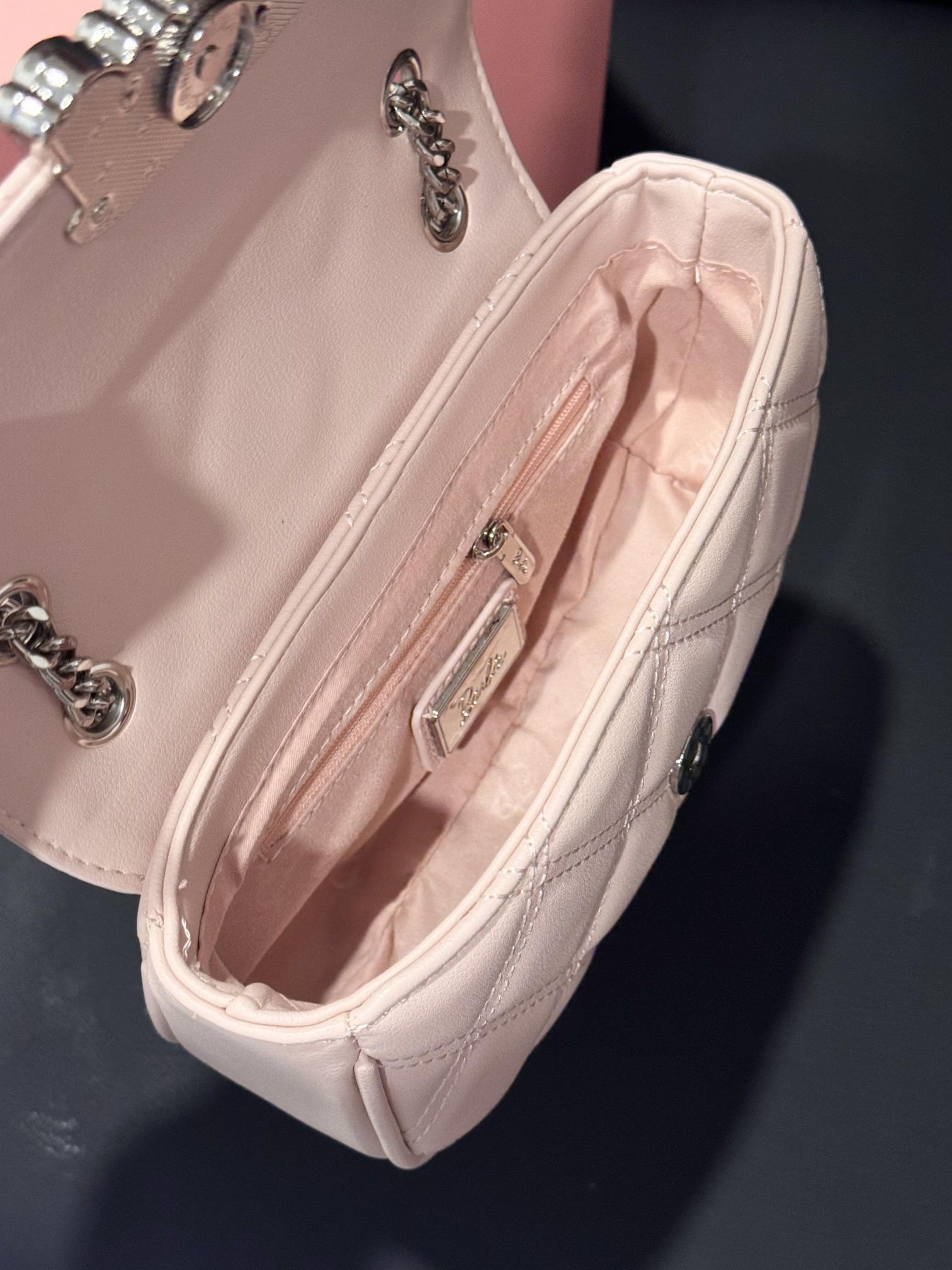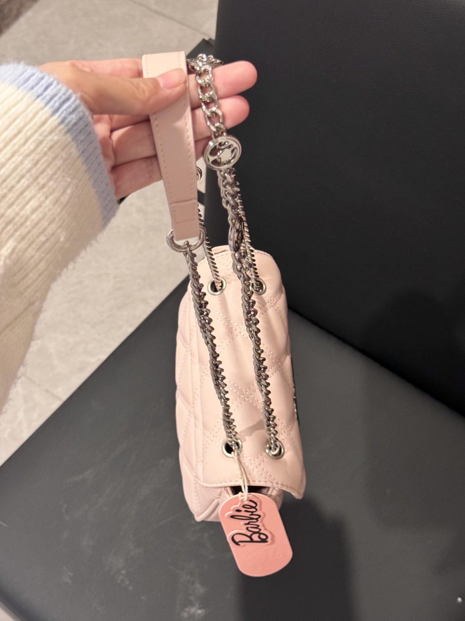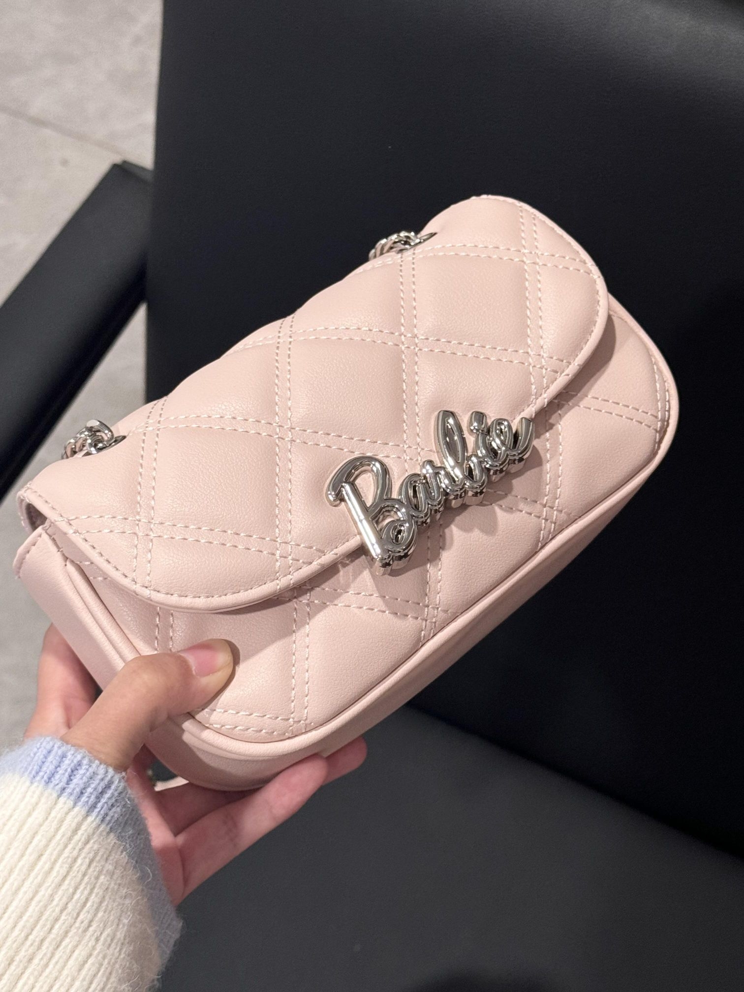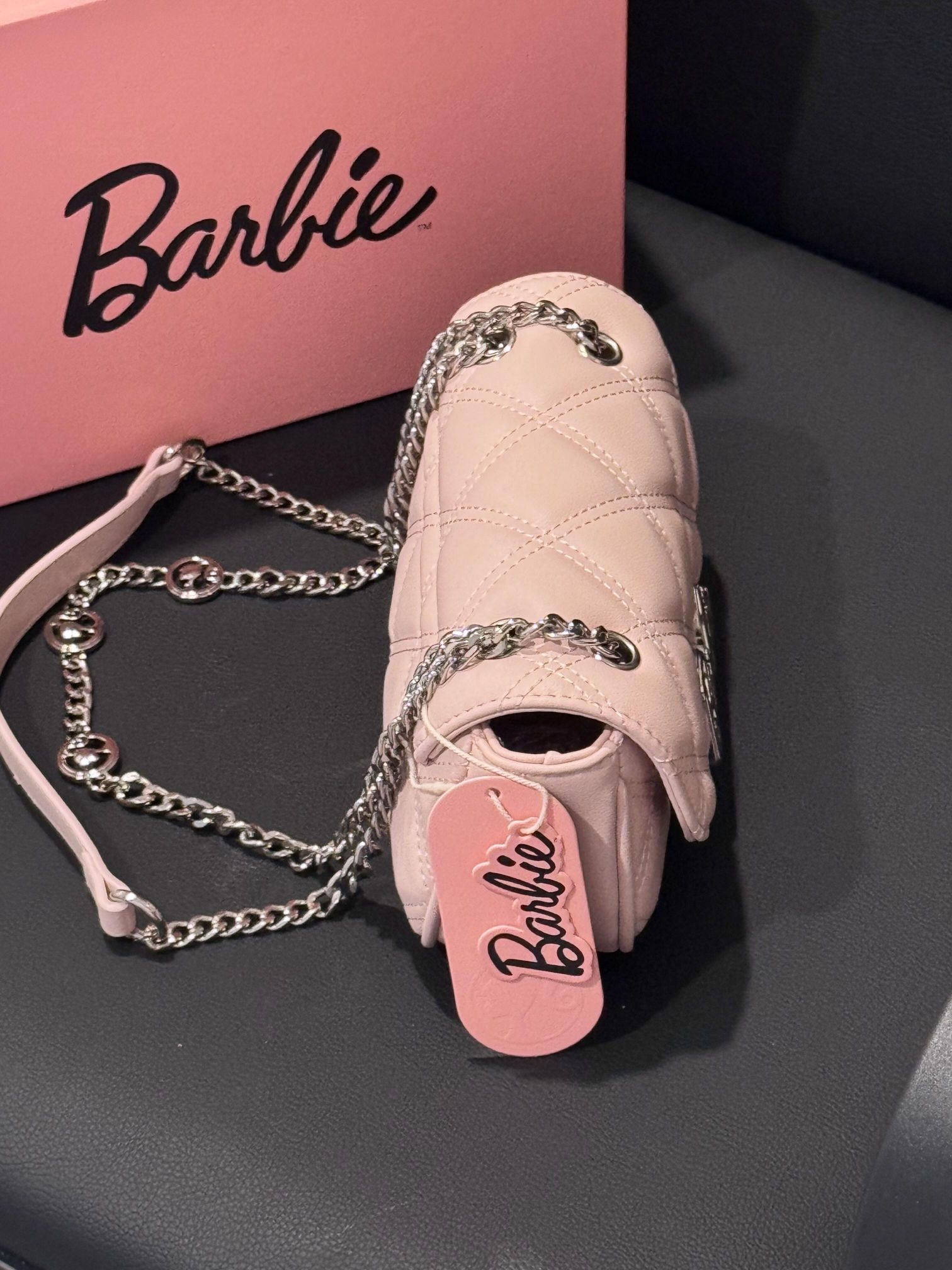 💖Barbie粉色链条包,采用柔软PU皮革,菱格纹缝线设计,搭配银色金属链条和Barbie标志,甜美复古风满分✨。尺寸适中,日常通勤或休闲出街都很适合,手机、钱包、化妆品轻松收纳。链条可单肩或斜挎,实用又时髦,粉色控和Barbie粉丝必入!