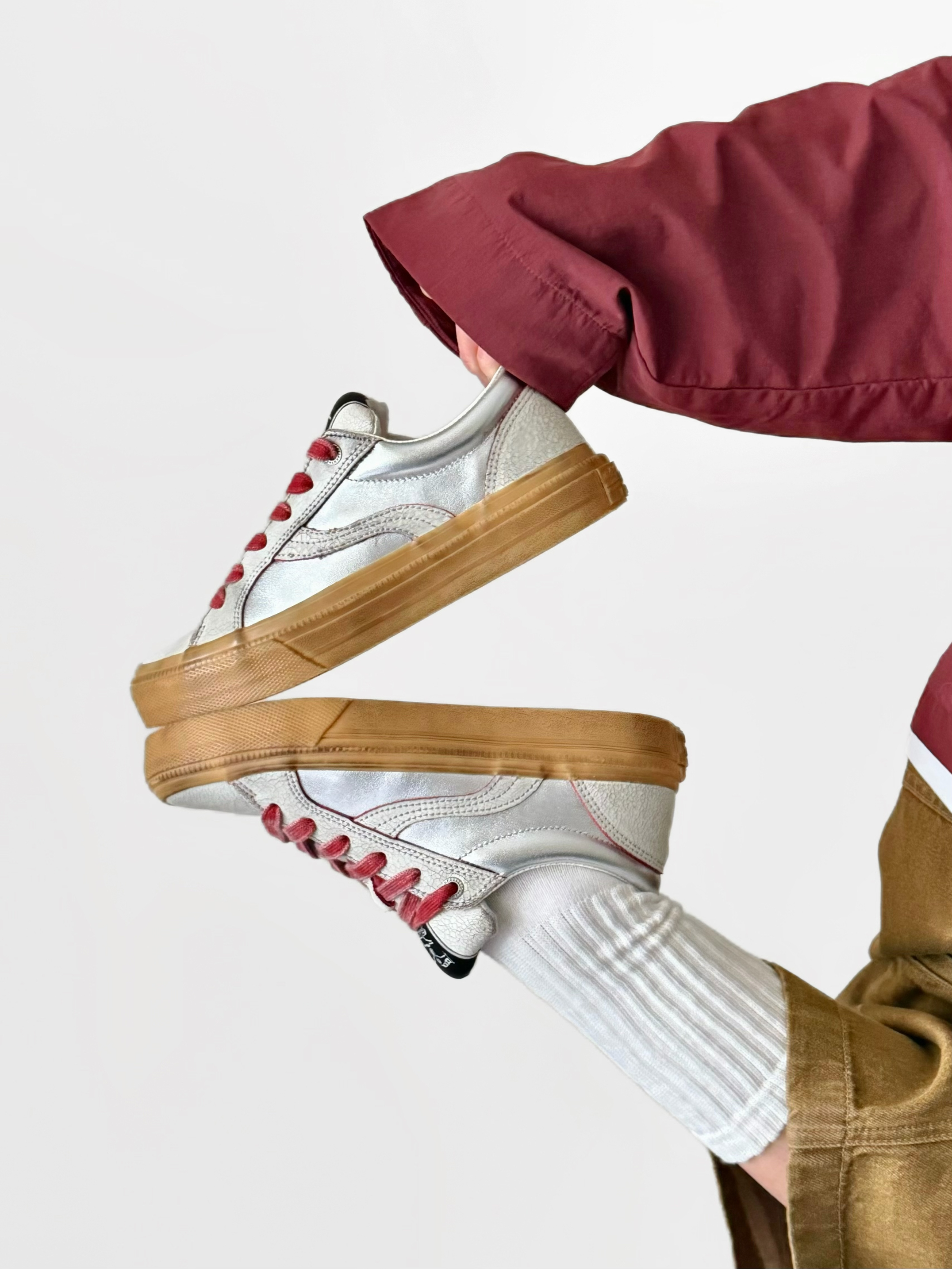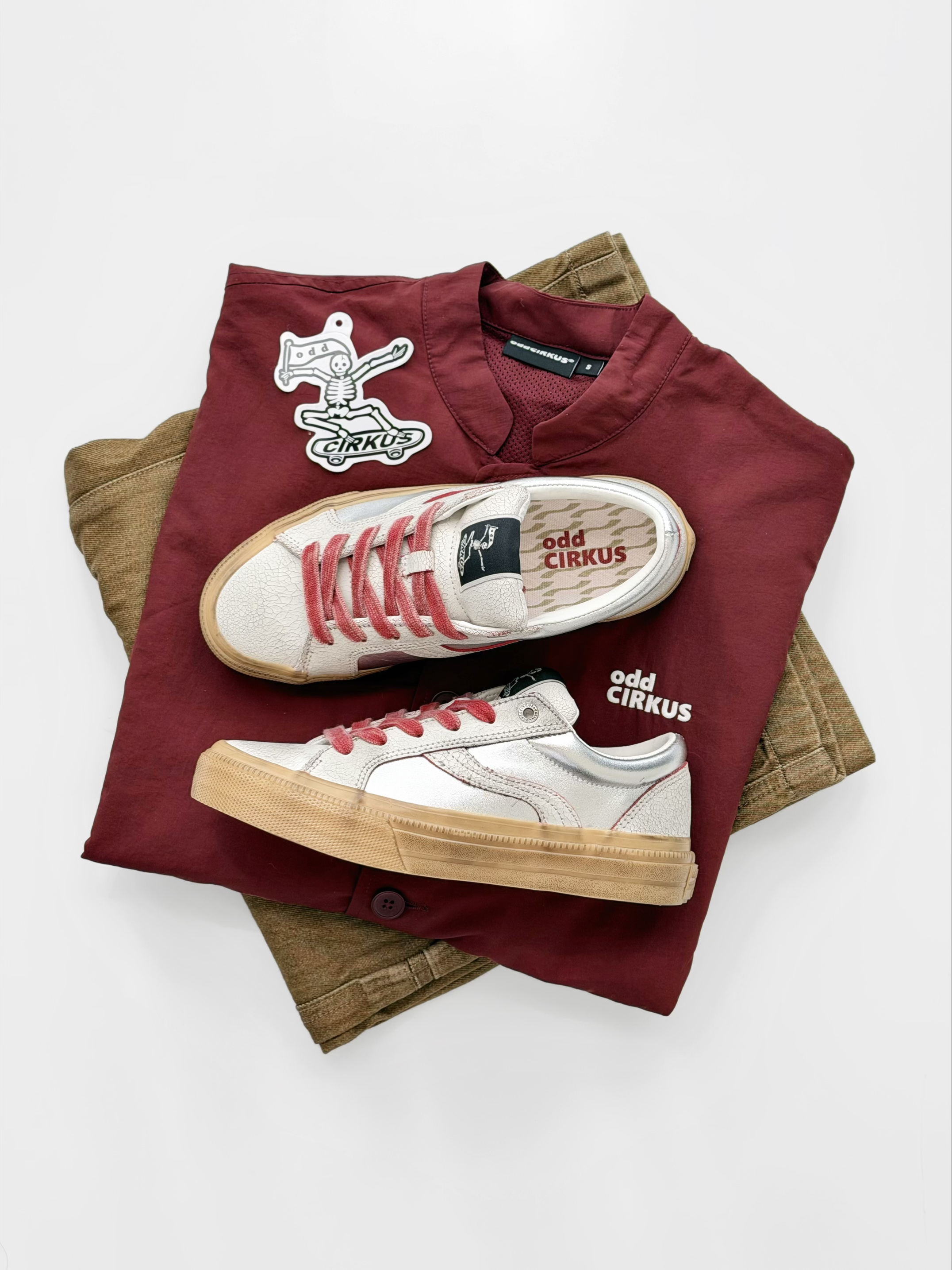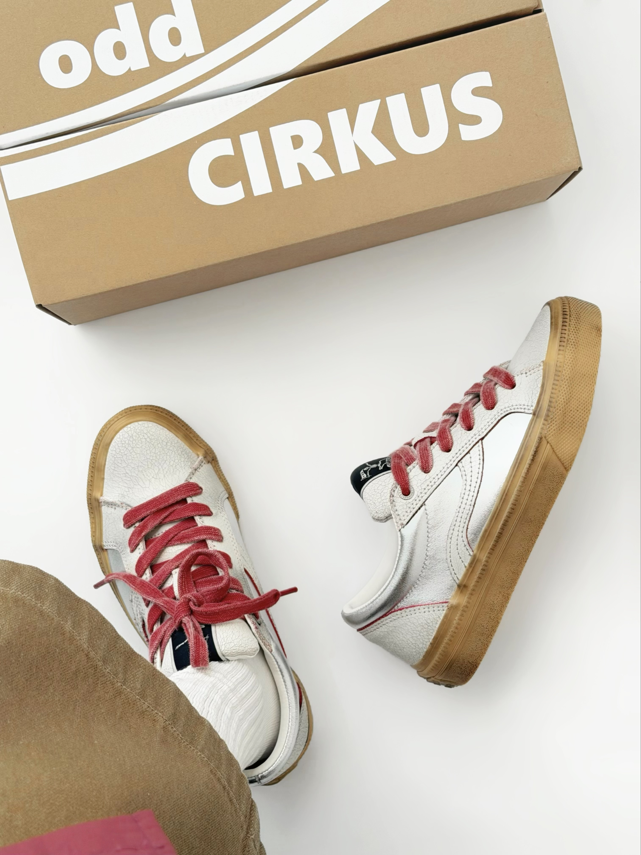 帅不帅!!谁还没双越穿越帅的鞋! 滑板鞋千千万🛹 但被会 “开花” 的滑板鞋狠狠戳中! 就是这双oddCIRKUS「ASTLEY PRO LOW 」爆焰银 是我见过最特别的一双!! 这双会蜕变的滑板鞋真的太有灵魂了 白色爆裂纹的皮面 随着一次次刷板、摩擦会剥落、开裂 里面的红色肌理就会慢慢露出来 被磨出来的质感,会变的独一无二 水洗做旧的红鞋带,擦脏的生胶色鞋底 复古金属银眼扣再和银色鞋面...