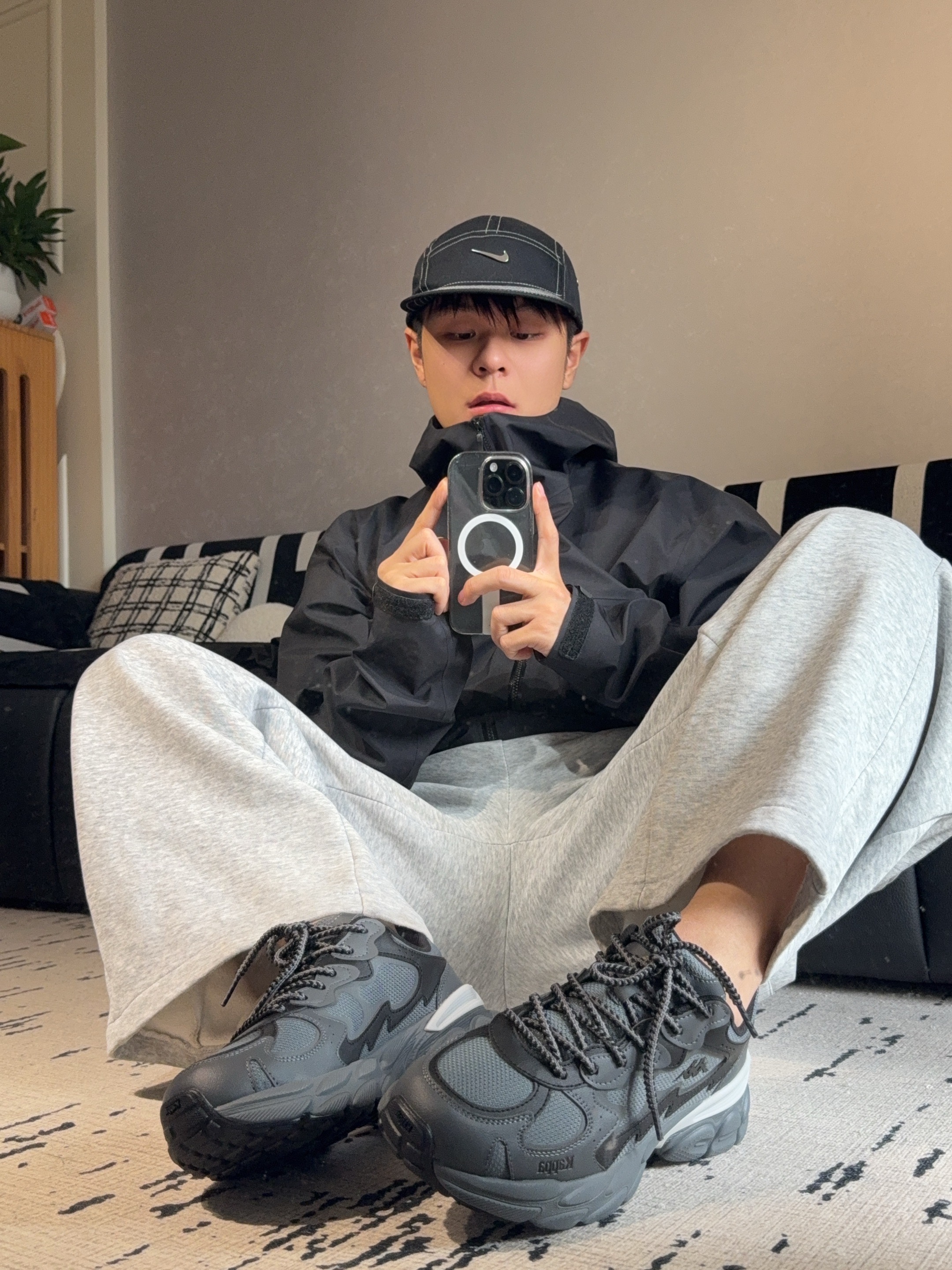 - 初春早晚还是有点凉。最近出门常穿这双Kappa。黑色鞋身,厚底但意外轻便,通勤走一天脚不累。鞋底回弹挺舒服,下雨天也没打滑过,复古背靠背logo低调又有调性。 - 搭配灰色运动裤搭始祖鸟黑色冲锋衣,干净利落。周末轻户外,健身运动也够用。不用太费力就能搭出清爽感,男生嘛,简单舒服就好。 -