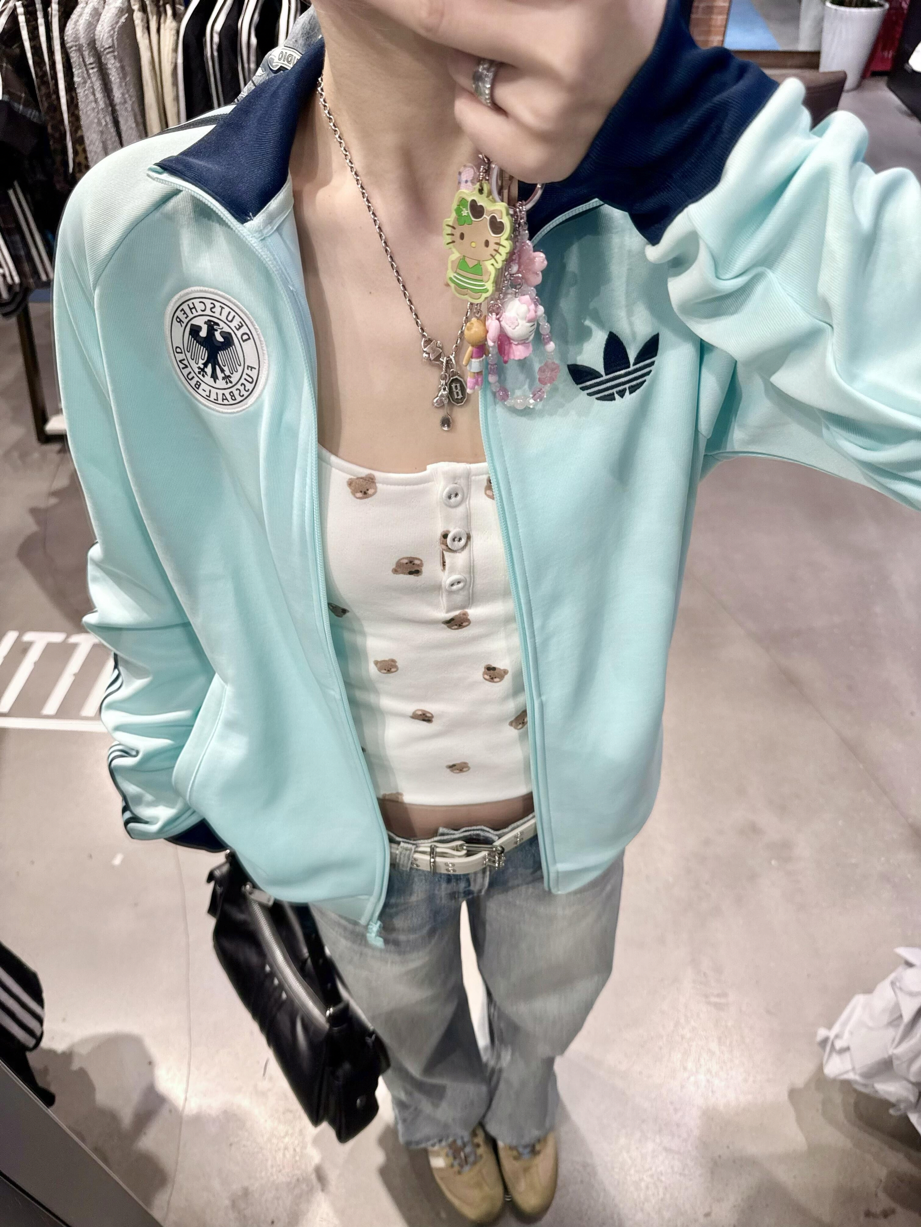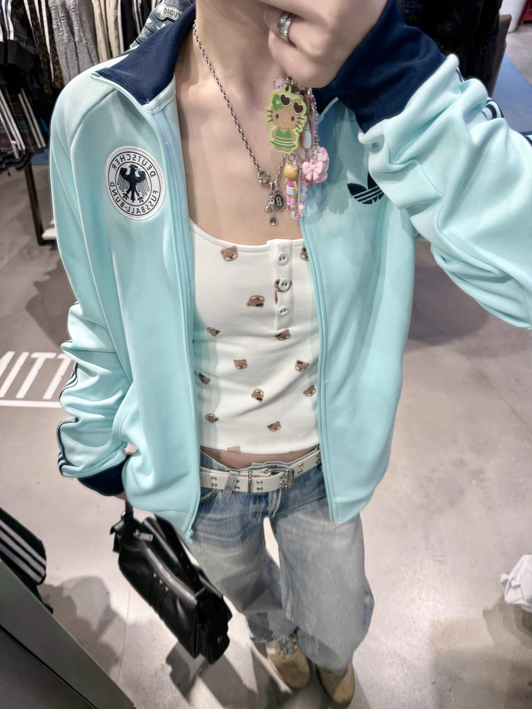 薄荷绿德国队徽外套|夏日清爽运动党狂喜💎 清新薄荷绿+藏青撞色,自带降温滤镜 刺绣黑鹰队徽细节拉满,把德意志的严谨穿在身上 内搭小熊吊带+牛仔裤,甜酷感直接焊在身上 出街/看球都超吸睛,足球少女氛围感拉满✨