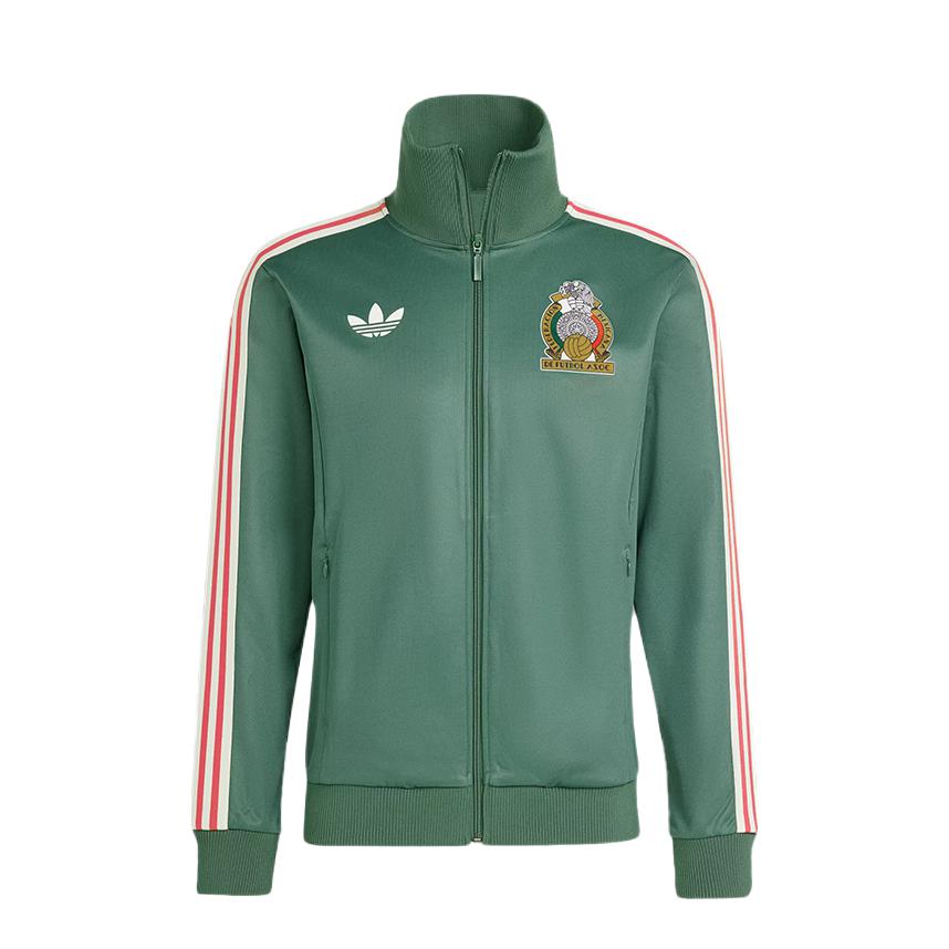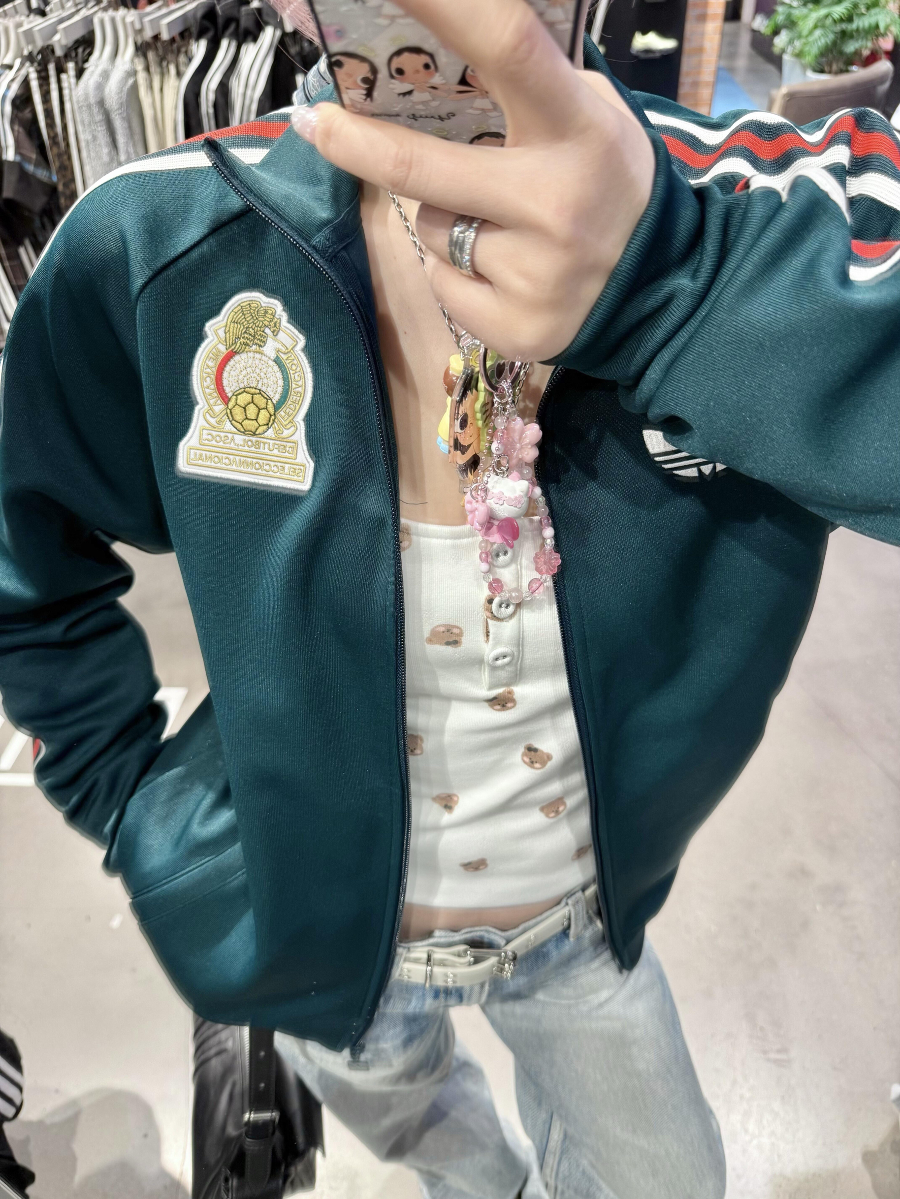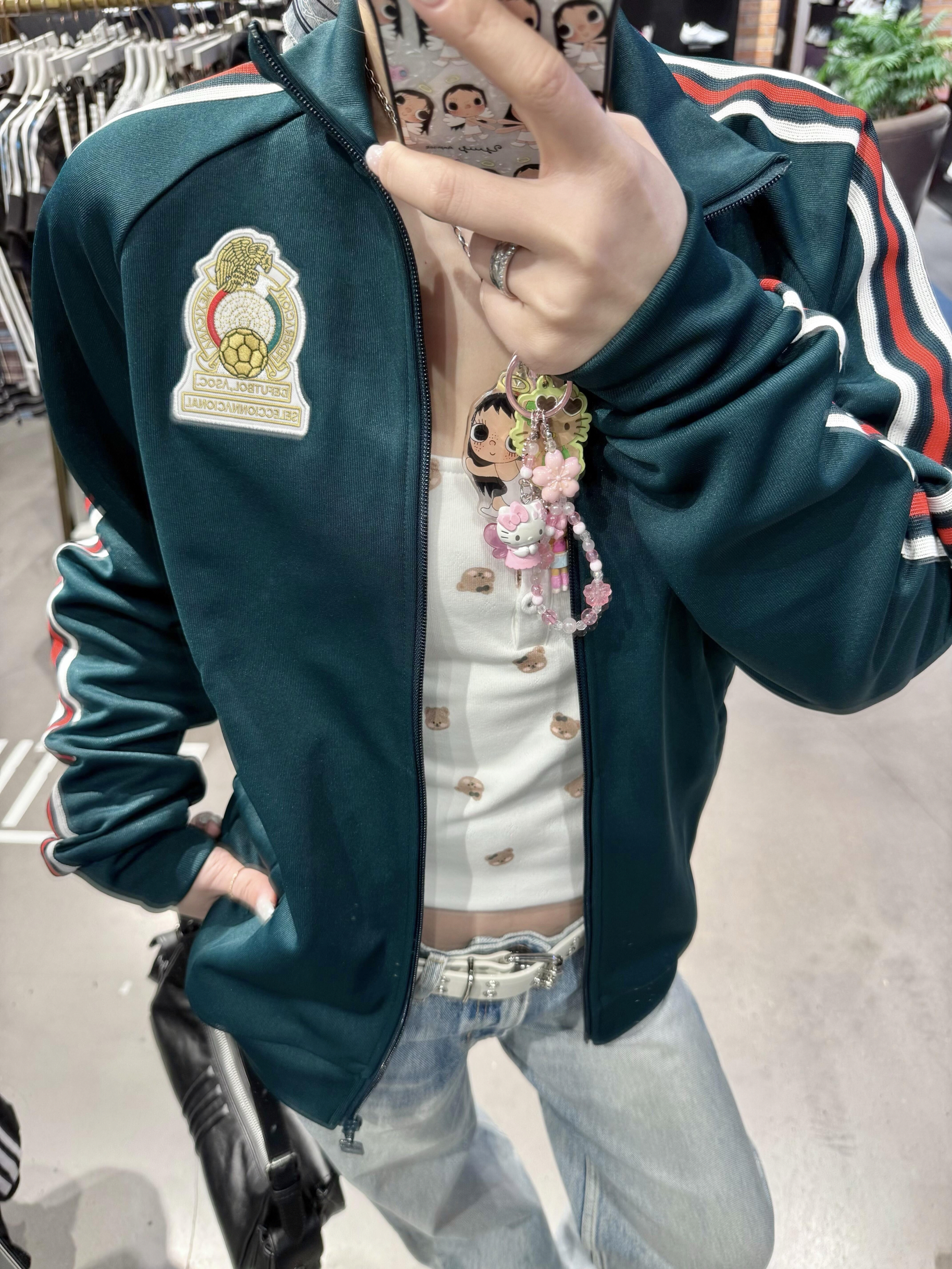 墨绿墨西哥队徽条纹外套,复古运动风天花板✨ 肩线红白条纹+胸口刺绣队徽,足球情怀拉满, 宽松版型百搭不挑人,内搭吊带+牛仔裤秒变甜酷少女, 出街、看球都超吸睛,藏不住的复古信仰!