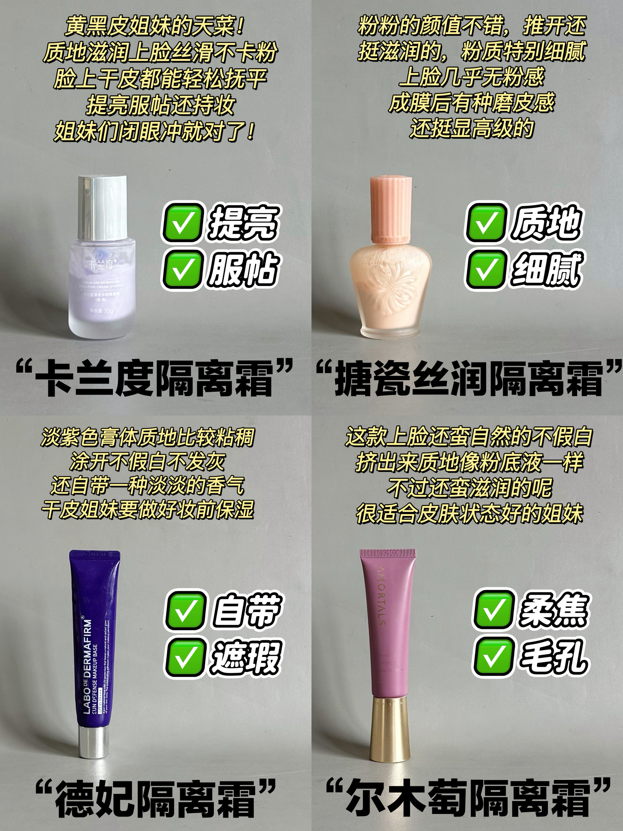 本篇笔记关联了卡兰度 清透修颜隔离霜 30g 01 紫色—适合暗黄肌肤、Laneige/兰芝 雪纱丝柔防晒隔离乳 遮瑕打底提亮肤色 30ml 60浅绿色 泛红肌肤、Paul&Joe 高效保湿调色妆前乳补水遮瑕搪瓷隔离 30ml #01等商品,为用户提供真实的使用体验和购买参考。