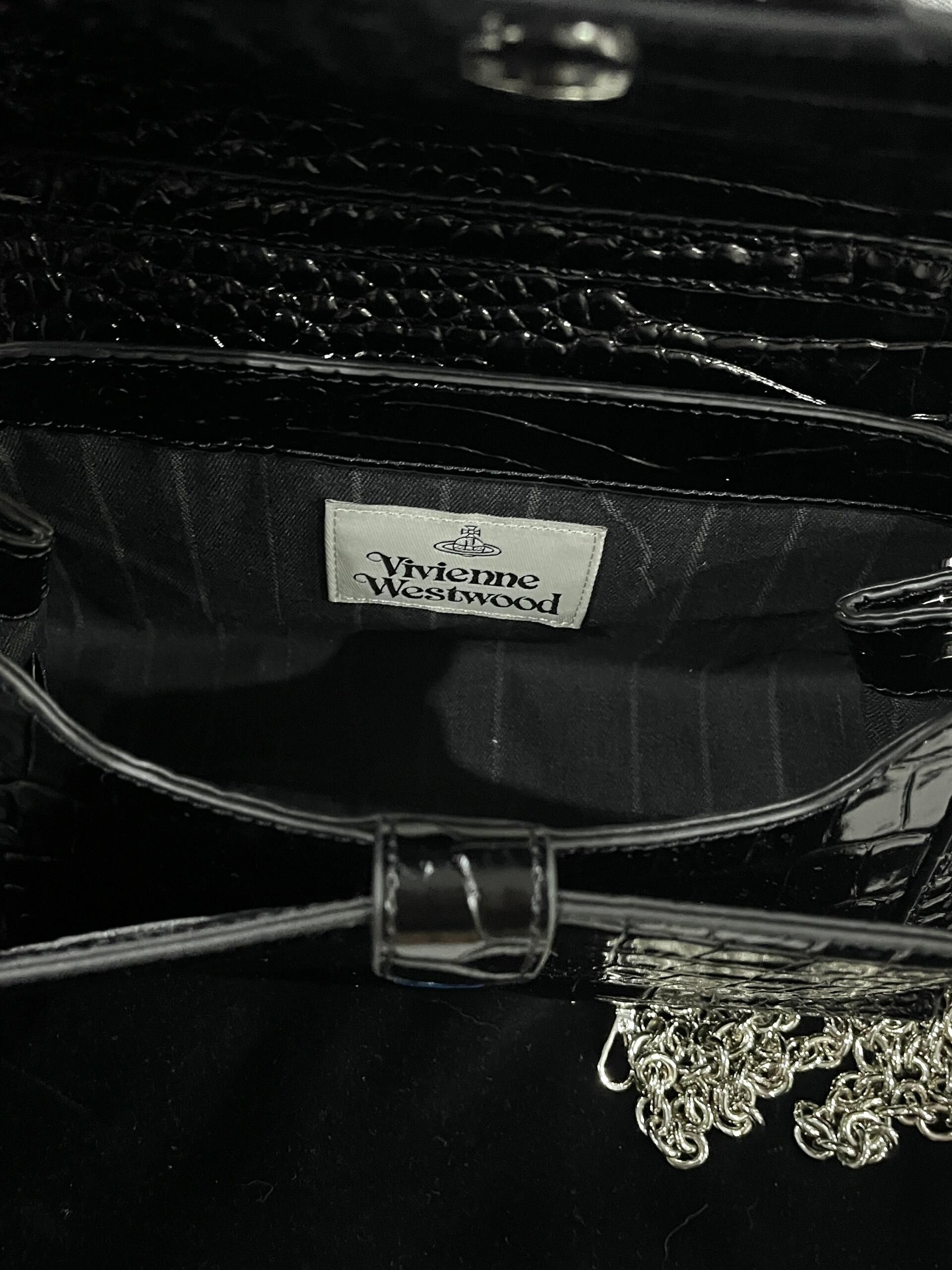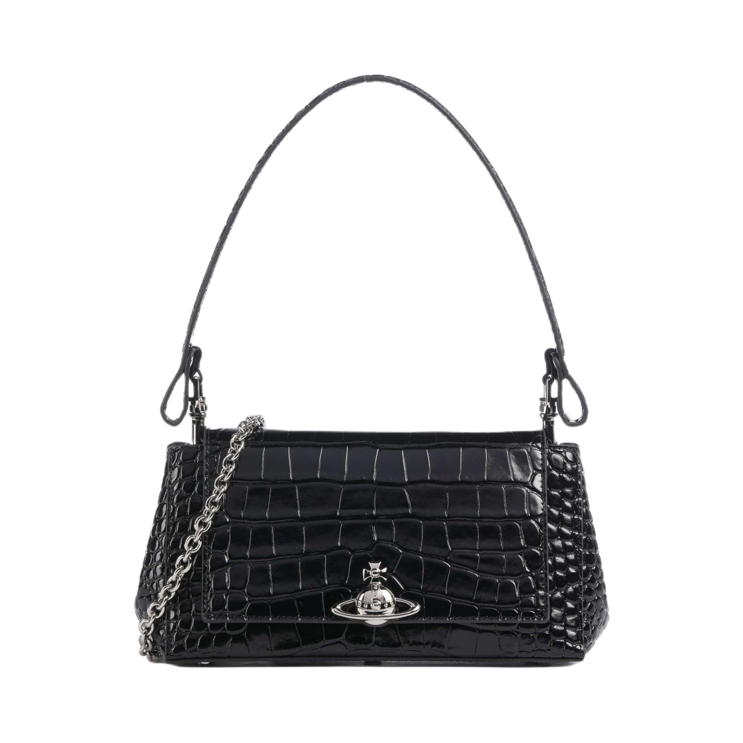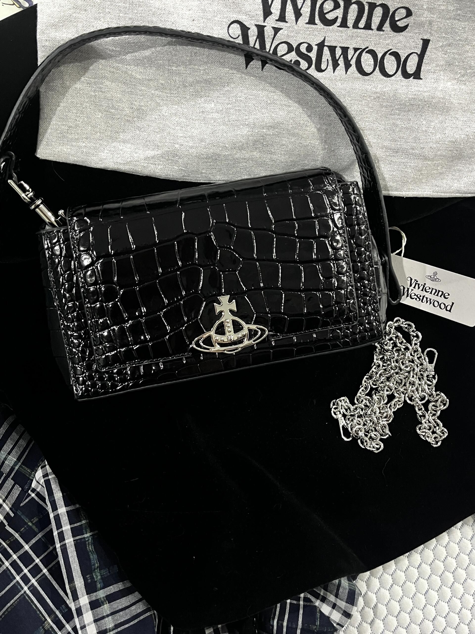 🖤Vivienne Westwood Hazel系列法棍包,黑色鳄鱼压纹牛皮,质感满分!正面银色土星Orb徽标超有辨识度✨。小号腋下包设计,皮质肩带+金属链条点缀,甜酷风格轻松拿捏。容量适合日常通勤,手机、口红都能装下,实用又时髦,出街凹造型必备!👜