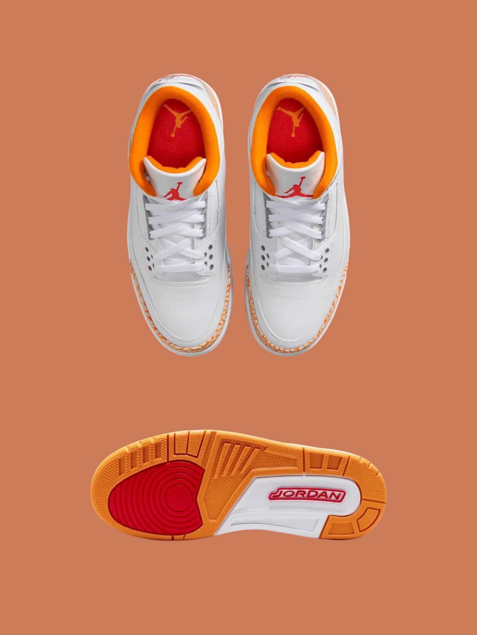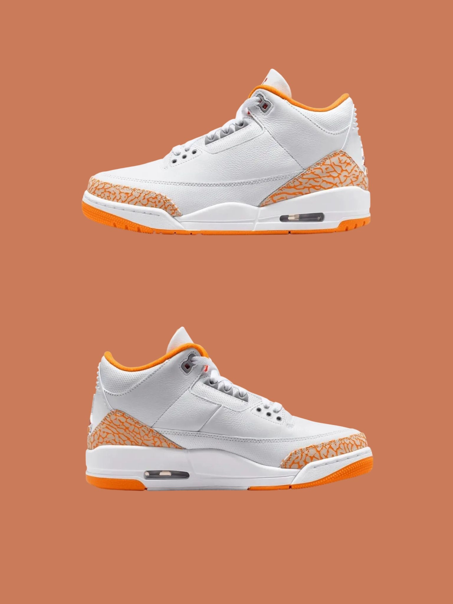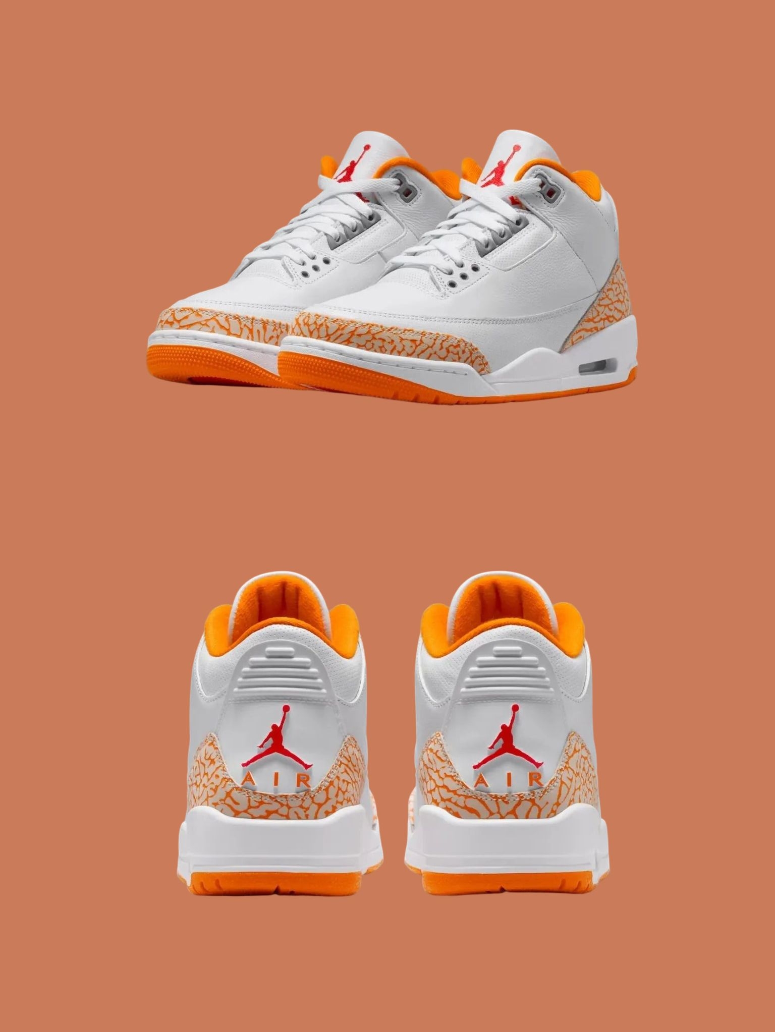 纯白皮革打底干净得不像话🍃 最戳我的还是这个橙色大象纹,自带复古感又跳脱得刚刚好~ 内衬悄悄呼应同款配色,后跟红色Jumpman小点缀 像咬了一口爆汁橘子汽水糖🍬 上脚瞬间打破沉闷,一眼就心动的清爽元气感💥
