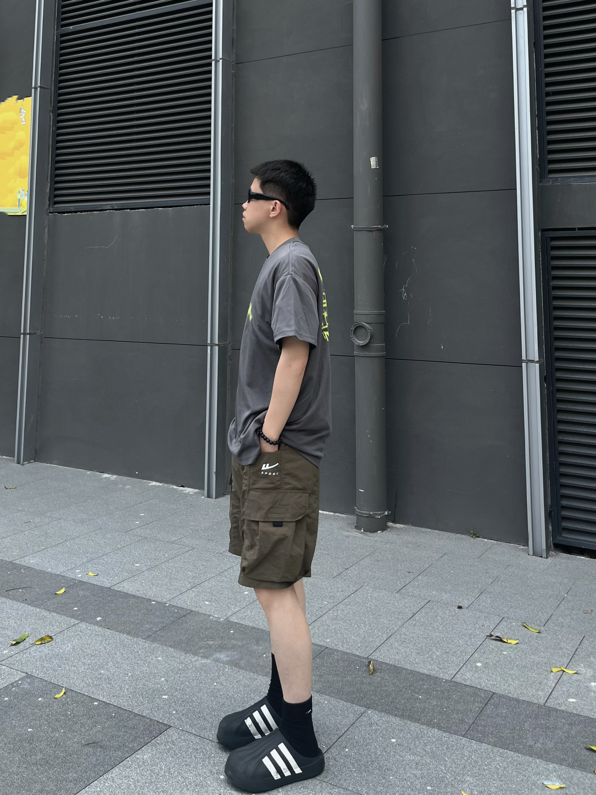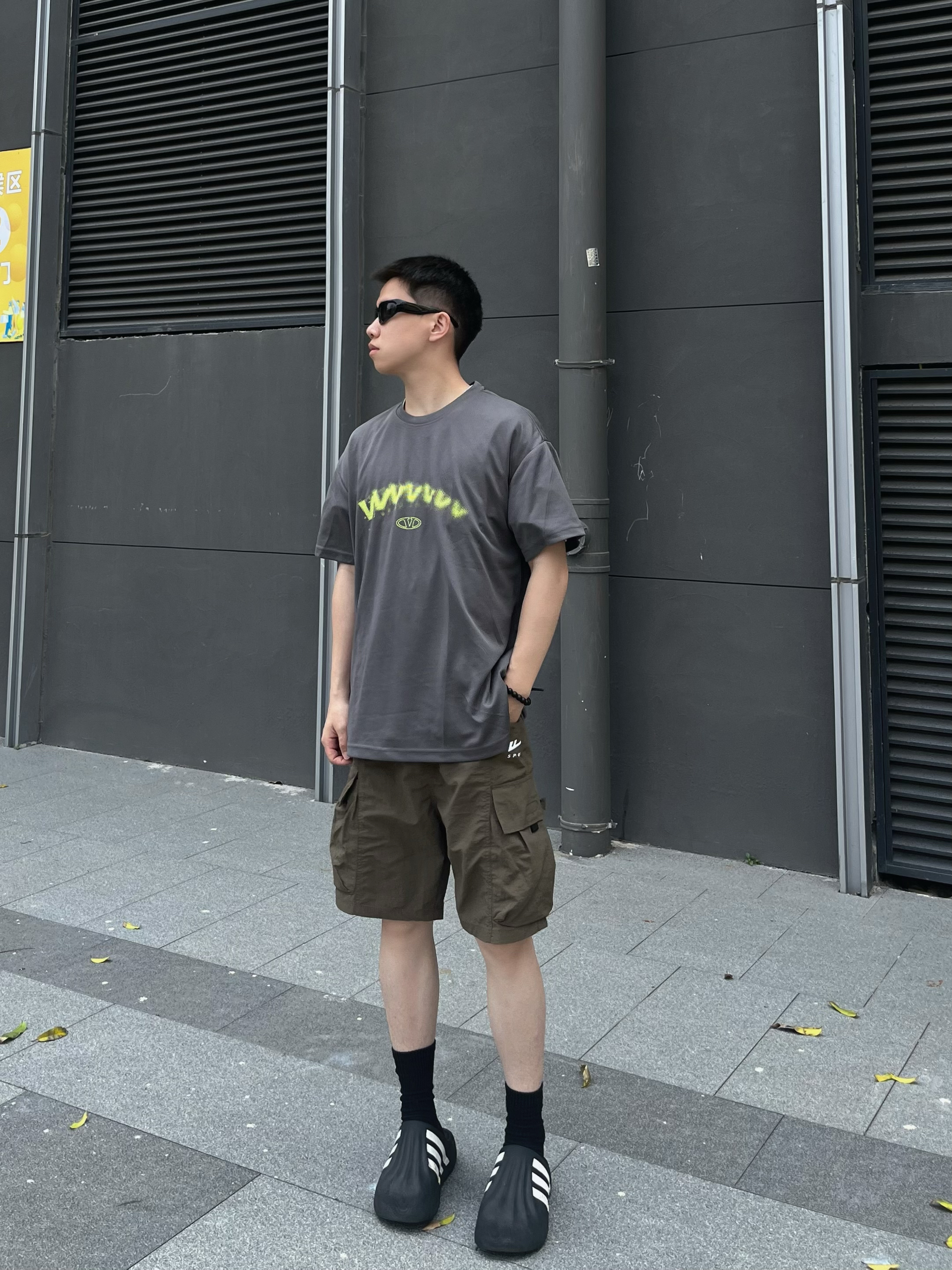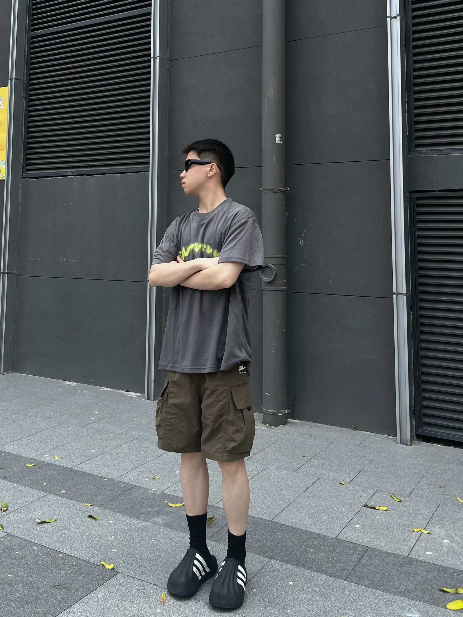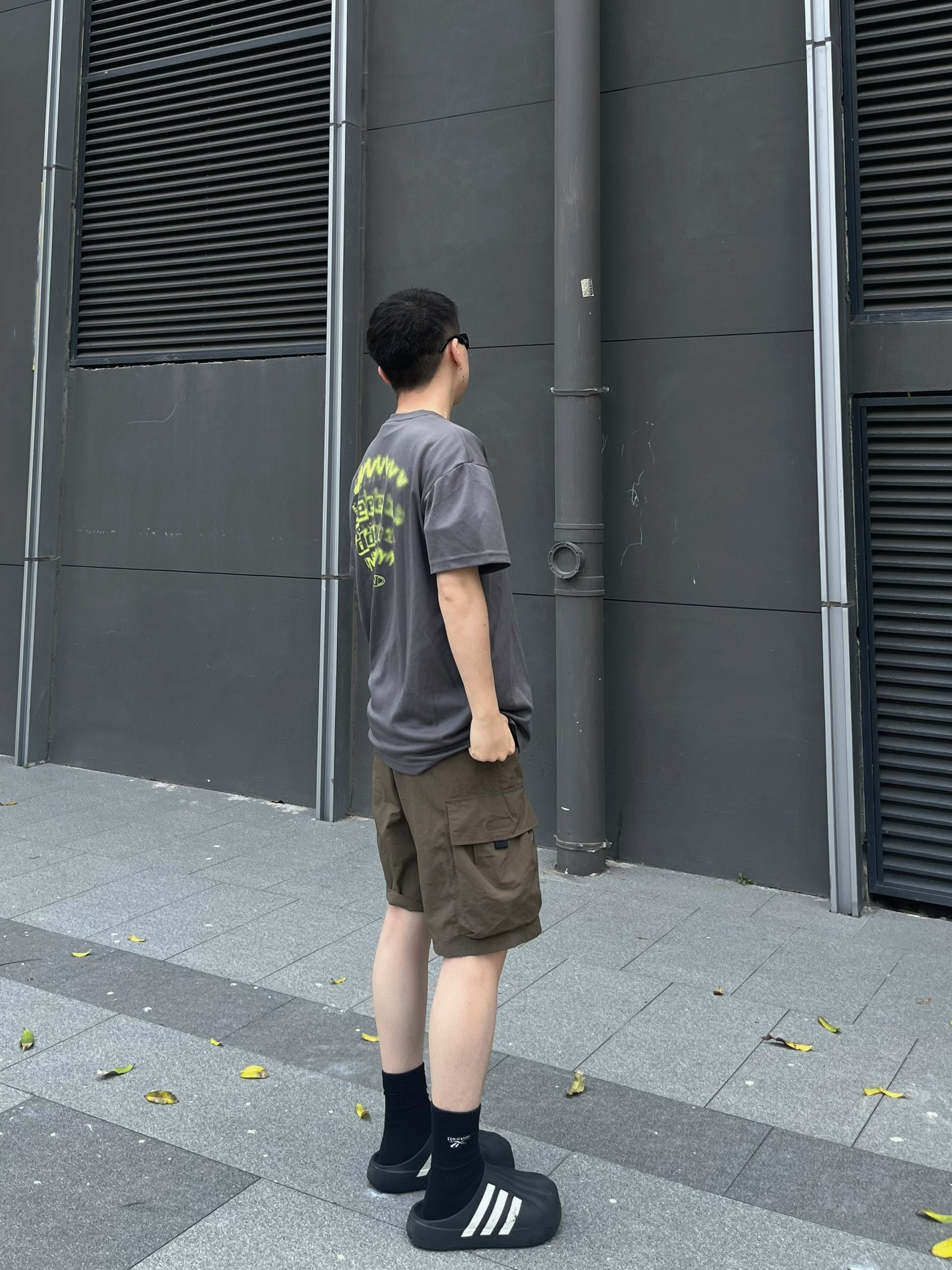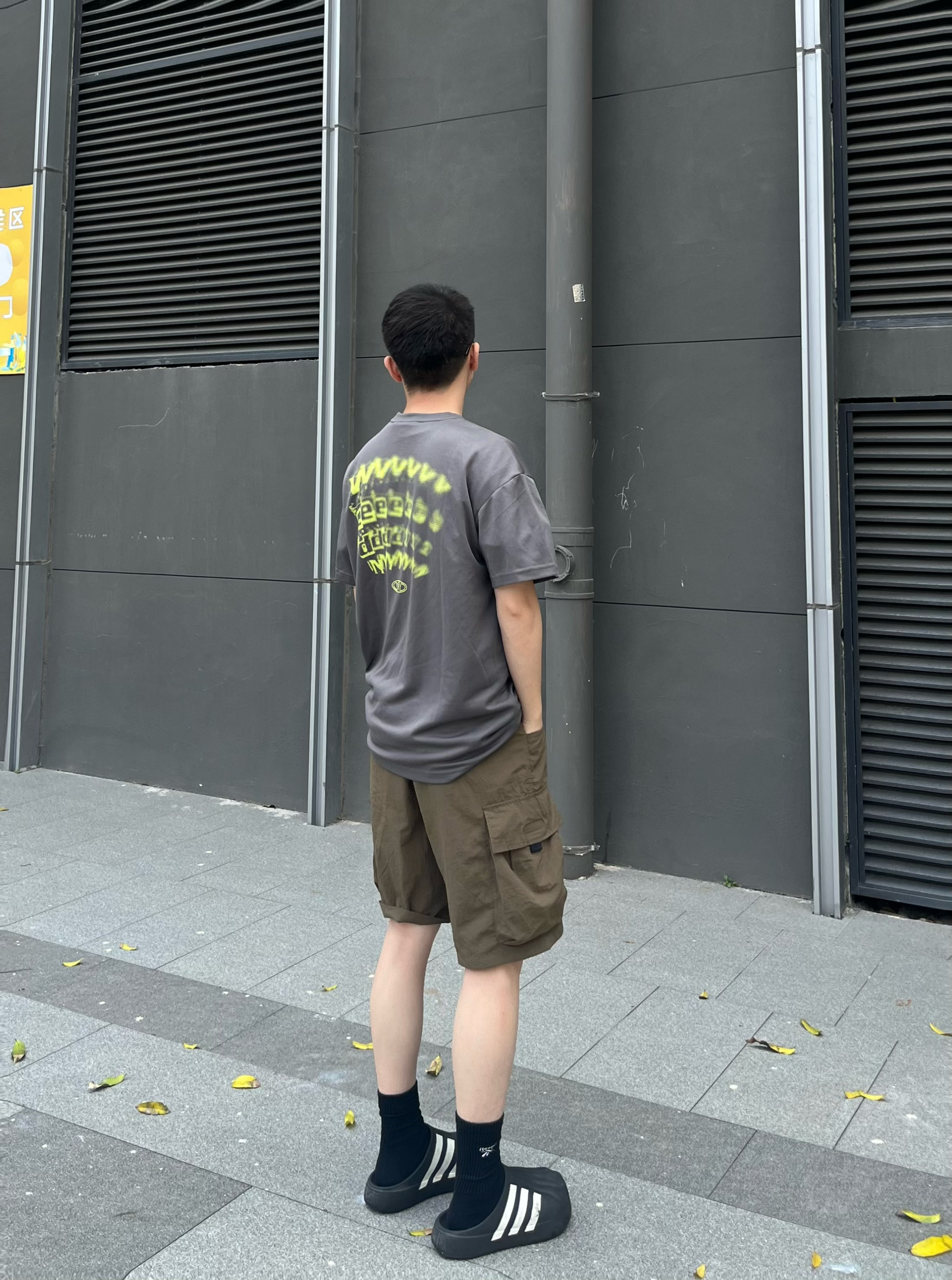 慵懒运动风户外穿搭分享来啦!主打舒适透气+随性街头感,完全适配夏日citywalk和轻户外场景。 • 上衣:深灰网眼短袖T恤,荧光绿波浪印花点亮整体,网眼面料透气不闷汗,宽松版型慵懒随性,夏日户外也能保持清爽。 • 下装:军绿色机能工装短裤,多口袋设计方便收纳小物件,速干面料应对出汗无压力,宽松裤型活动自如,户外实用性拉满。 • 鞋子:黑色条纹包头拖+中筒袜,懒人穿搭福音,软弹脚感走路舒适,...