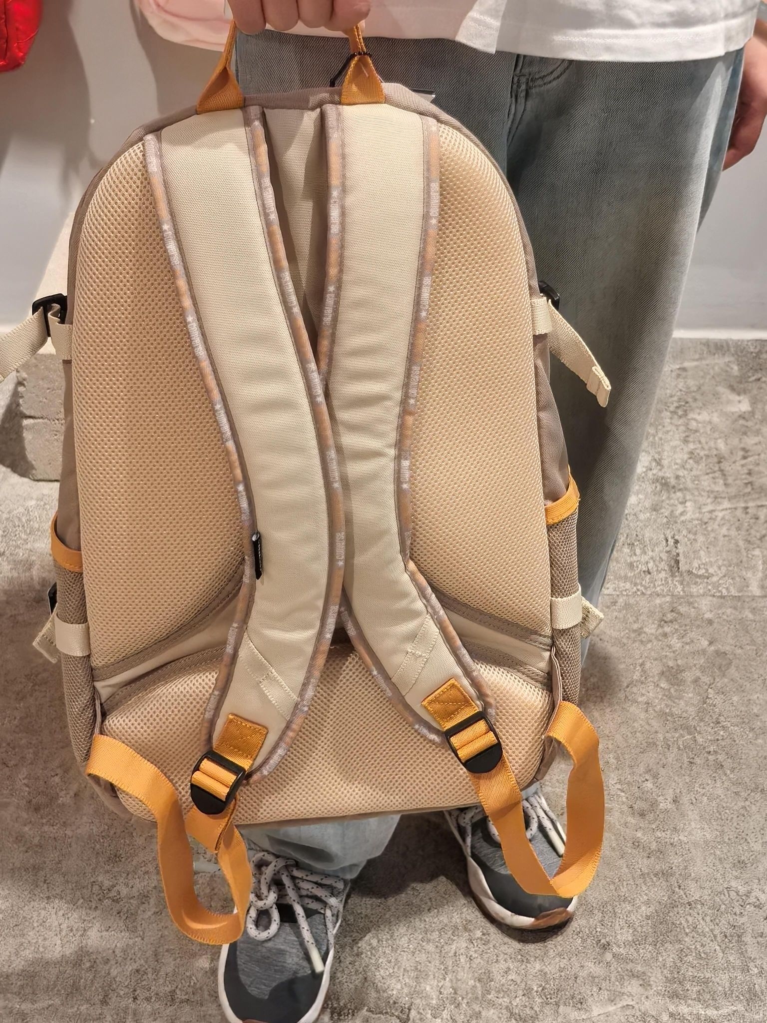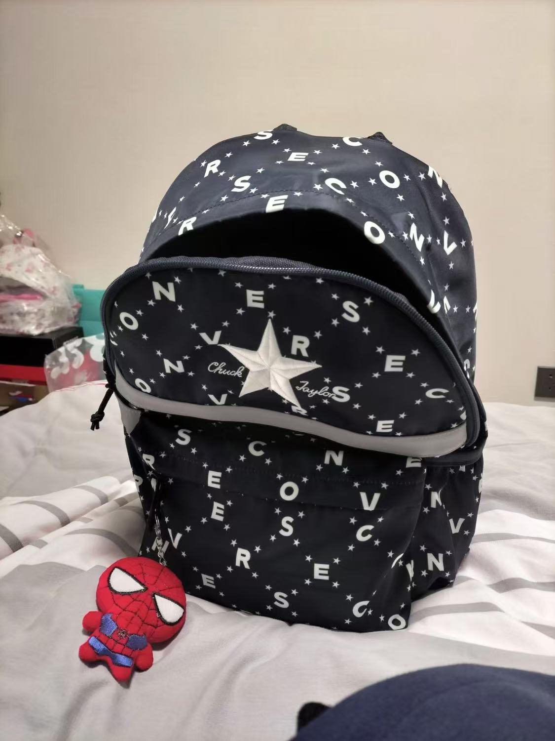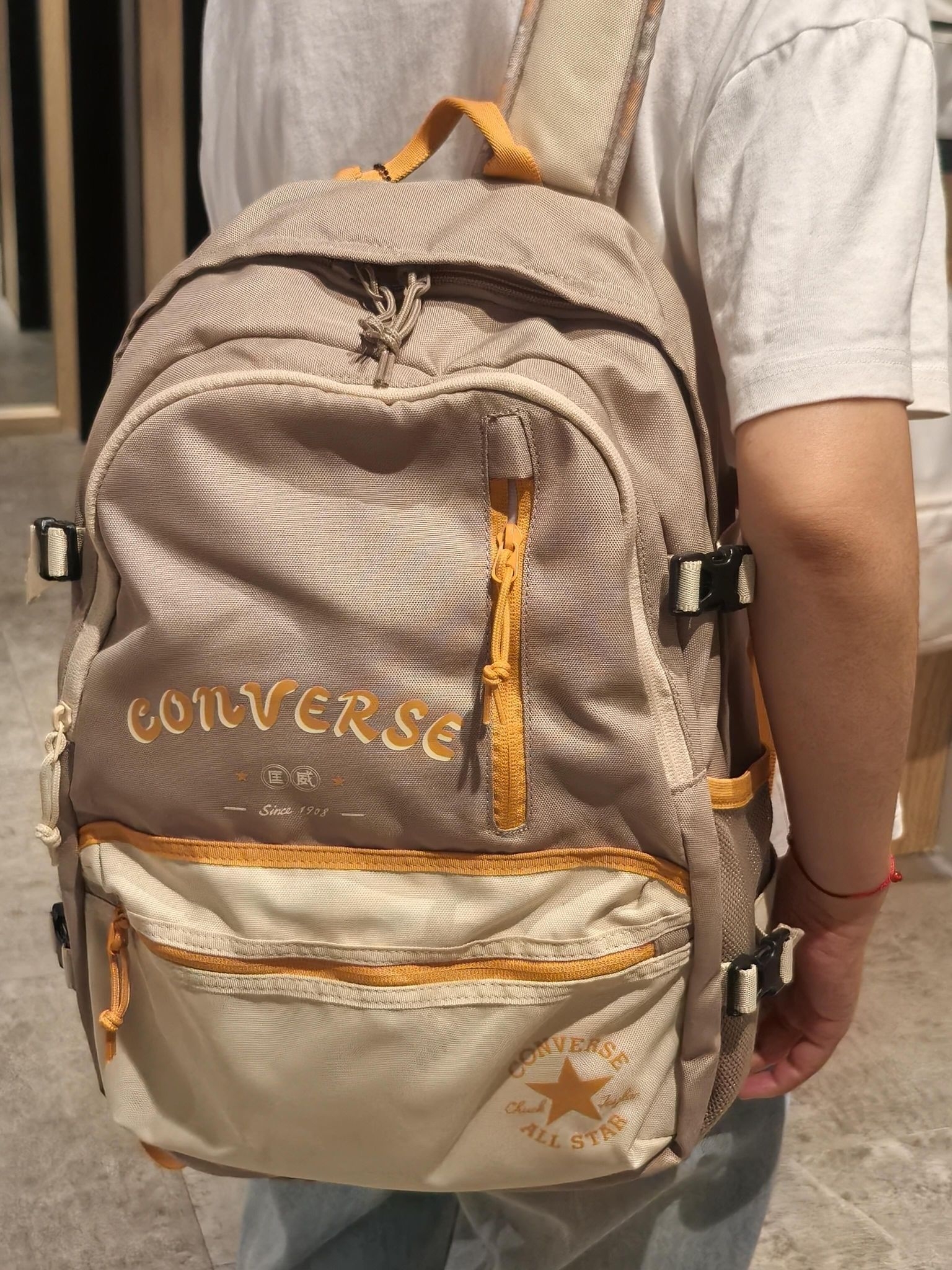 🎒匡威这款撞色印花双肩包,浅棕+米白拼接,橙色拉链超吸睛,正面有品牌logo和星星图案,辨识度满分✨。耐磨聚酯纤维材质,轻便易清洁,容量大,多隔层设计,收纳超方便!肩带可调节,背负舒适,通勤、上学、短途出行都很适合,实用又时髦,学生党和潮流爱好者必入!🧡