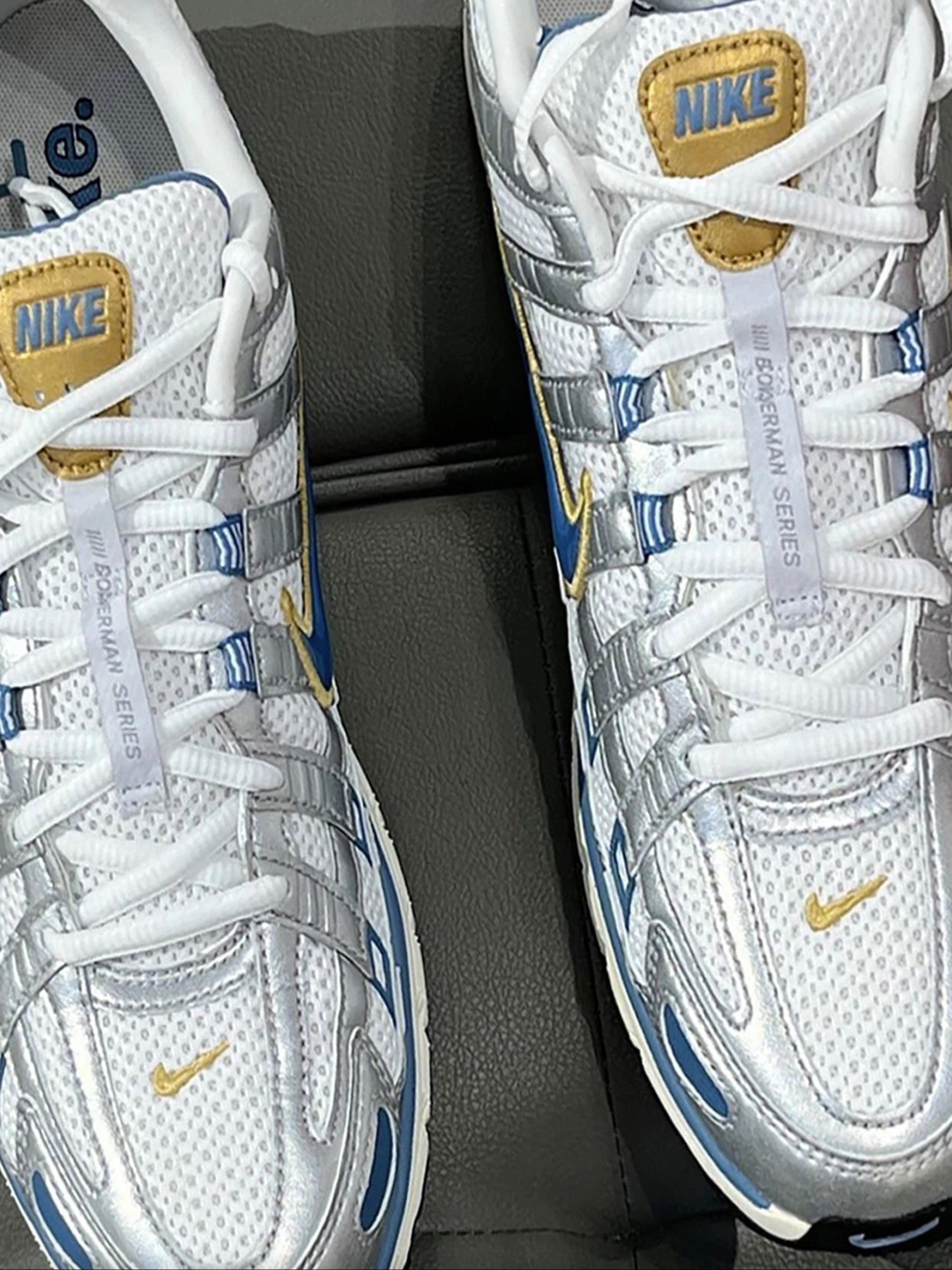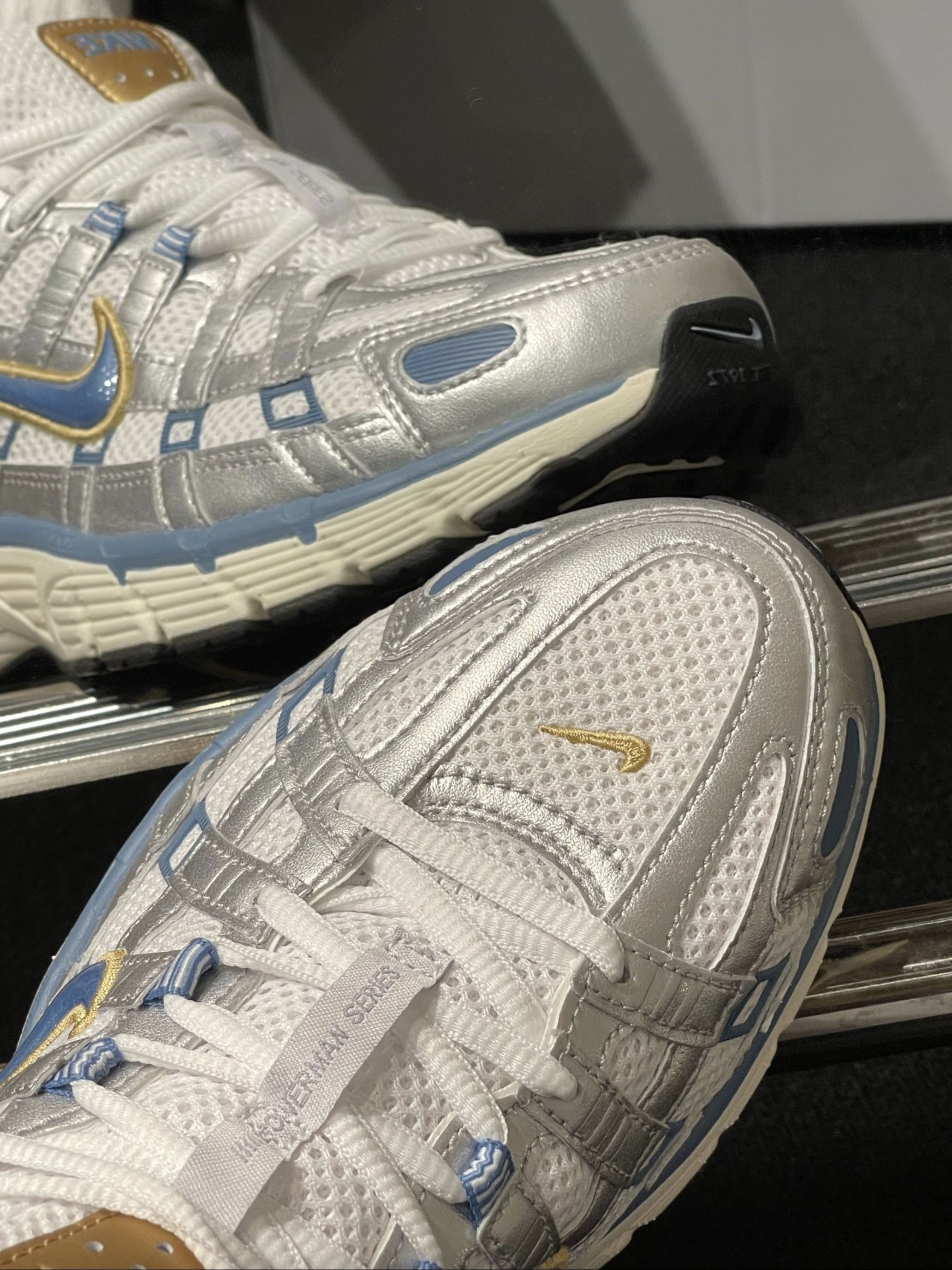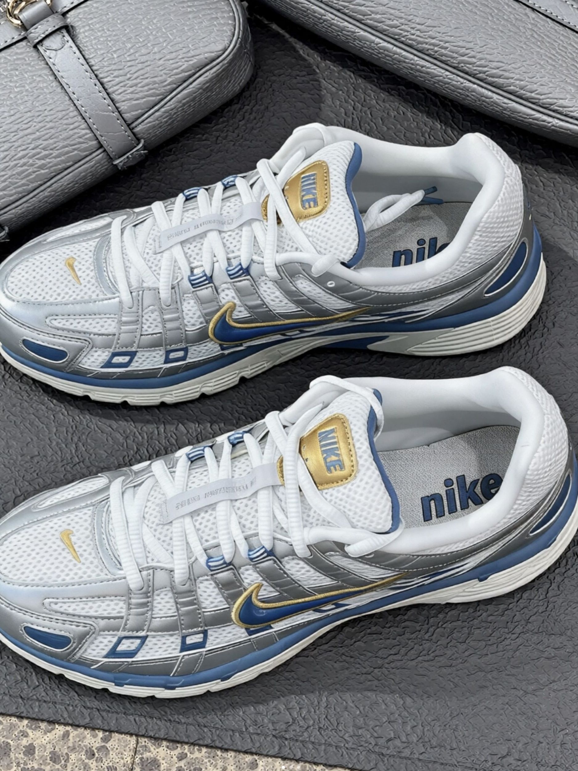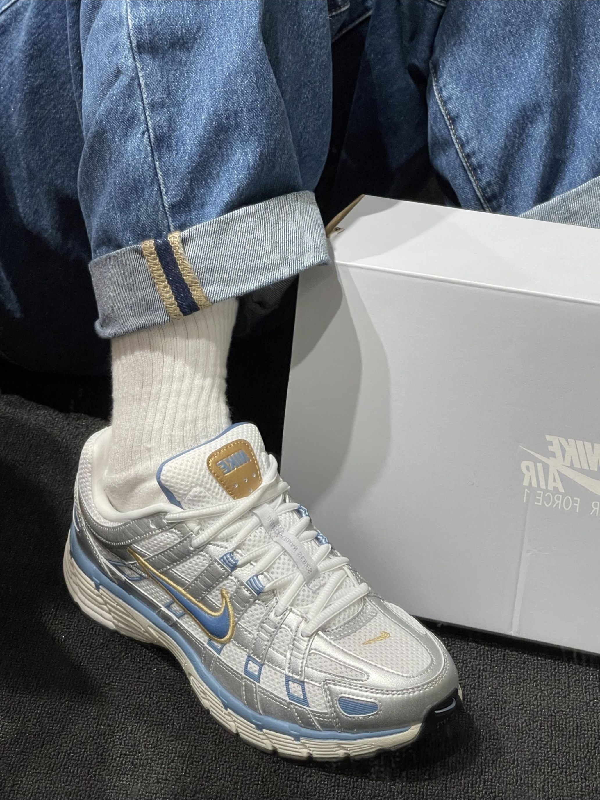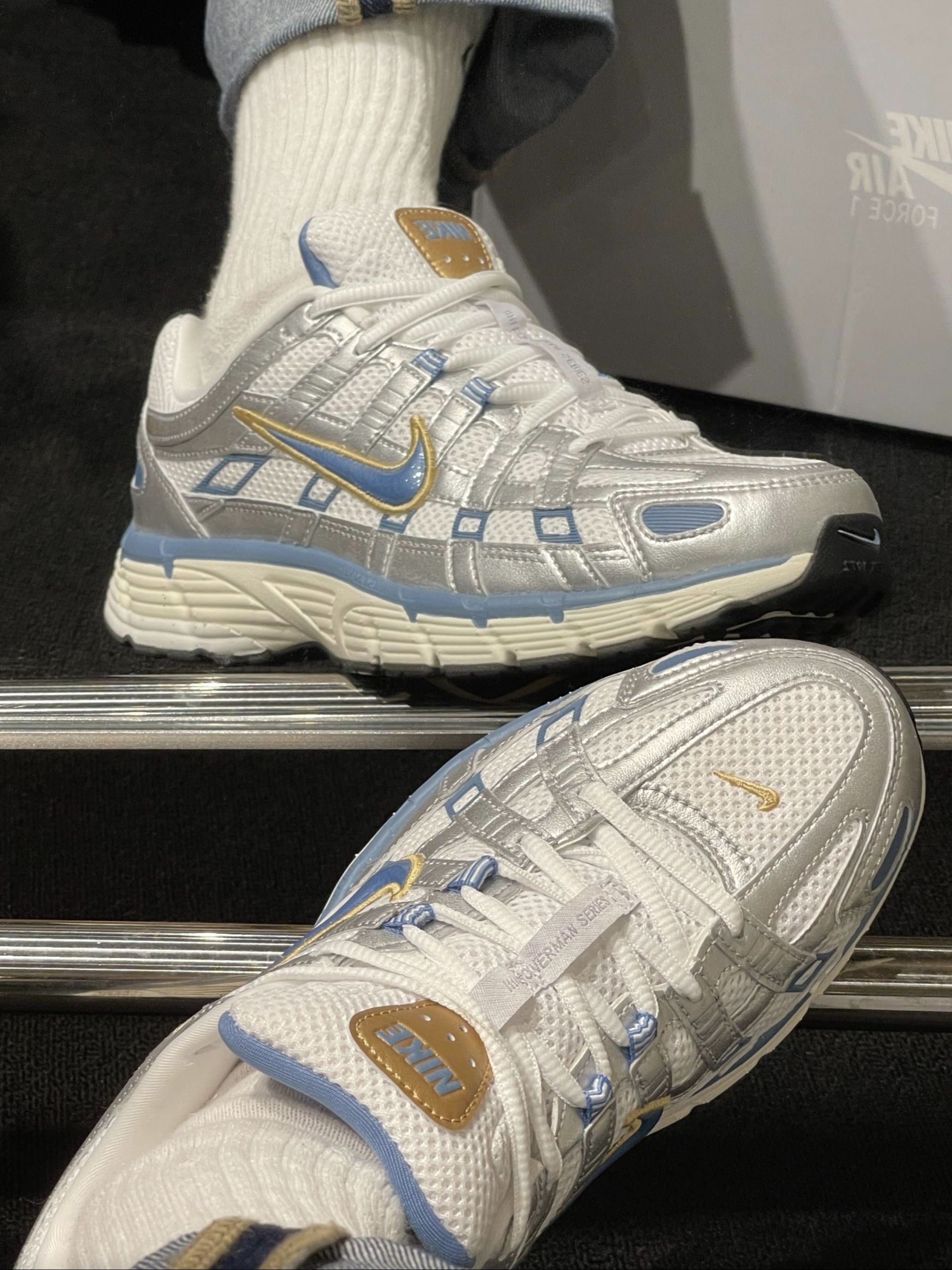 Nike P-6000银蓝配色真的越看越爱 银灰鞋面带着淡淡的金属光泽,搭配宝蓝色勾线和金色细节 网眼材质透气不闷脚,春天穿刚好 鞋底软弹,走路久了也不累,不管是配牛仔裤还是运动裤都很和谐。日常通勤、周末出街都能穿,低调又有质感,喜欢复古风的真的可以试试