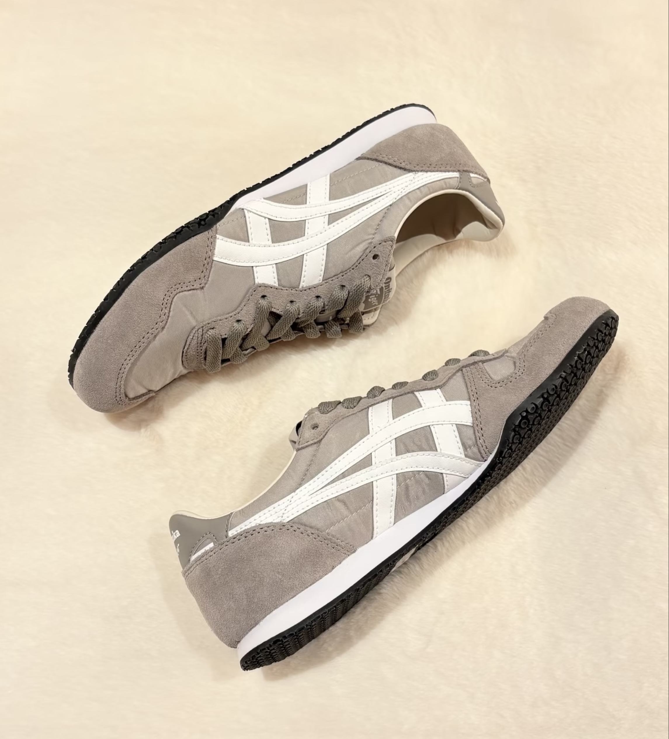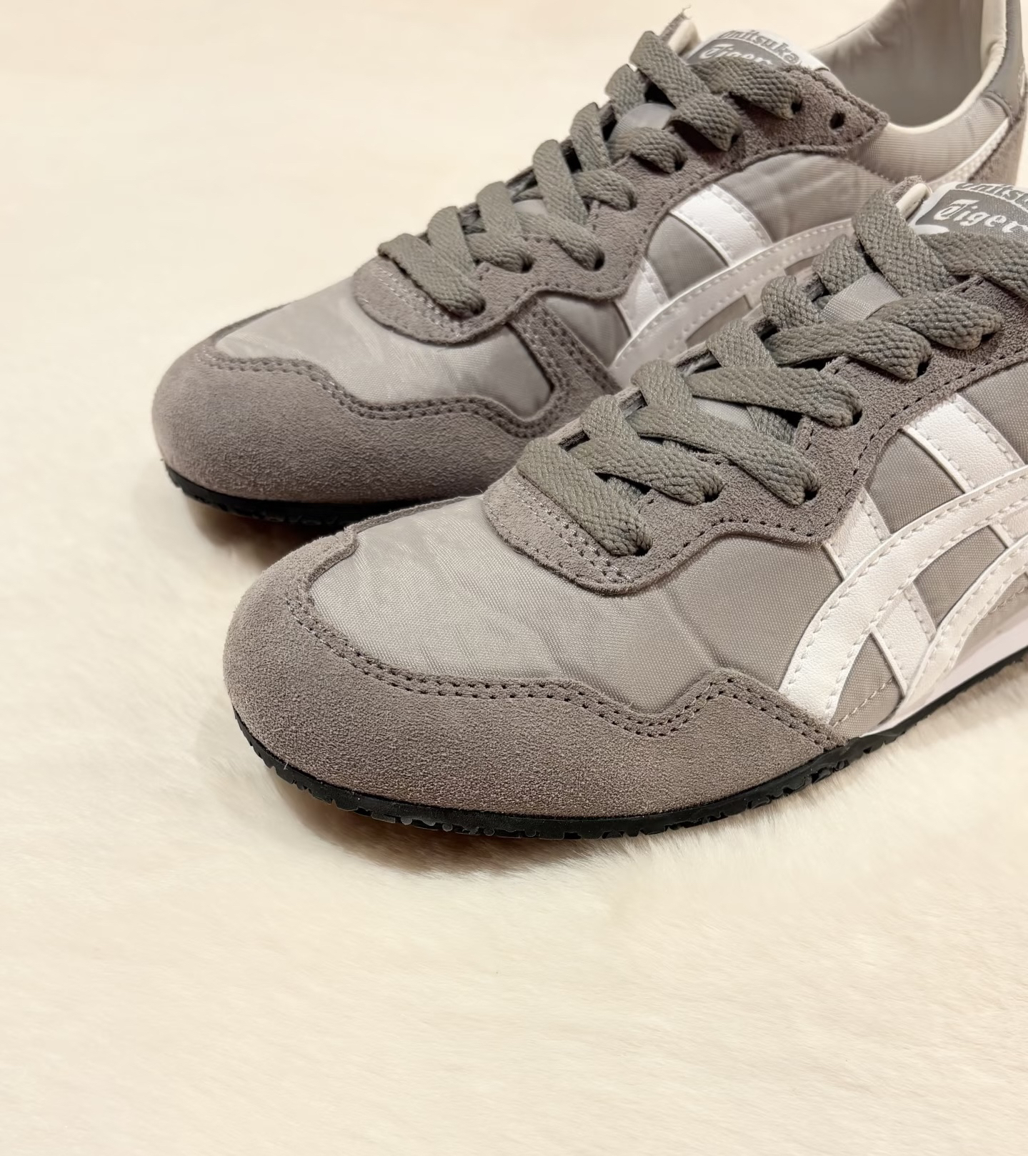 SERRANO 🩶高级感拉满的灰调鬼塚虎,把低调质感穿在脚上。 翻毛皮与尼龙布的拼接,摸得到的细腻肌理; 干净的白色虎爪纹点缀,利落又耐看。 低饱和灰色调不挑穿搭,不管是休闲裤还是牛仔裤都能轻松适配,通勤、出街都舒服又耐看,是那种越穿越有味道的经典款,低调却藏不住质感。