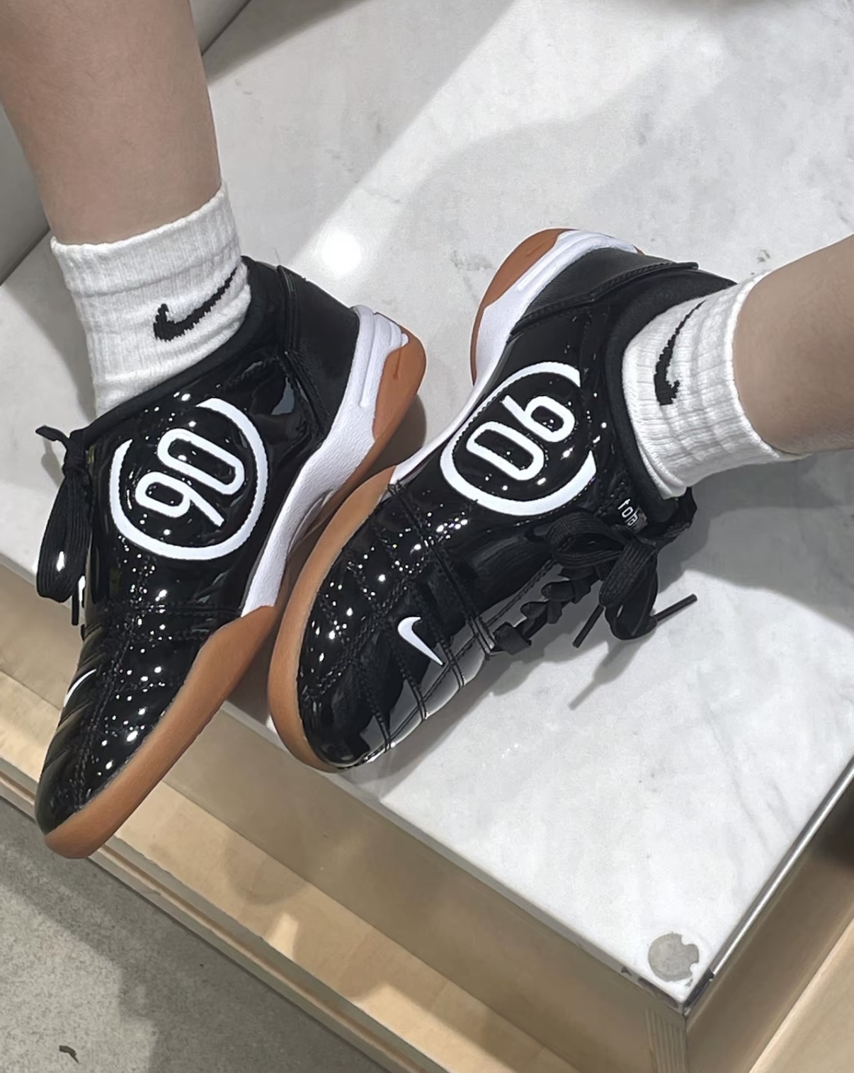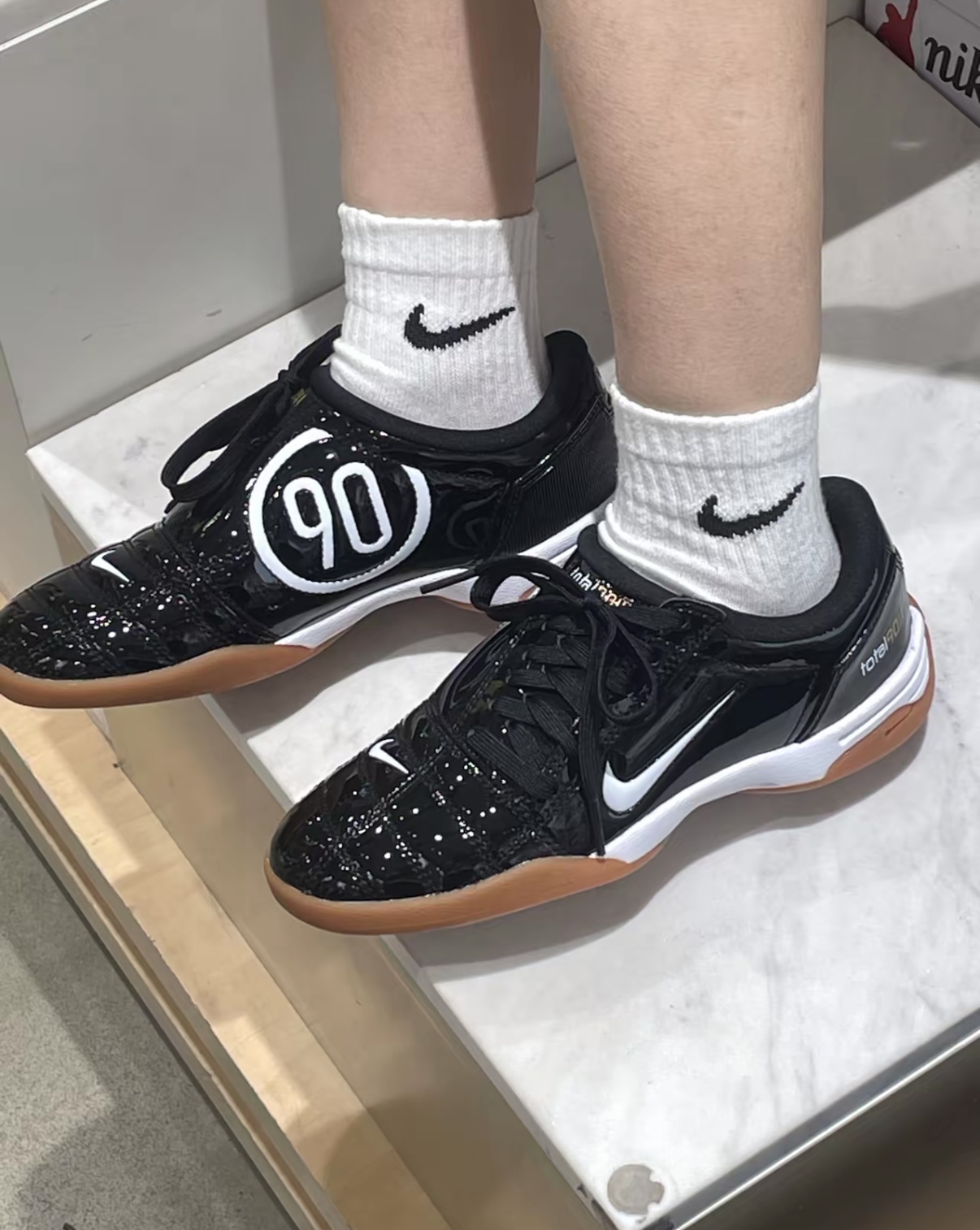 ✨Nike Total 90女子复古足球鞋,漆皮鞋面+白色“90”标志,复古感满满!生胶鞋底防滑耐磨,抓地力强,运动场景超适用⚽。侧边不对称Logo+内侧“90”细节,潮流感十足。鞋楦包裹性好,跑动不晃脚,日常穿搭也很OK,搭配运动裤或牛仔裤,轻松get街头复古风👟。售价约849元,运动&时尚兼备!
