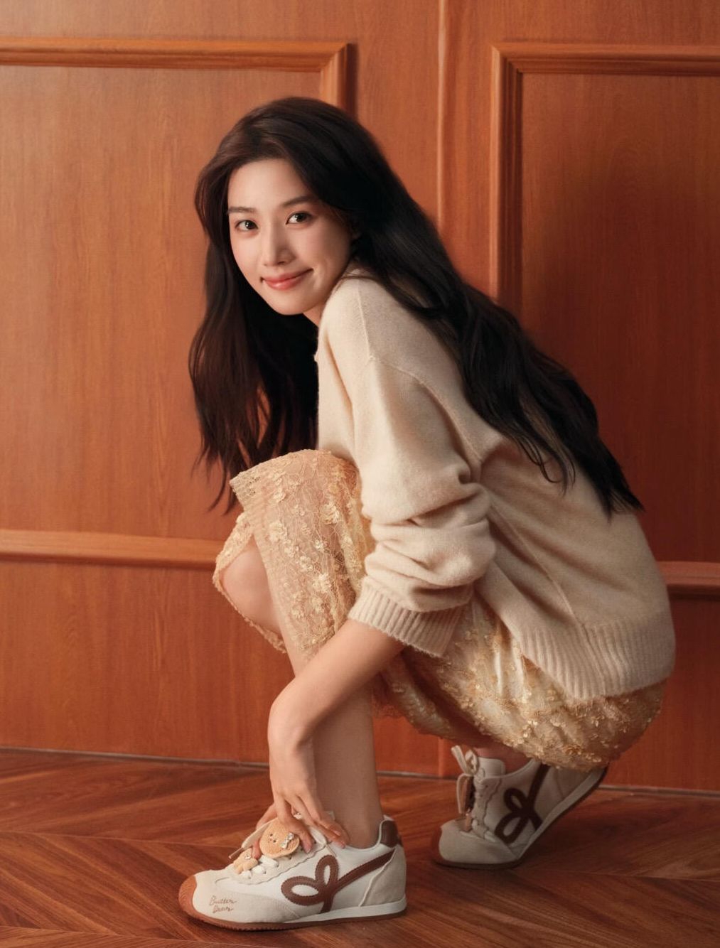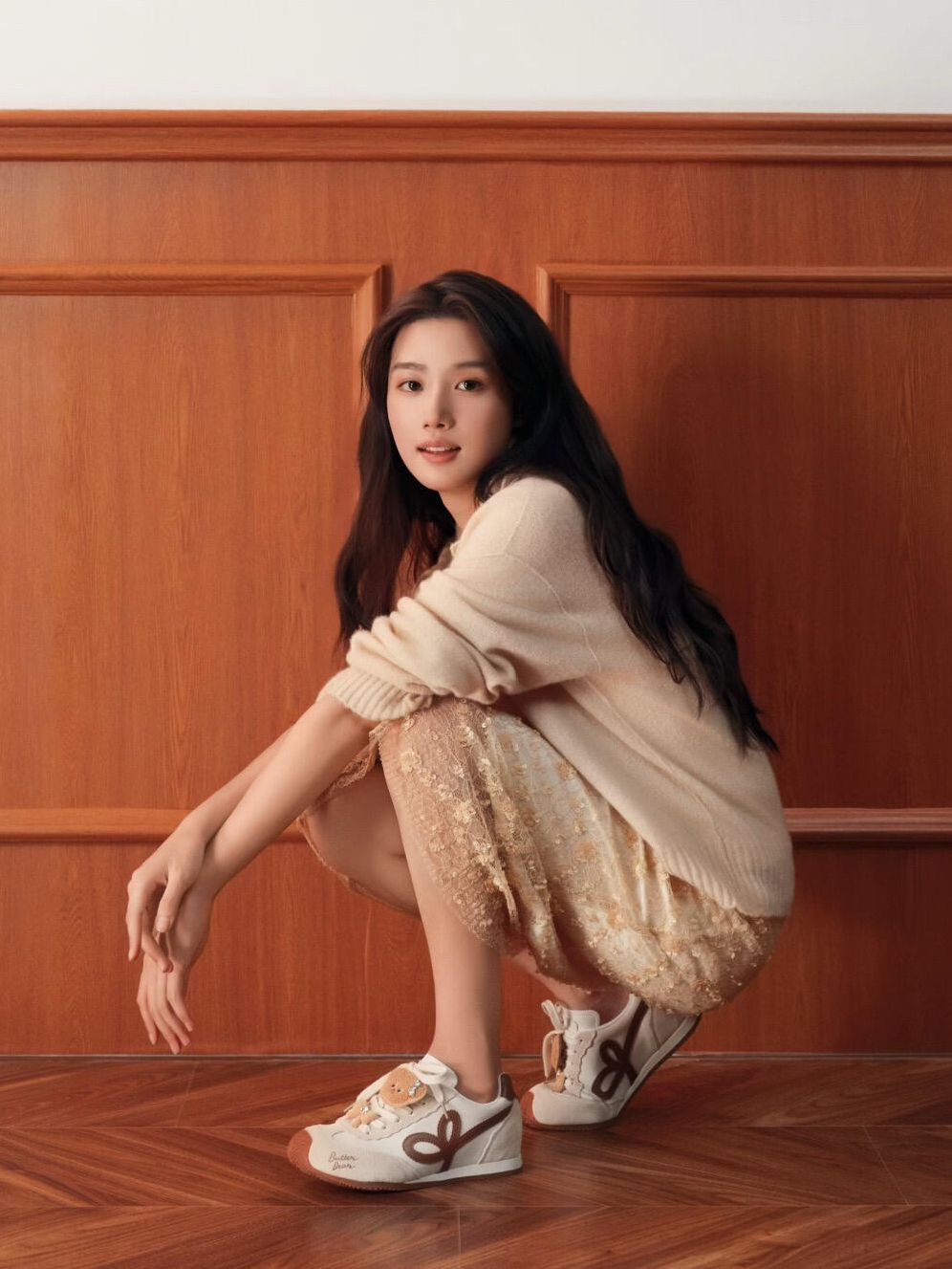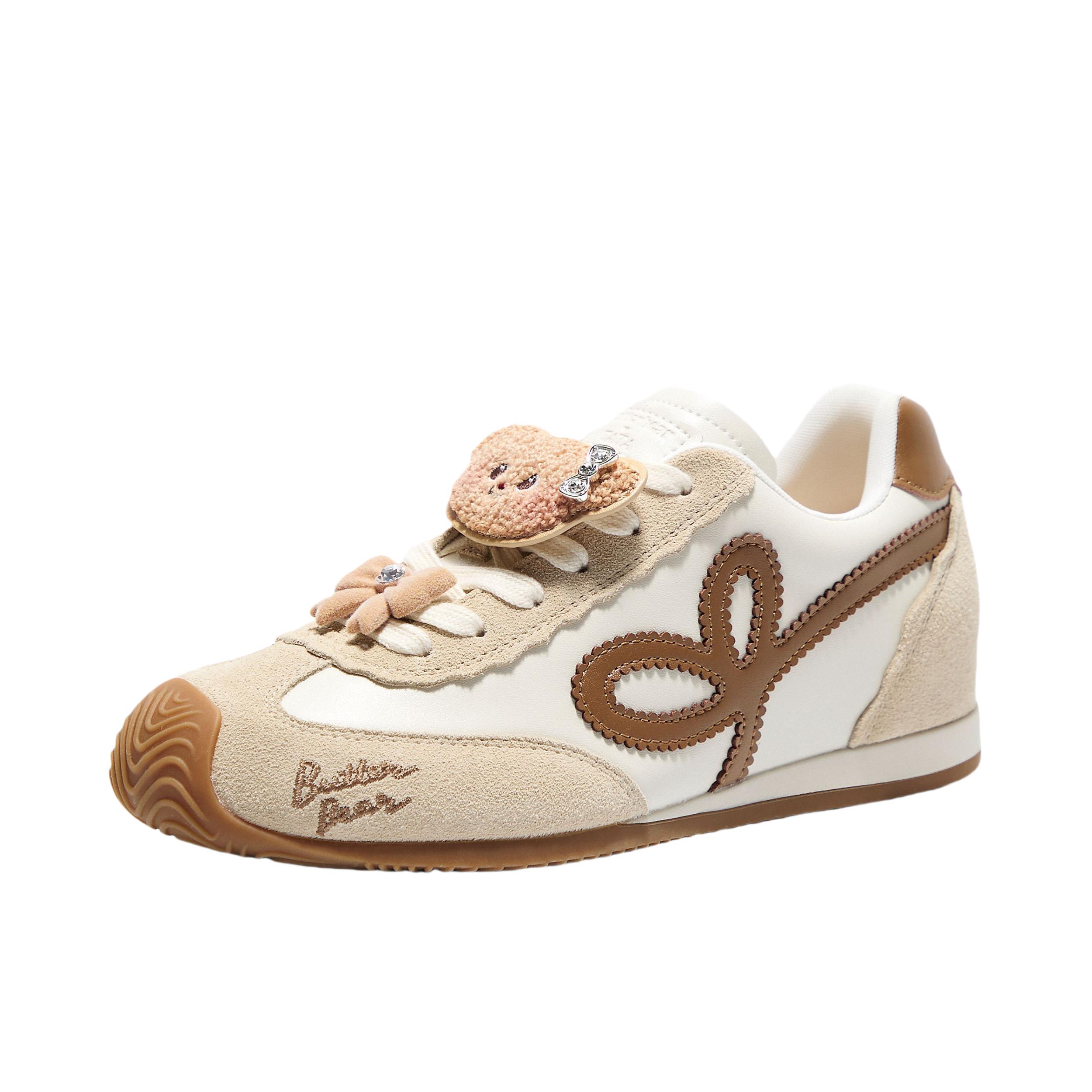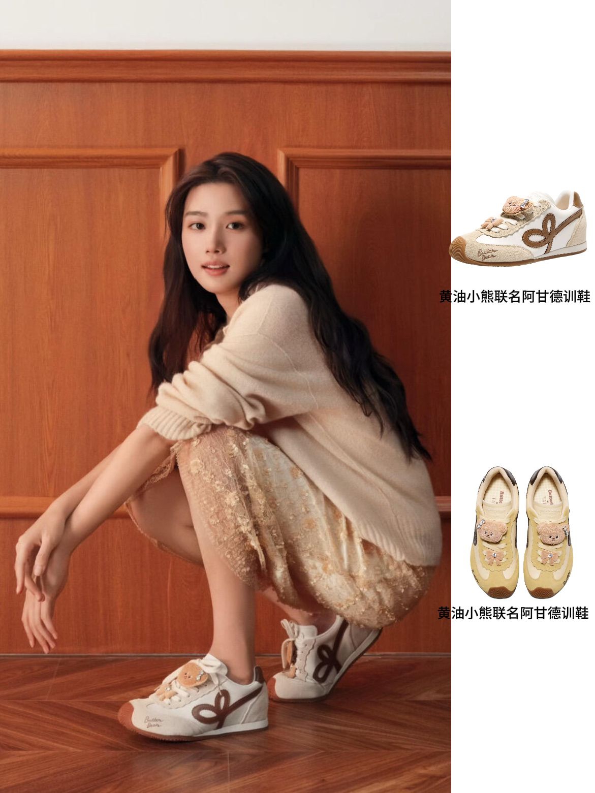 这身是温柔挂的奶咖系松弛感穿搭,太适合春天了! 软糯的米杏色针织衫+碎花蕾丝半裙,慵懒又带点精致,配上这双黄油小熊联名德训鞋,瞬间把可爱值拉满。鞋上的毛绒小熊挂件和蝴蝶结装饰,软乎乎的,完全戳中少女心。 个人感受:上脚很轻便,配色温温柔柔,和浅色系衣服巨百搭,走在路上都觉得自己是韩剧里的温柔姐姐。唯一小缺点是挂件有点容易勾到,但架不住它太可爱了,甜妹日常穿真的很减龄! cr:卢昱晓