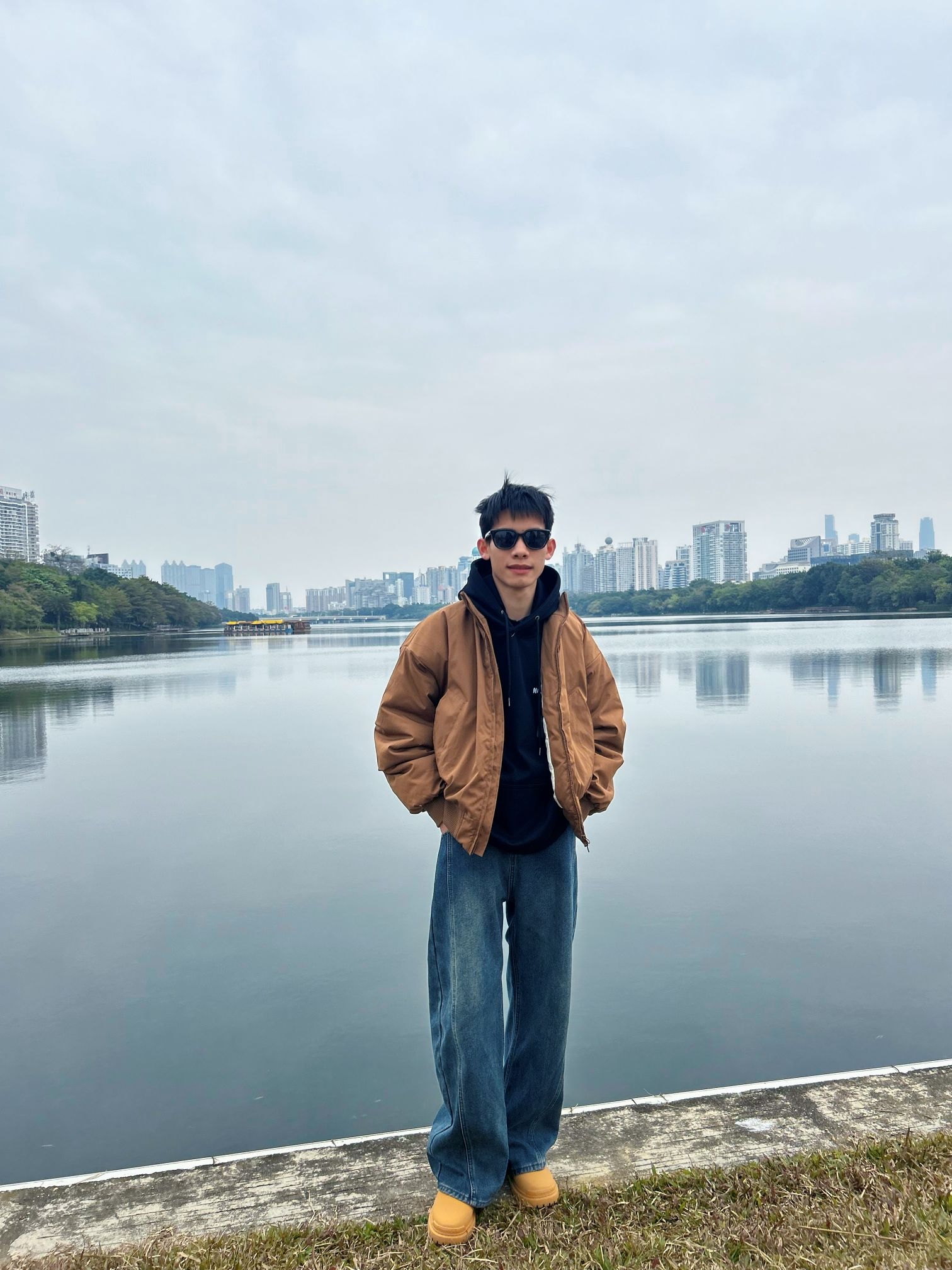 -棕色廓形夹克Q:宽松剪裁不挑身材,活动起 来没有束缚感,立领设计既能挡风又能修饰线 条。面料看起来是挺括的棉质,触感柔软,保暖 性适中,春秋季单穿或叠穿都很合适。 -黑色内搭:简约的基础款,和夹克形成柔和的 色彩对比,贴身舒适,给整体穿搭增加了层次 感。 -阔腿牛仔裤:垂坠感很好,裤型宽松不紧绷, 走路带风,对腿型的包容度高,搭配起来自带慵 懒随性的氛围