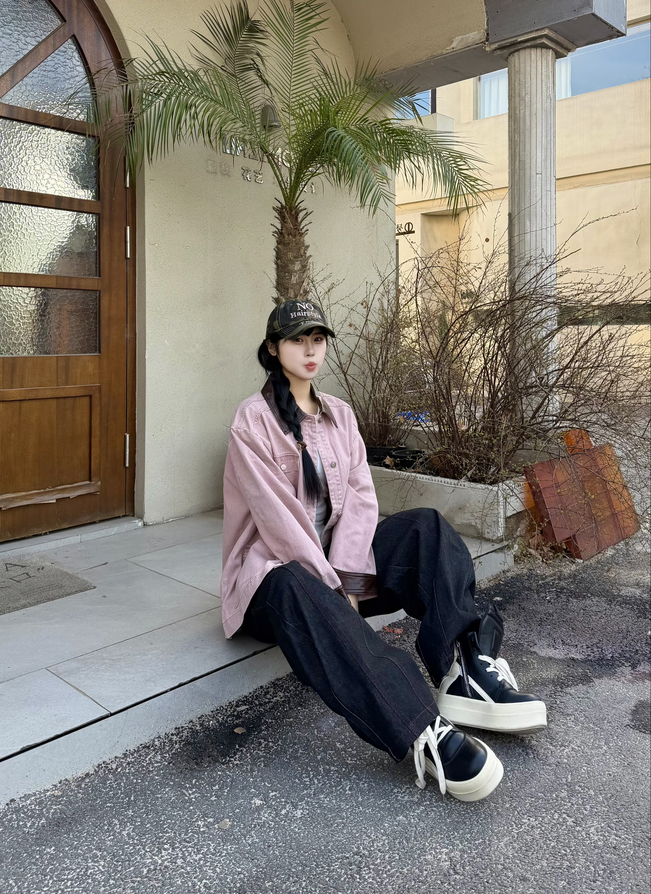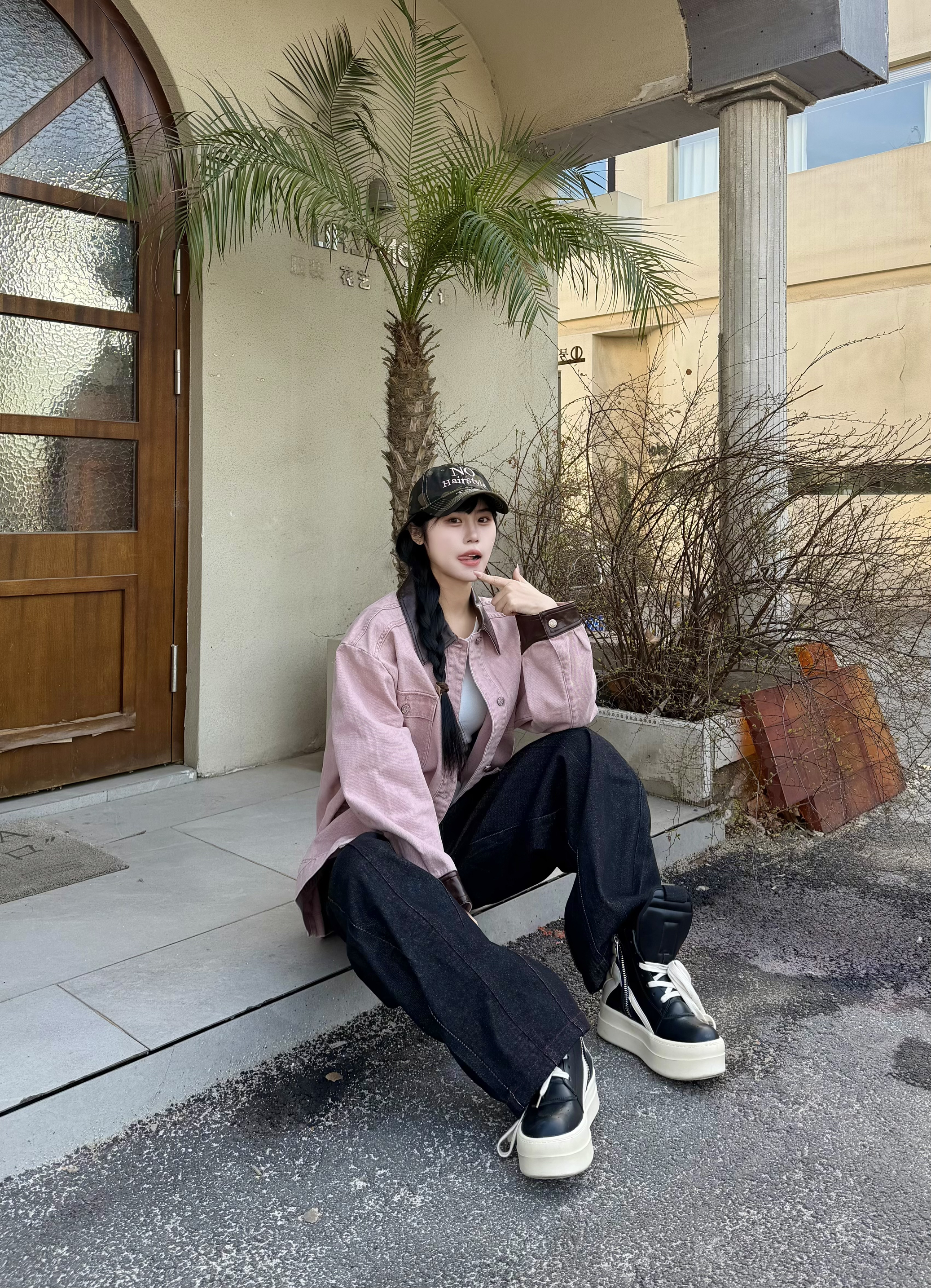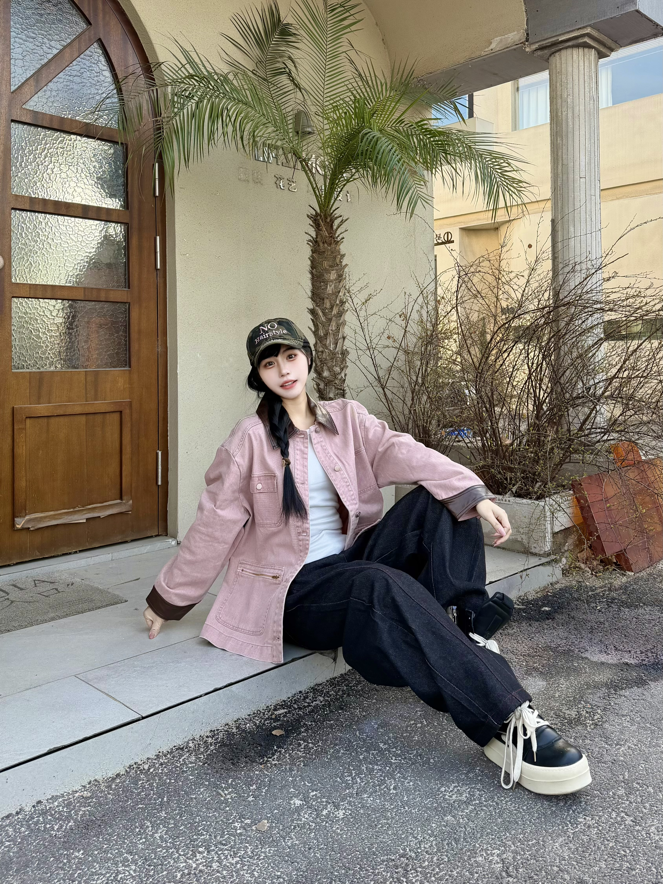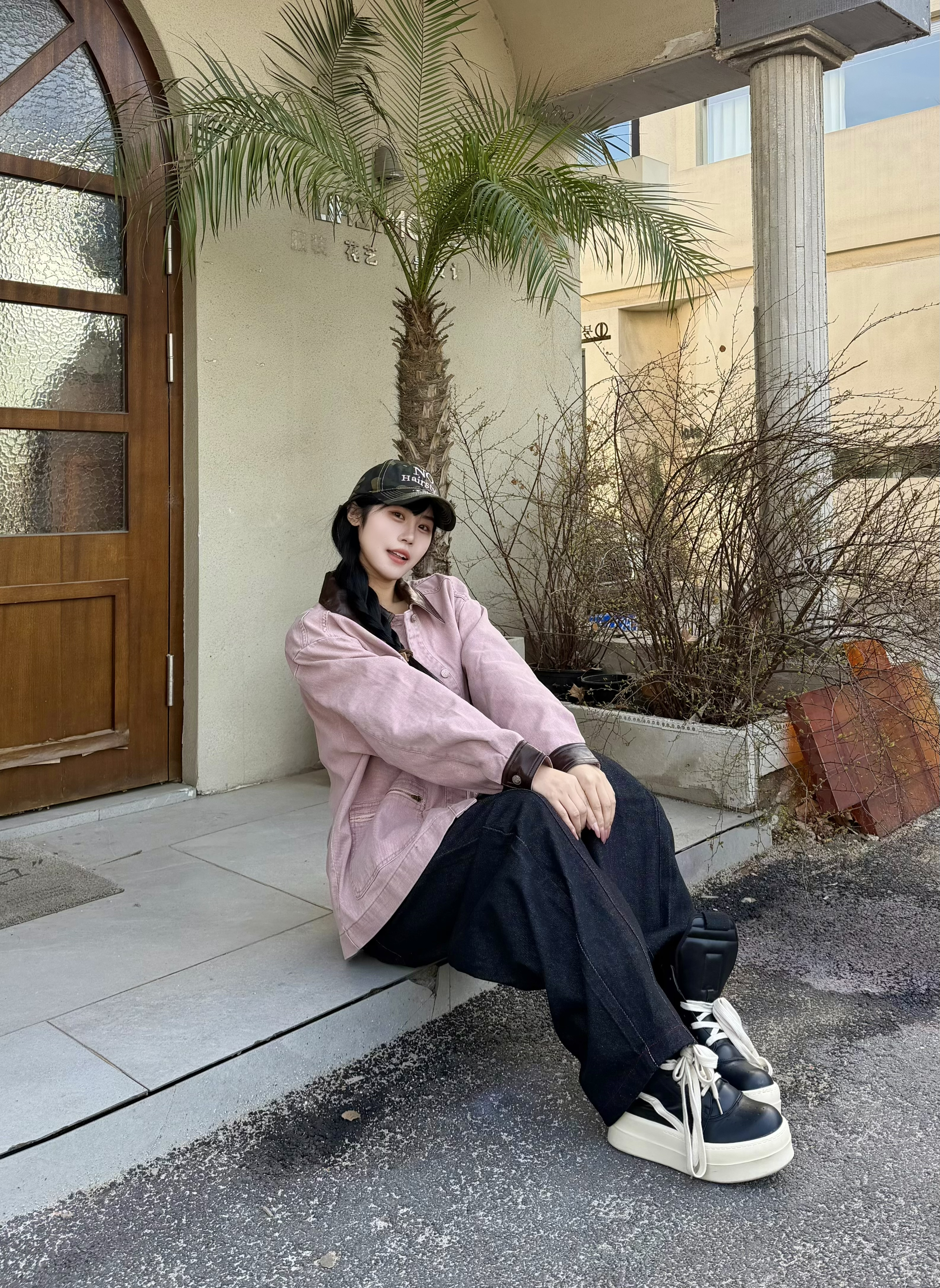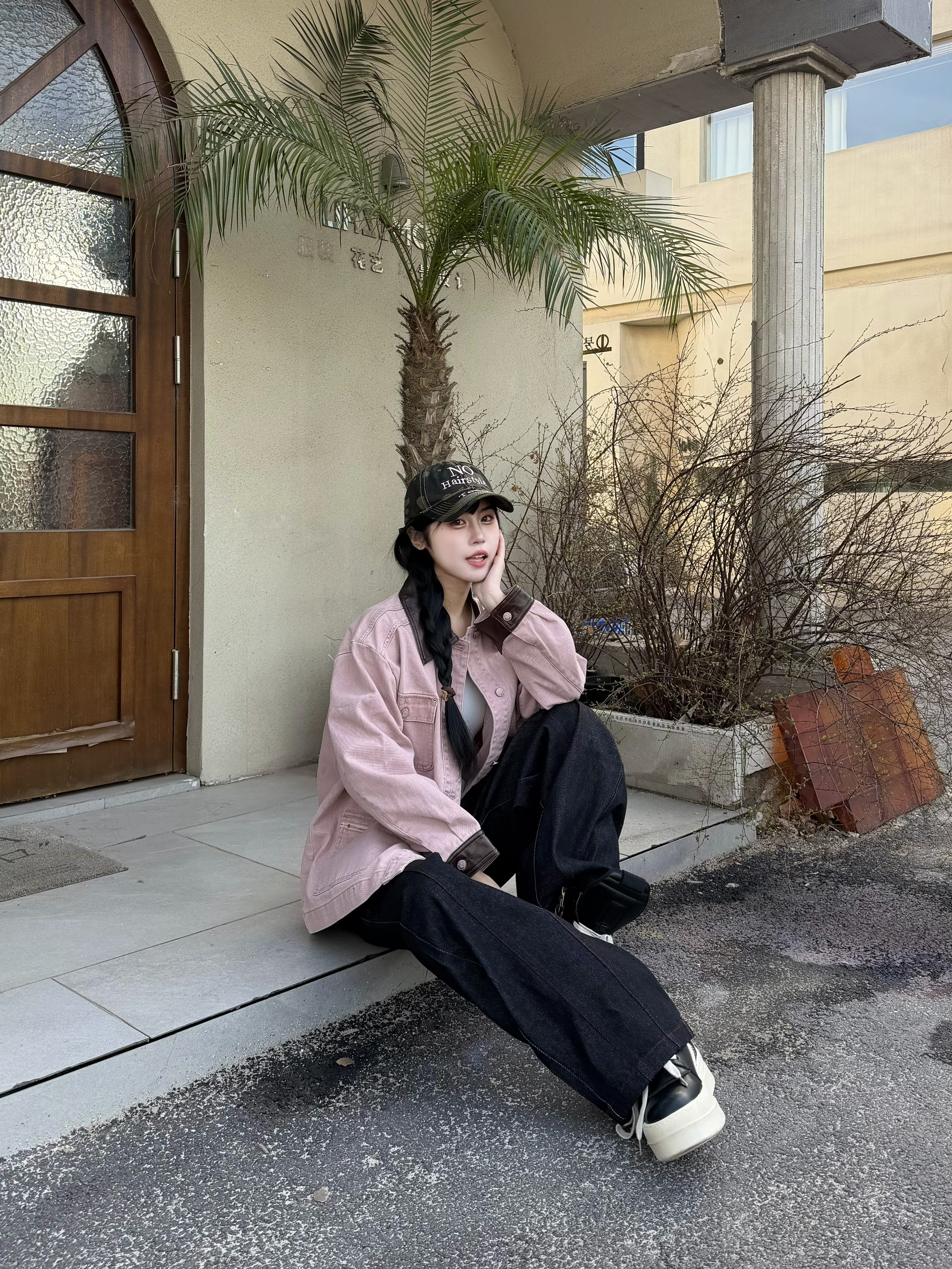 今天这套真的是随性又舒服! 粉棕拼色外套软乎乎的 搭深色阔腿牛仔裤慵懒感直接拉满 再戴个迷彩棒球帽甜酷平衡 这套有点韩系日常出门舒服又时髦✨ 春日韩系穿搭你学会了吗