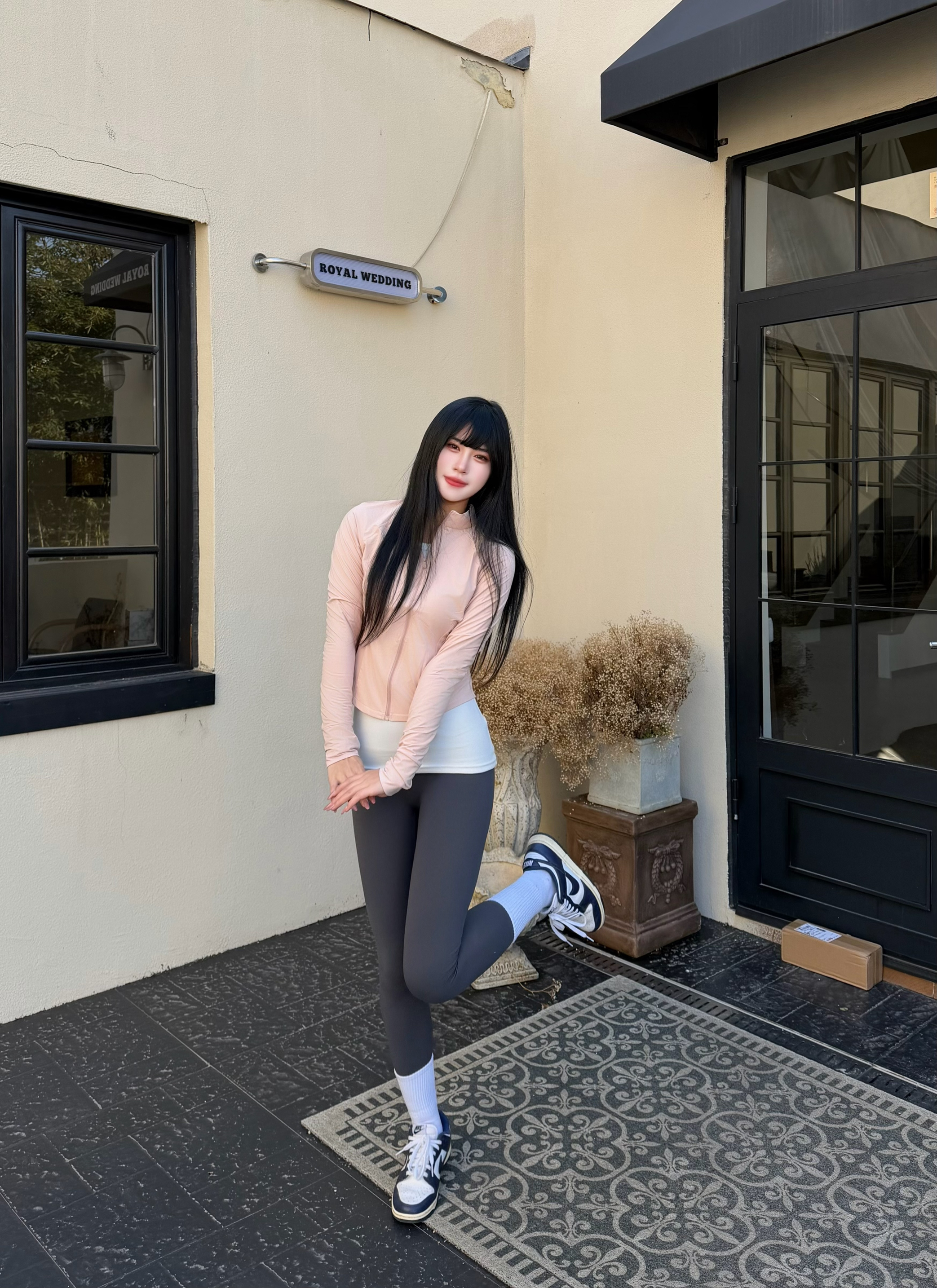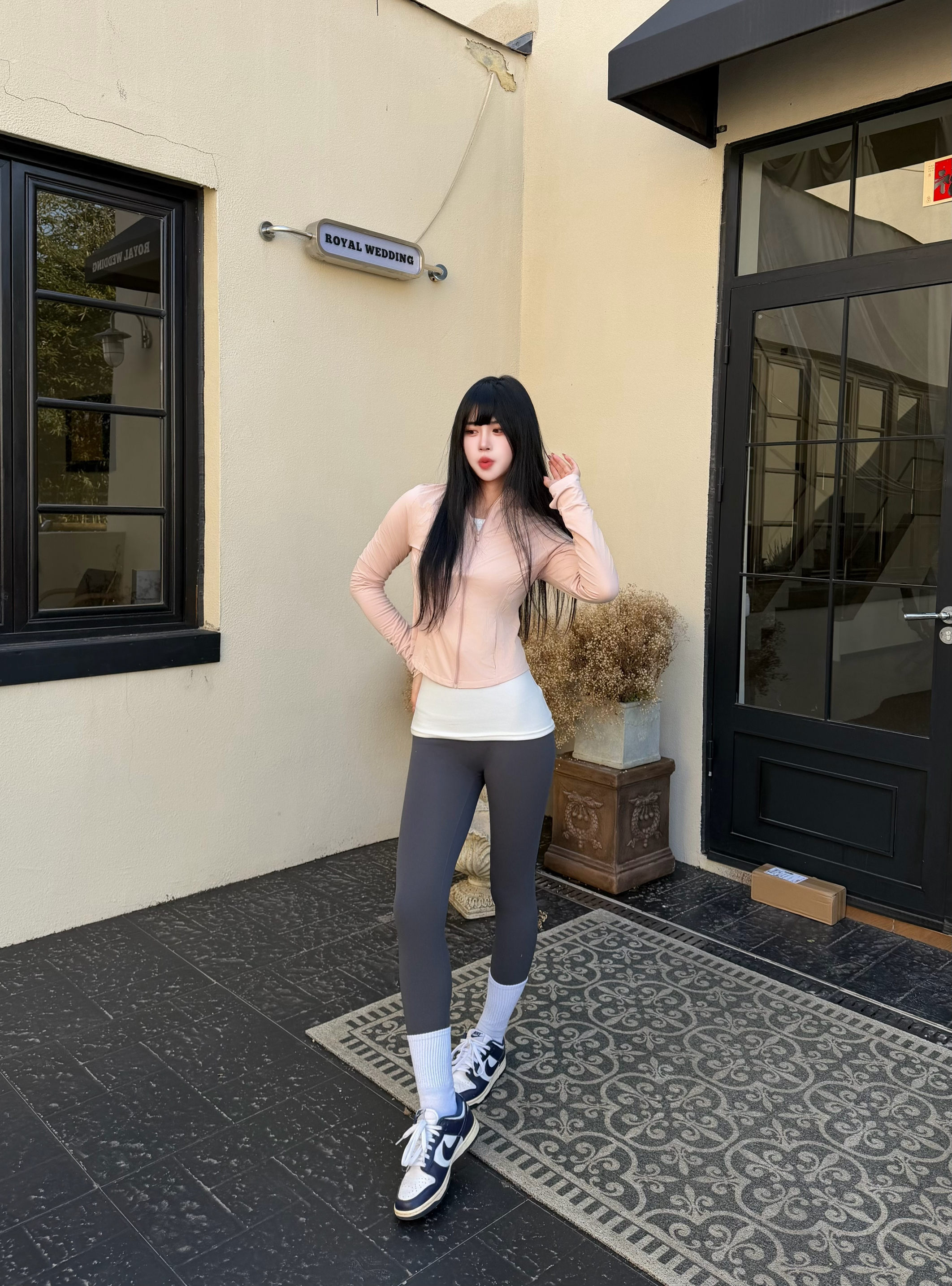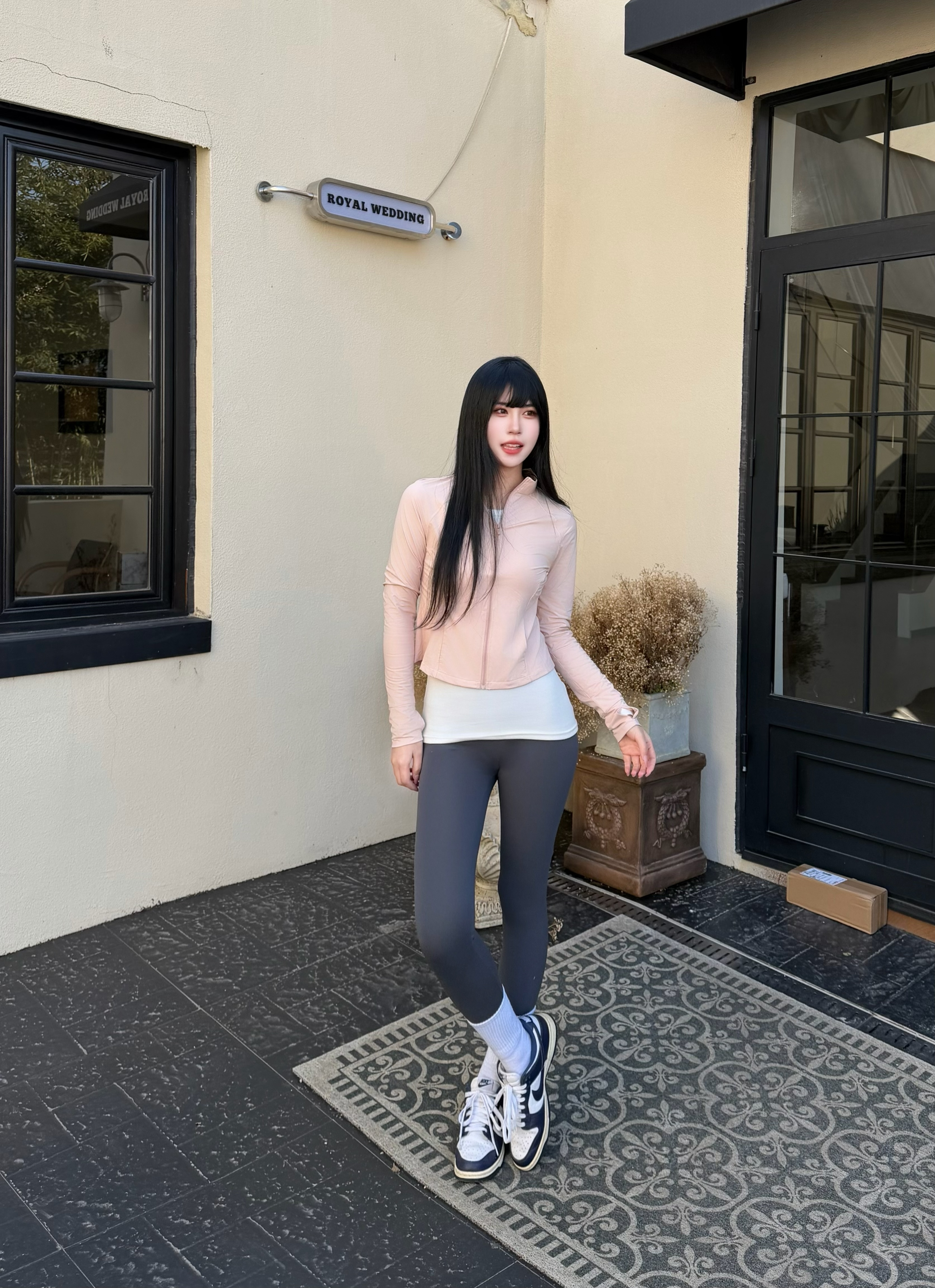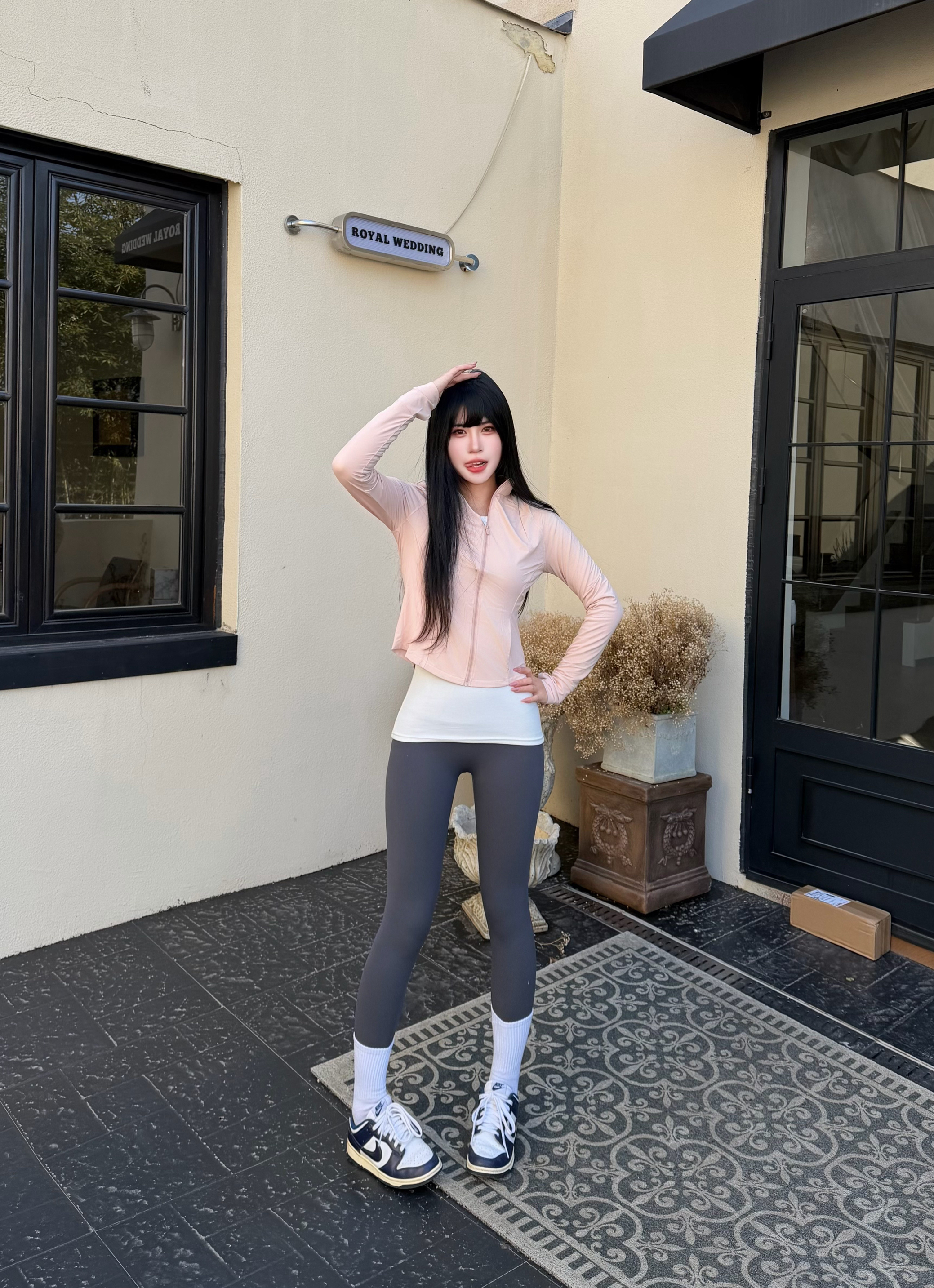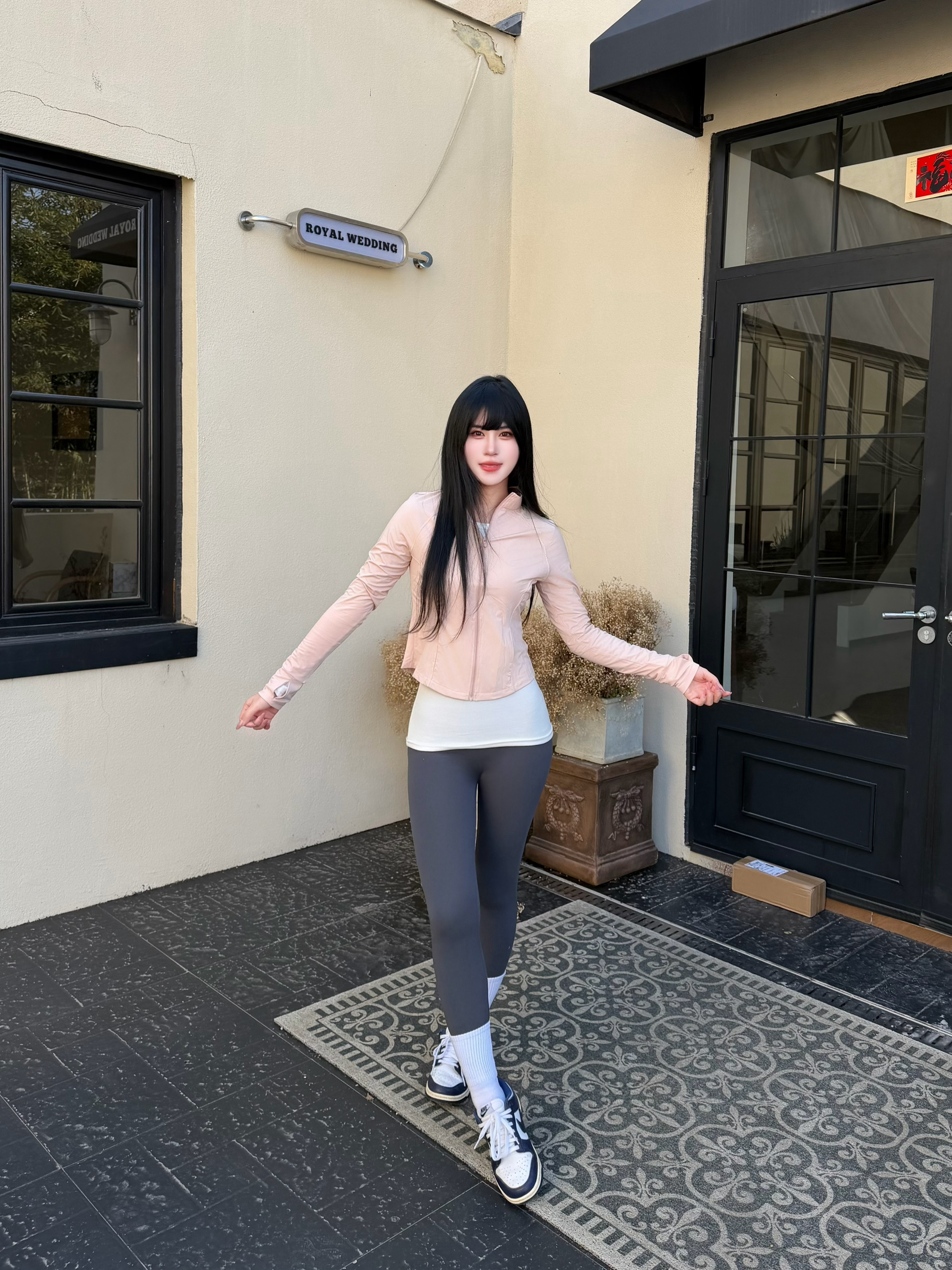 这套运动风真的太适合日常出街了 温柔的裸粉防晒衣搭白内搭奶呼呼的 紧身版型还能悄悄勾勒线条一点都不臃肿 下身配深灰瑜伽裤高腰设计直接把腿拉得又长又直 再穿一双白袜和经典的黑白板鞋元气感拉满 妥妥的懒人舒适风天花板随便一拍都很出片✨ 入春ootd这样搭配你学会了吗