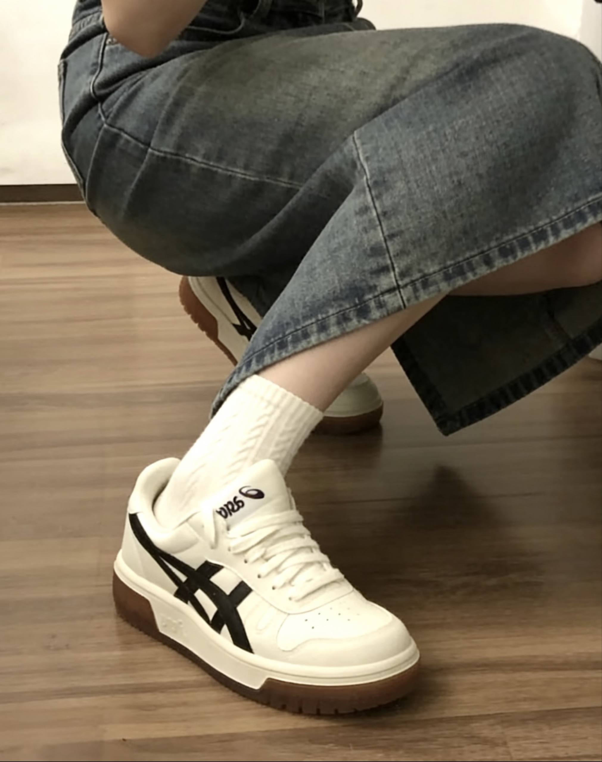 这是ASICS Court MZ板鞋,米白+黑撞色设计,复古休闲感强,合成革鞋面,搭配生胶底,兼顾潮流与减震支撑,适合日常穿搭。