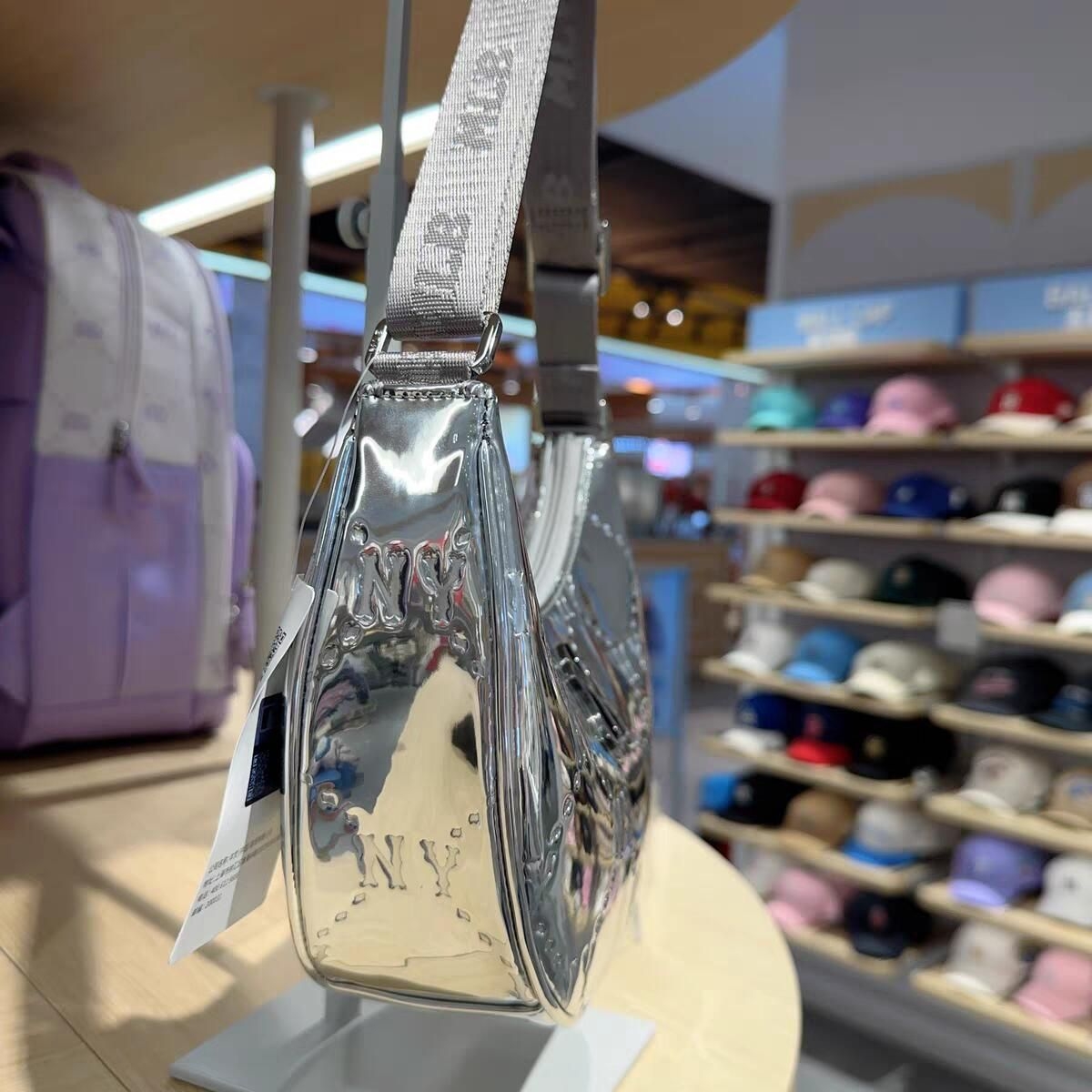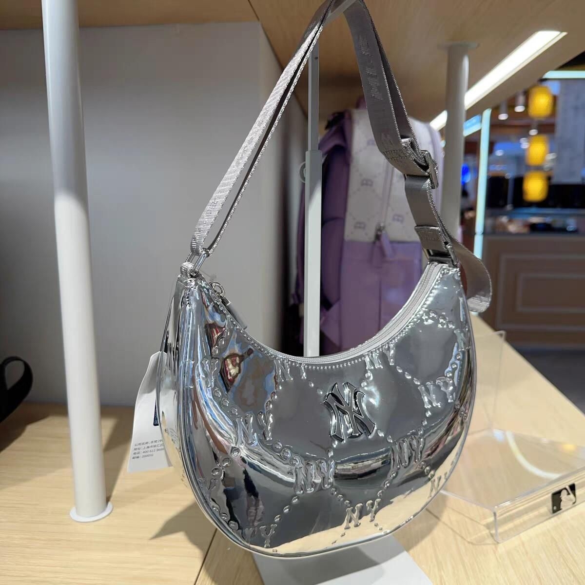 ✨MLB春夏新款银色老花腋下包,金属光泽PU材质,经典钻石老花+NY标志,潮流感满满!弧形包型,肩带可调节,单肩/斜挎都OK,日常出街、休闲场合都能轻松驾驭👜。尺寸适中,手机钱包轻松装下,实用又时髦,是潮流爱好者必入单品!