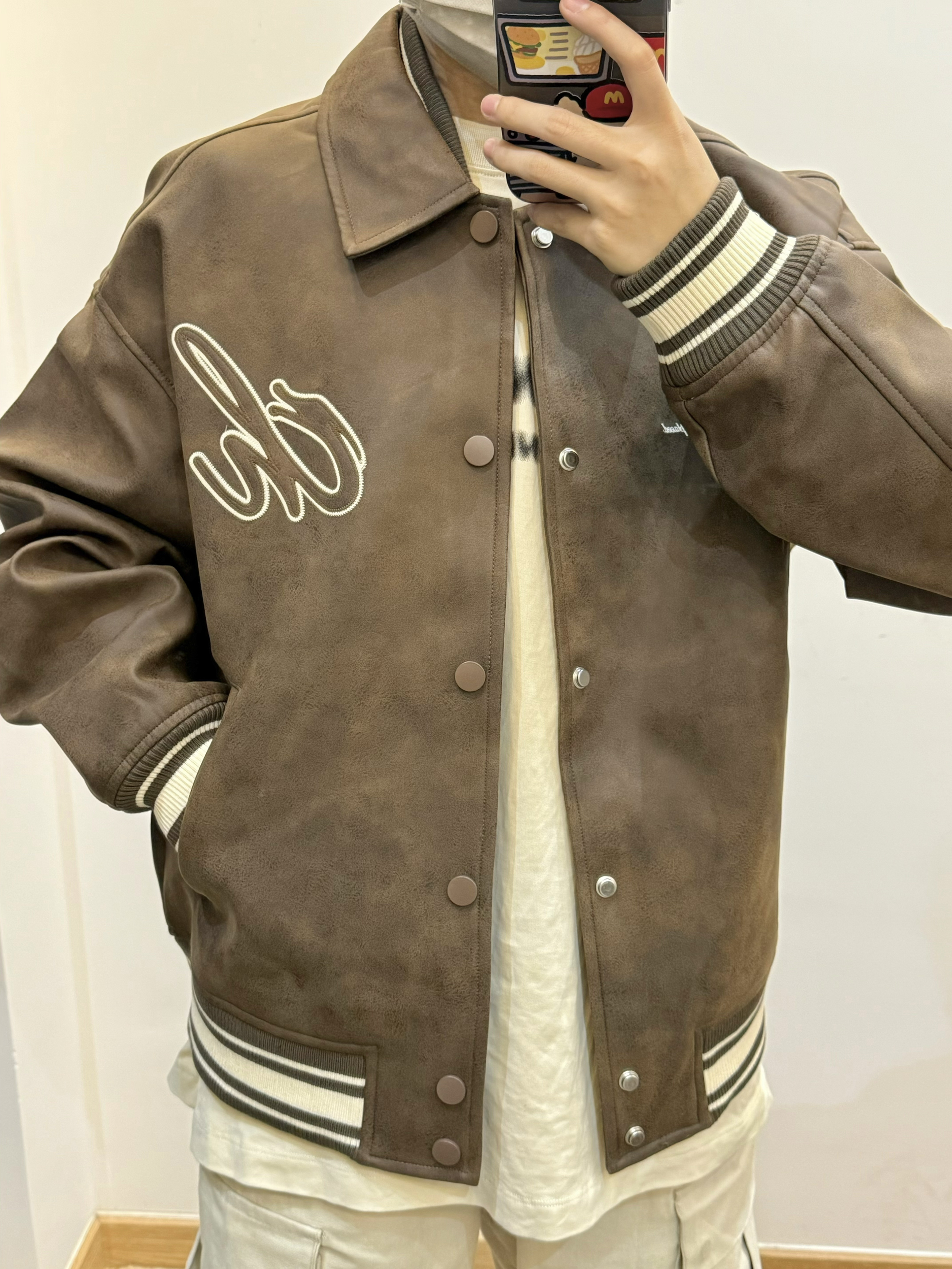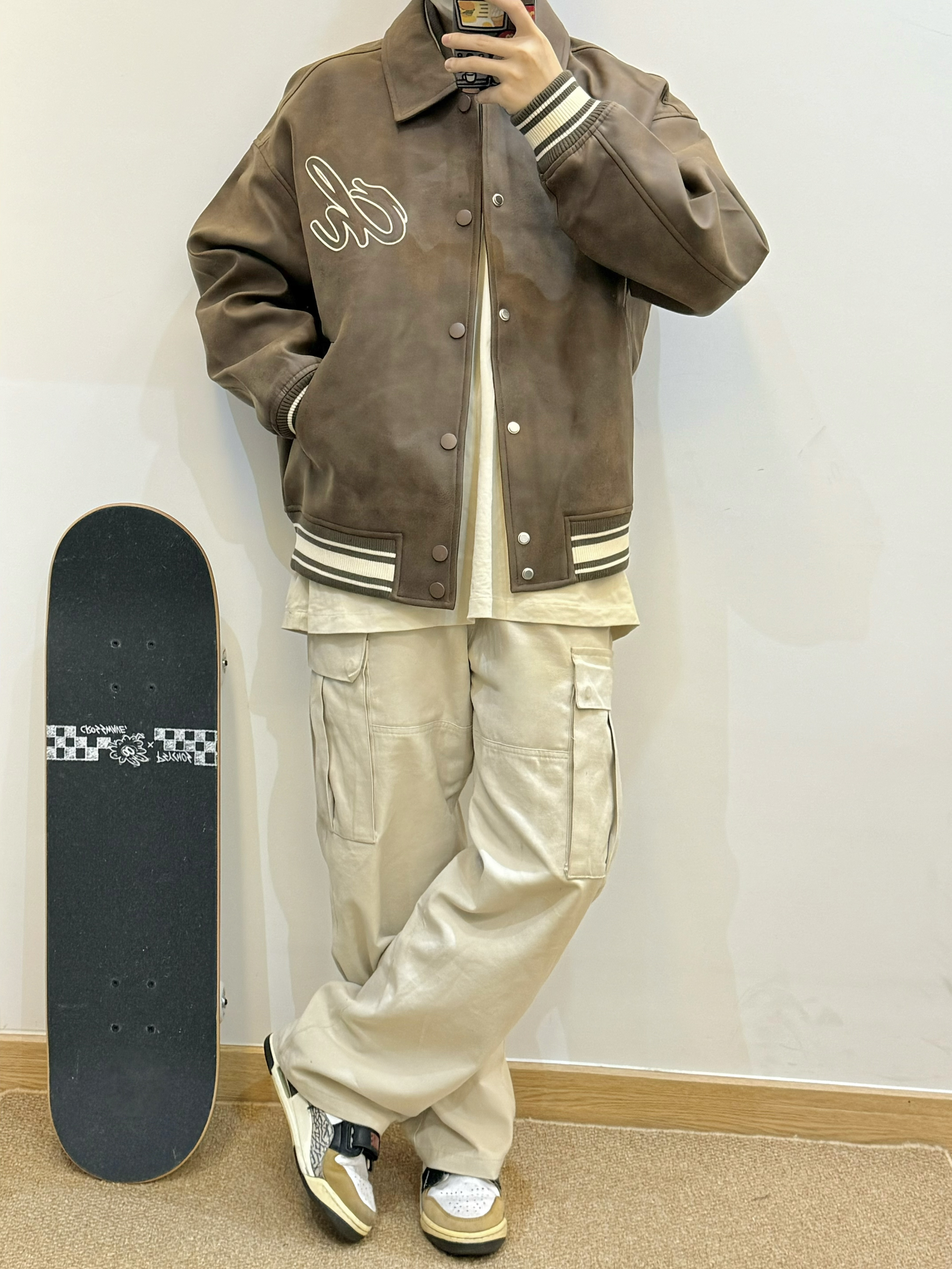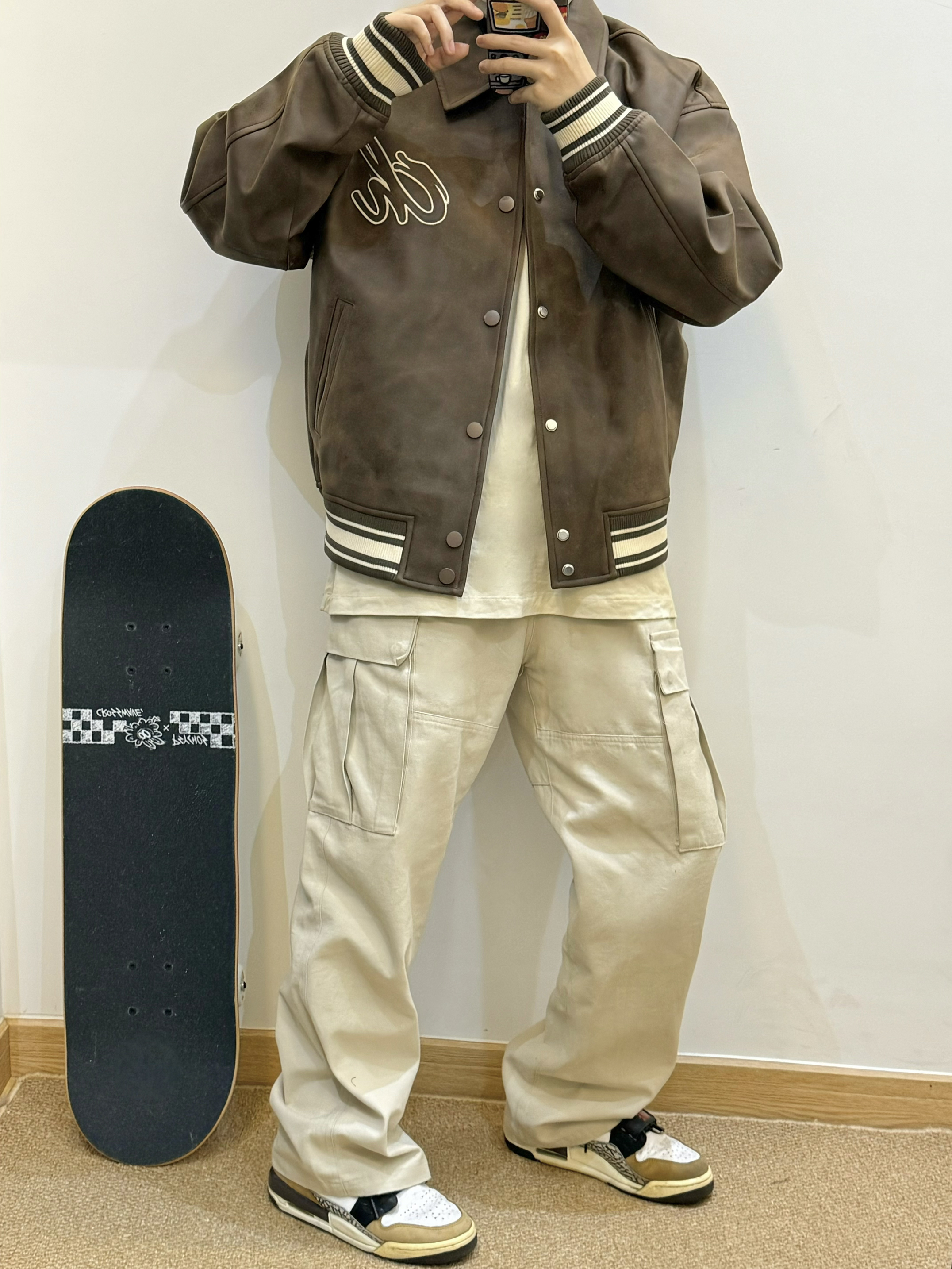 今天是棕色棒球服夹克搭配米色工装裤的穿搭 Pu皮的材质 上身很有质感 胸前和背后都有重工刺绣 袖口的条纹撞色设计 给人眼前一亮 棕色系美拉德风拿捏 很适合秋天 秋日出游穿这一身包帅的! 👔:CHINISM 👟:AJ312