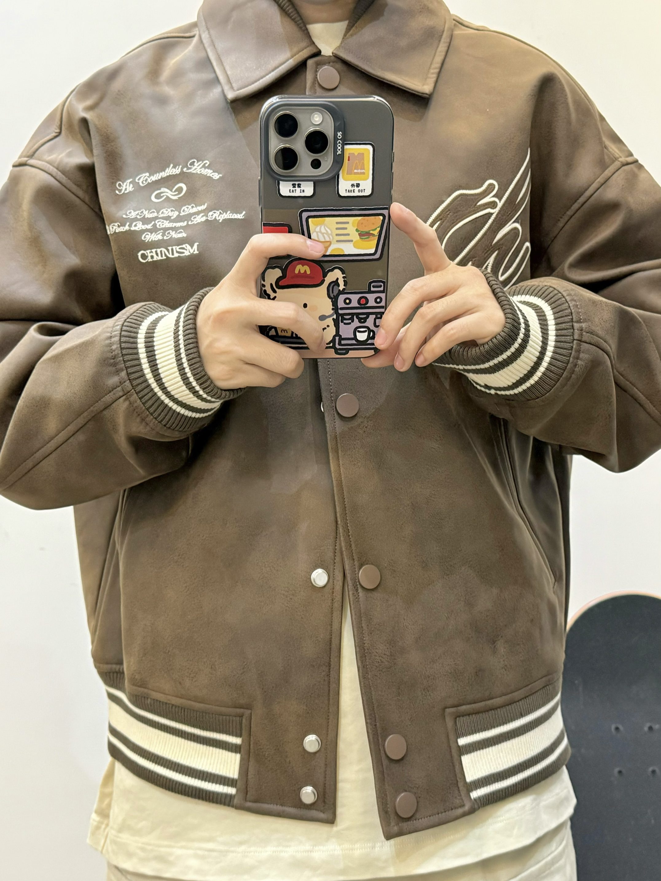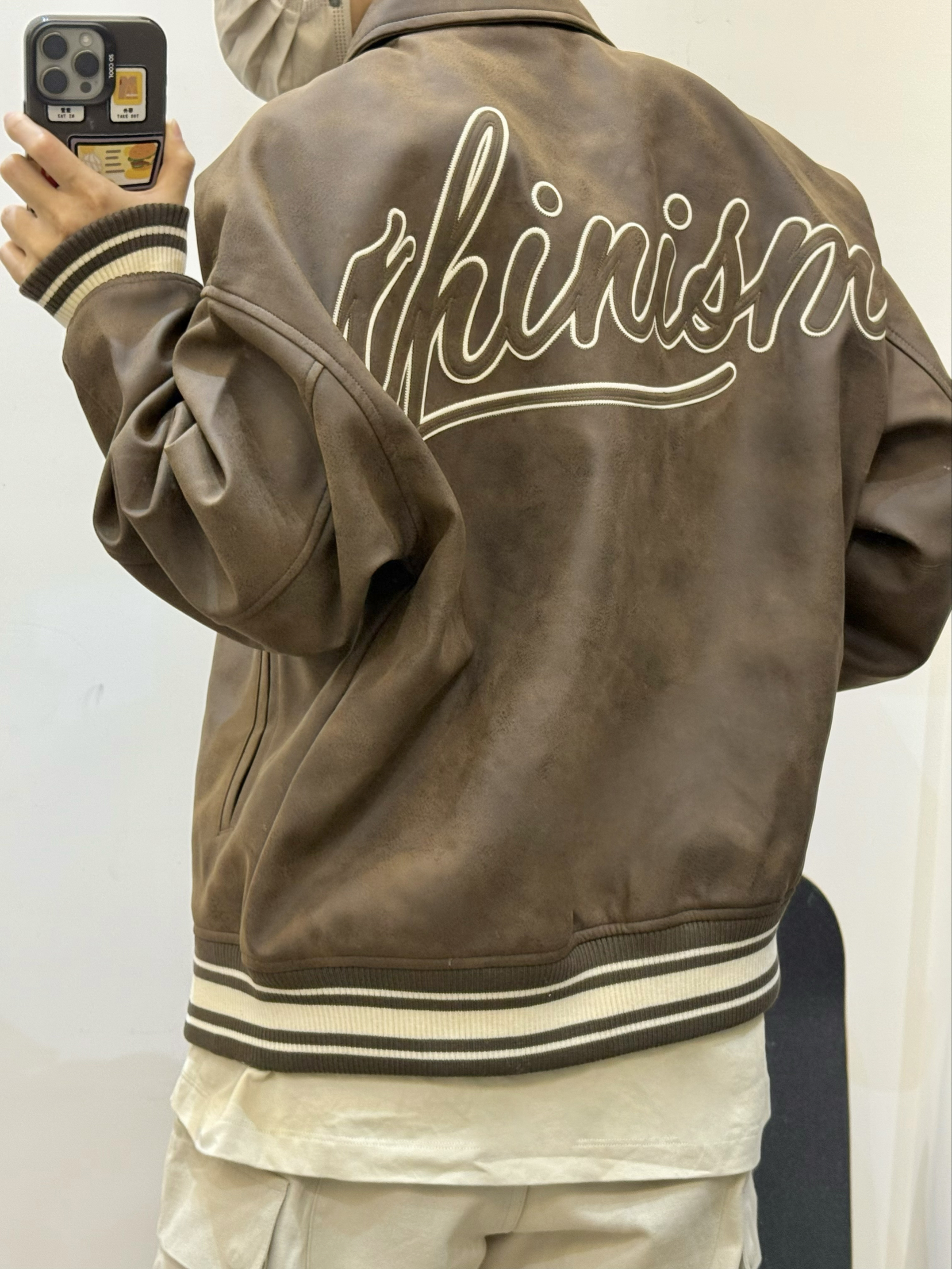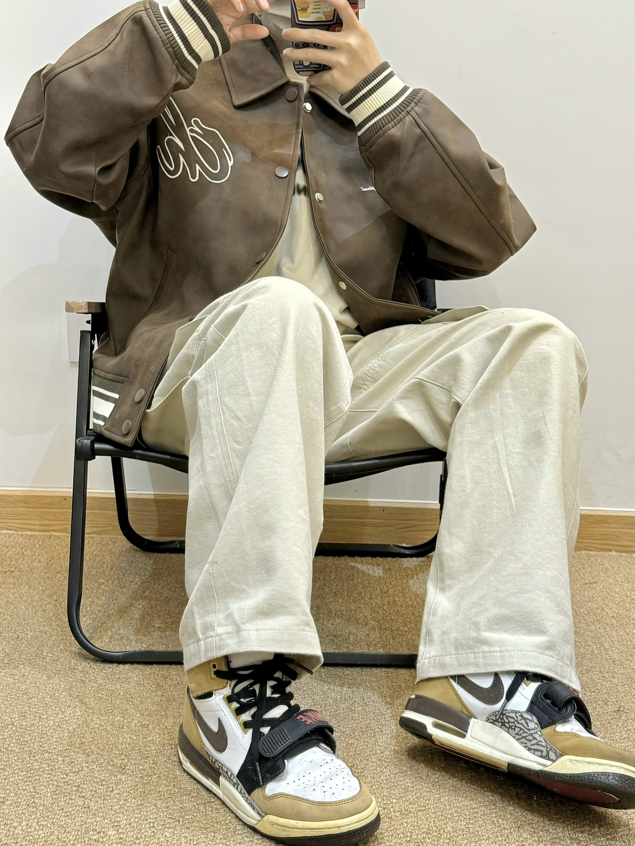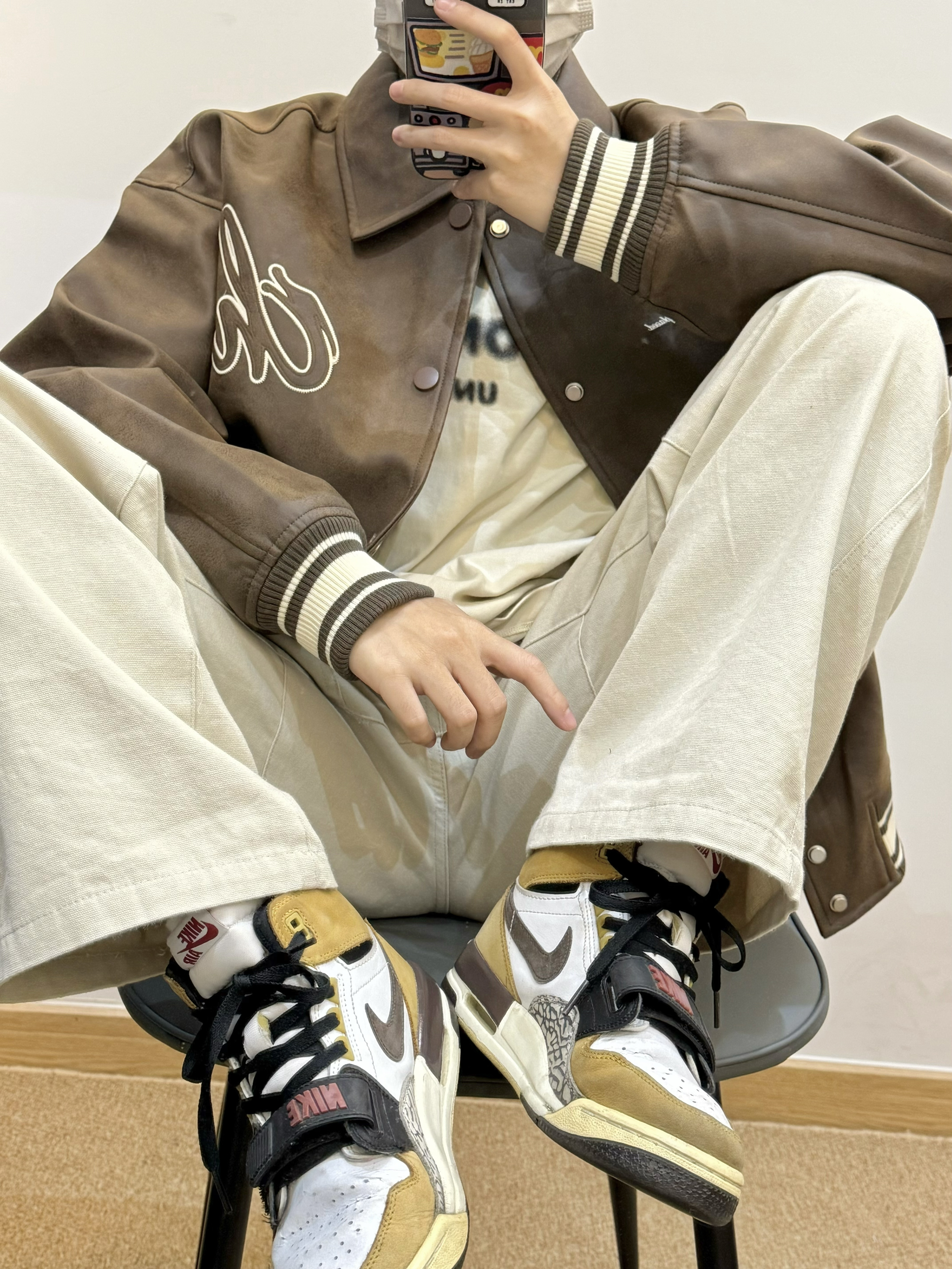 今天是棕色棒球服夹克搭配米色工装裤的穿搭 Pu皮的材质 上身很有质感 胸前和背后都有重工刺绣 袖口的条纹撞色设计 给人眼前一亮 棕色系美拉德风拿捏 很适合秋天 秋日出游穿这一身包帅的! 👔:CHINISM 👟:AJ312