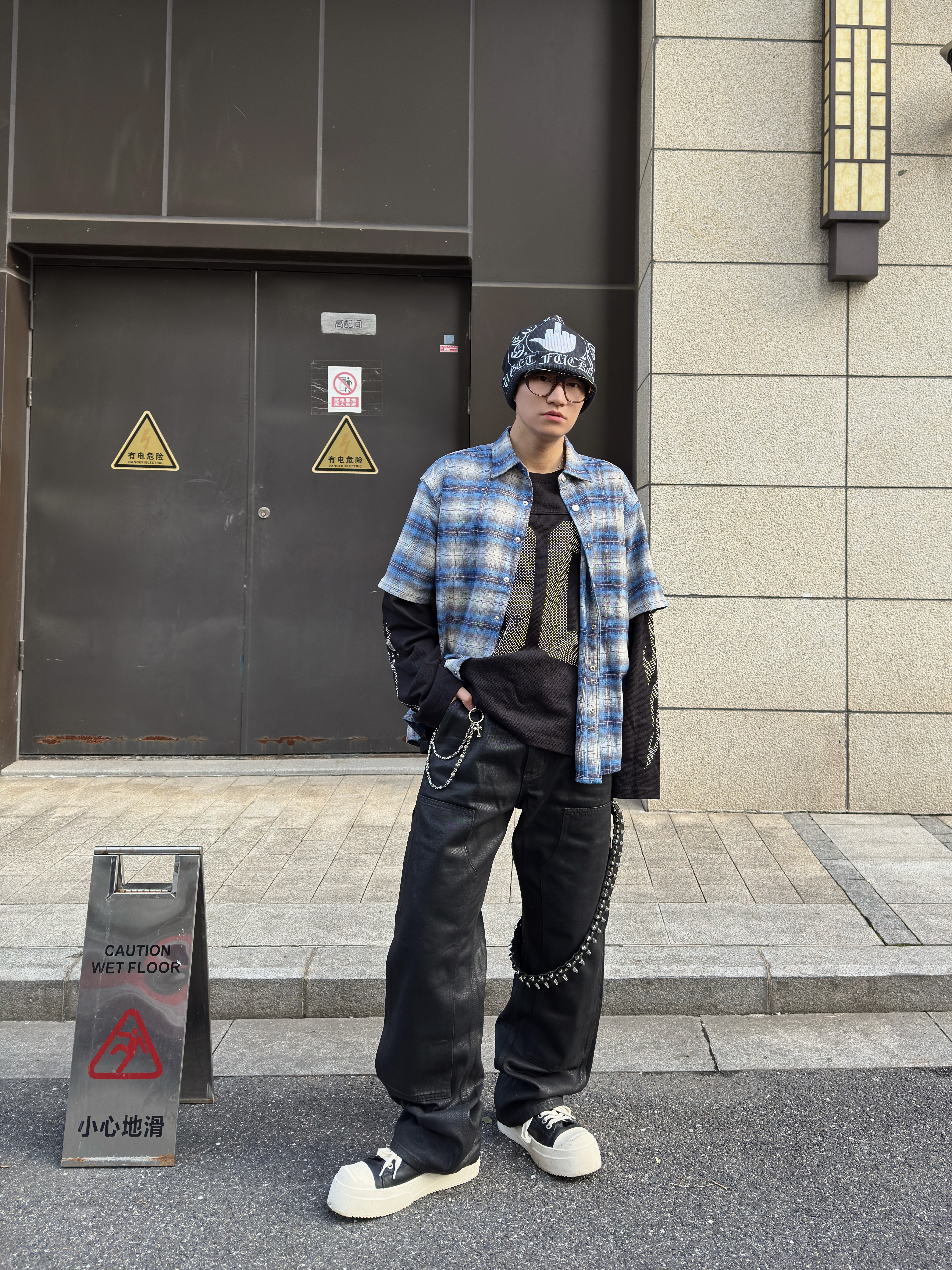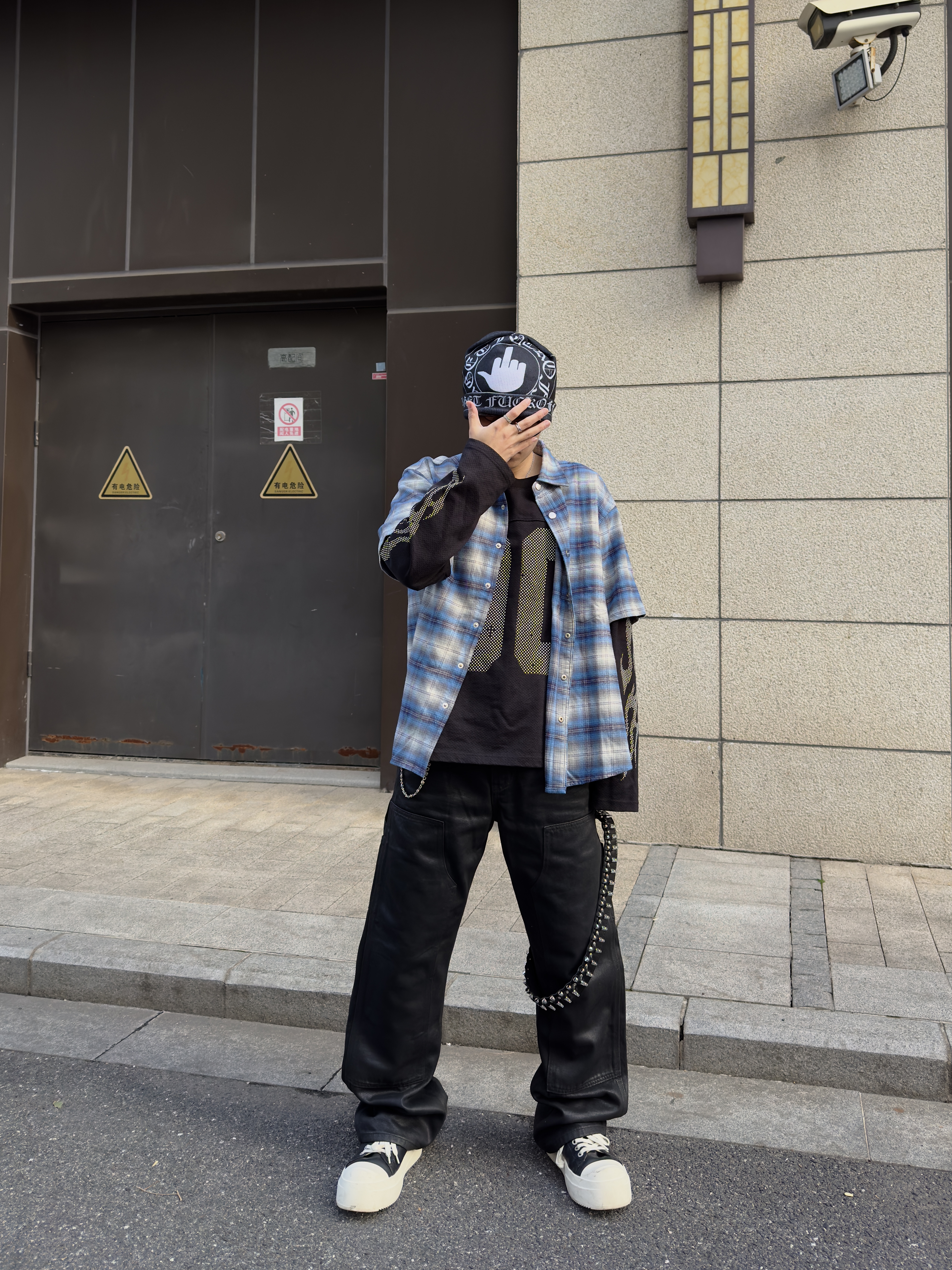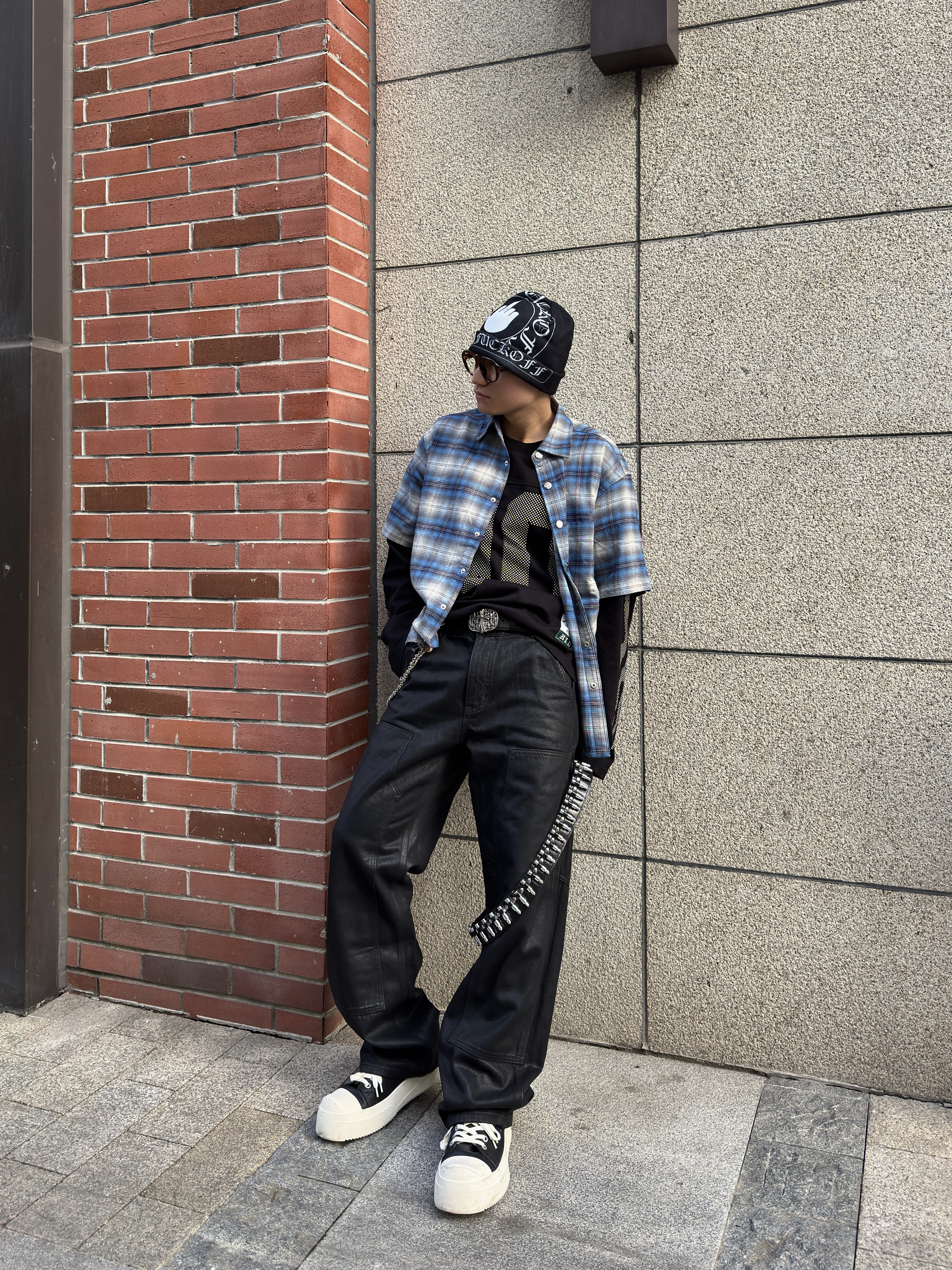 从前两年的baggy到今年的skinny 我发现裤装的趋势是逐渐走向合身🎁 再加上今年千禧风的大热 2000年前后的流行开始重新走进潮人们的视线 那一条合身的直筒伐木裤就比较重要了💦 蜡面的设计将千禧年“皮裤”的感觉拿捏到位~ 上身选择了衬衫👕叠穿长袖T再加个偏街头的冷帽 当裤子选的合适的时候 搭配就变得很easy了~