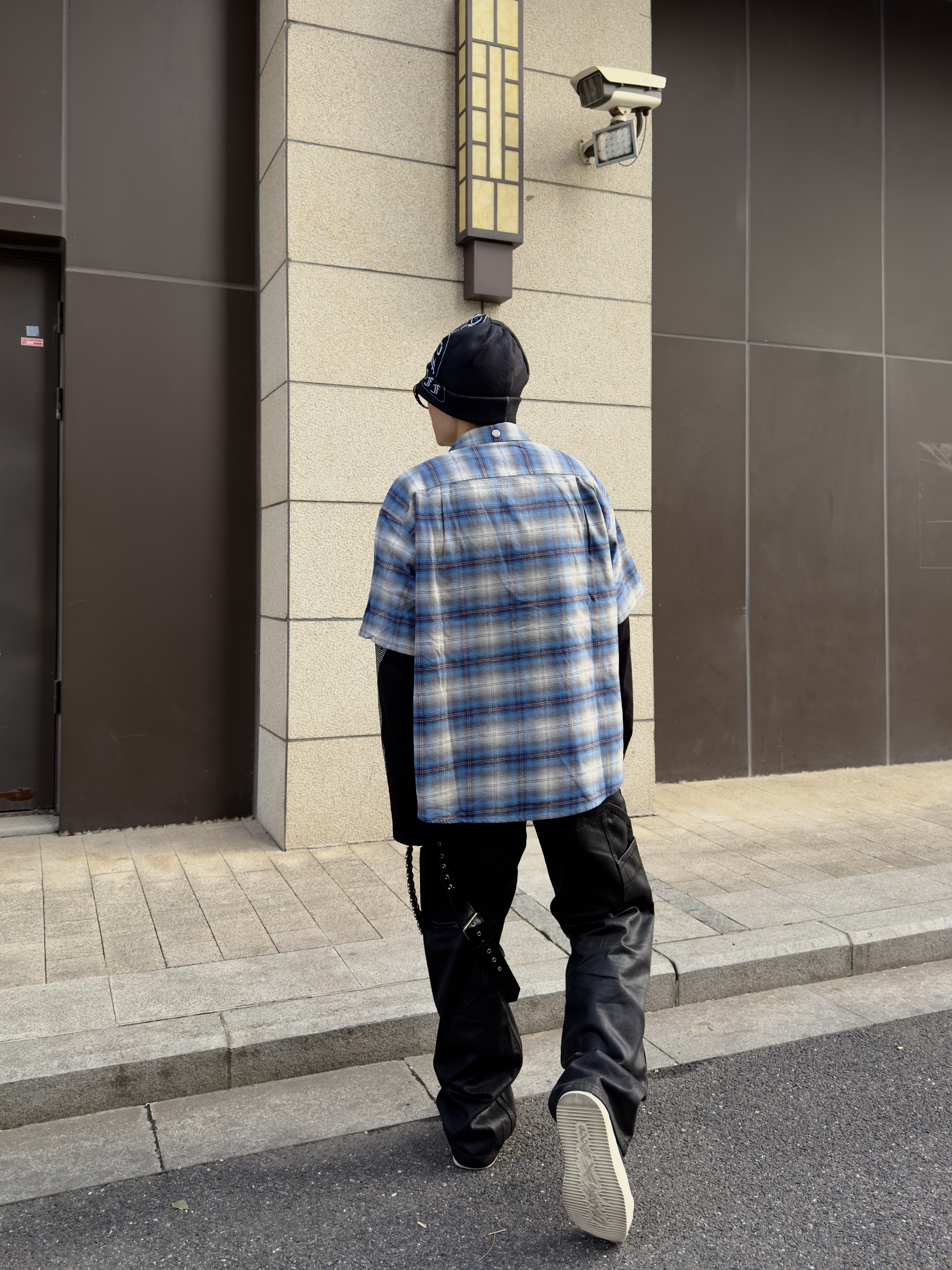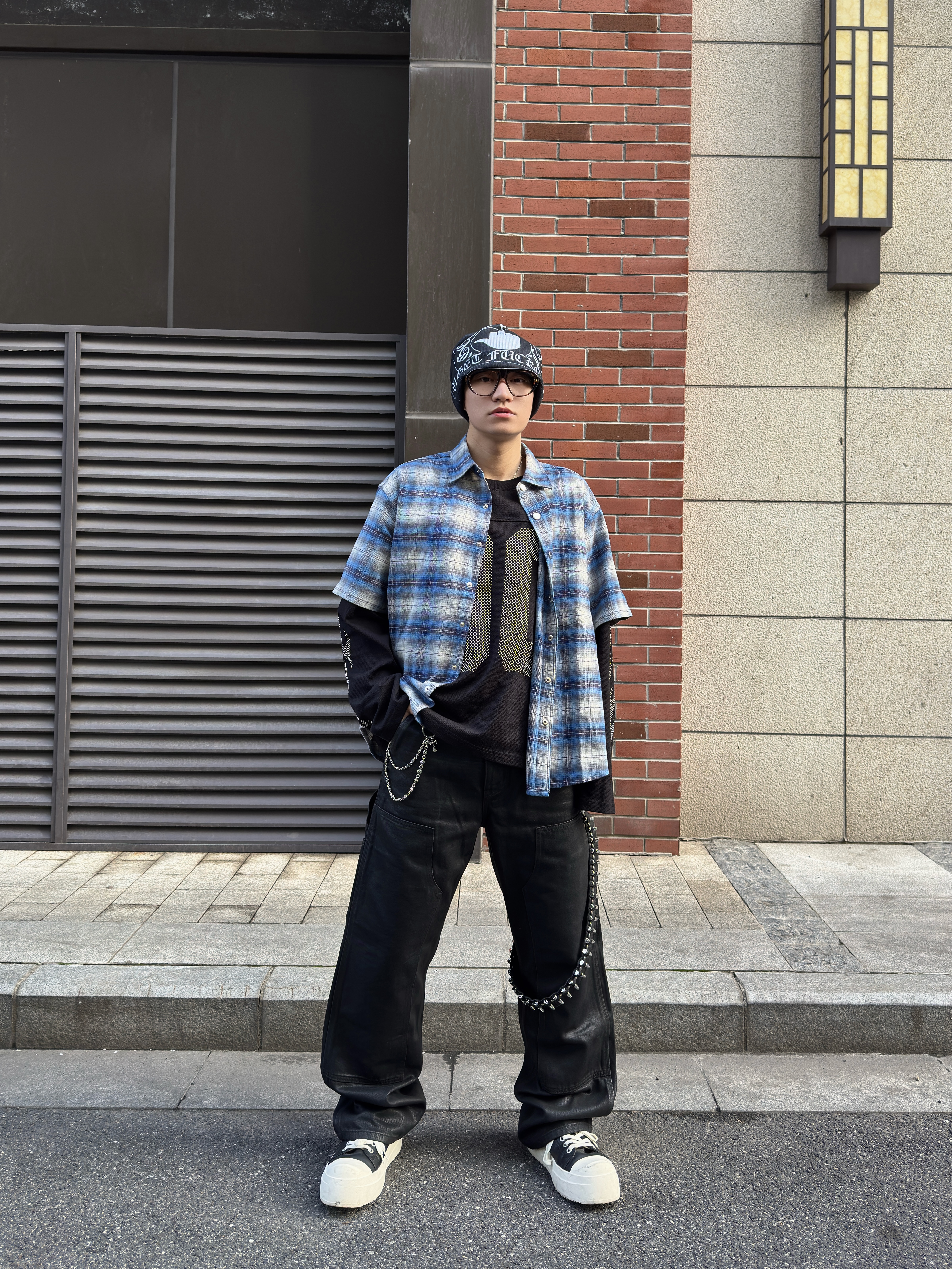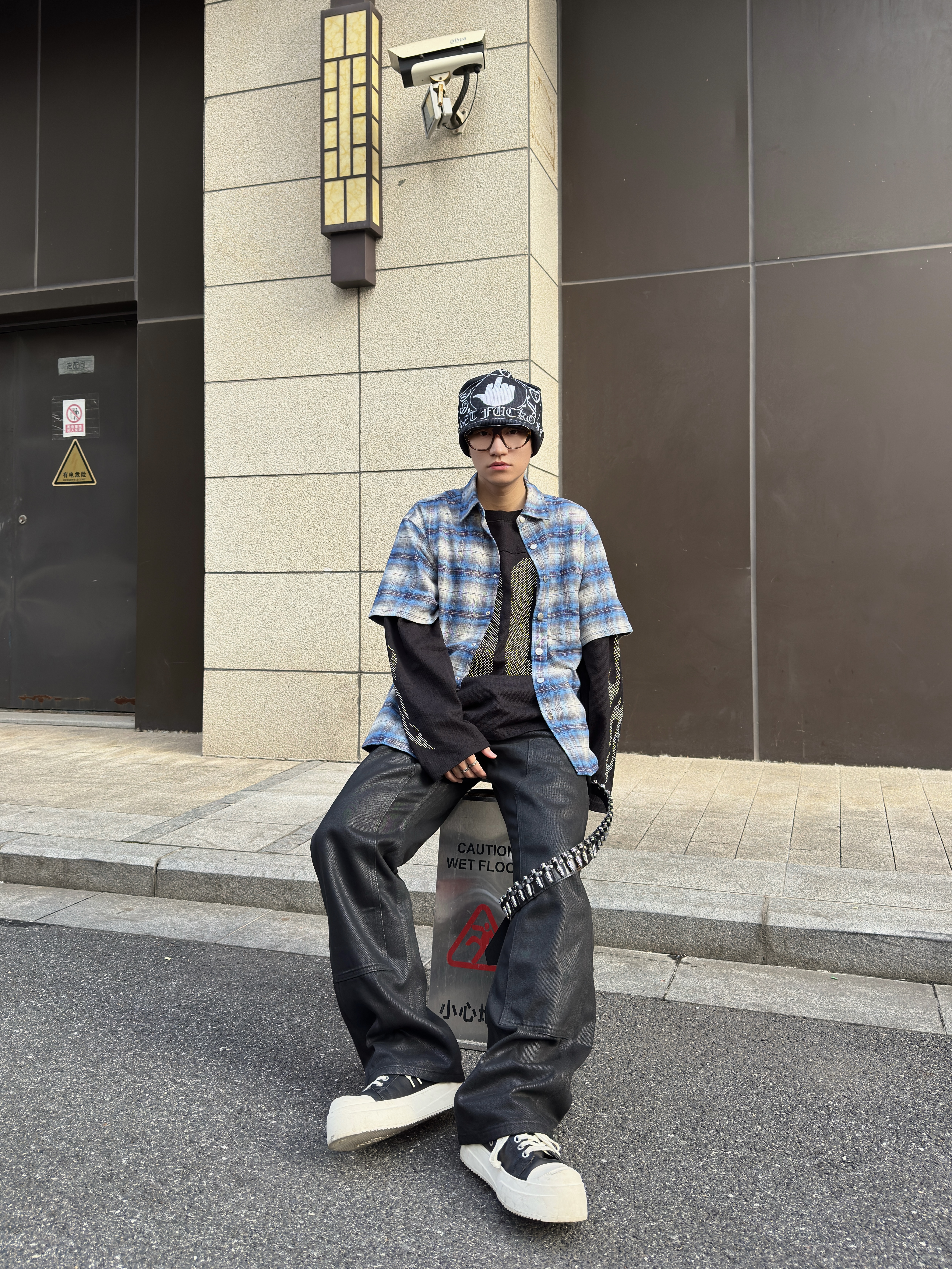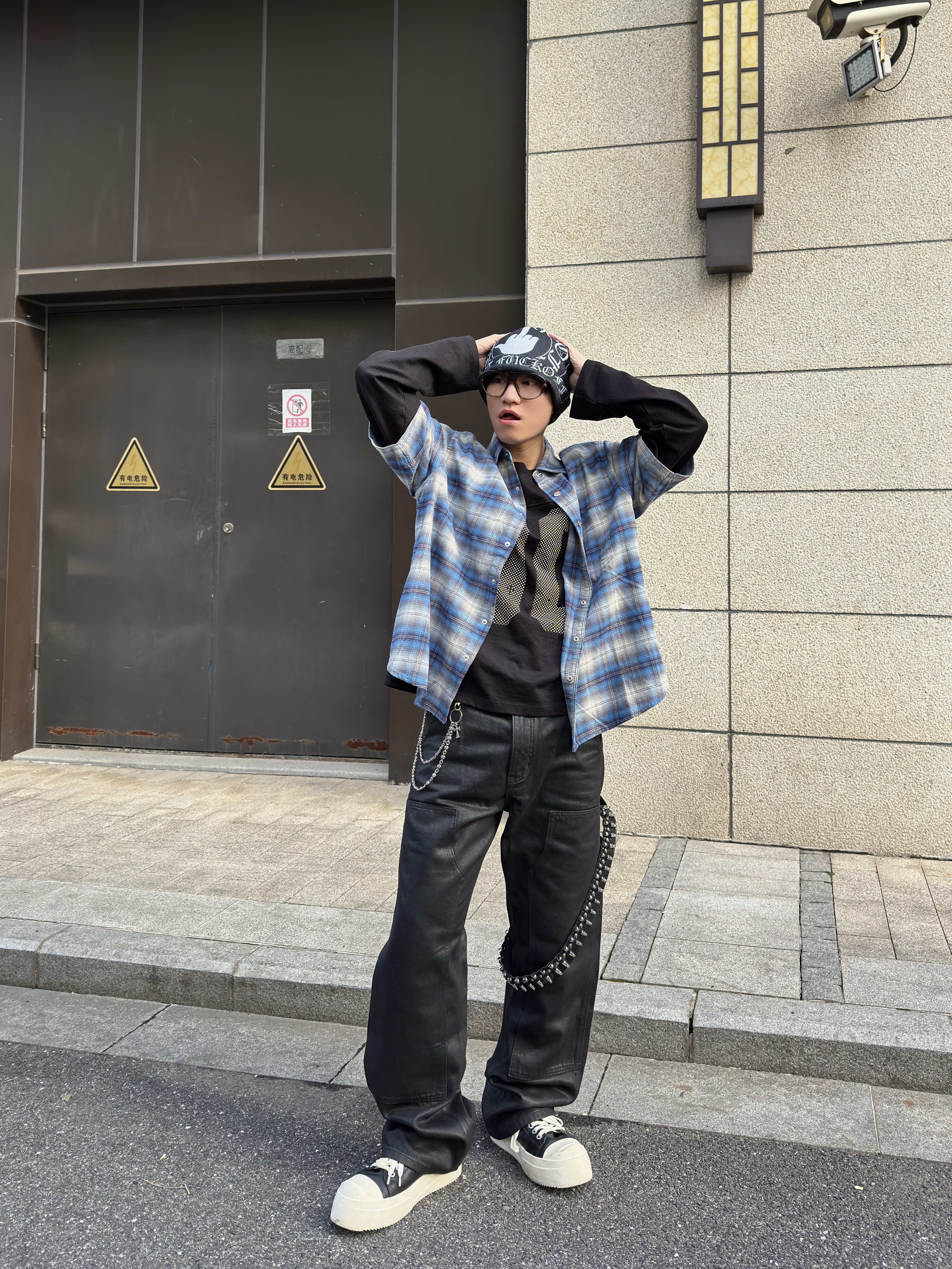 从前两年的baggy到今年的skinny 我发现裤装的趋势是逐渐走向合身🎁 再加上今年千禧风的大热 2000年前后的流行开始重新走进潮人们的视线 那一条合身的直筒伐木裤就比较重要了💦 蜡面的设计将千禧年“皮裤”的感觉拿捏到位~ 上身选择了衬衫👕叠穿长袖T再加个偏街头的冷帽 当裤子选的合适的时候 搭配就变得很easy了~