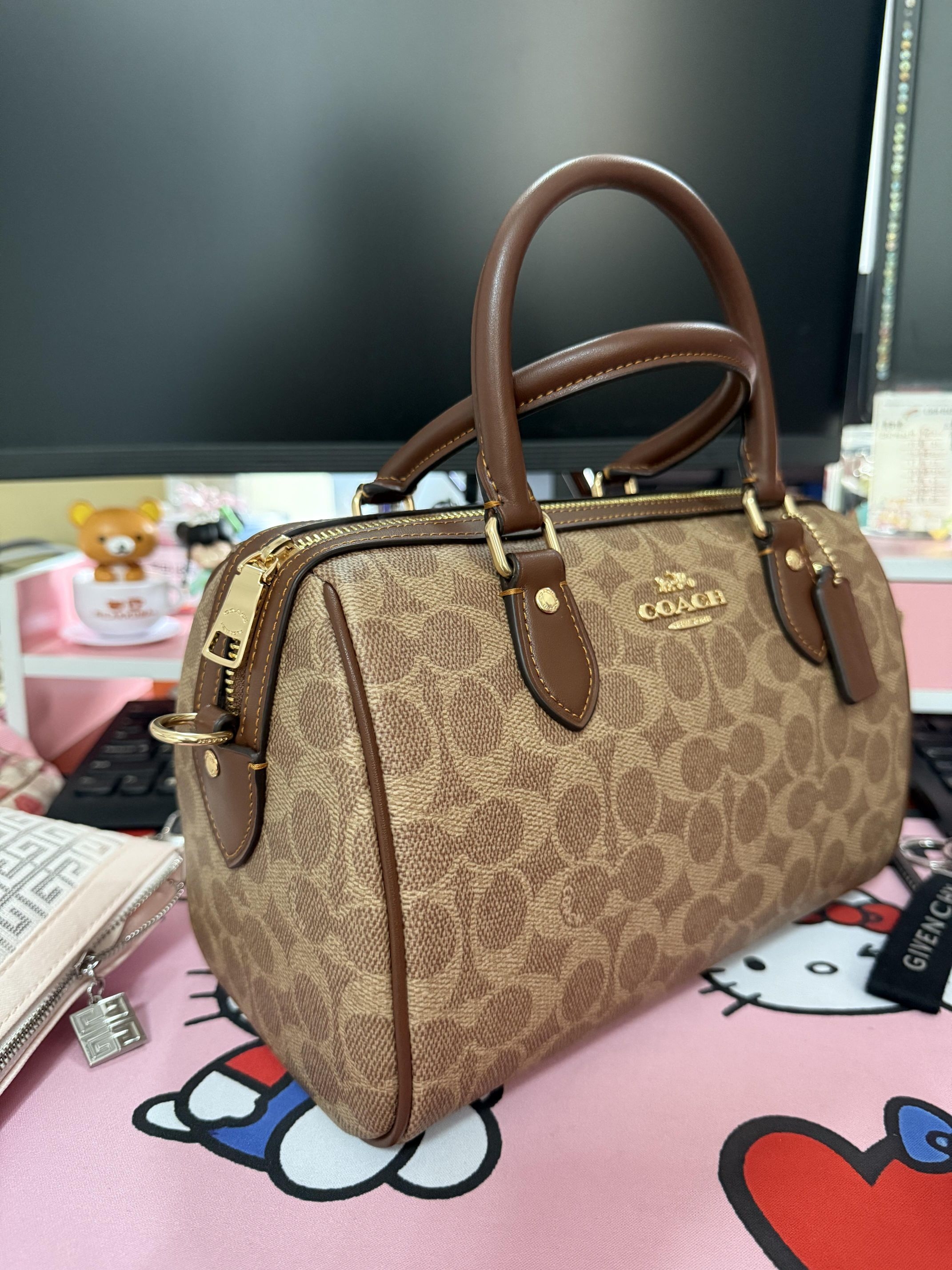 👜COACH Rowan波士顿包,经典老花涂层帆布+深棕皮革饰边,简约大气又百搭!尺寸约26x14x17cm,容量超能装,通勤日常都OK✨。可调节肩带,手提、斜挎、腋下背随心切换,奶茶色温柔不挑衣服,秋冬大衣、春夏裙装都能轻松驾驭~实用又时髦,是蔻驰热门款,真的很推荐!