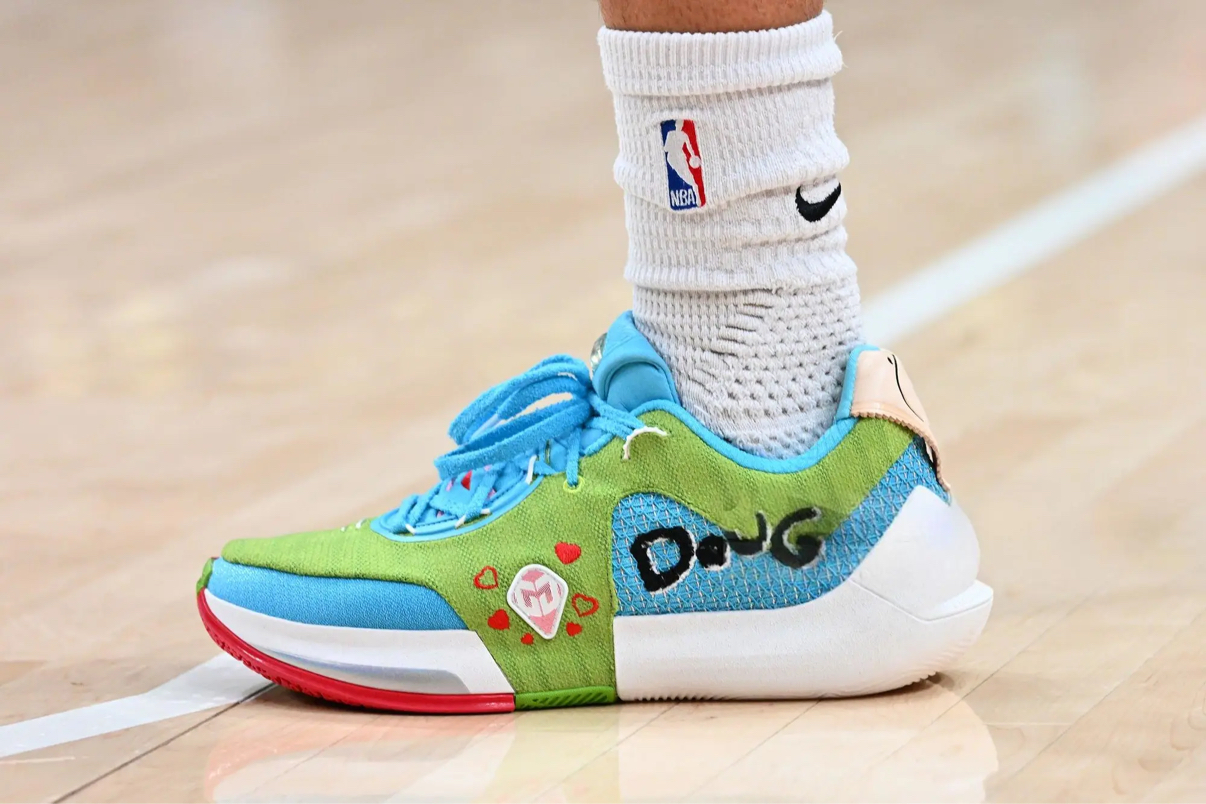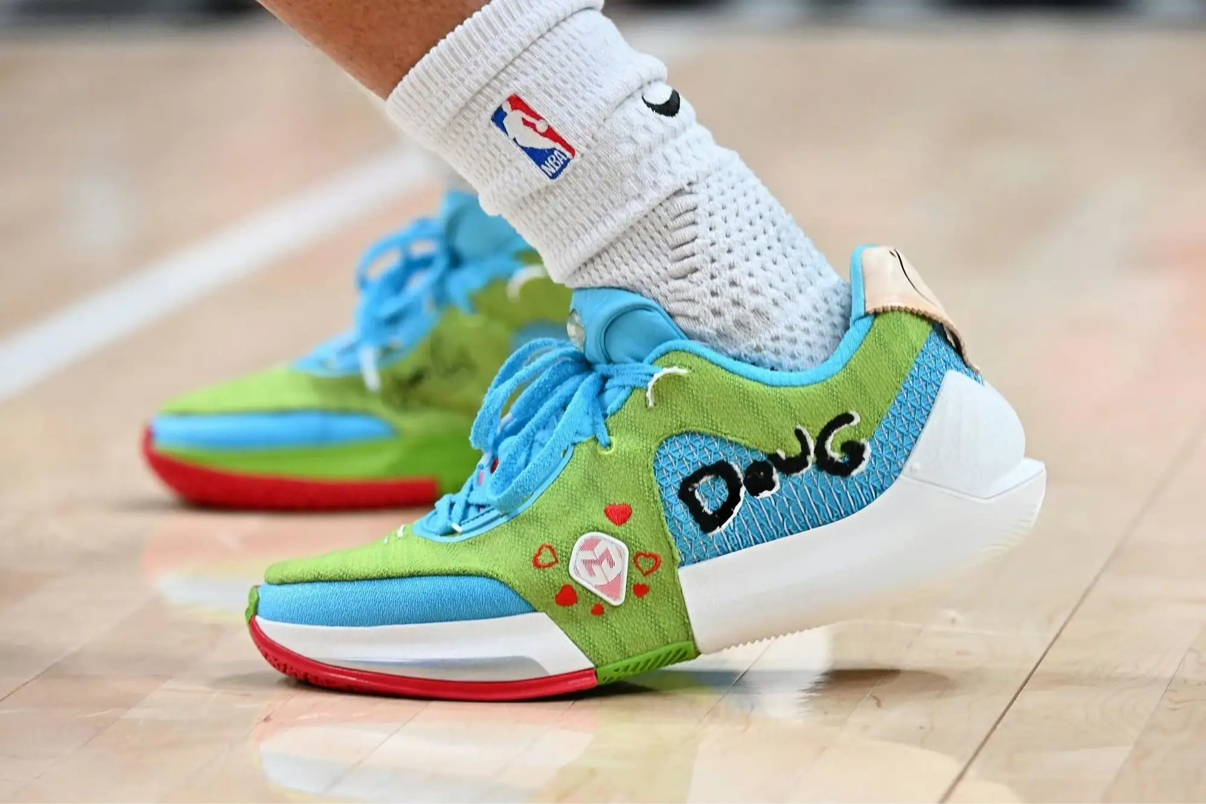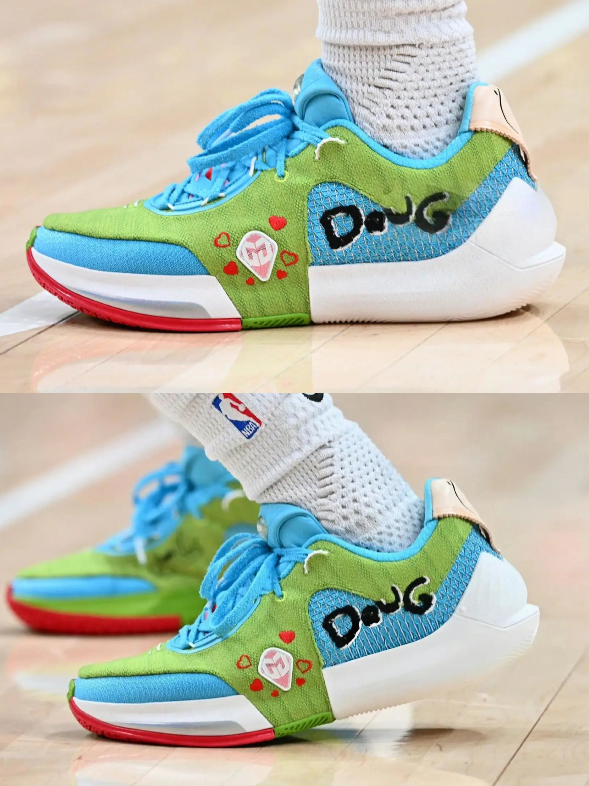 这双定制配色的cj4真的太好看了,首先绿蓝撞色+手写“DOUG”+爱心细节,赛场显眼包实锤!飞向宇宙,浩瀚无垠✨ 把童年穿进NBA赛场,这双定制鞋的可爱与实战感拉满,CJ和李宁的审美真的太会了! 还有颜色搭配非常完美,荧光绿+天空蓝+红底,配色大胆到犯规!手写ID注入灵魂,这才是球星该有的个性球鞋🔥