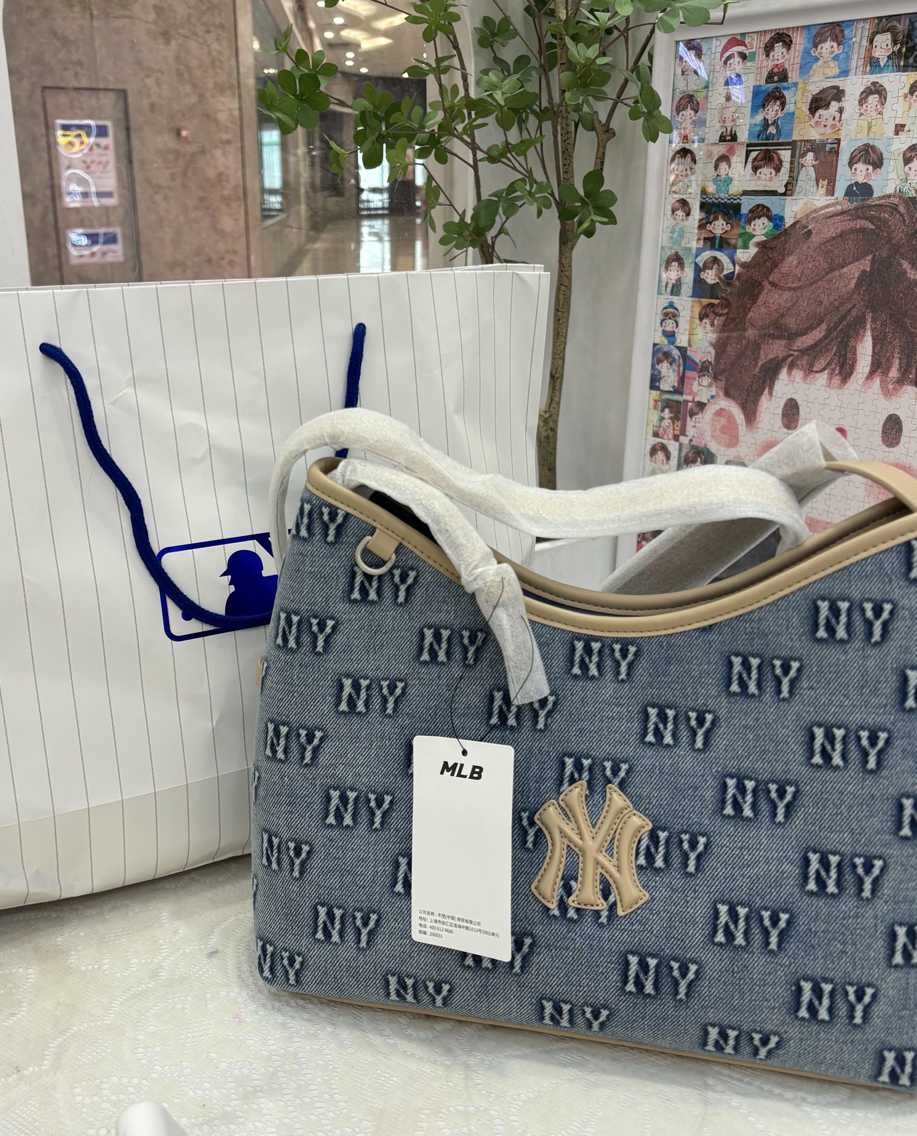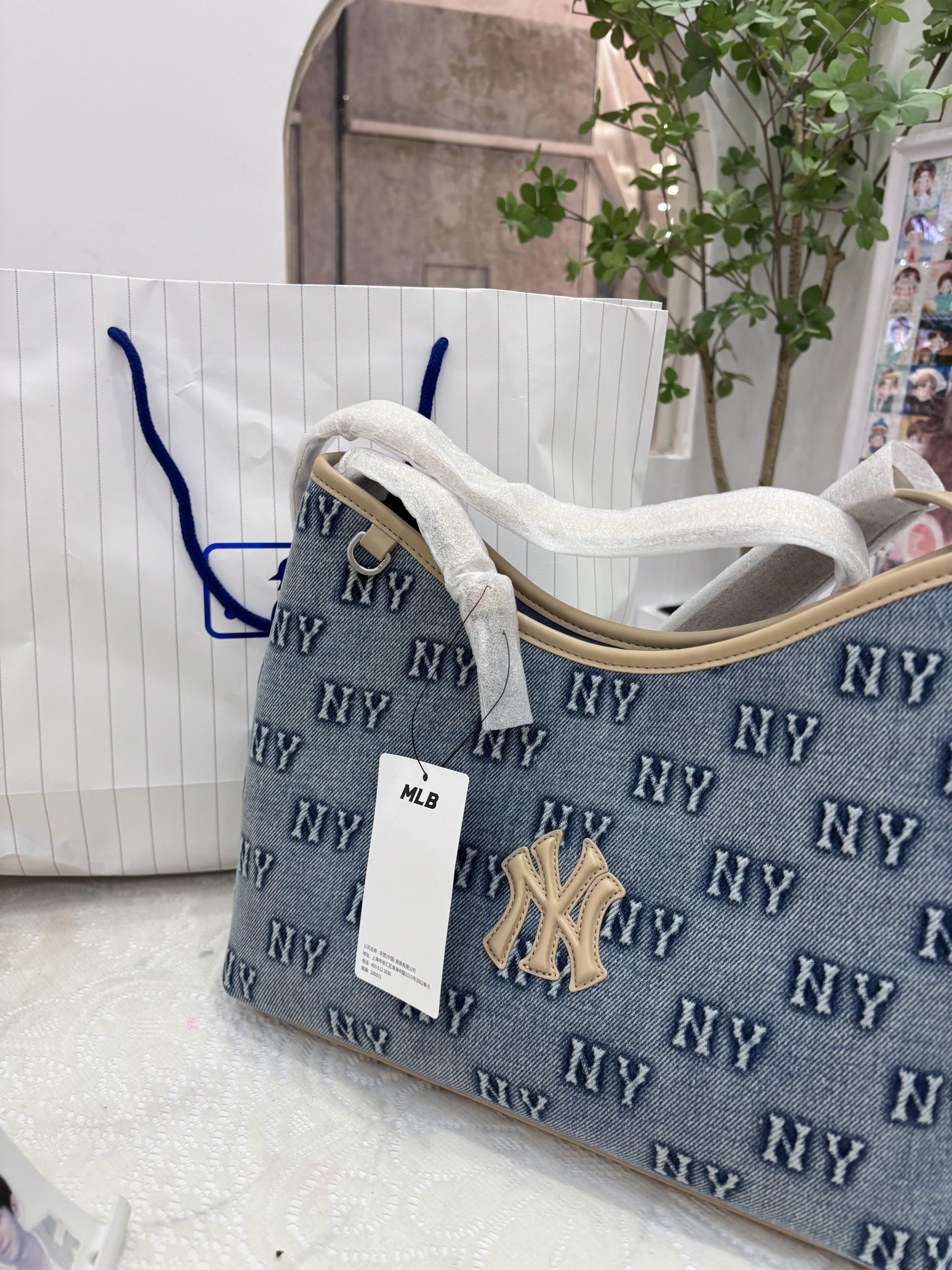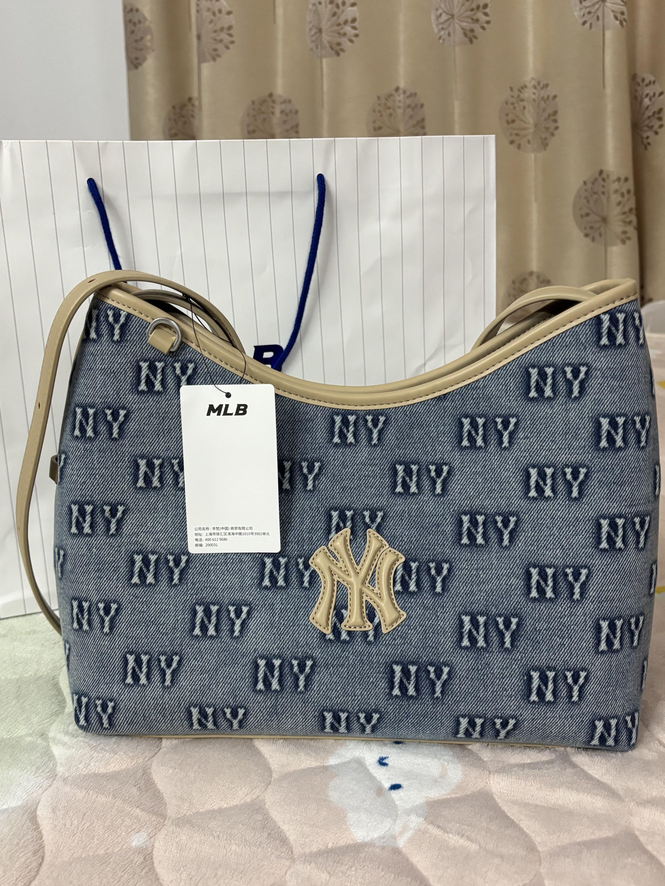 👜MLB牛仔老花托特包,水洗牛仔布+NY满印,复古美式风超有辨识度!浅米黄包边和NY标,细节满分✨。肩带可调节,单肩/斜挎都OK,通勤、逛街、短途旅行都能用。容量超大,13寸电脑、水杯、化妆品轻松装下,敞口设计拿取超方便!自重轻,背一天也不累,实用又时髦,是通勤党&时尚达人必备包包!