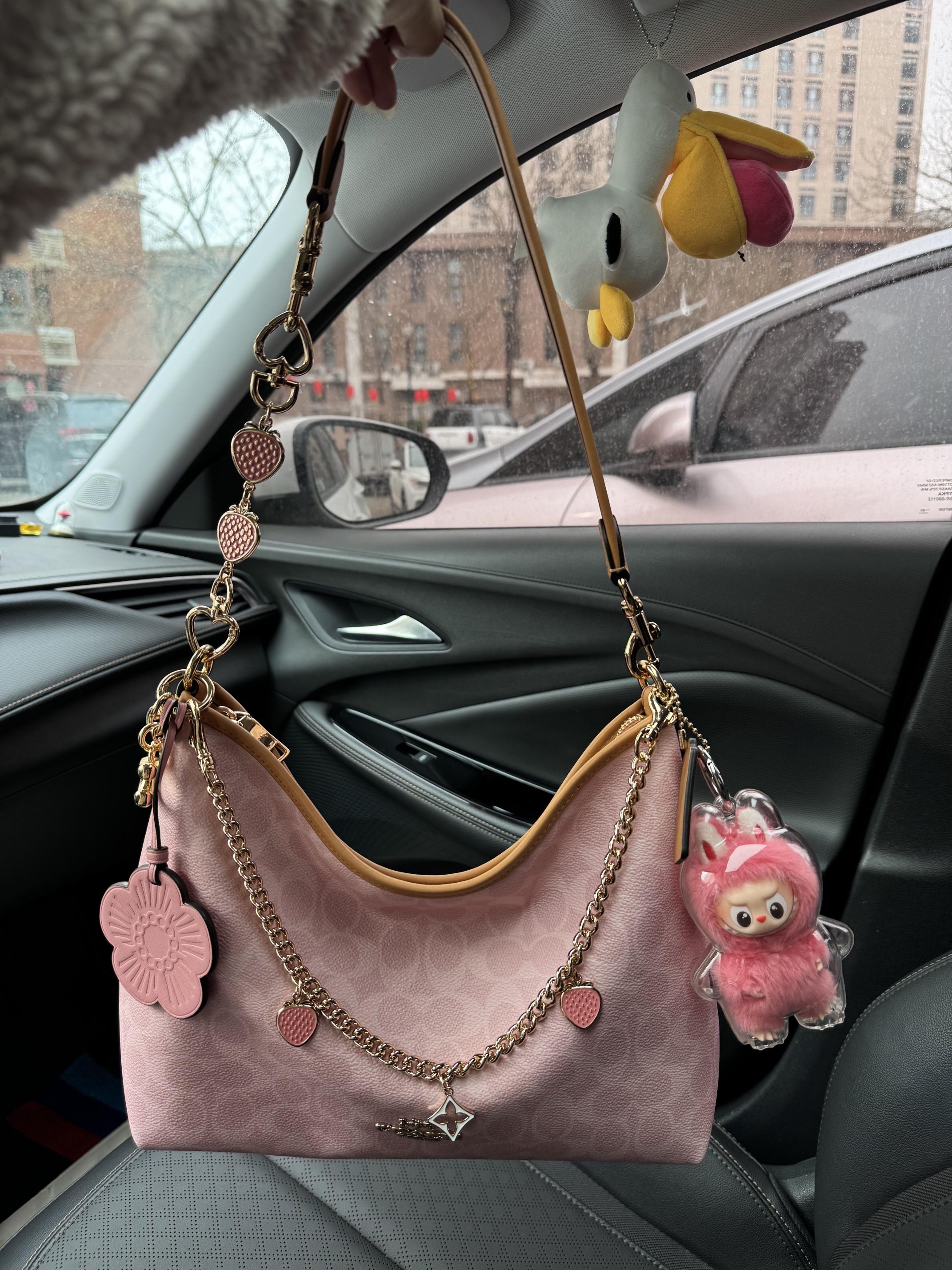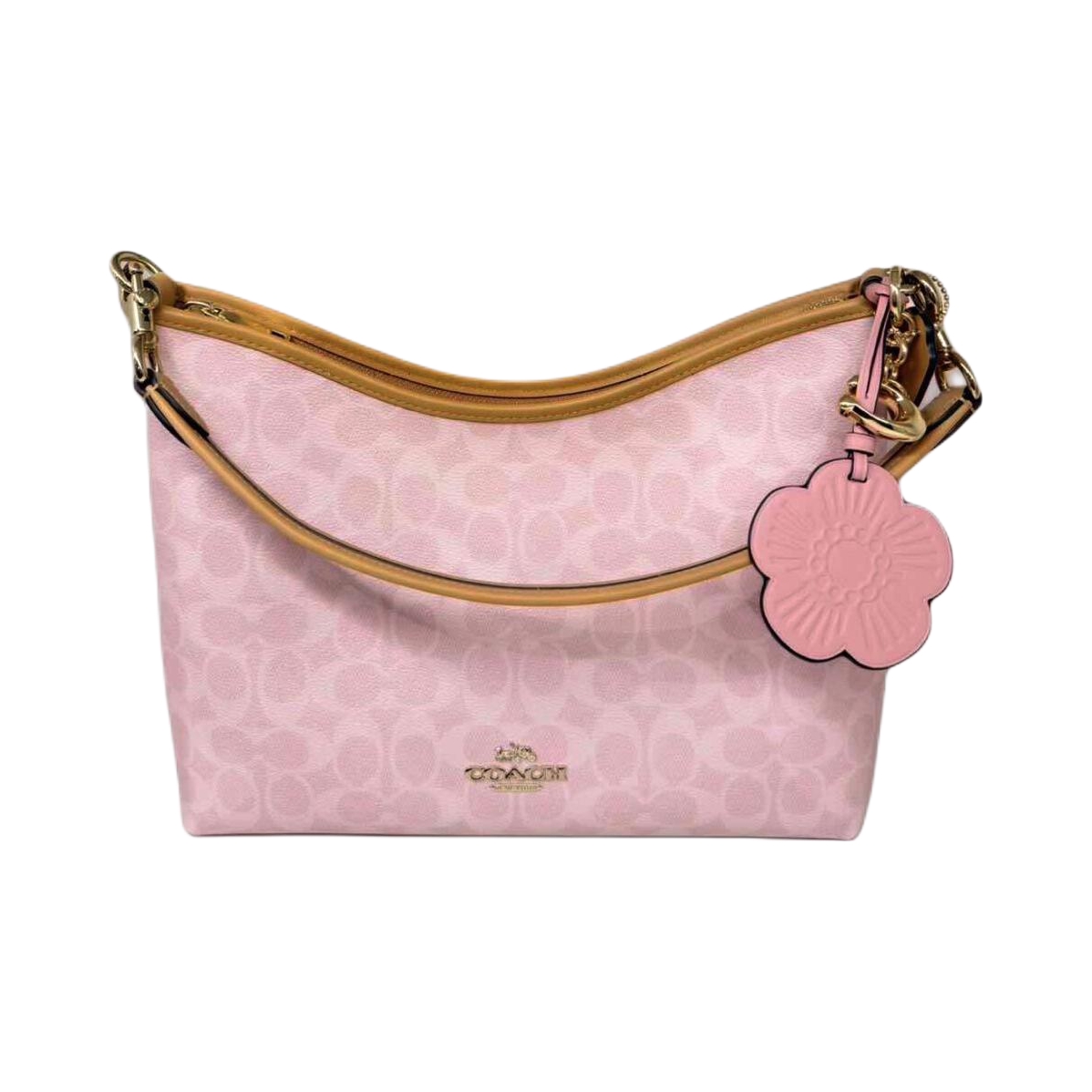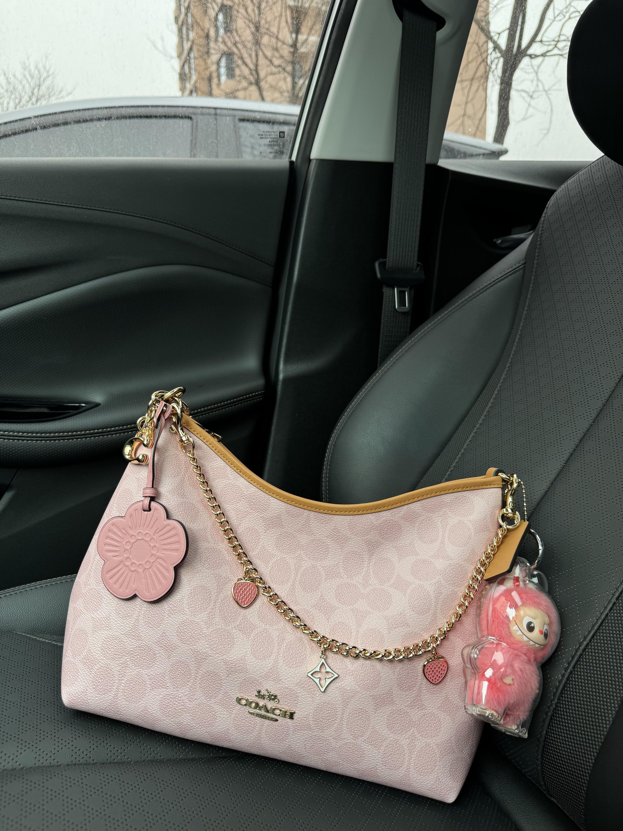 🌸Coach Laurel系列樱花粉流浪包,经典老花帆布+焦糖色皮革包边,金色五金超有质感✨。尺寸31×23.5×10.5cm,容量适中,通勤约会都OK!樱花粉低饱和度,温柔又高级,黄皮也能轻松驾驭。肩带可单肩/斜挎,搭配延长链更时髦~限定款,情人节超火,送礼自用都很赞🎁。