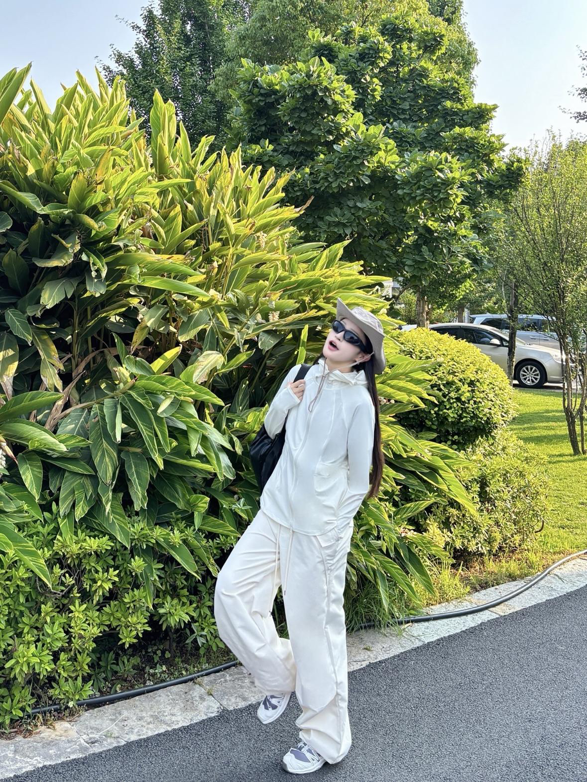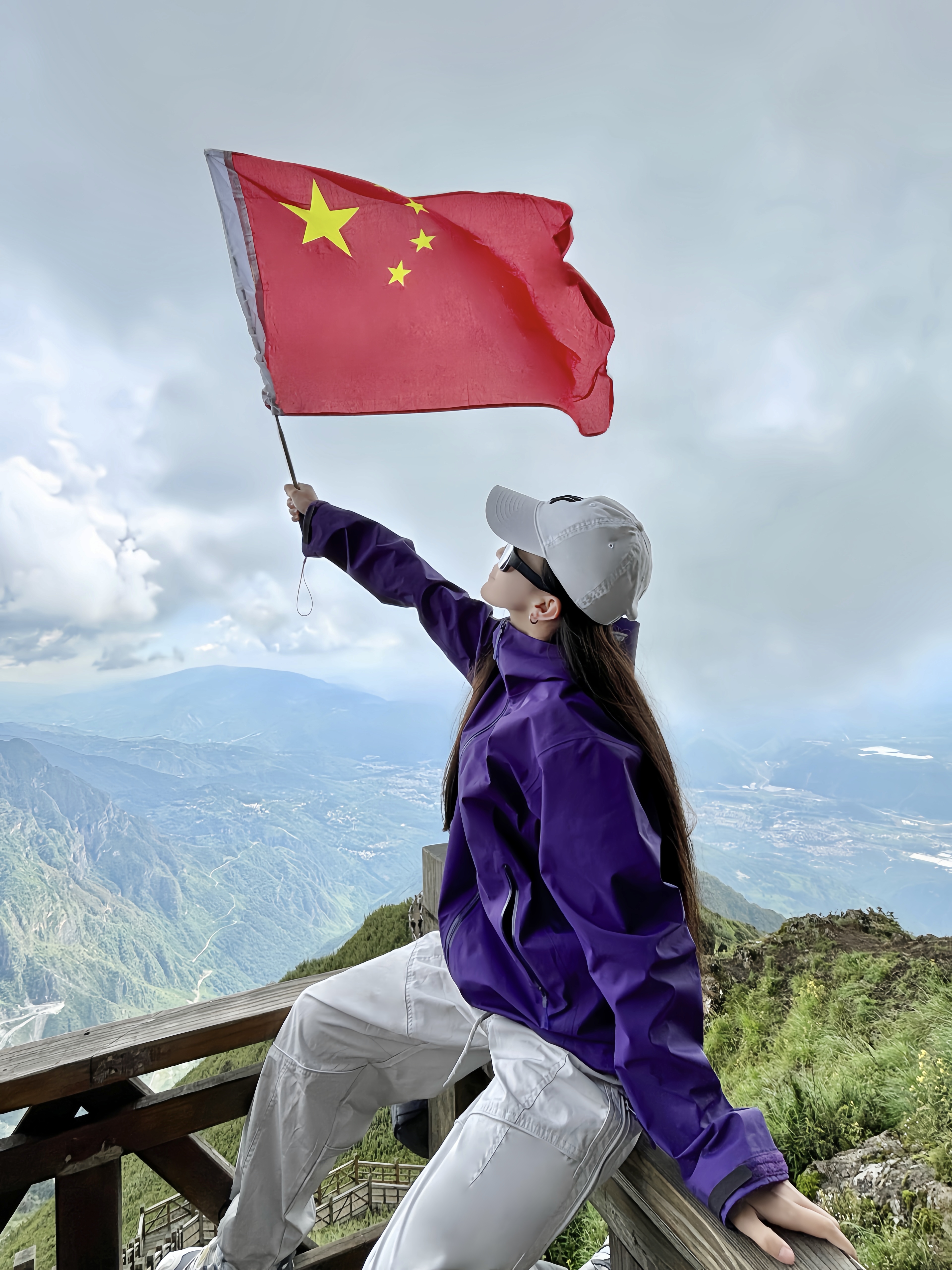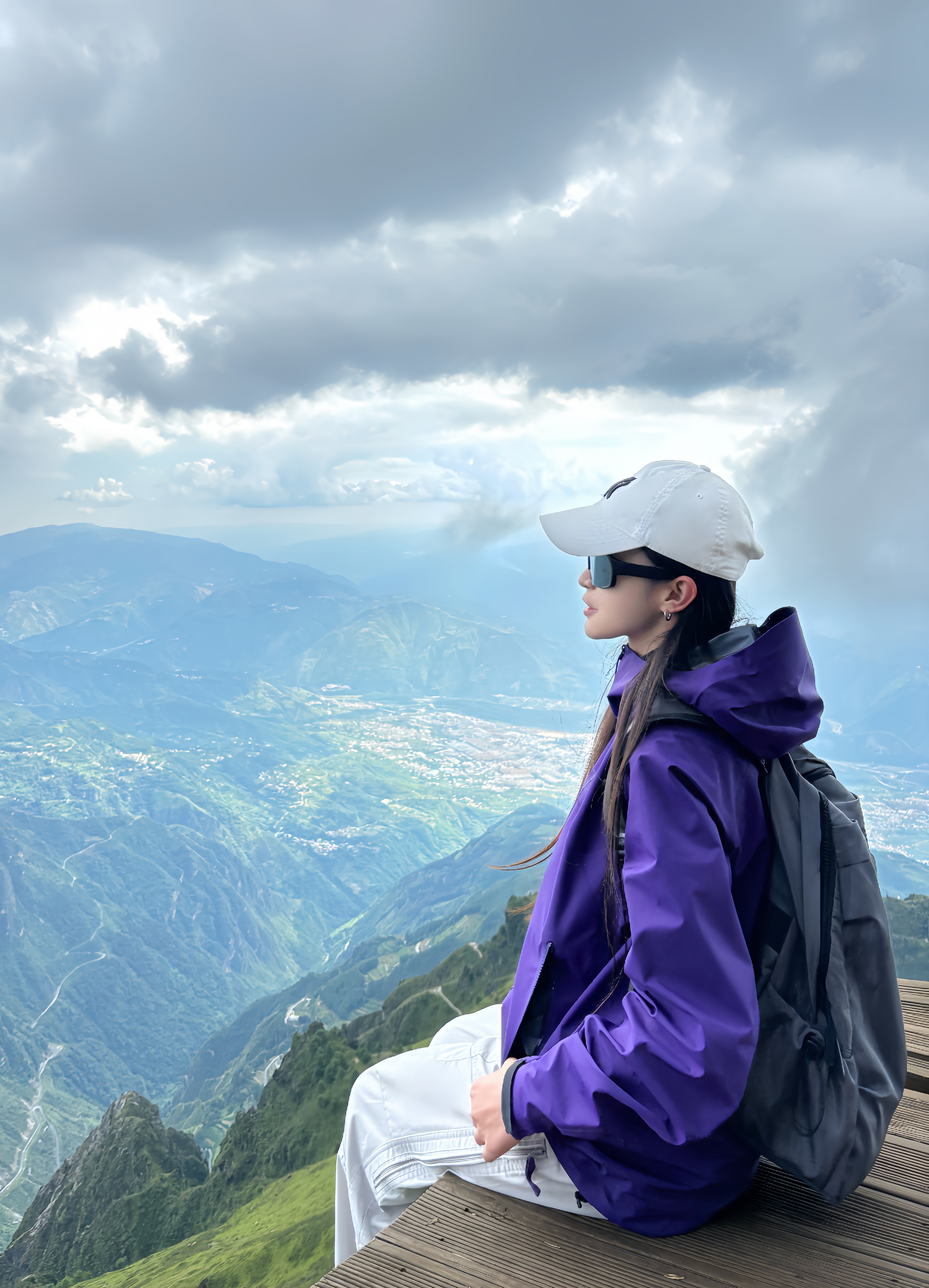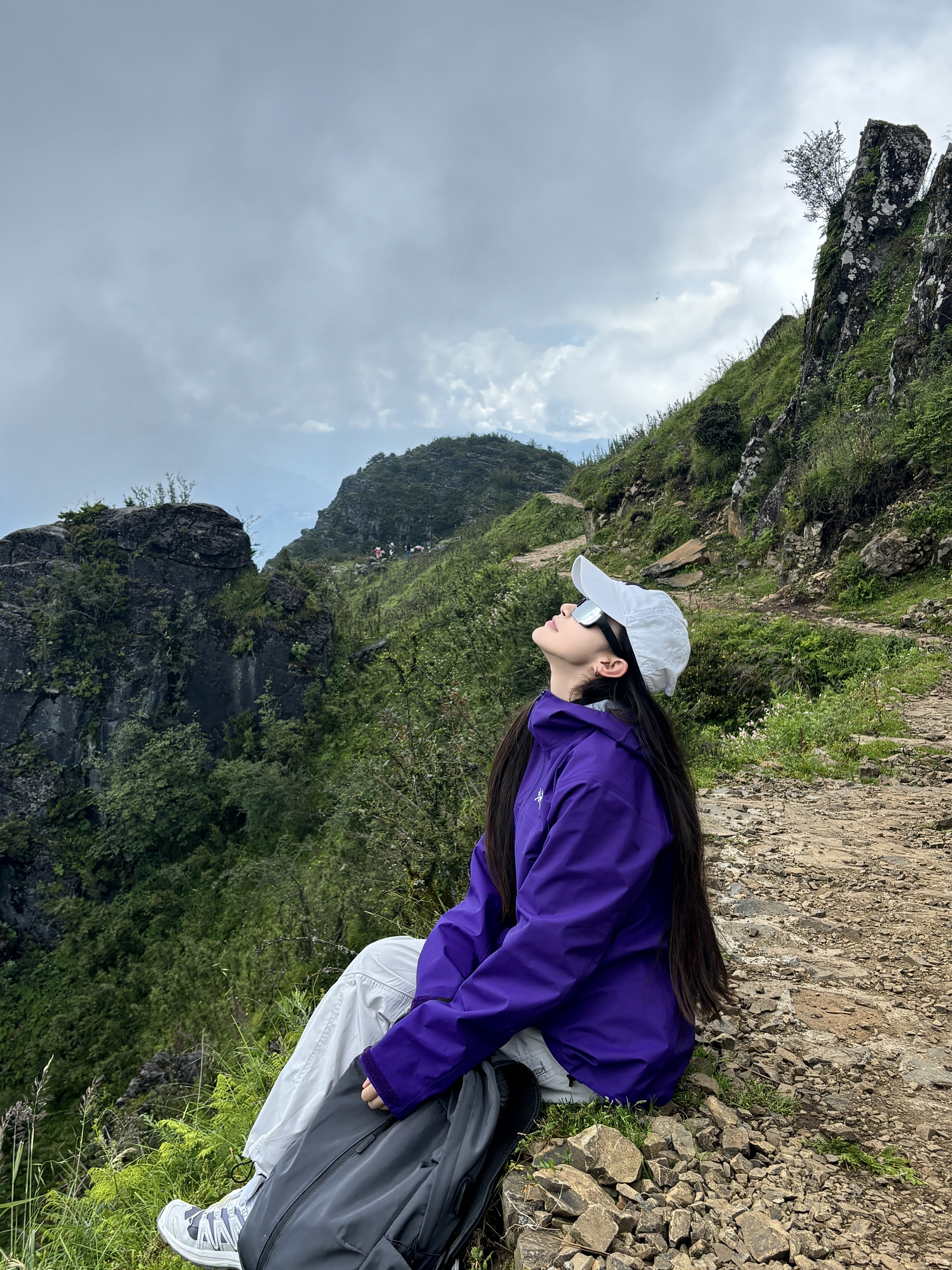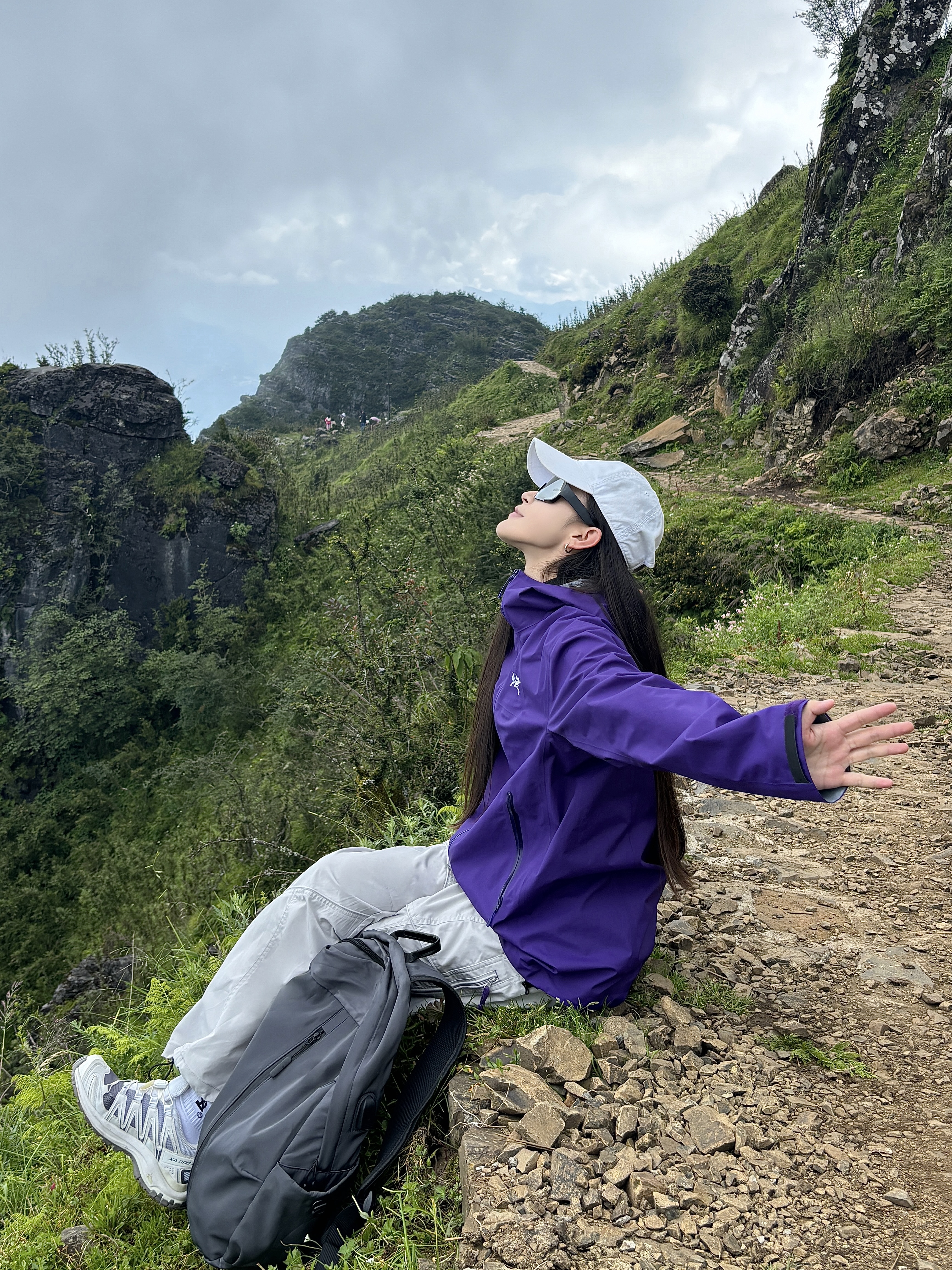 👔始祖鸟紫色冲锋衣~ 在山野背景里既醒目又有视觉冲击力 拍照出片率极高 是整套穿搭的视觉中心 👖白色工装裤~ 浅色系中和紫色的厚重感 让整体造型更清爽透气 适配户外徒步场景!