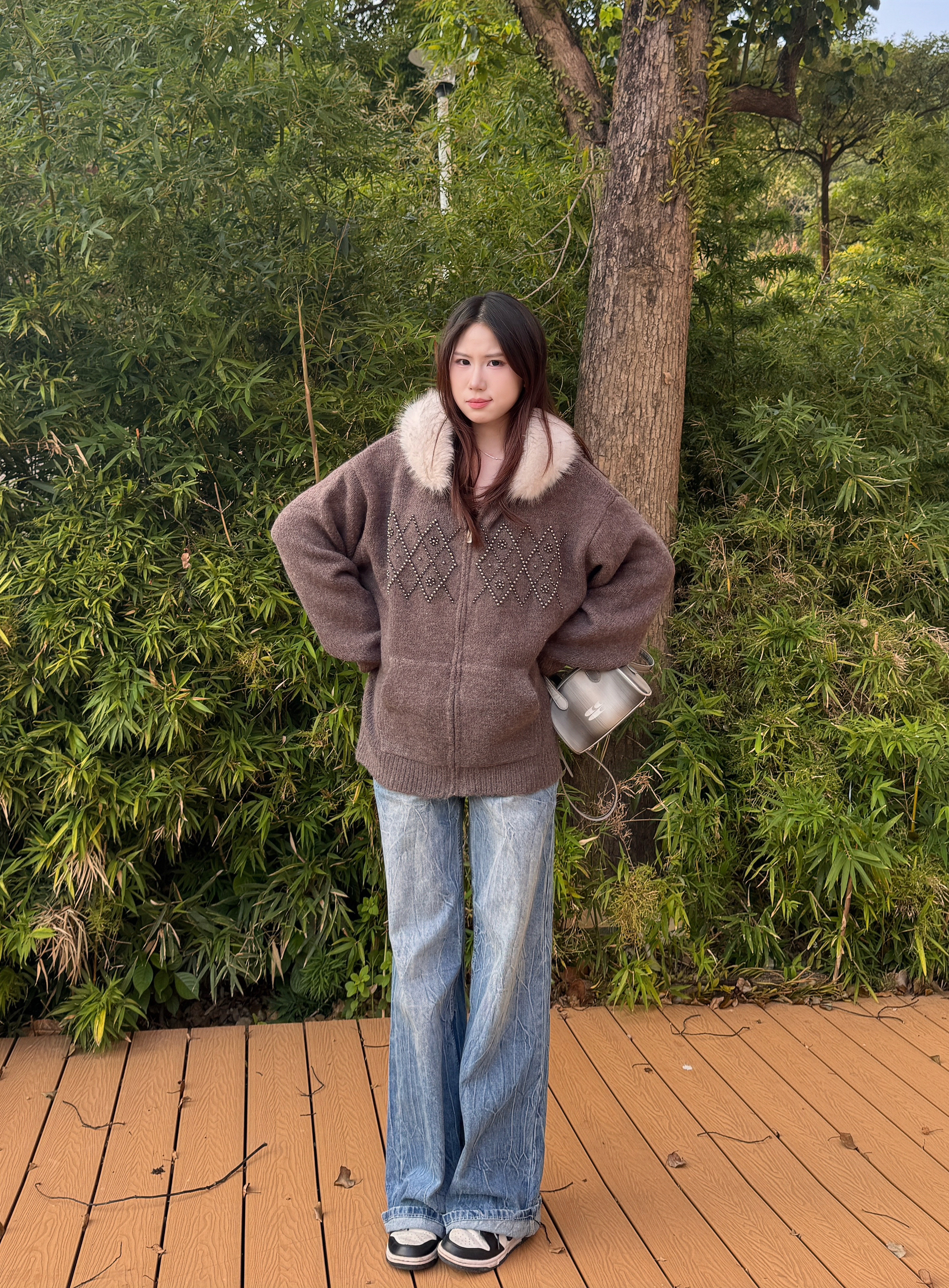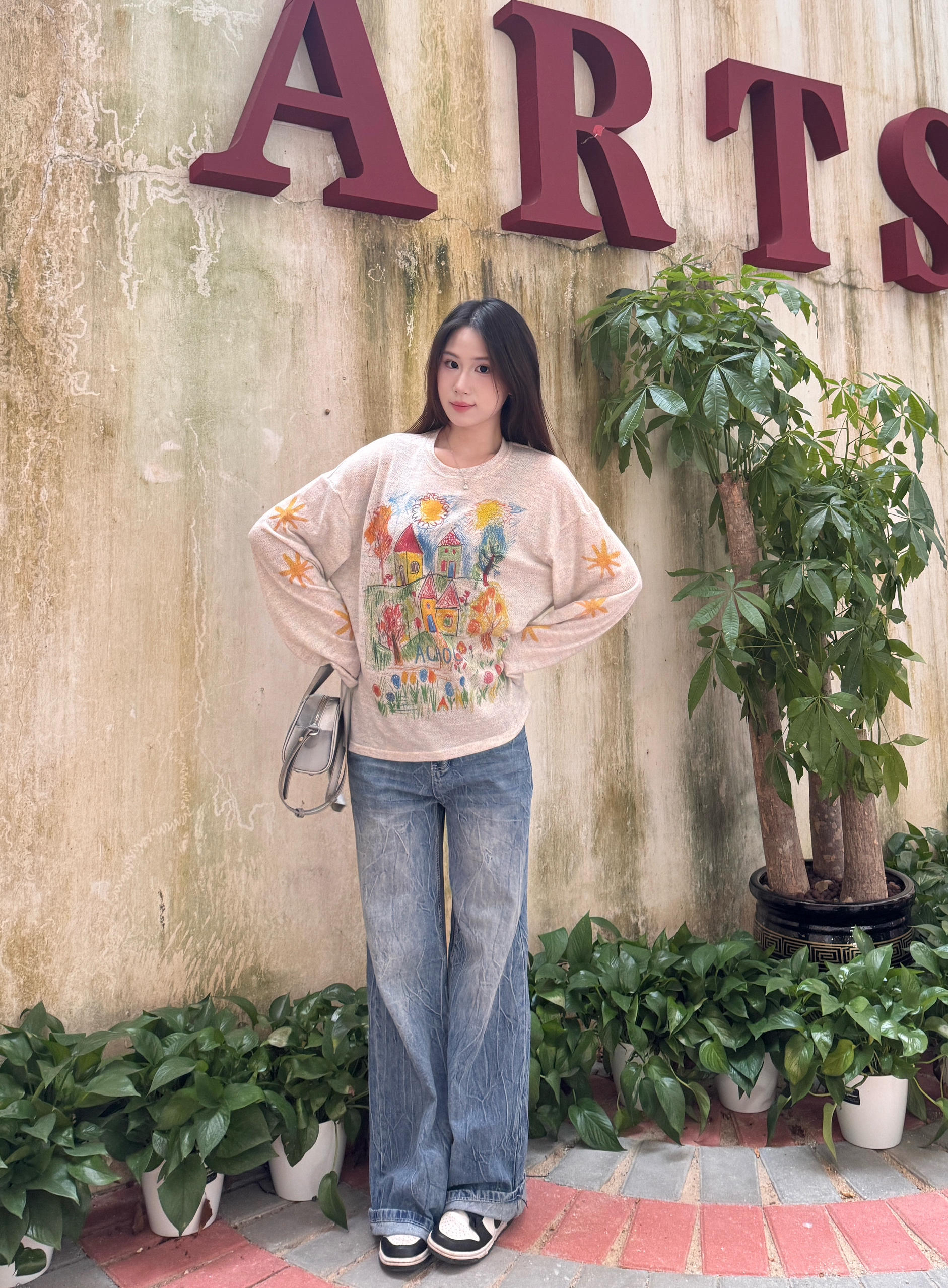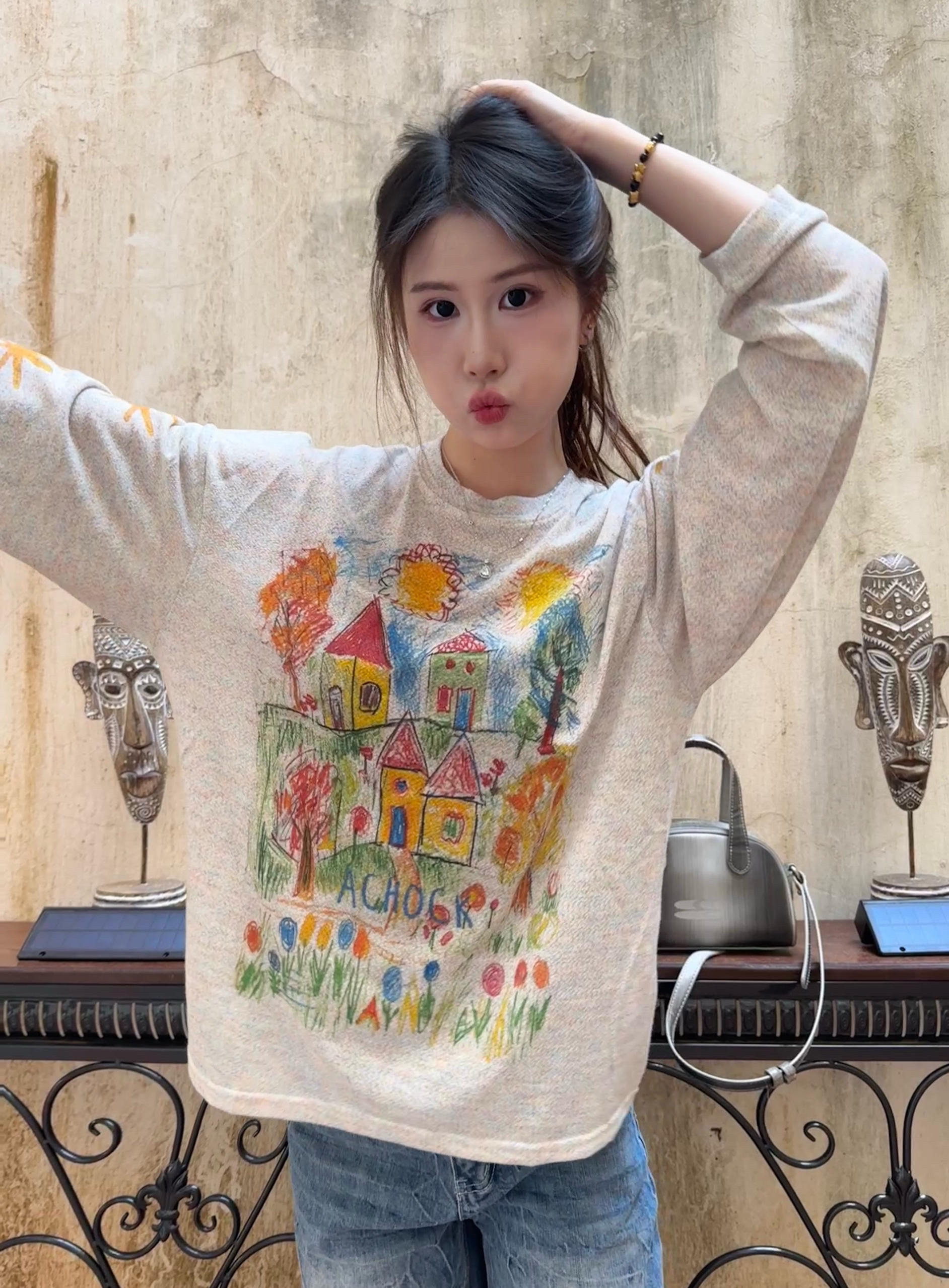 浅杏色手绘涂鸦针织衫,童趣满满的蜡笔风图案,软乎乎的面料巨舒服,随便搭都很有氛围~做旧蓝阔腿牛仔裤,垂感超棒,藏肉又显腿长,复古水洗纹理自带随性,日常出行超合适!