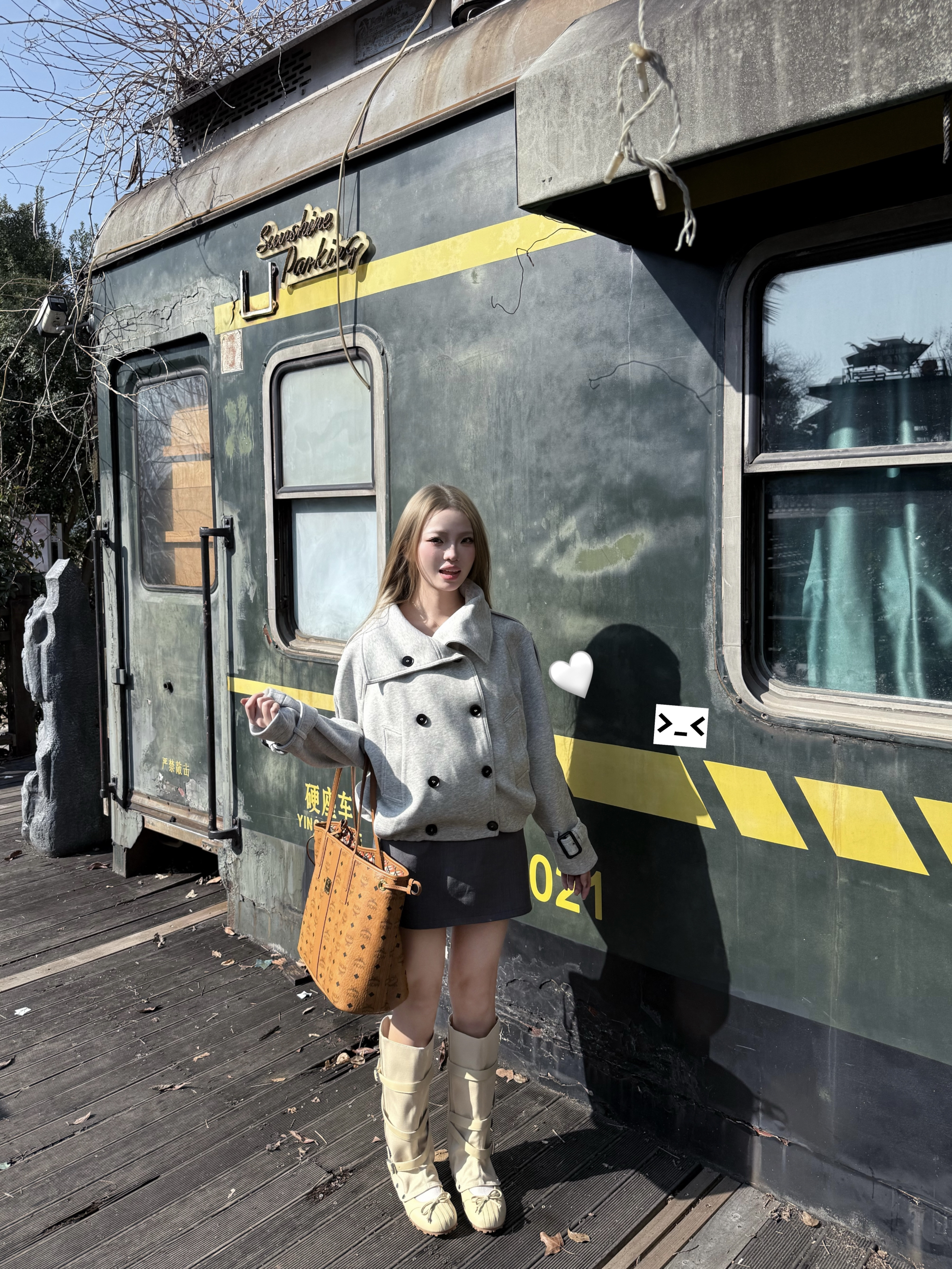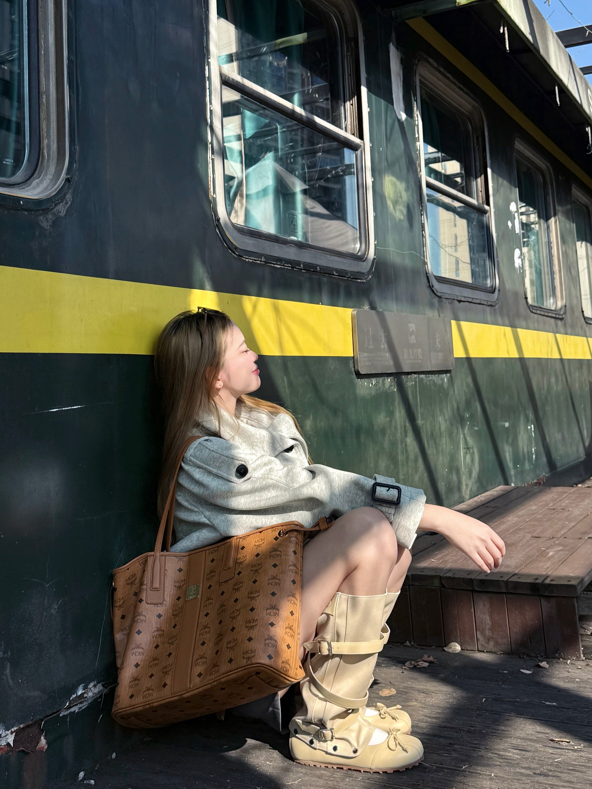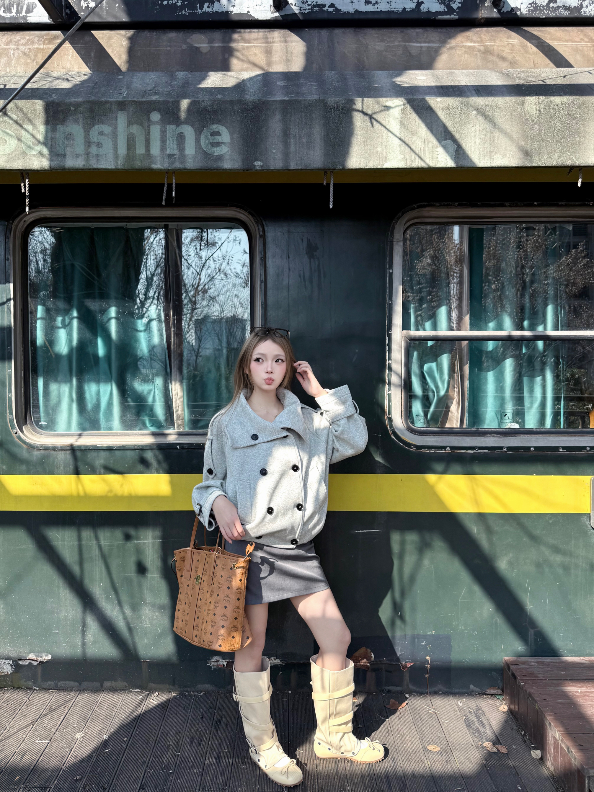 春意盎然ing 穿灰色双排扣外套搭配深灰半身裙 在这废弃的老火车🚞也是狠狠出片啦! 搭配牛皮革两穿堆堆靴👢 敲显腿细!! 米色的好温柔 搭配mcm的单肩包 一套温柔气质的姐姐装扮 让人眼前一亮~ 个人尺码参考:160/47kg 👔s 👢37