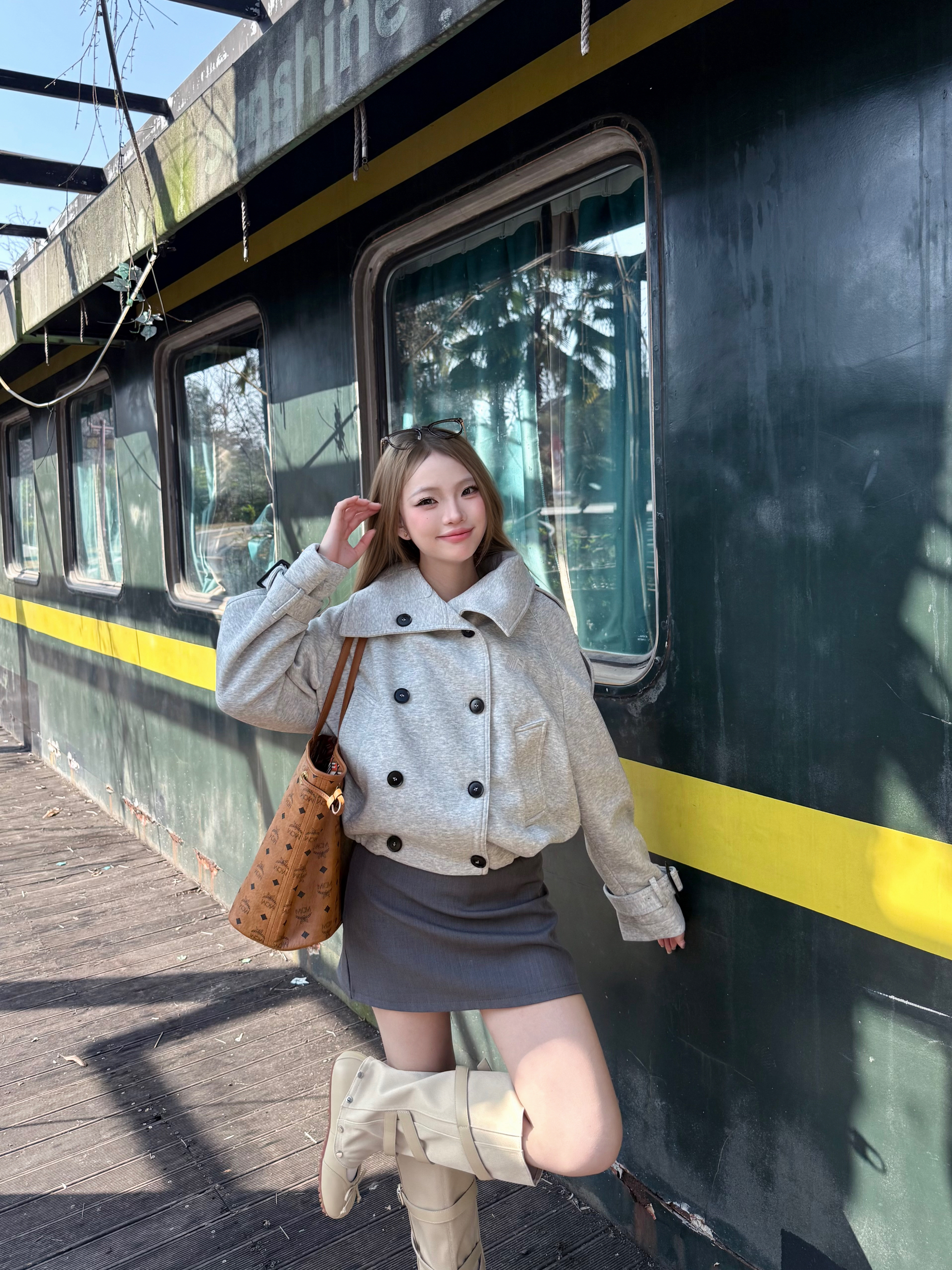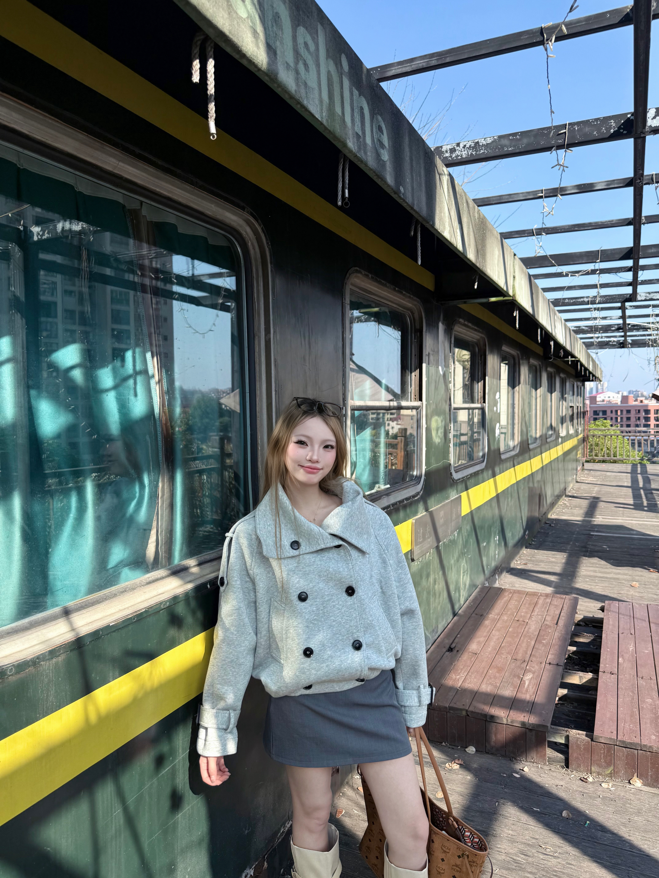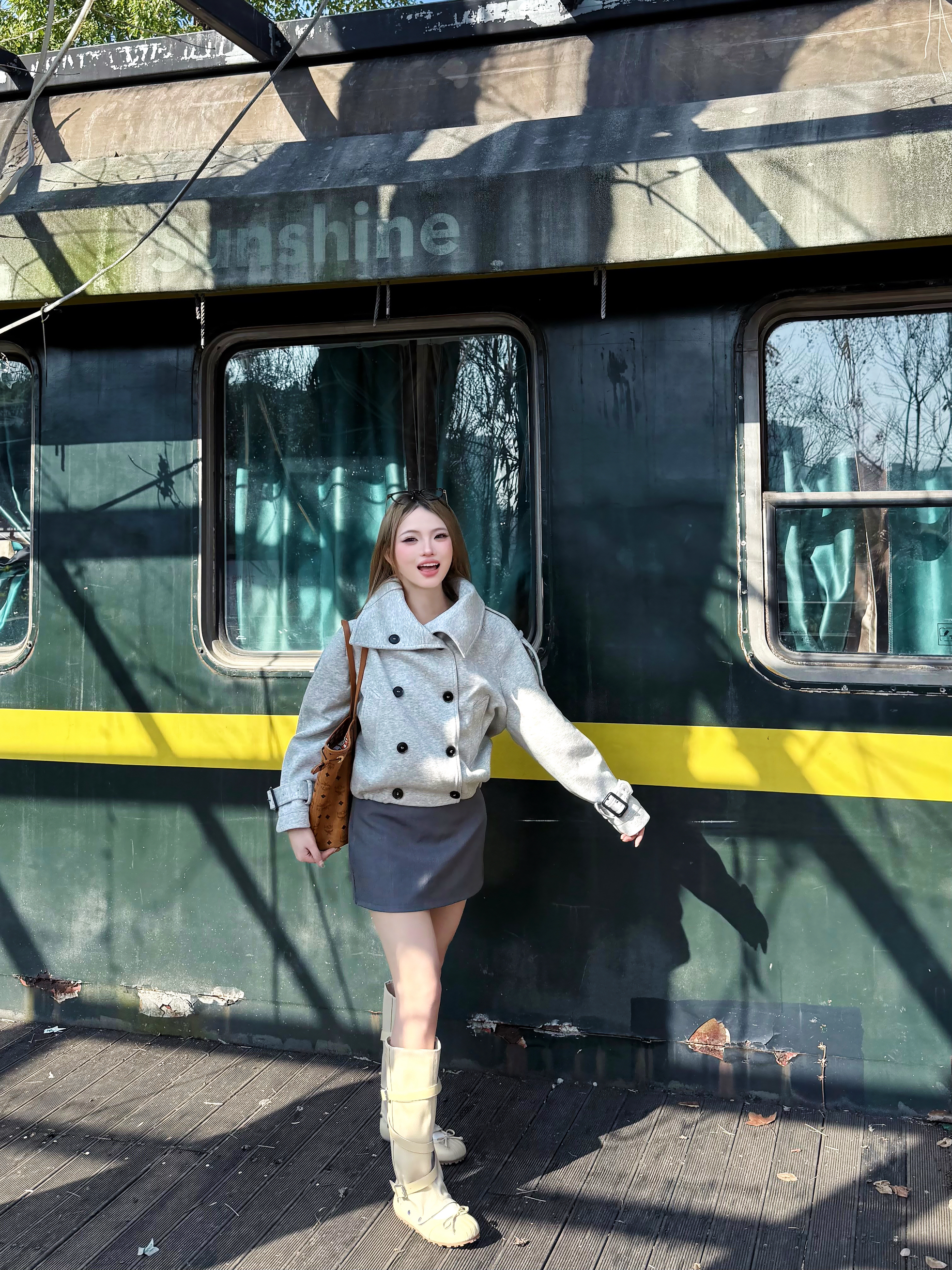 春意盎然ing 穿灰色双排扣外套搭配深灰半身裙 在这废弃的老火车🚞也是狠狠出片啦! 搭配牛皮革两穿堆堆靴👢 敲显腿细!! 米色的好温柔 搭配mcm的单肩包 一套温柔气质的姐姐装扮 让人眼前一亮~ 个人尺码参考:160/47kg 👔s 👢37